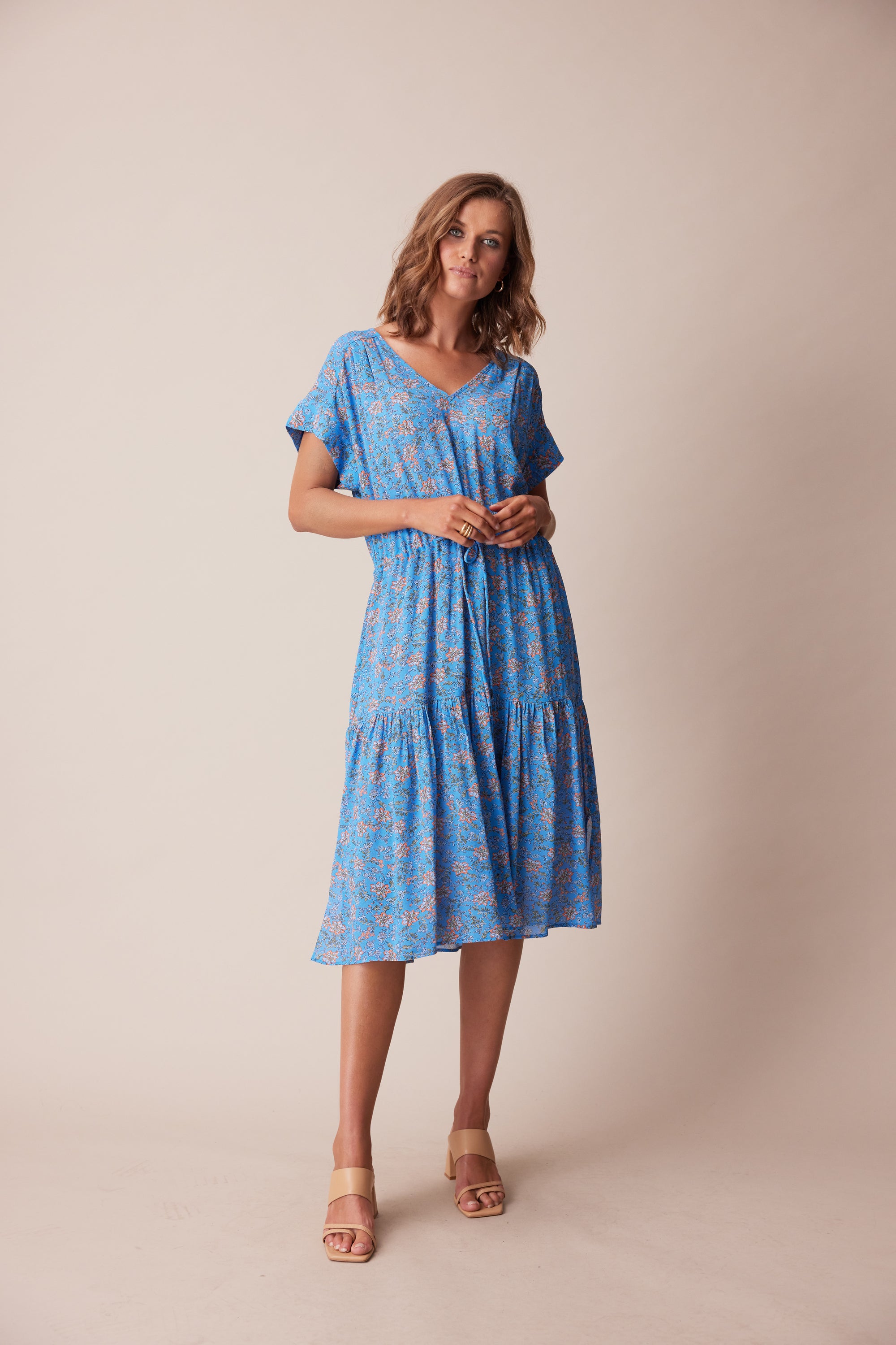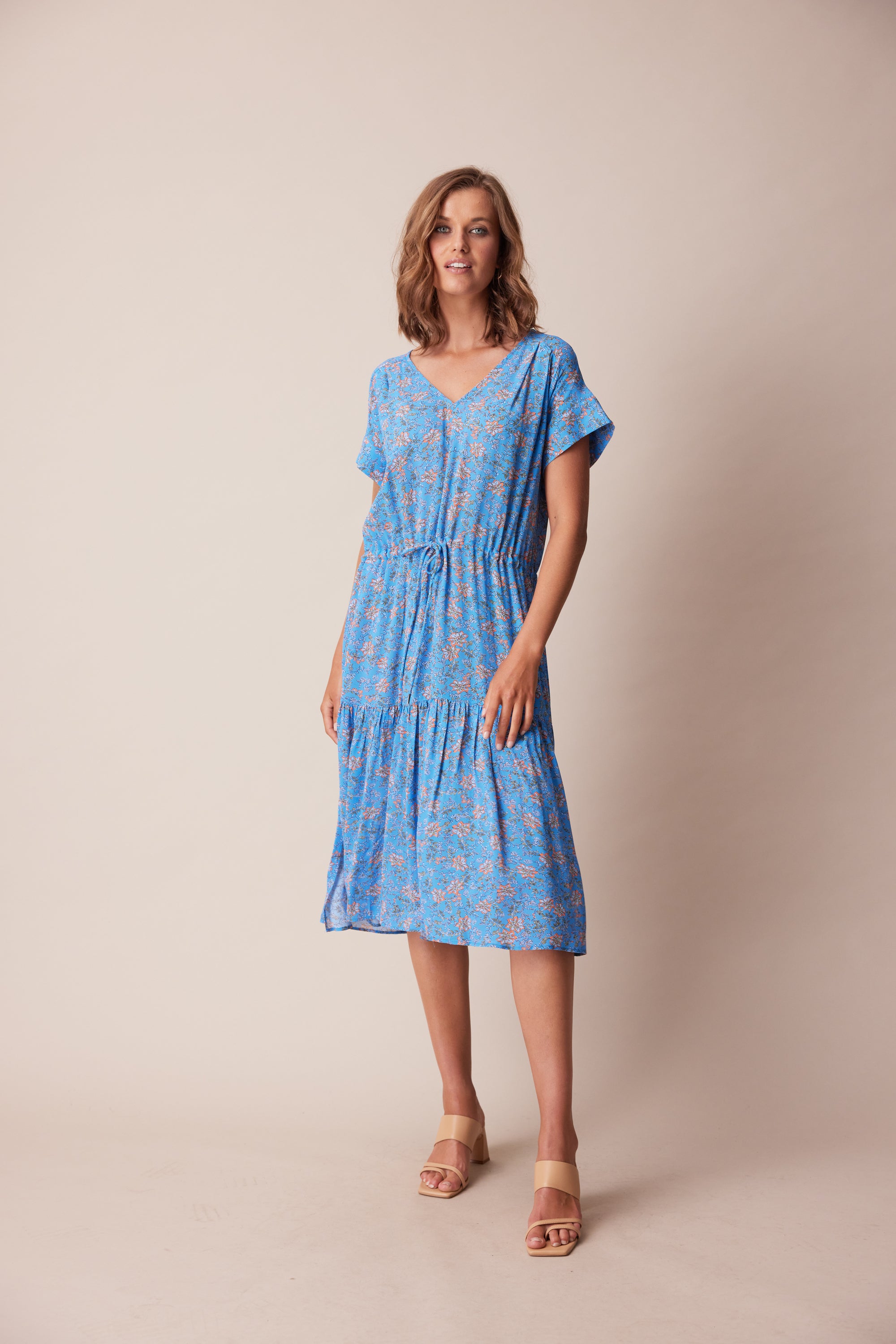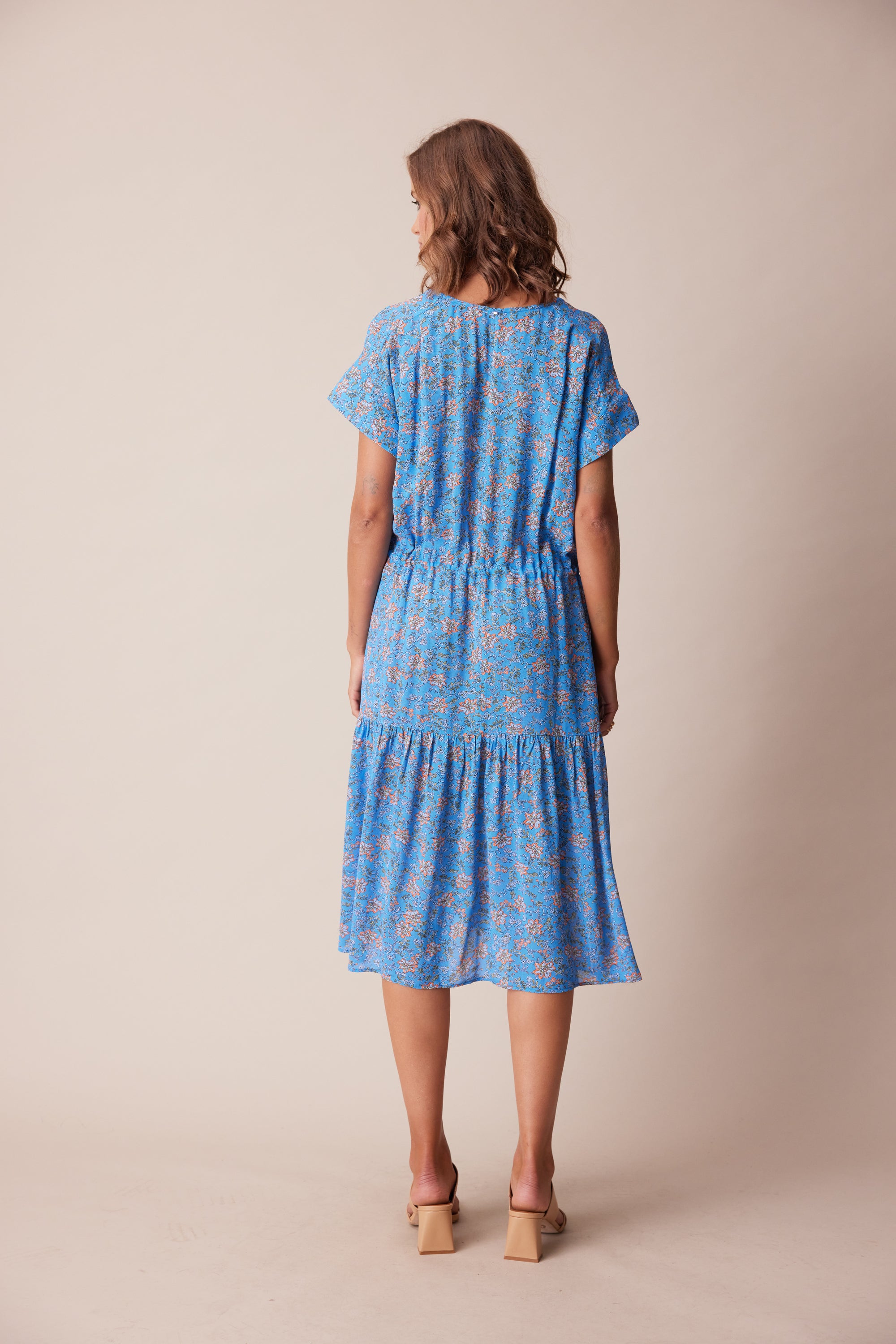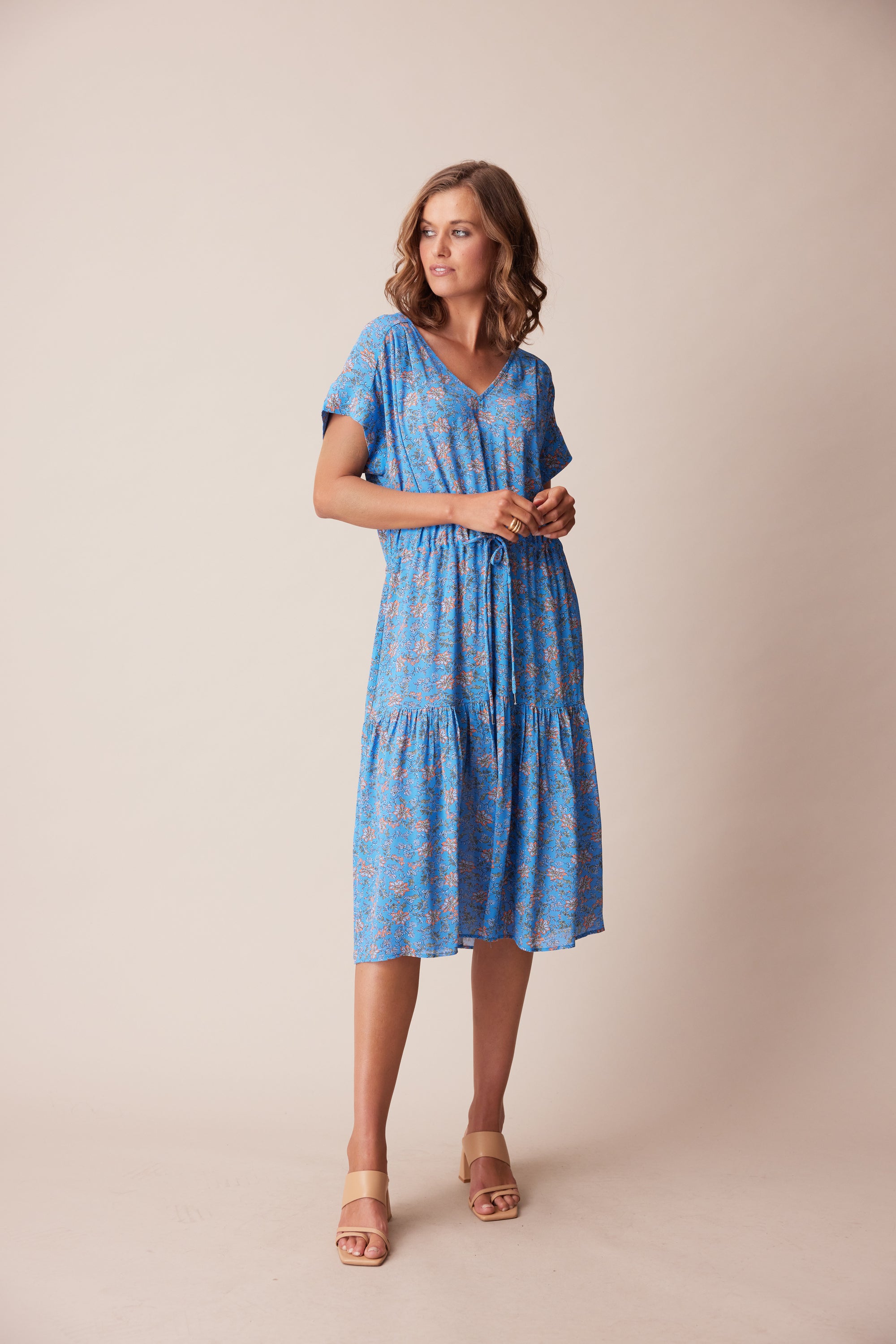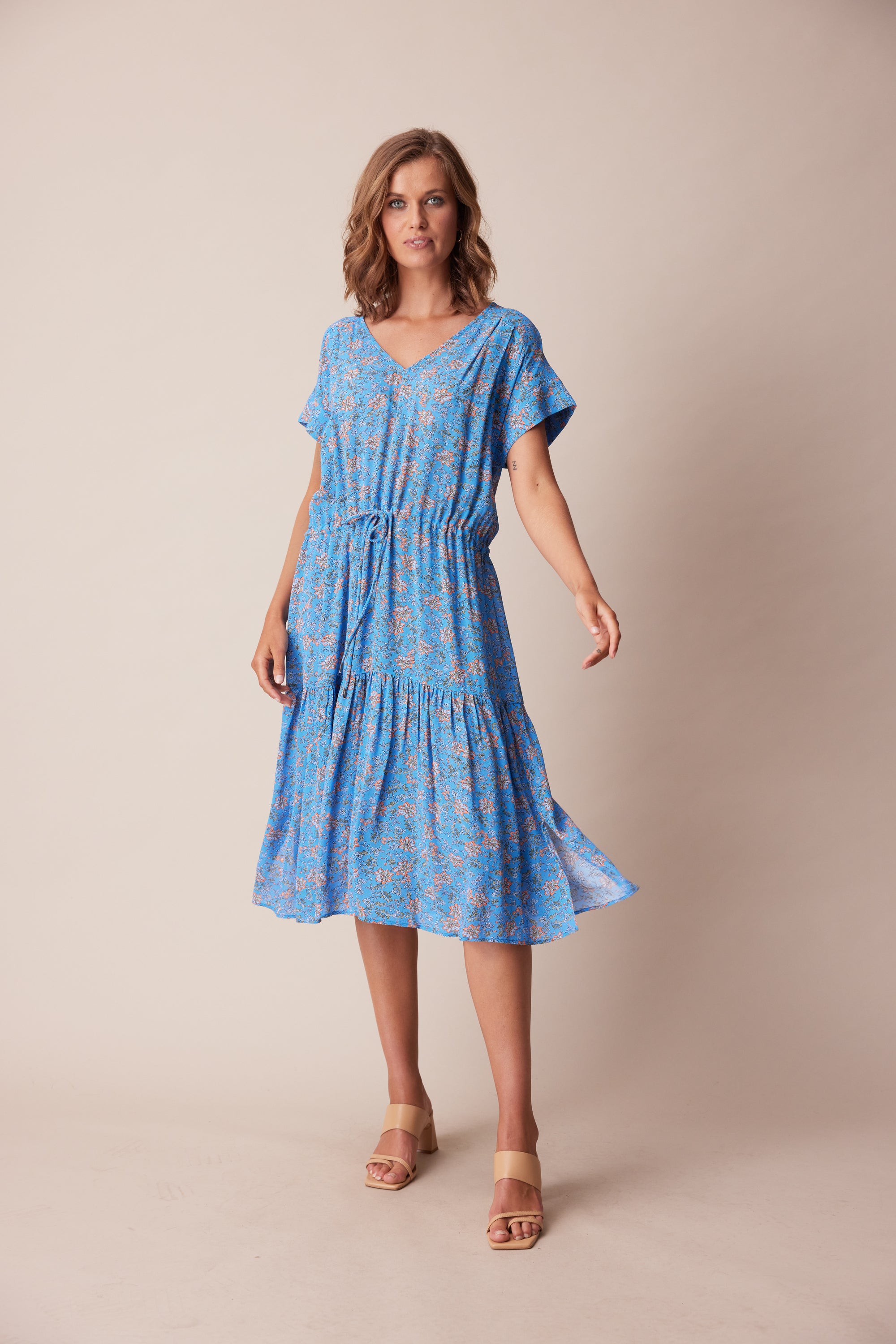 The delicate floral print in fluid georgette lends itself perfectly to the floaty, loose-fitting silhouette of the Dorset Dress. Bodice pleats and a lightly gathered skirt create a soft drape, whilst an adjustable waist tie lightly cinches the waist. A wide V-neck and soft cuff band add a modern touch to this ultra-feminine style.