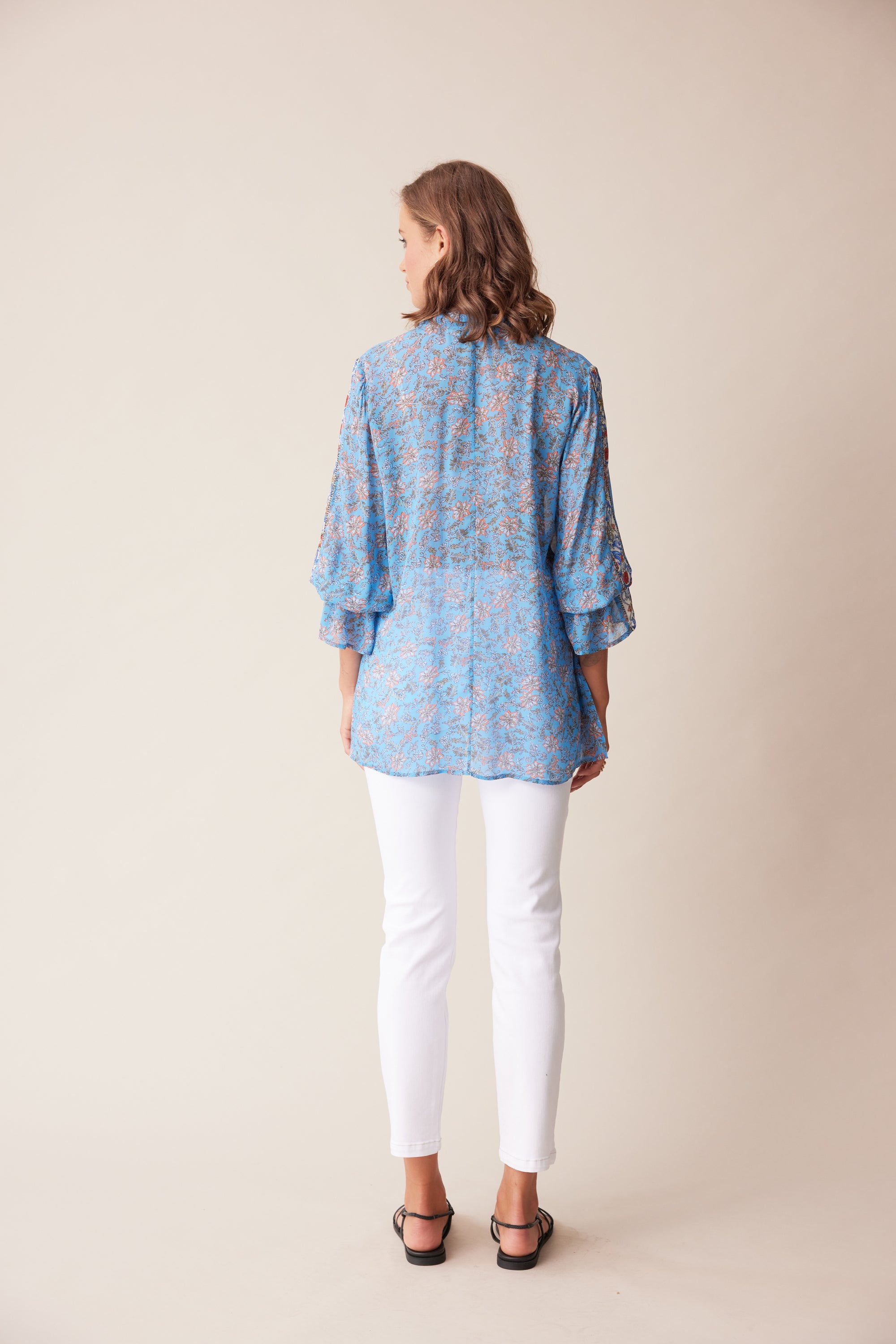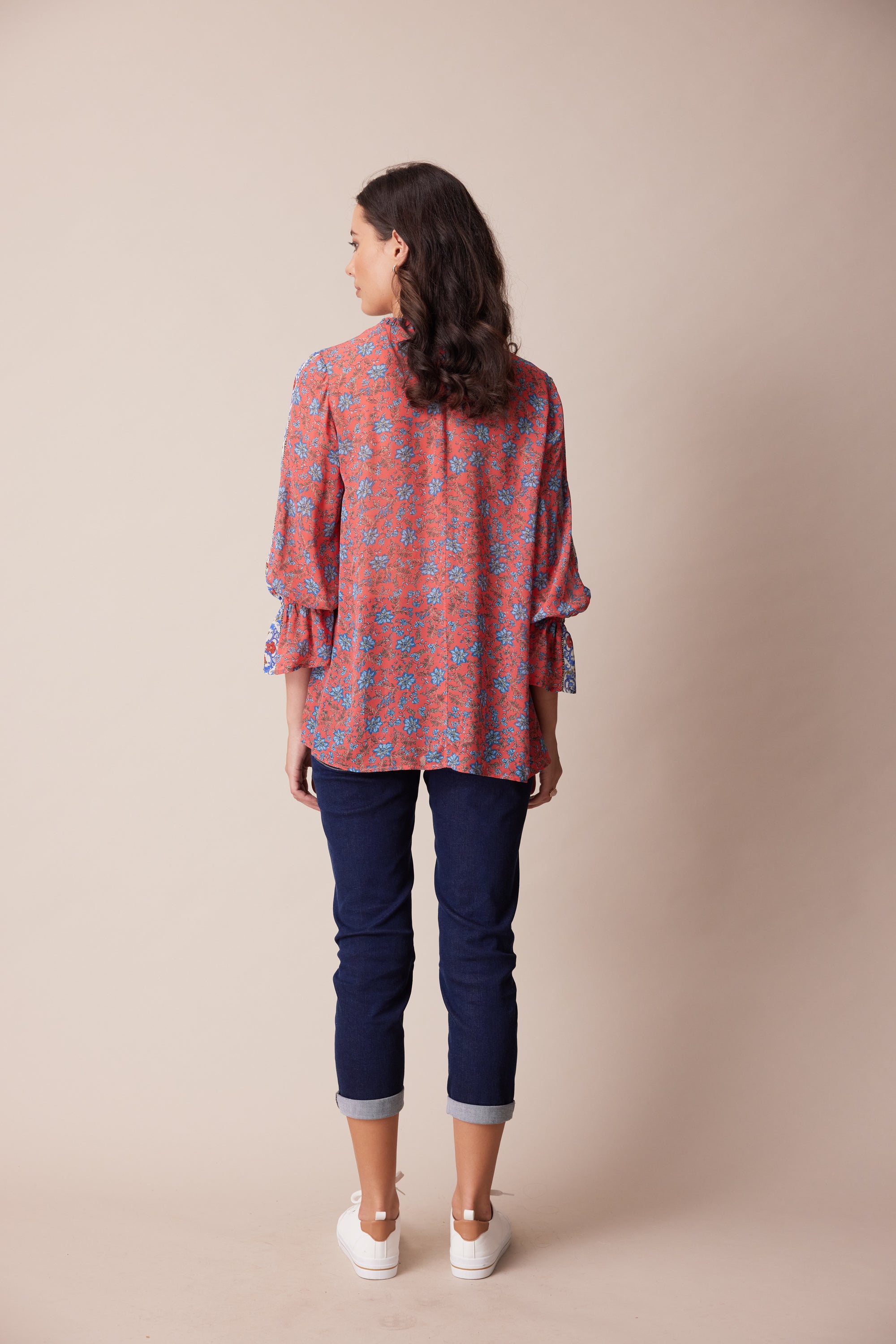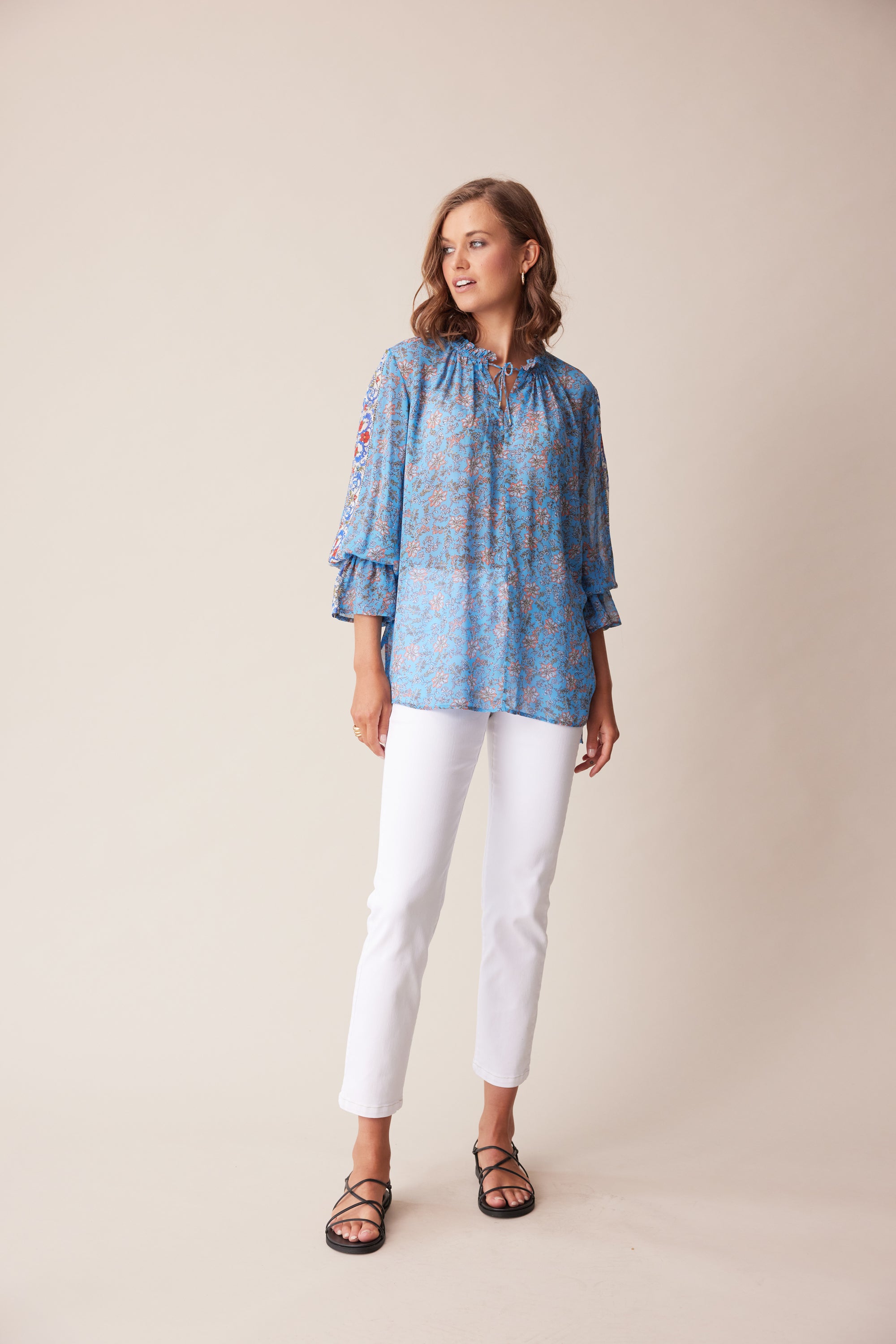 A delicate floral print blouse with full sleeves, elevated by the ornate border print at the overarm. The gathered neckline culminates in a V split opening and rouleaux ties at the front with shiny gold metal tie ends.