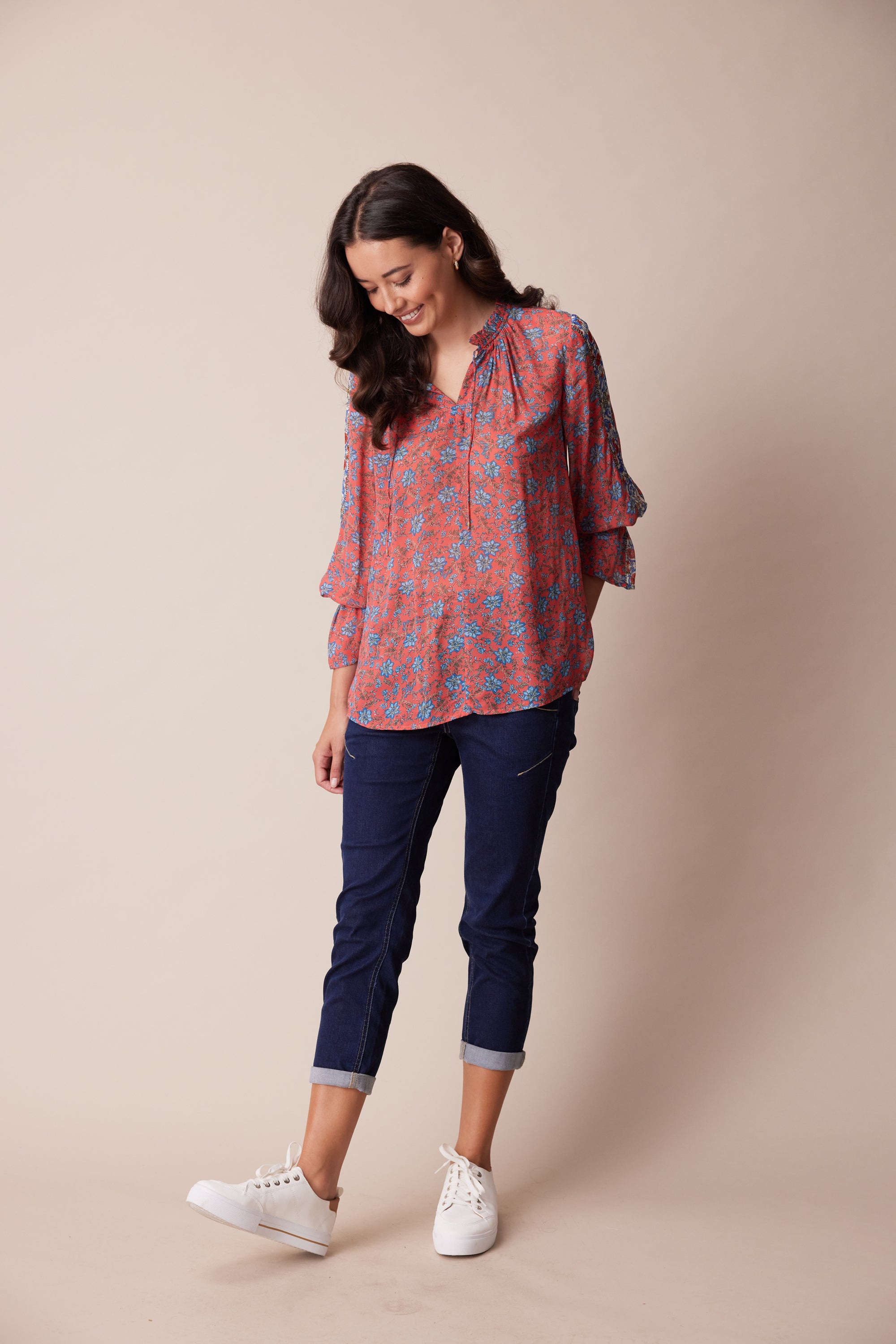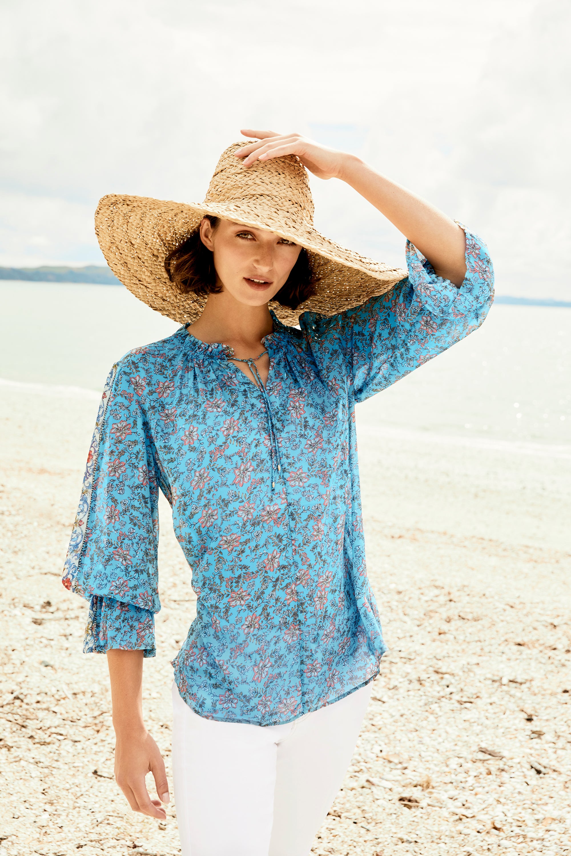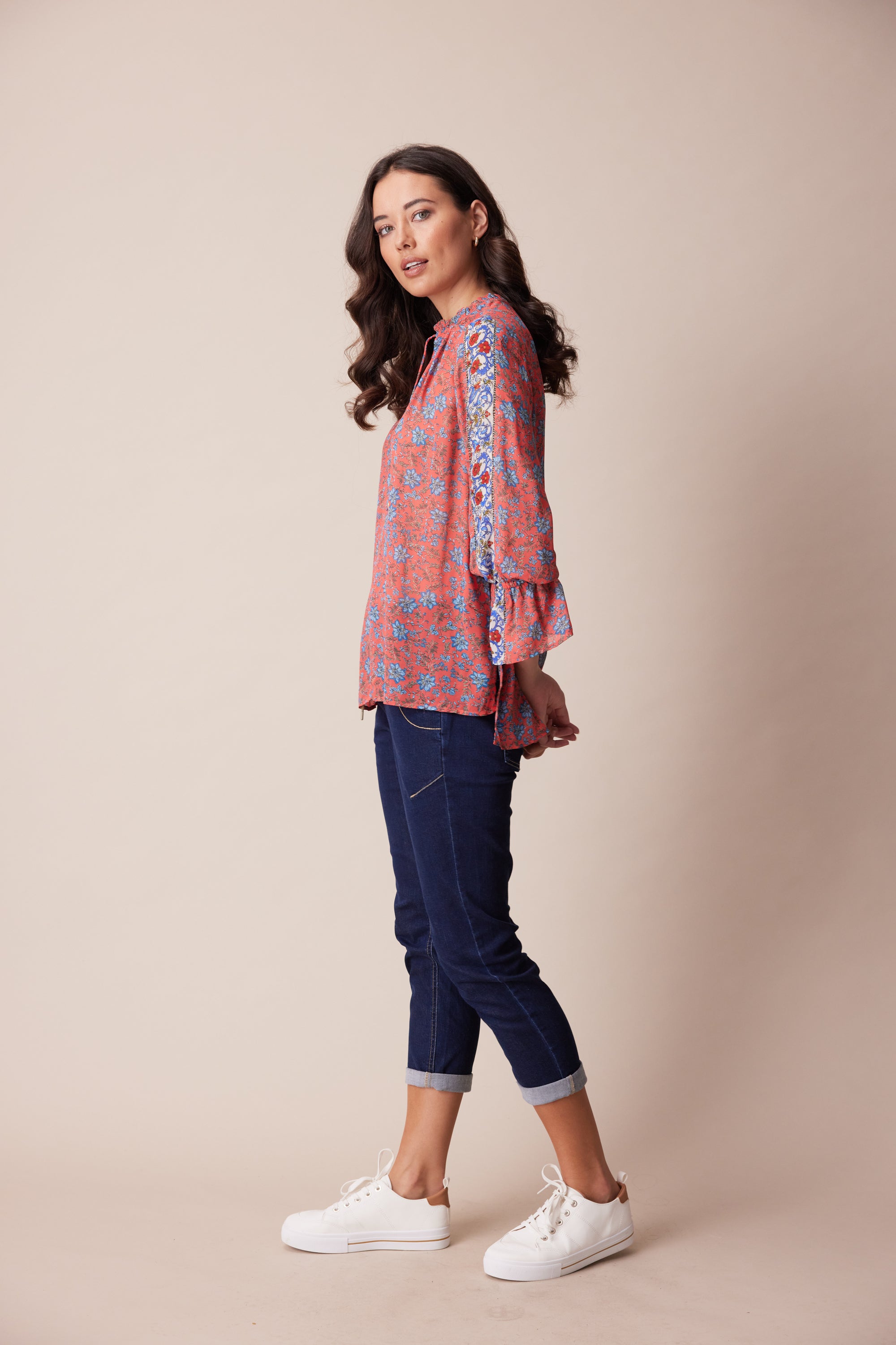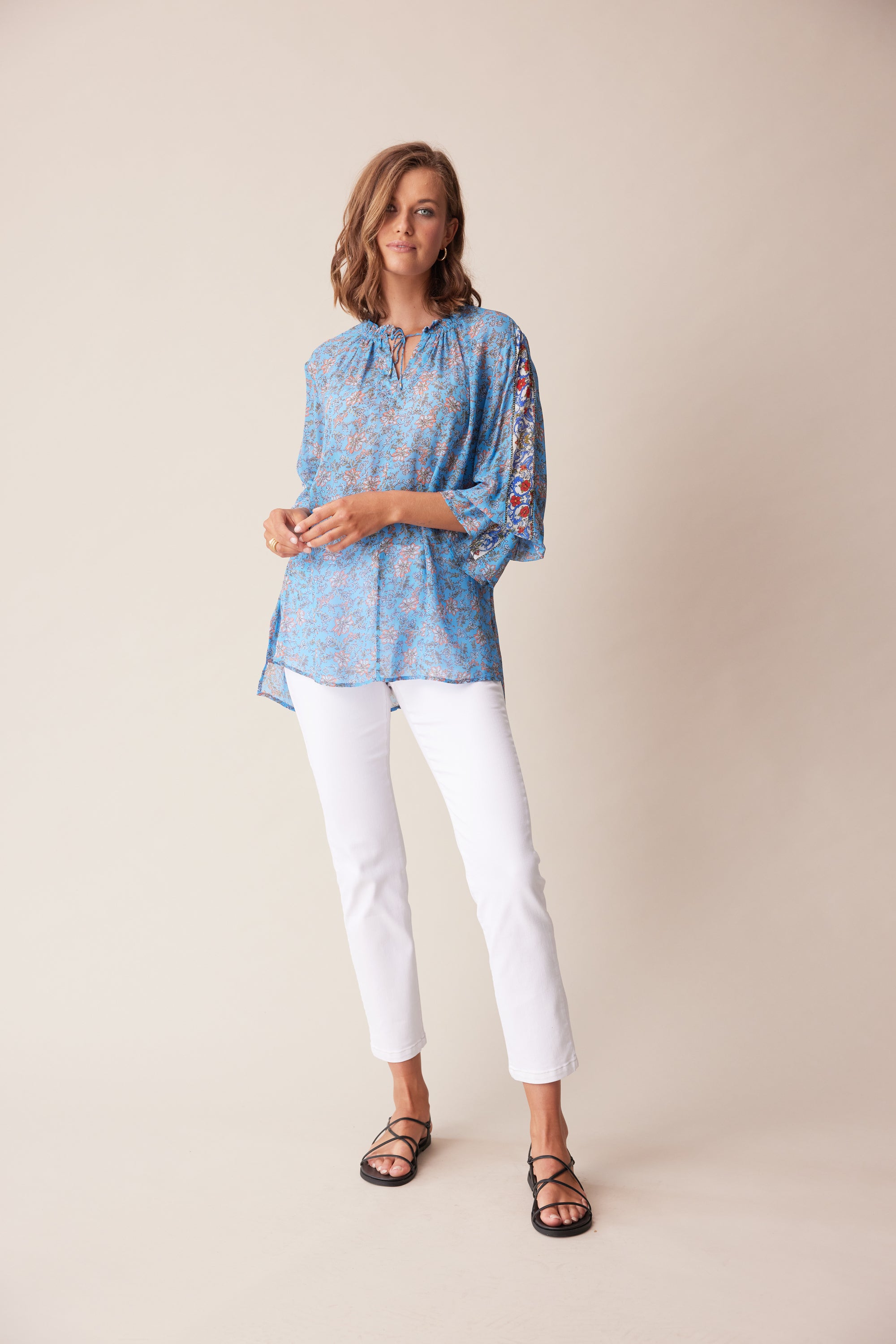 A delicate floral print blouse with full sleeves, elevated by the ornate border print at the overarm. The gathered neckline culminates in a V split opening and rouleaux ties at the front with shiny gold metal tie ends.