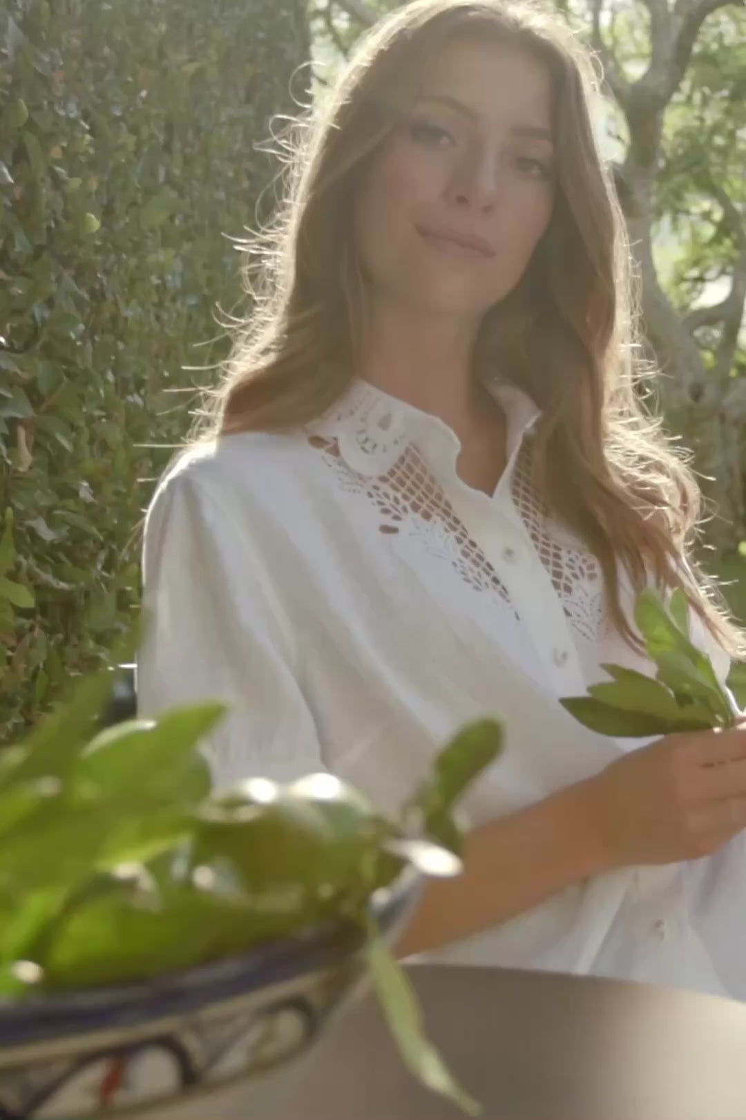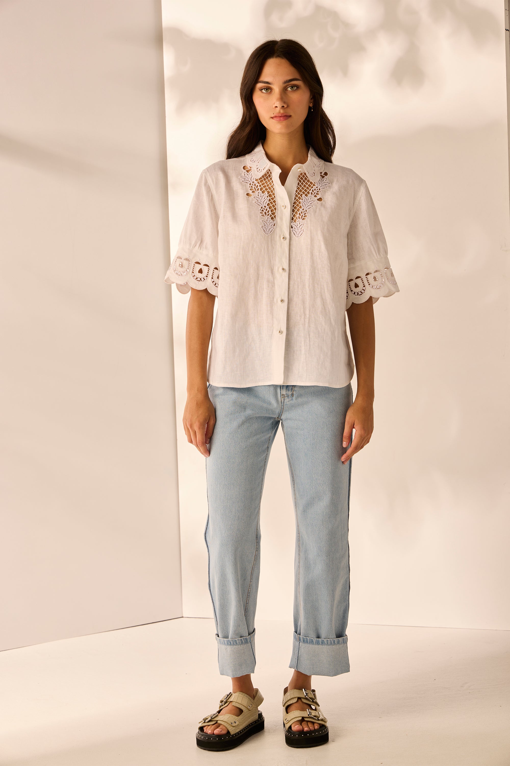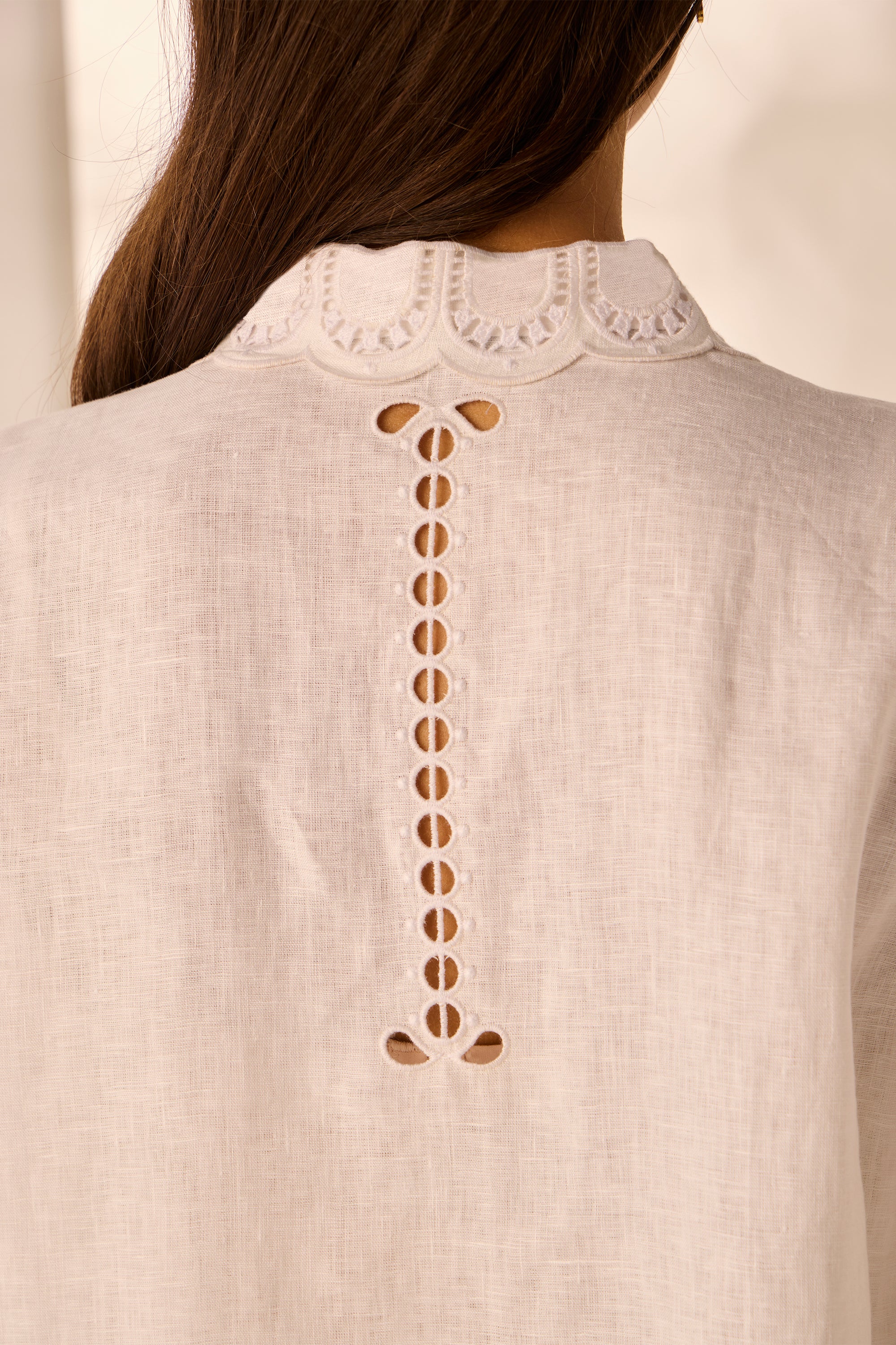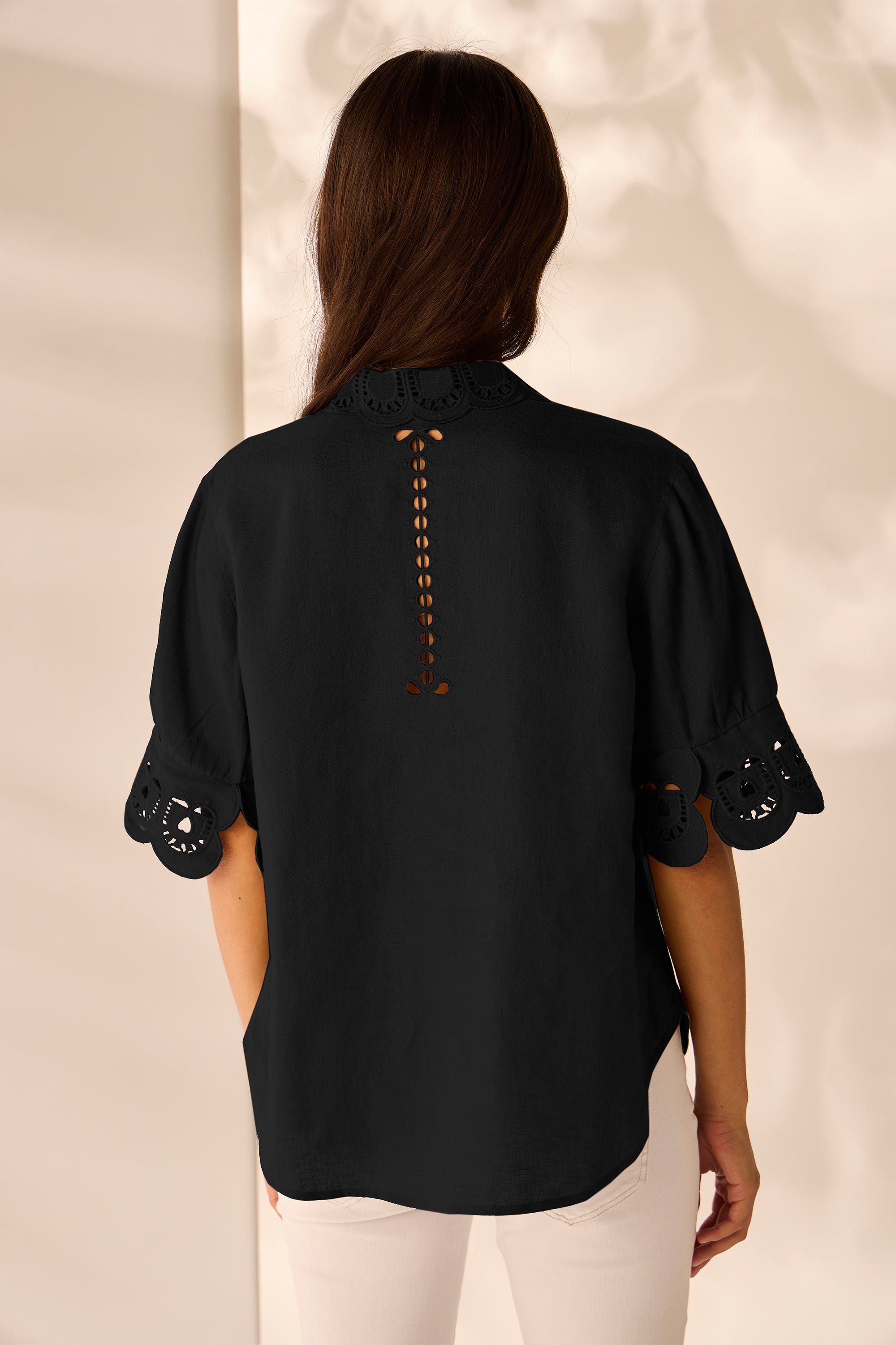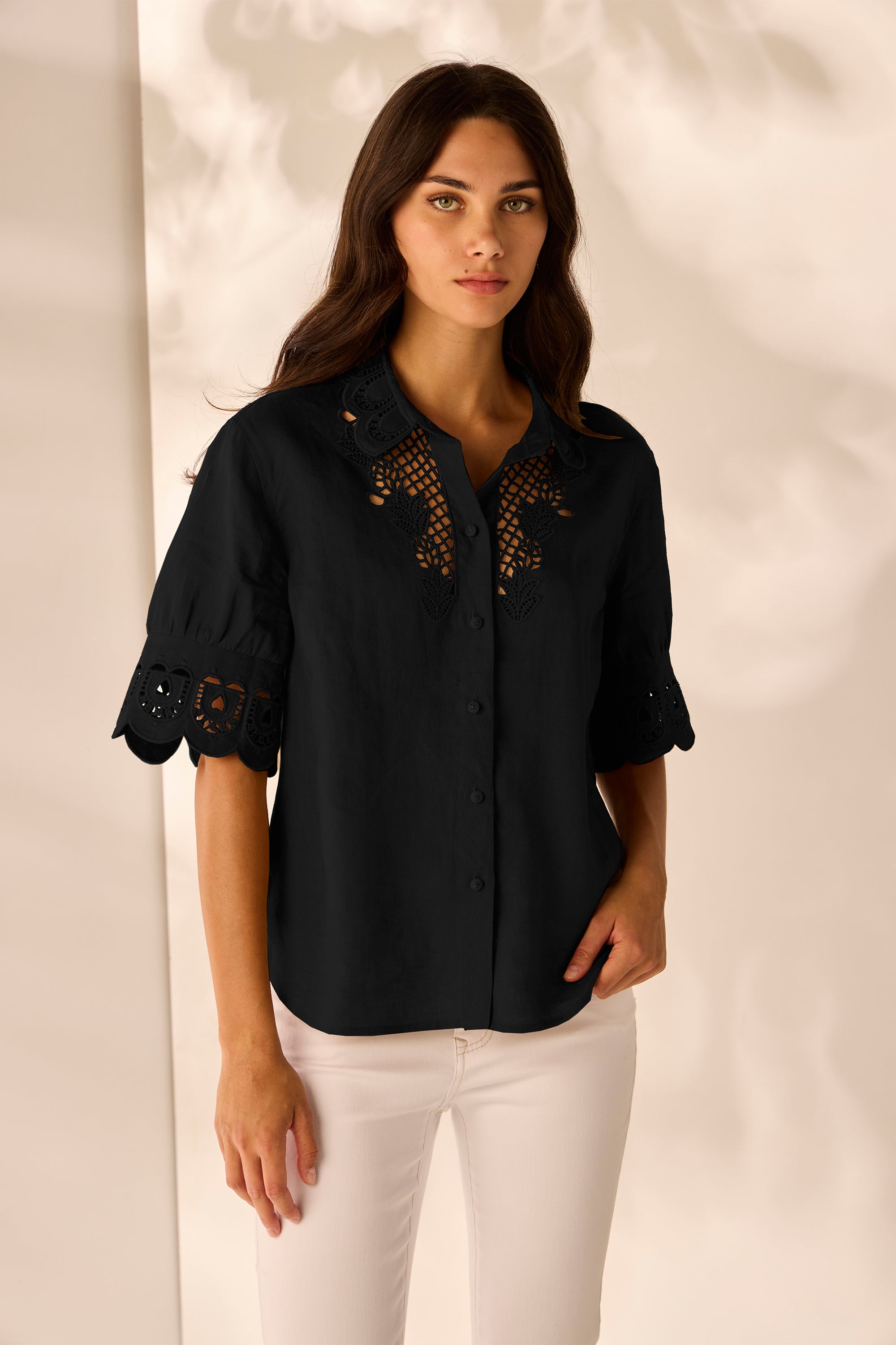 Discover effortless style with the Eliza Shirt. The intricate cut-out embroidery design at the collar, around the neckline and on the sleeve cuff enhances its artistic appeal. Complete with self-covered with nickel bow buttons, this shirt is a versatile addition to your wardrobe.
