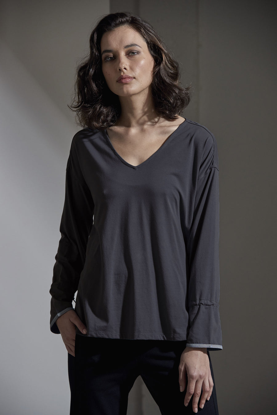 100% cotton V-neck tee; long sleeve with adjustable gather detail at back waist and cuff.