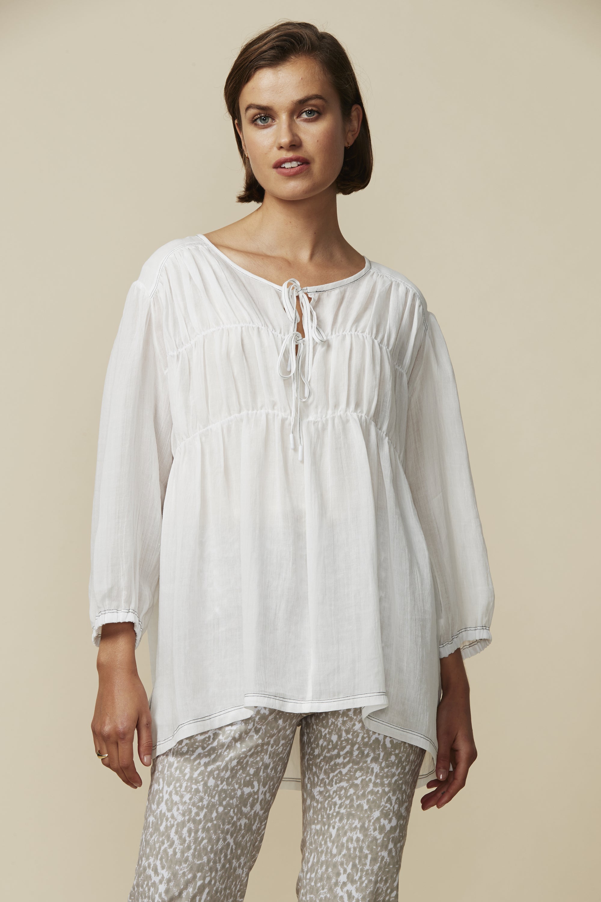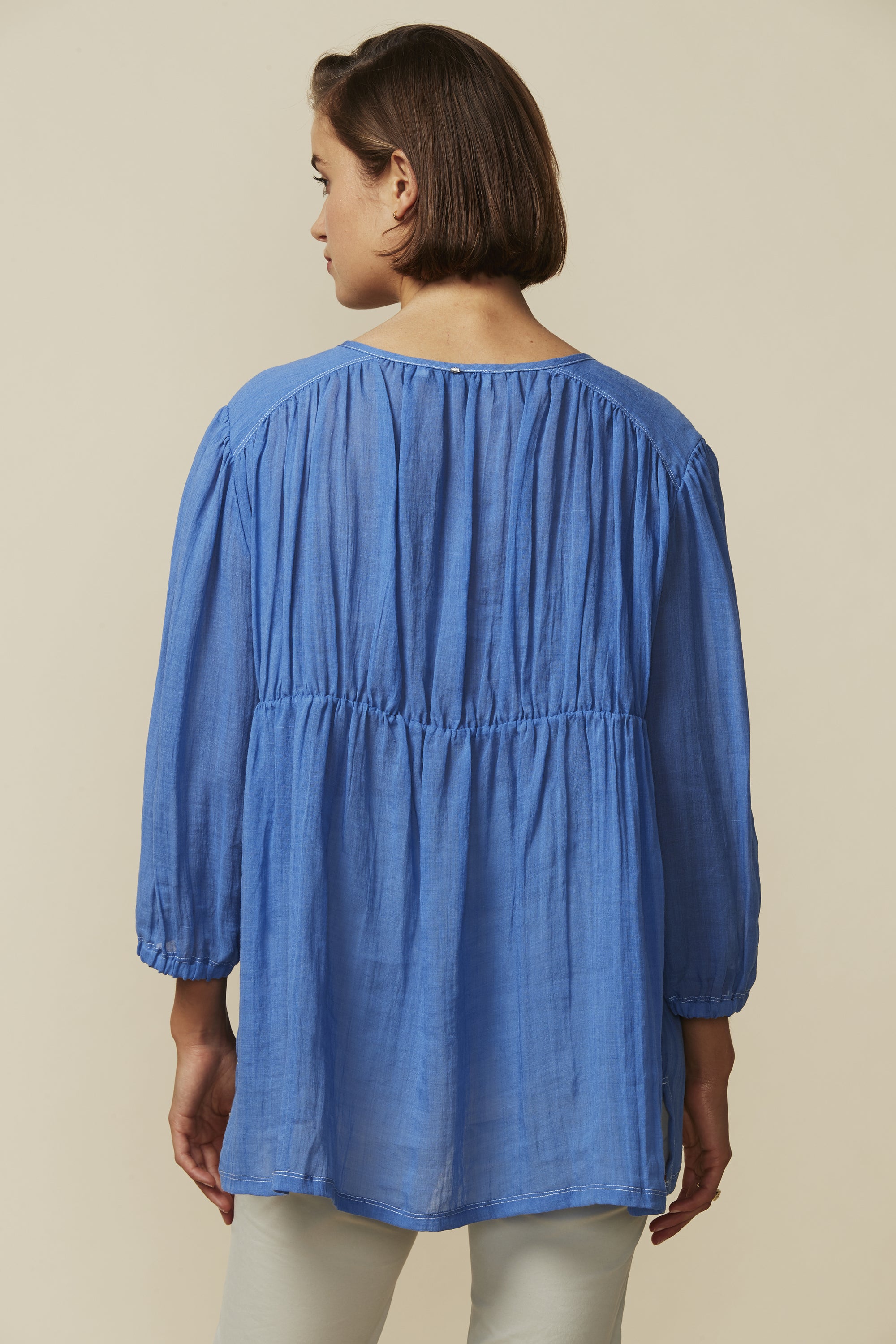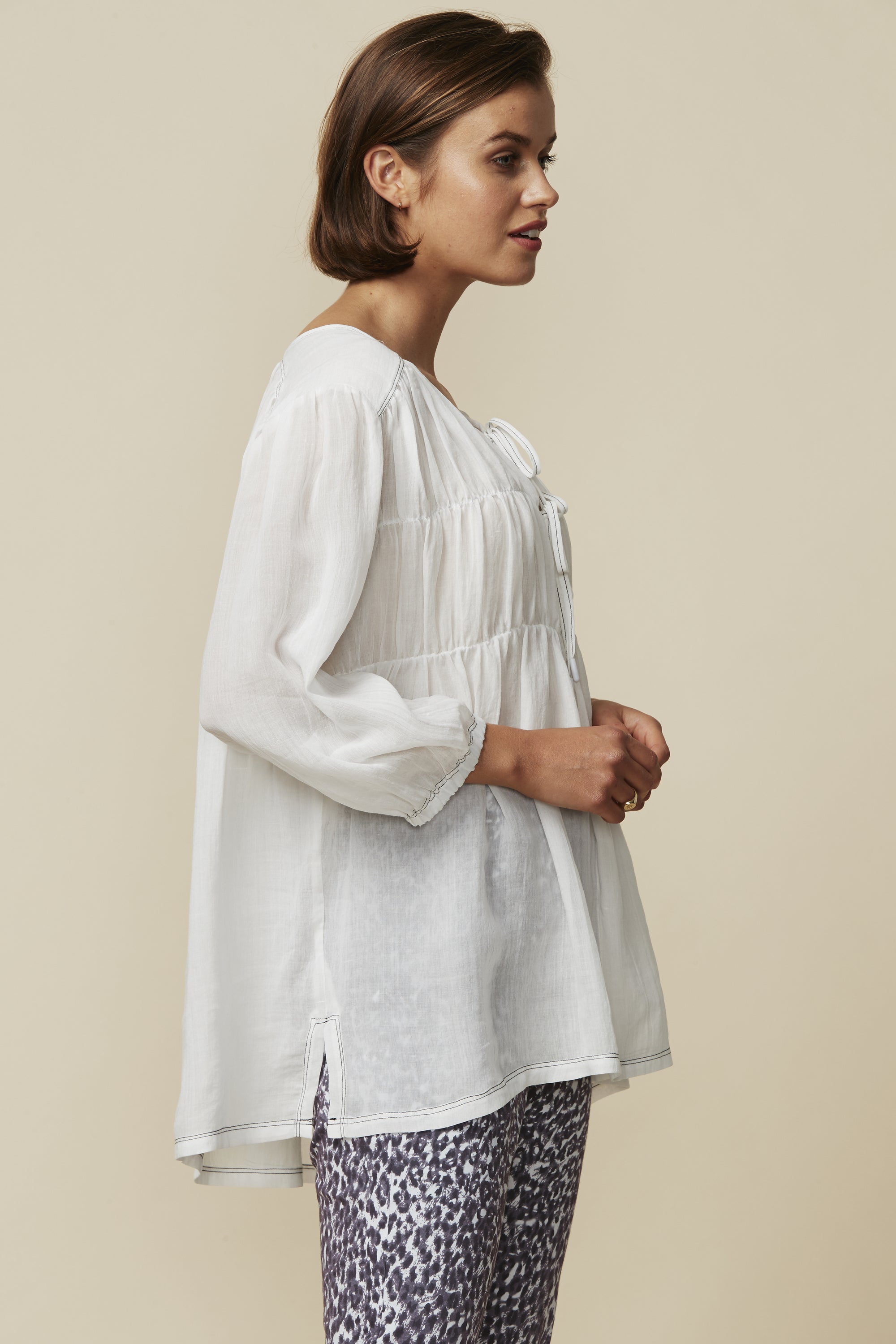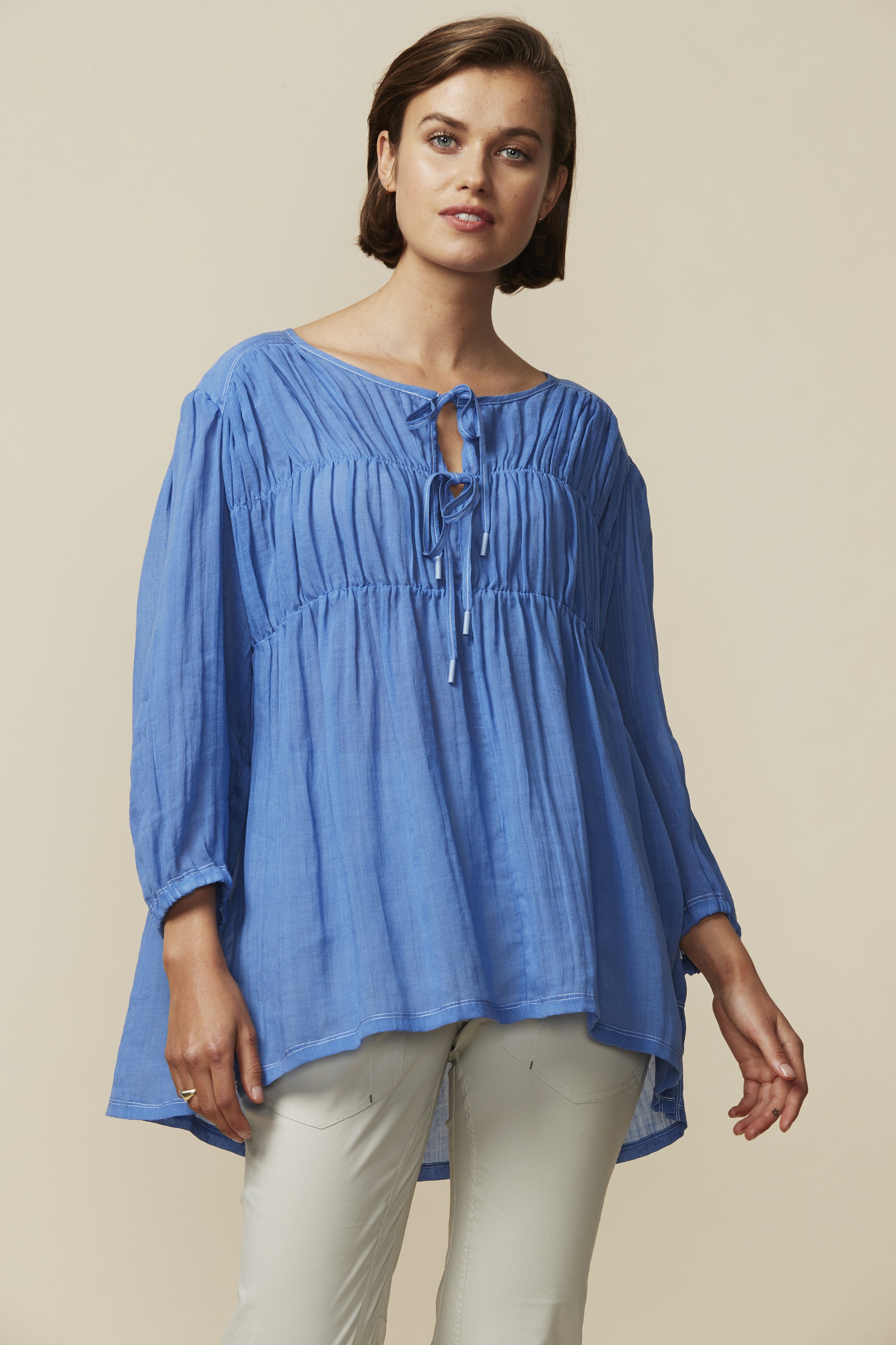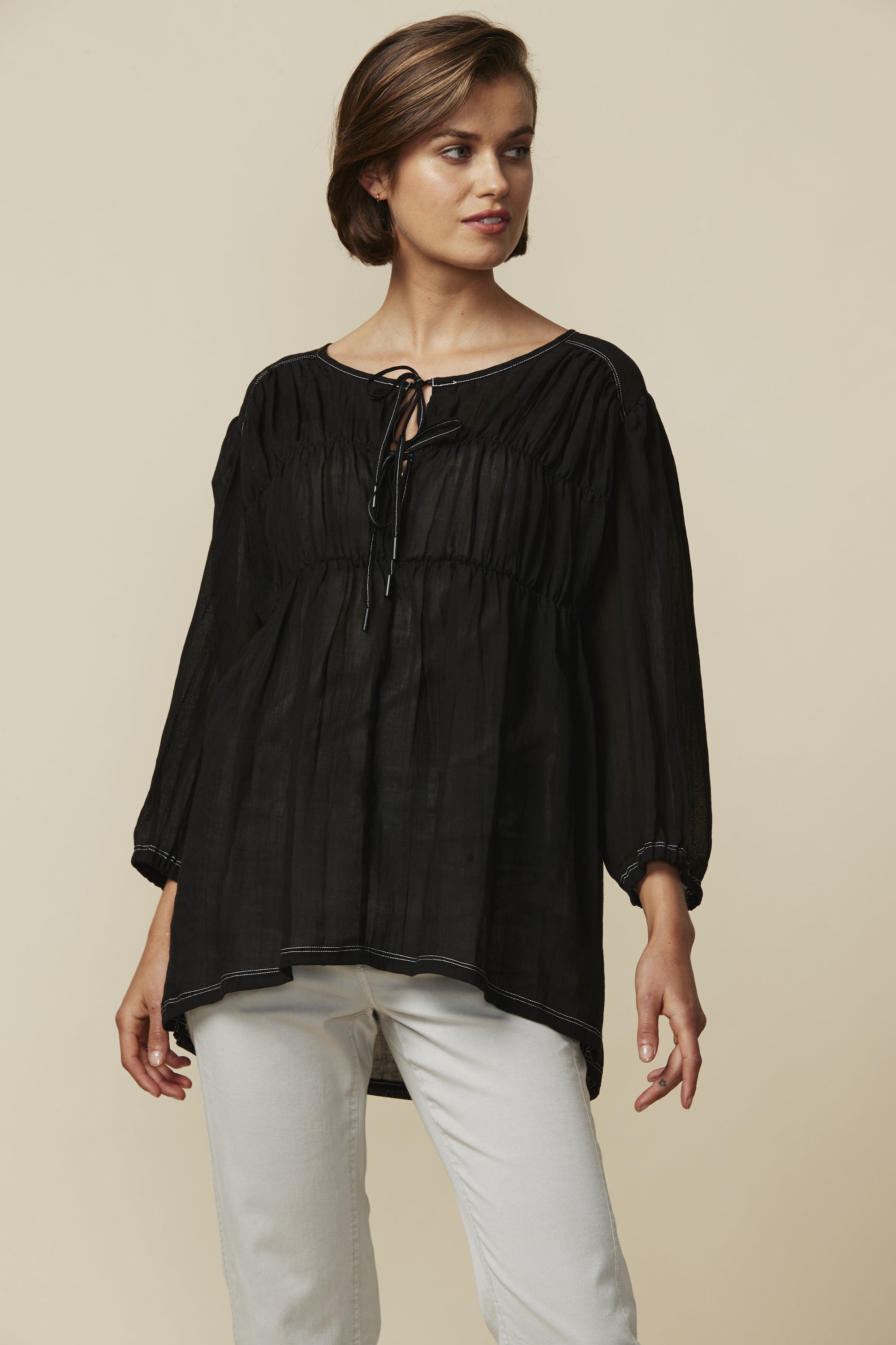 A delightful shirt in a ramie tencel mix fabric — double tie front detail, elbow length sleeve with elastic cuff; high low hem and contrast stitching; gathers on the body create a feminine silhouette.