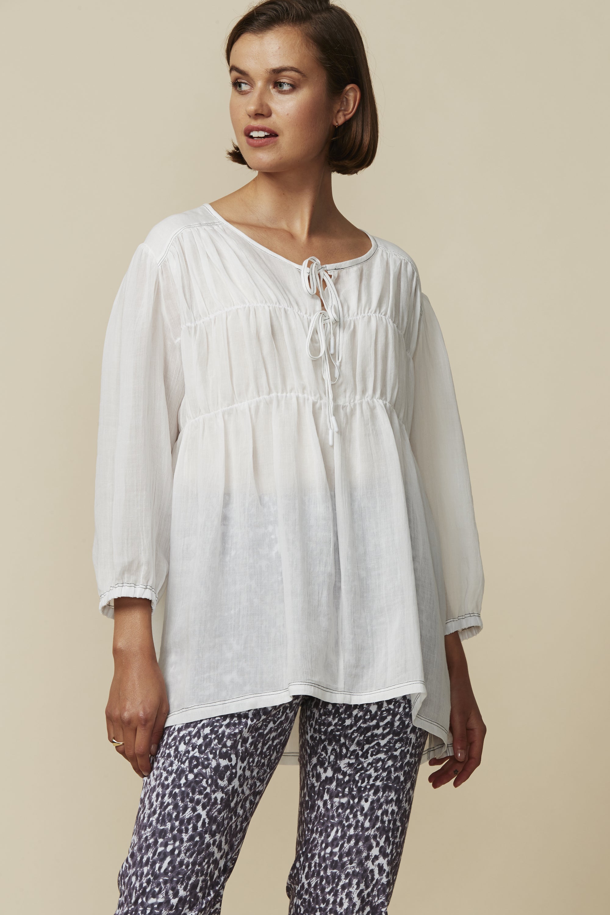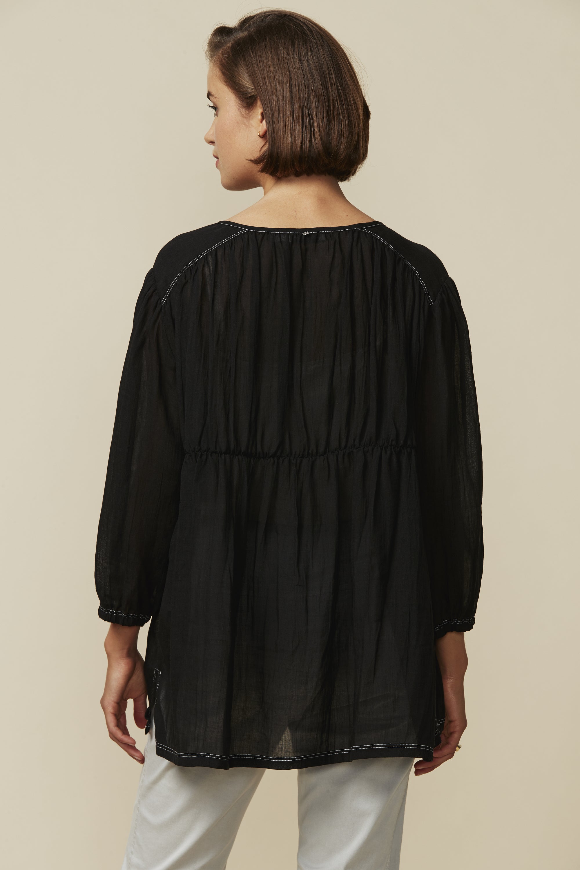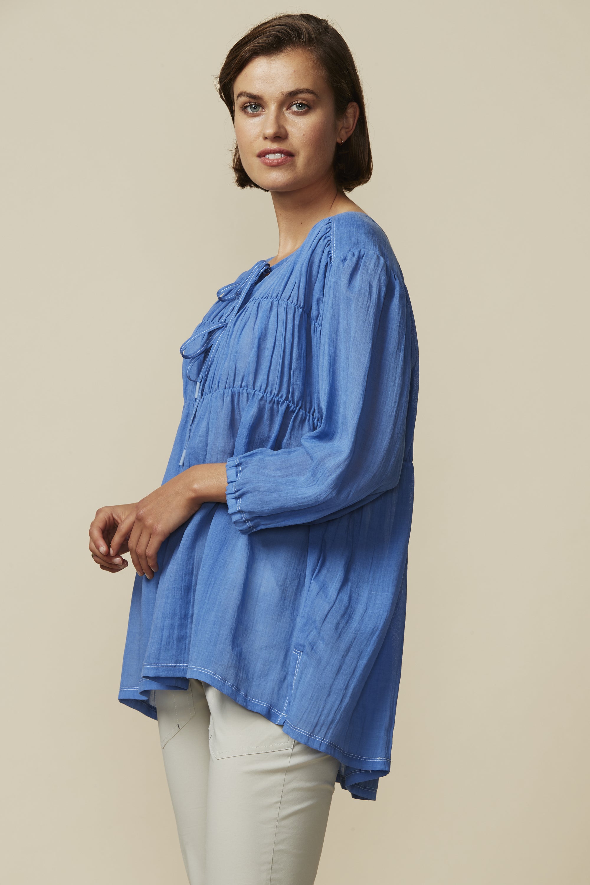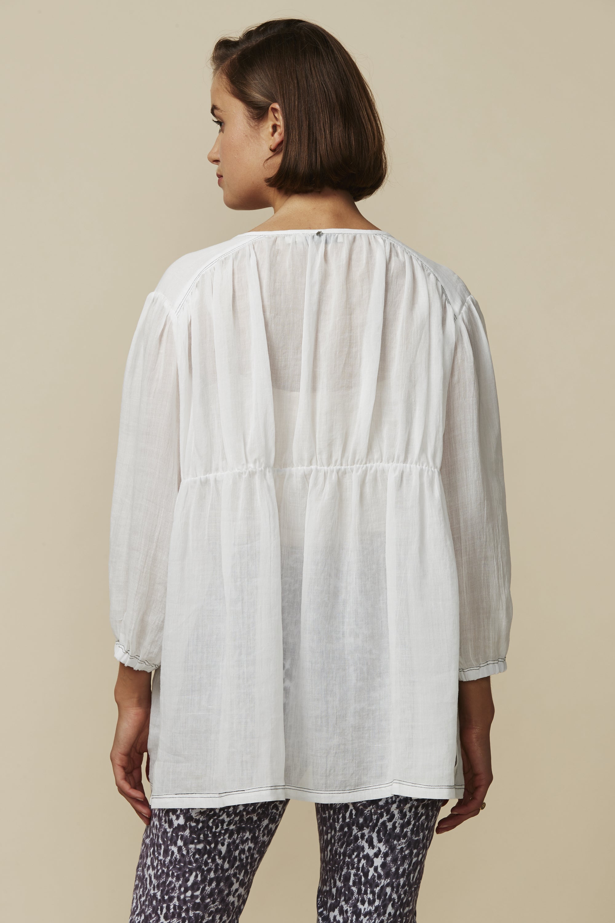 A delightful shirt in a ramie tencel mix fabric — double tie front detail, elbow length sleeve with elastic cuff; high low hem and contrast stitching; gathers on the body create a feminine silhouette.