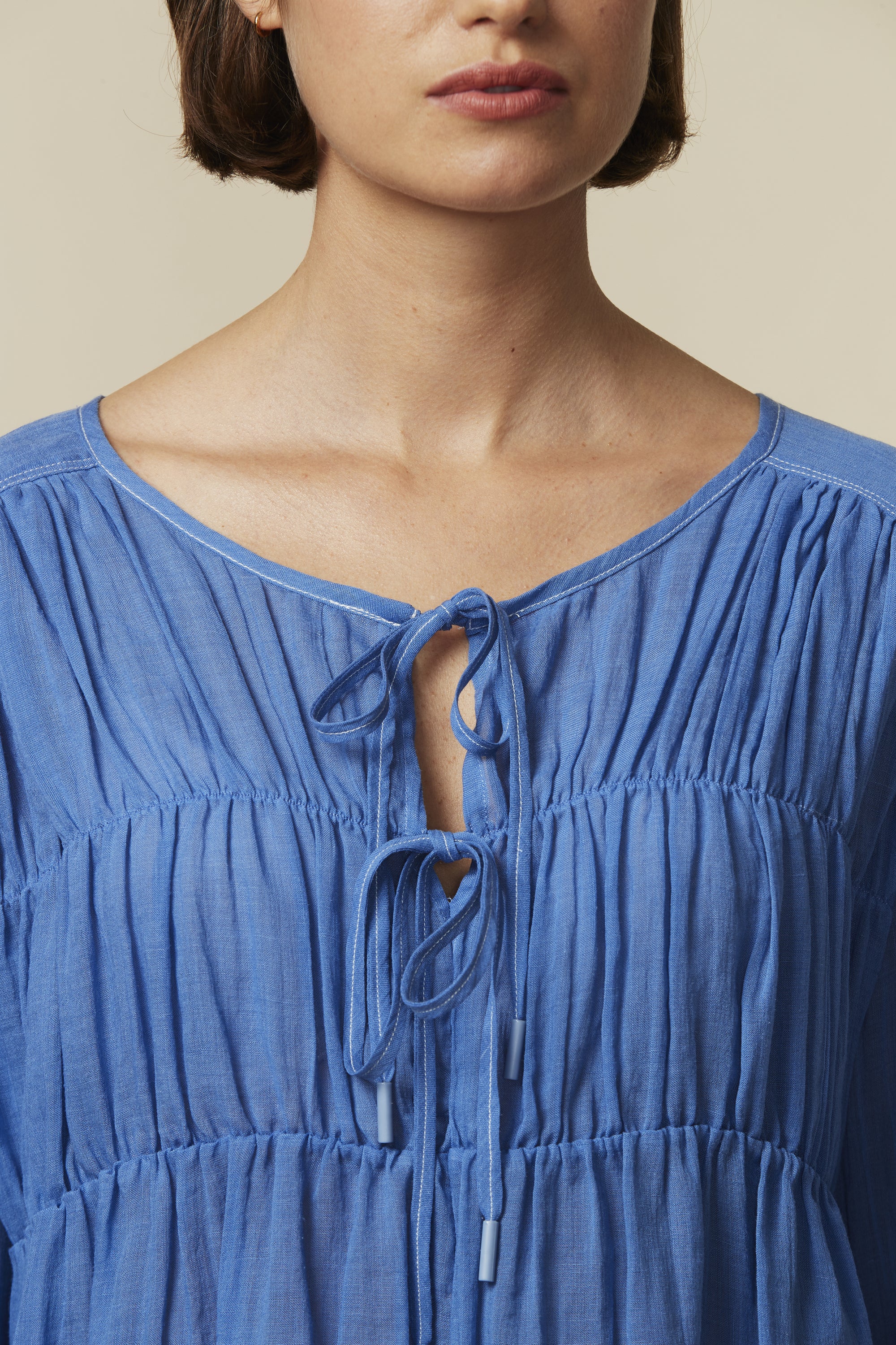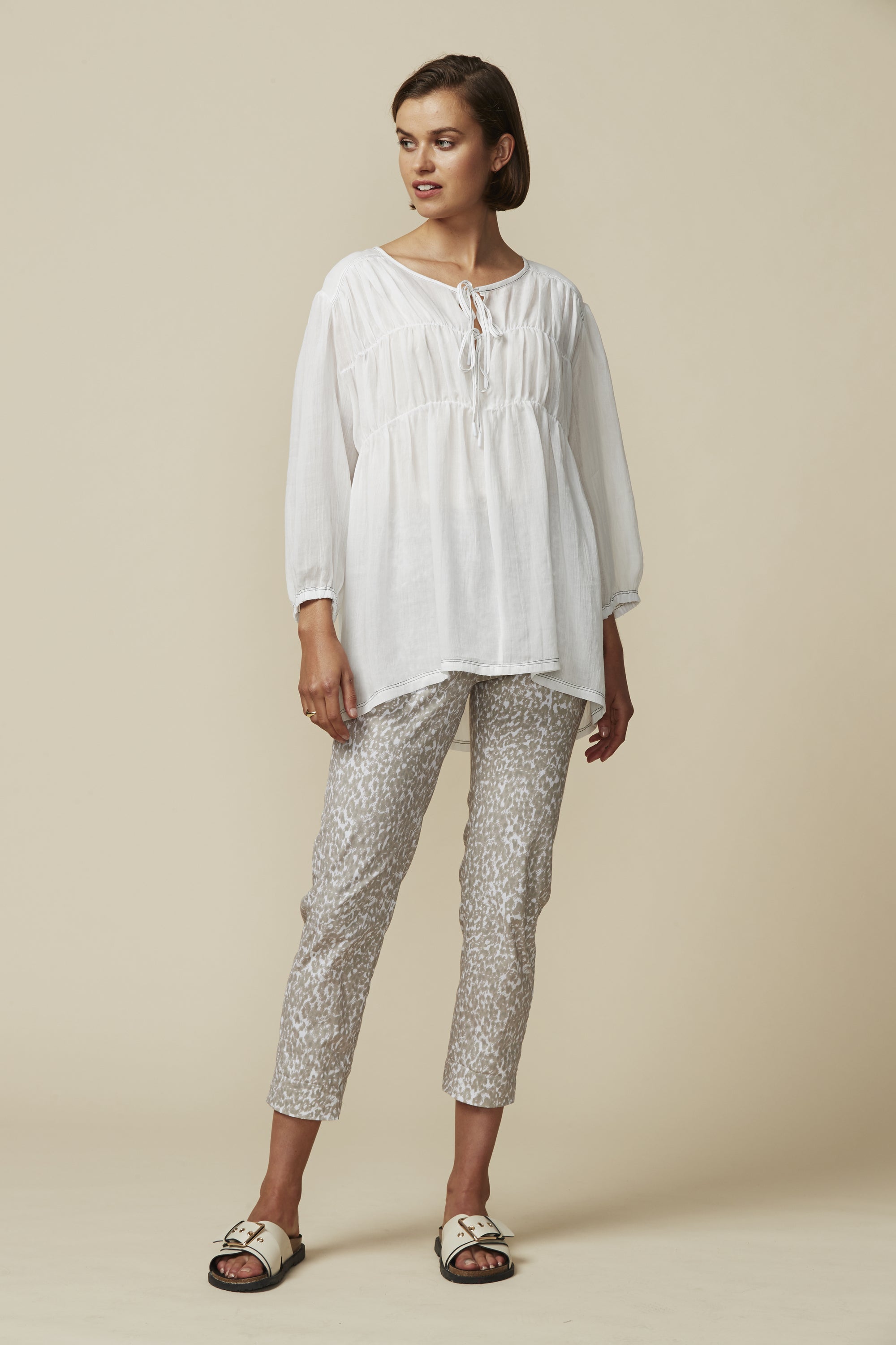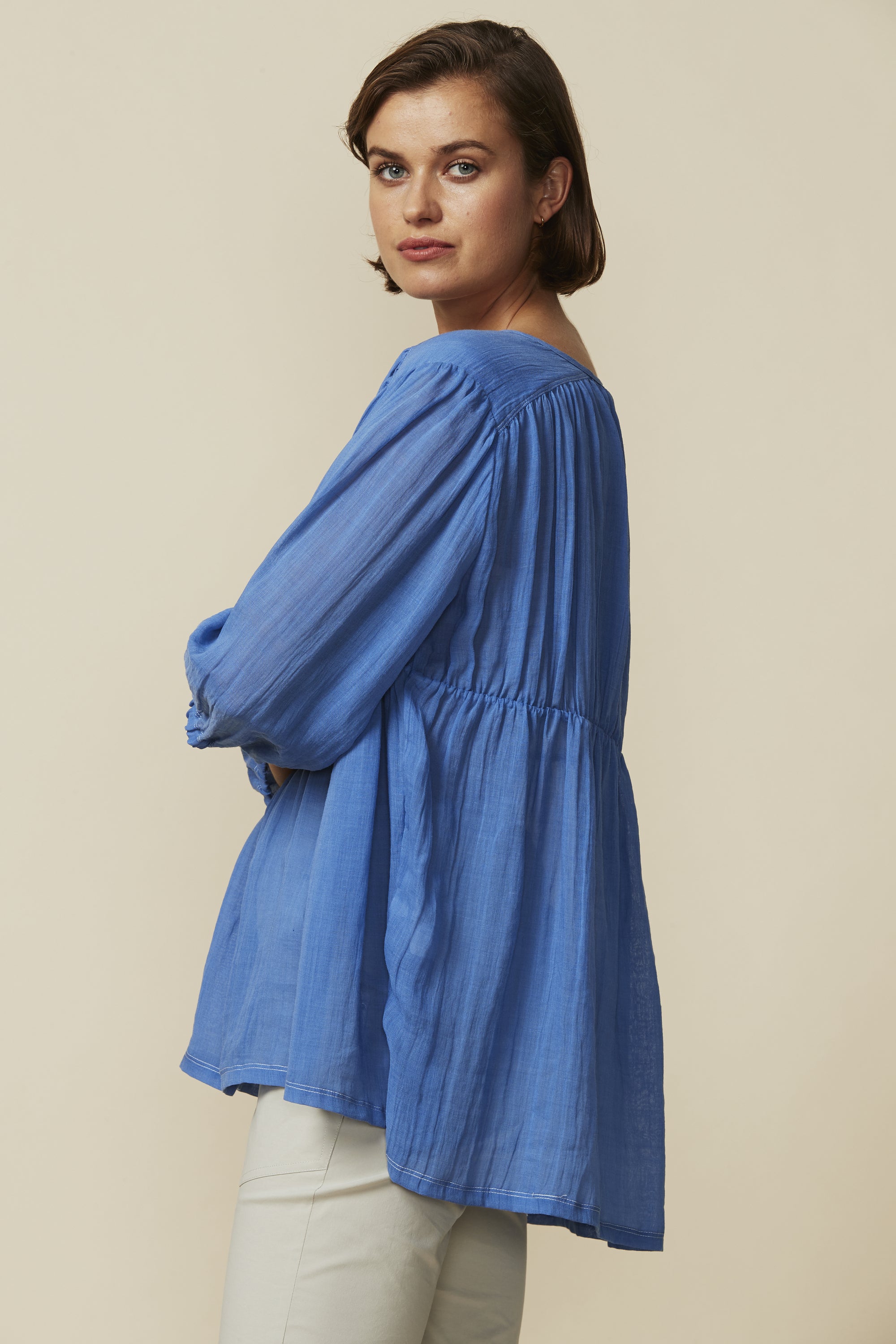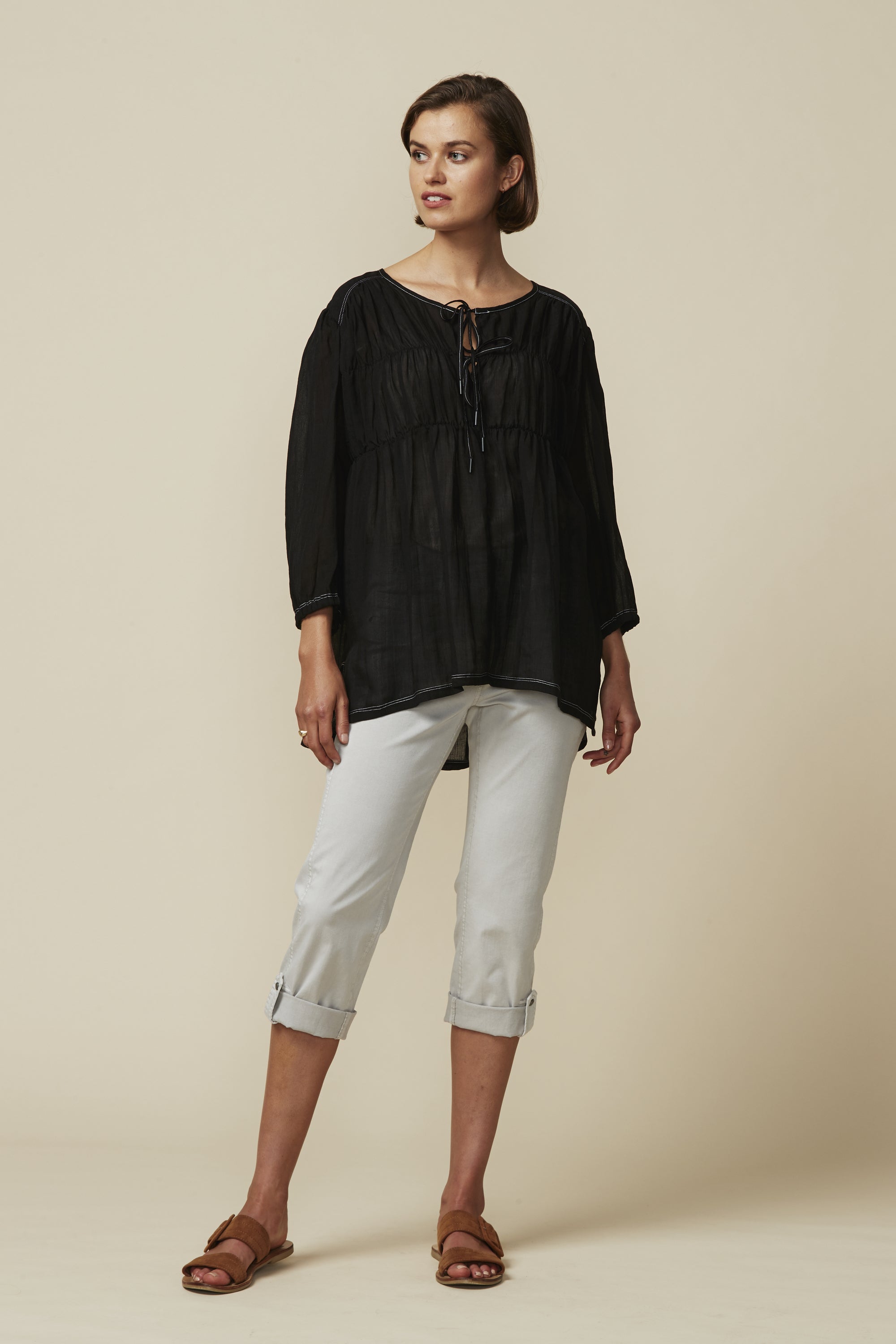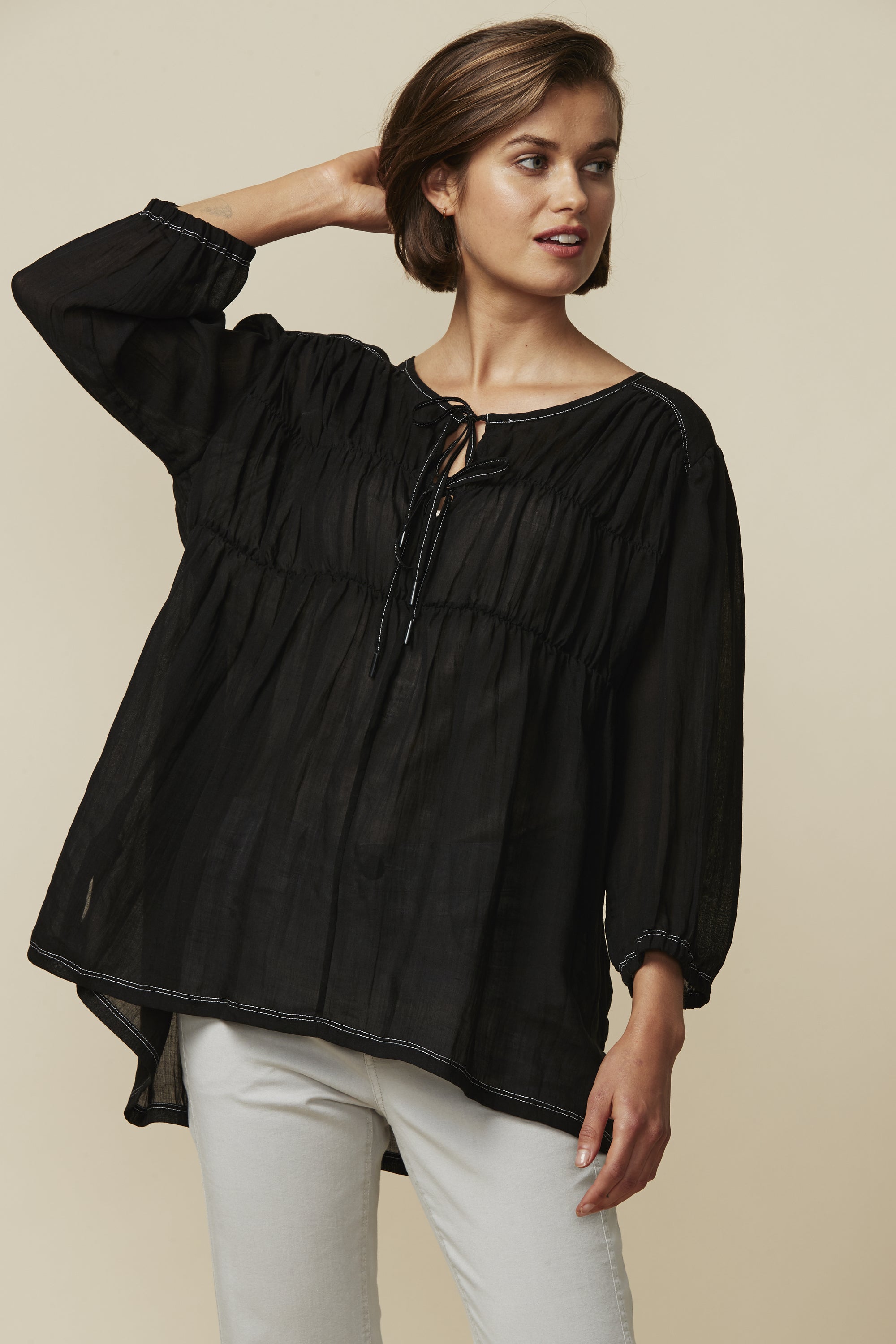 A delightful shirt in a ramie tencel mix fabric — double tie front detail, elbow length sleeve with elastic cuff; high low hem and contrast stitching; gathers on the body create a feminine silhouette.
