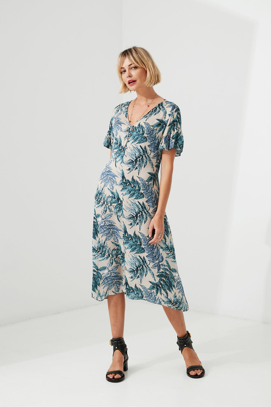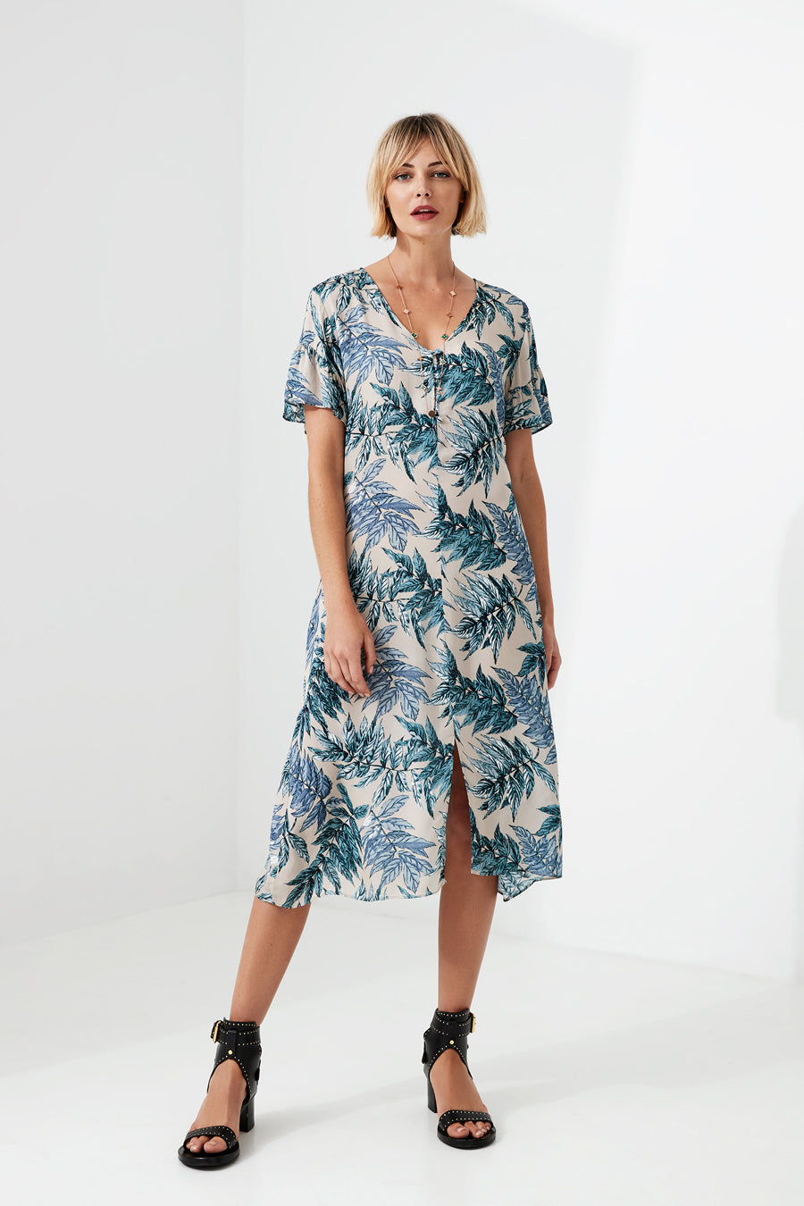 Our glade print in tonal almond colours. A flowy loose fit, sitting perfectly above the knee. Flattering neckline with covered shank buttons at front opening and short sleeves with frill.