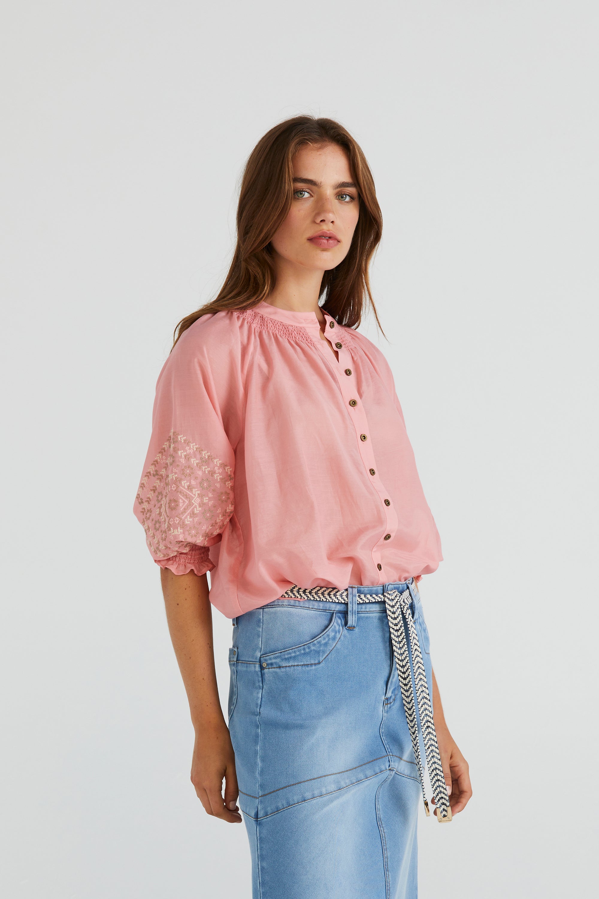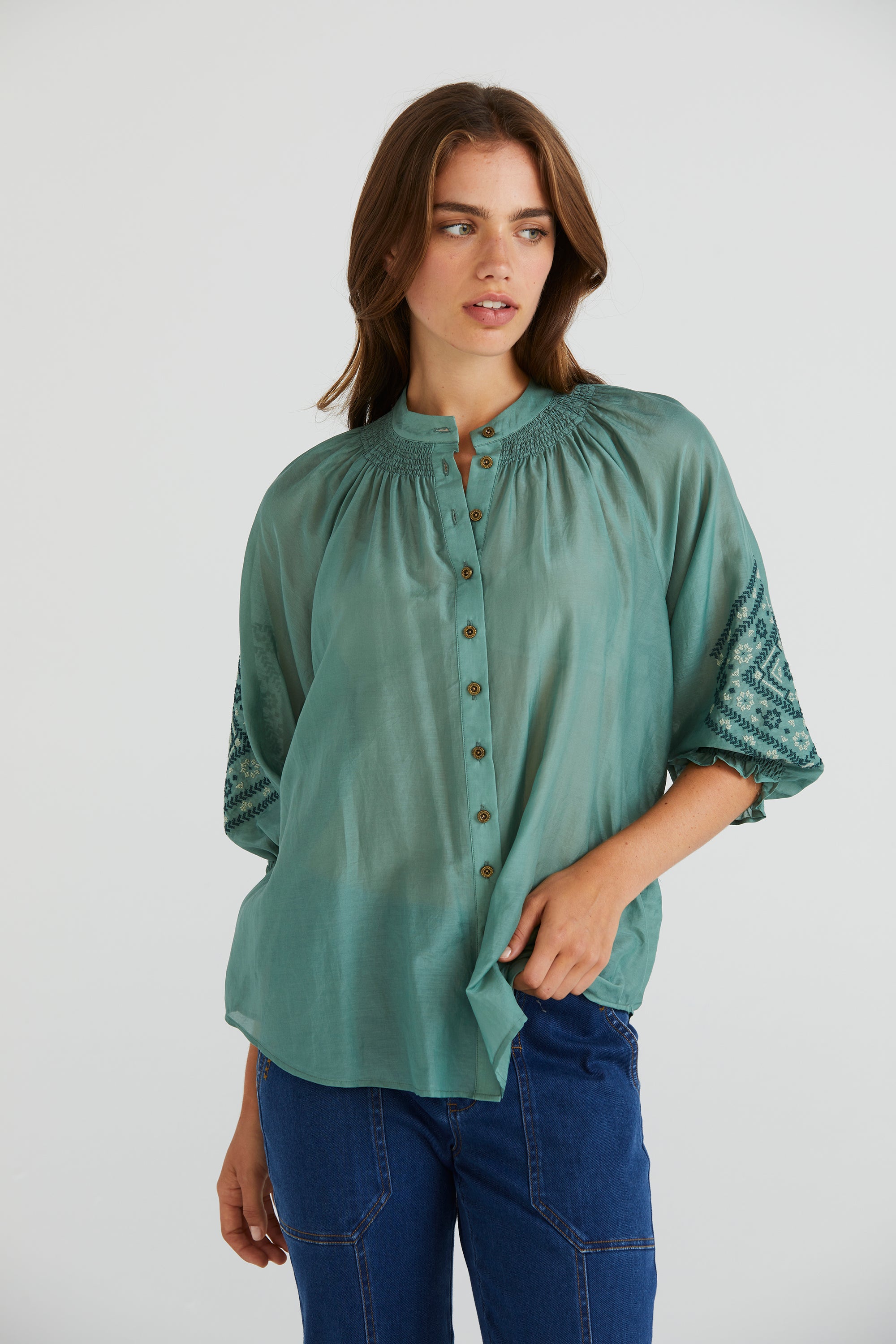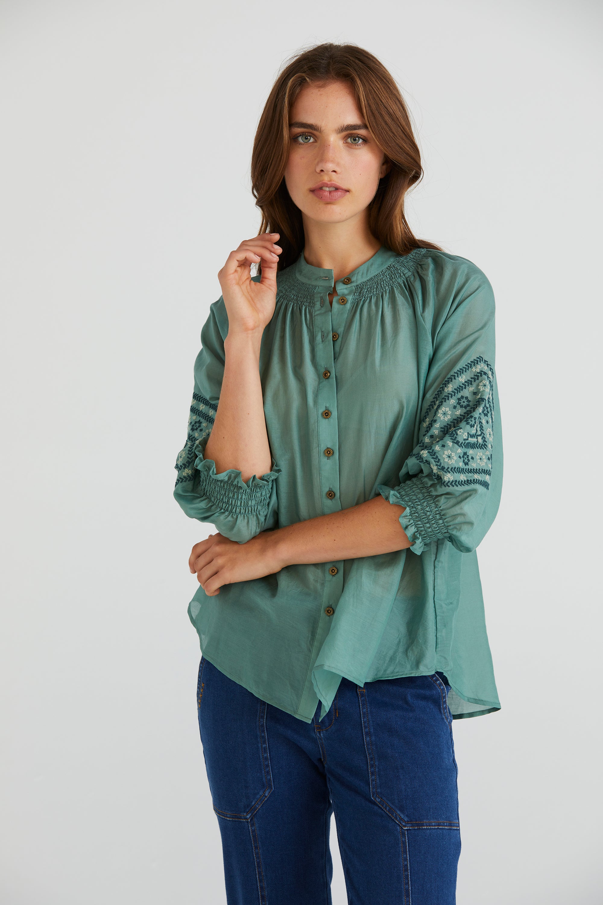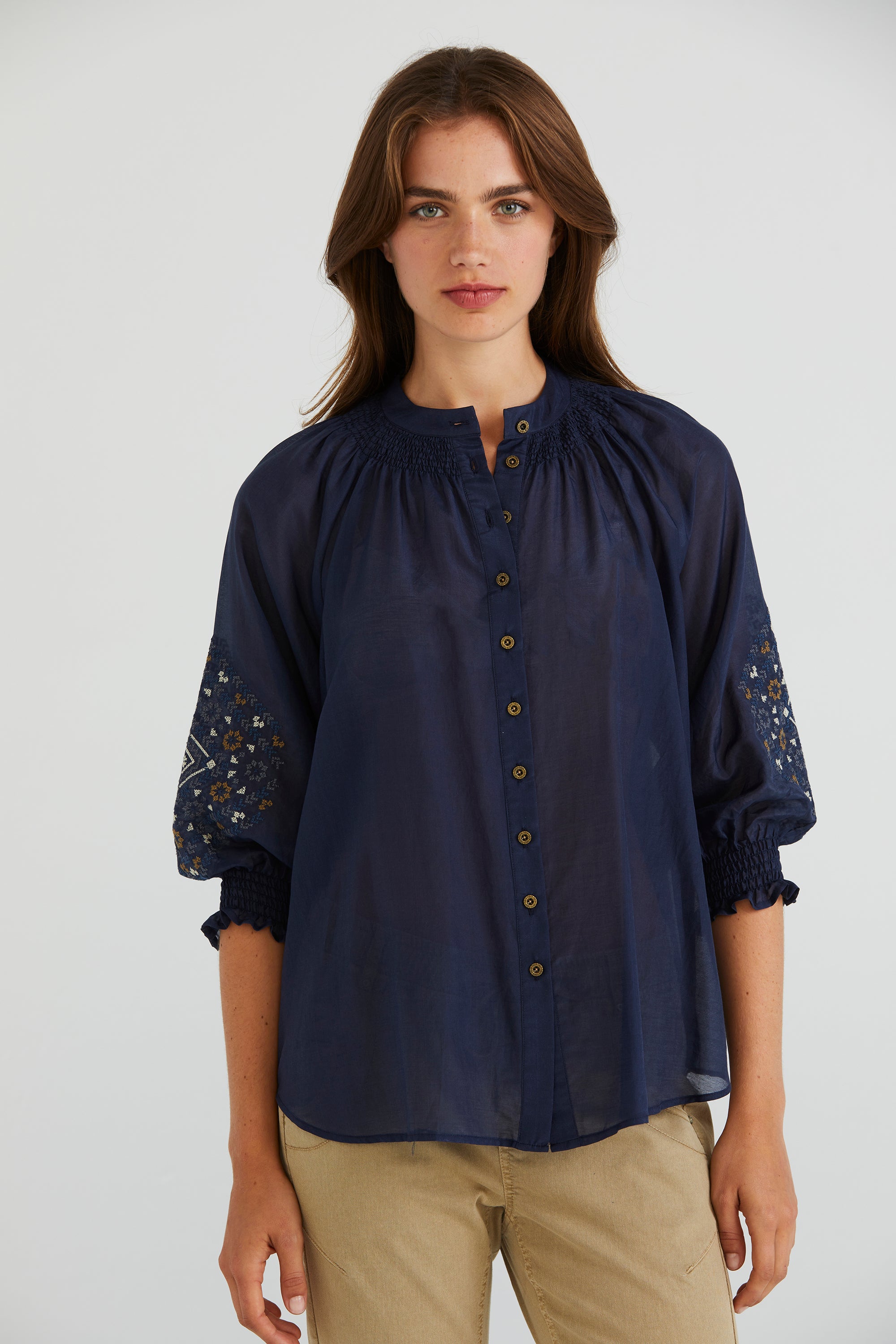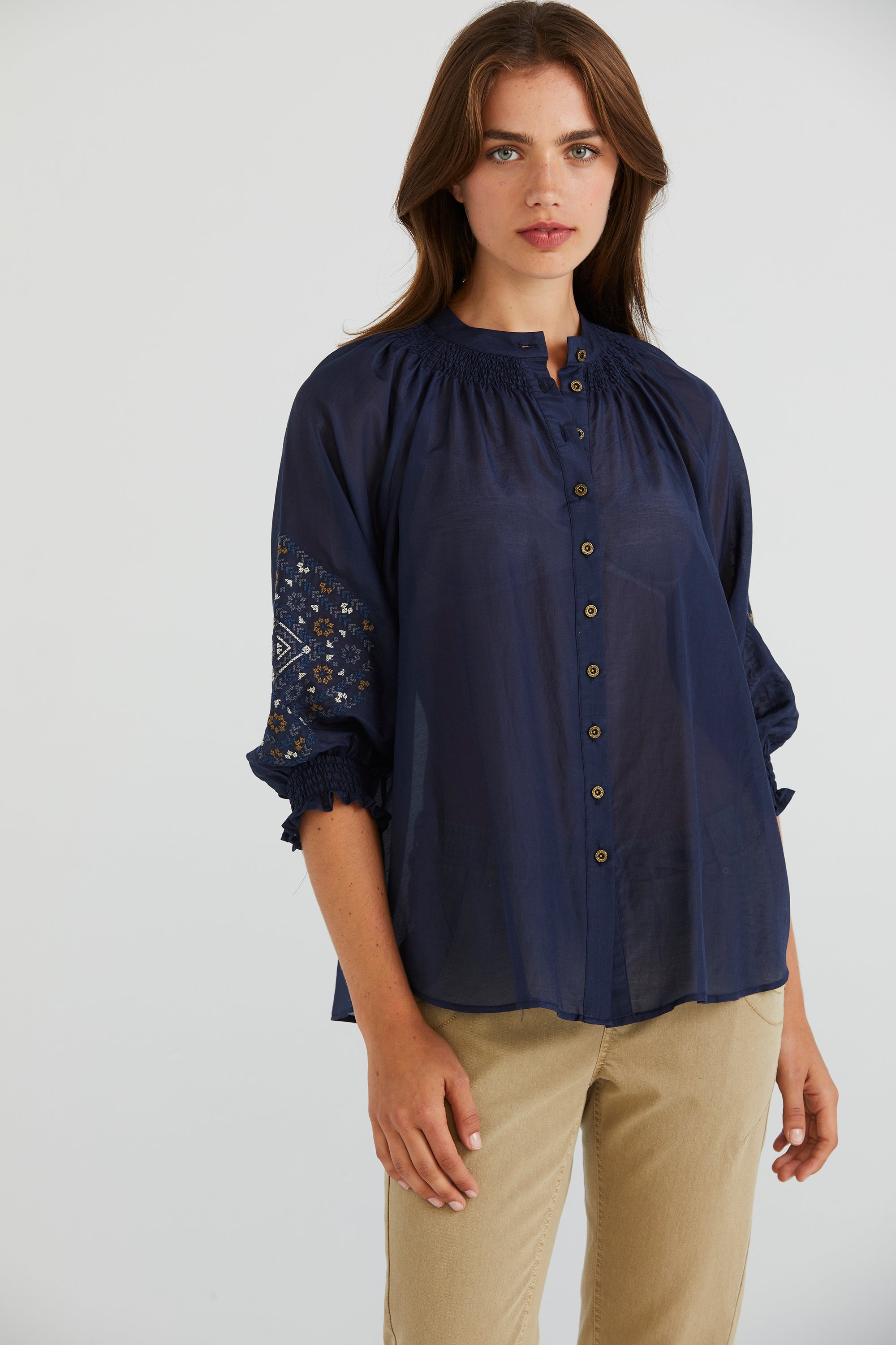 Elevate your wardrobe with the Grace Shirt, distinguished by its captivating cross-stitched sleeve embroidery. The floaty silk cotton fabric and shirred neckline add feminine allure. Enhanced with engraved metal buttons, it's a testament to refined elegance and attention to detail.