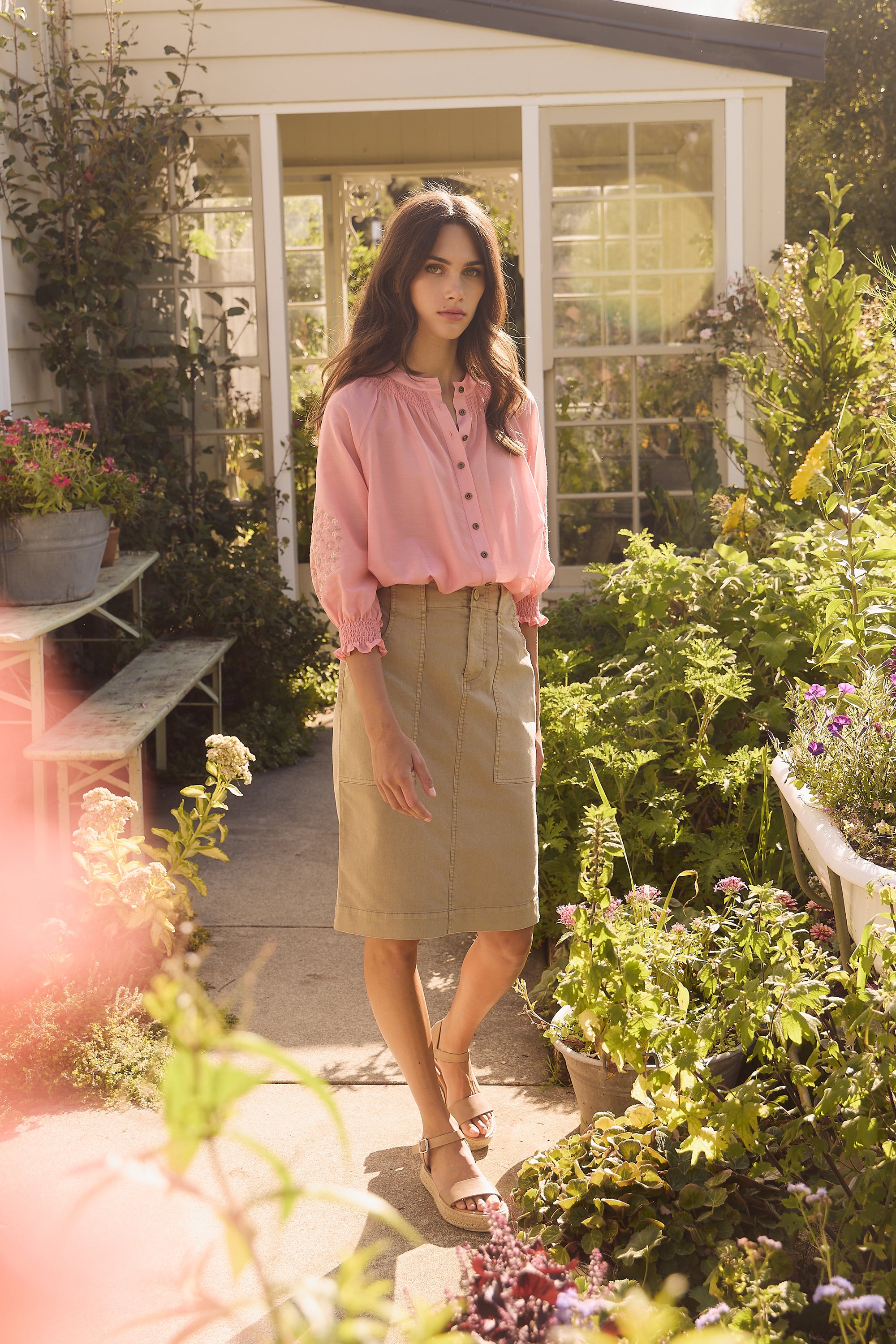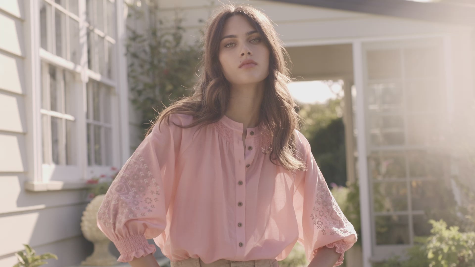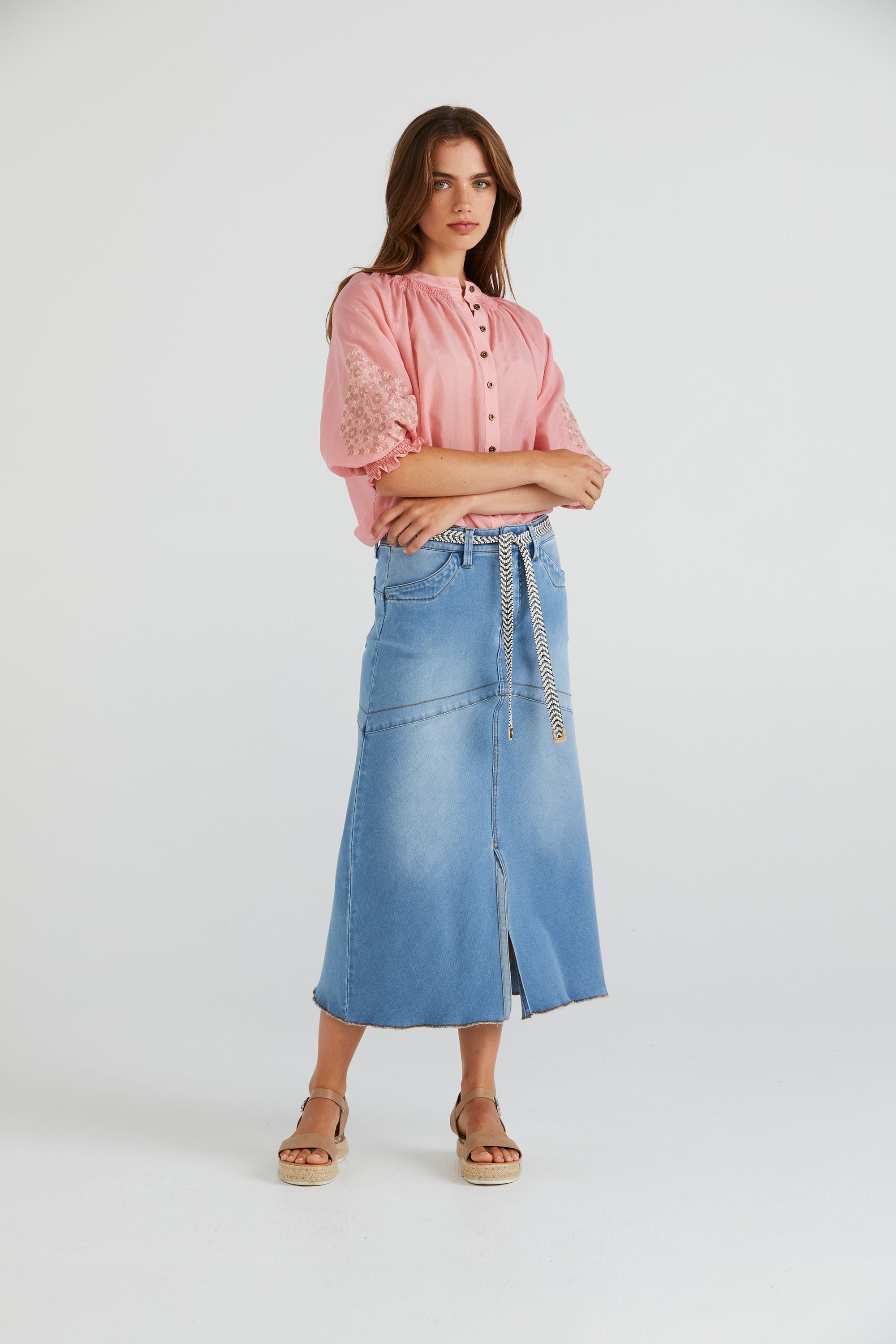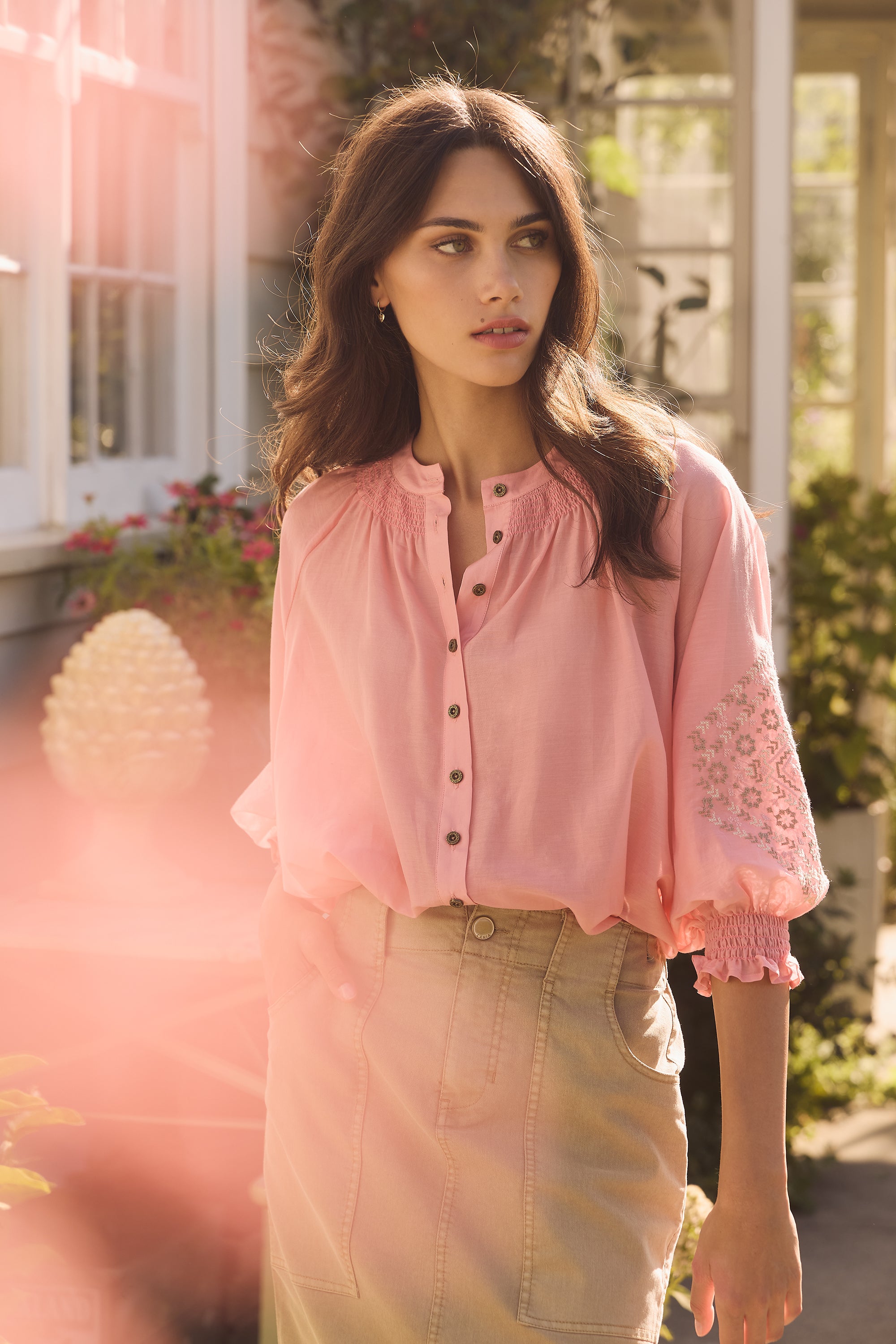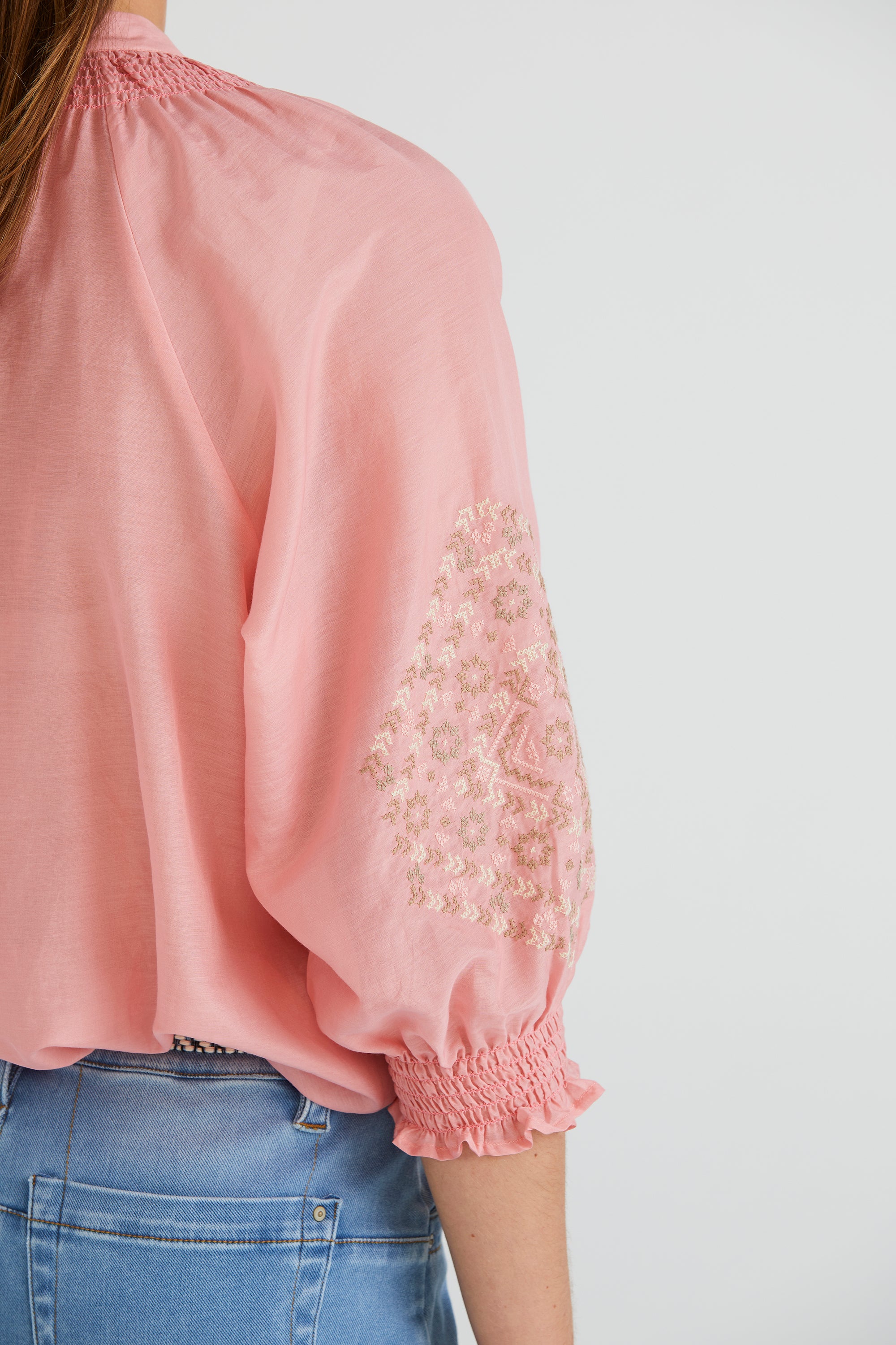 Elevate your wardrobe with the Grace Shirt, distinguished by its captivating cross-stitched sleeve embroidery. The floaty silk cotton fabric and shirred neckline add feminine allure. Enhanced with engraved metal buttons, it's a testament to refined elegance and attention to detail.