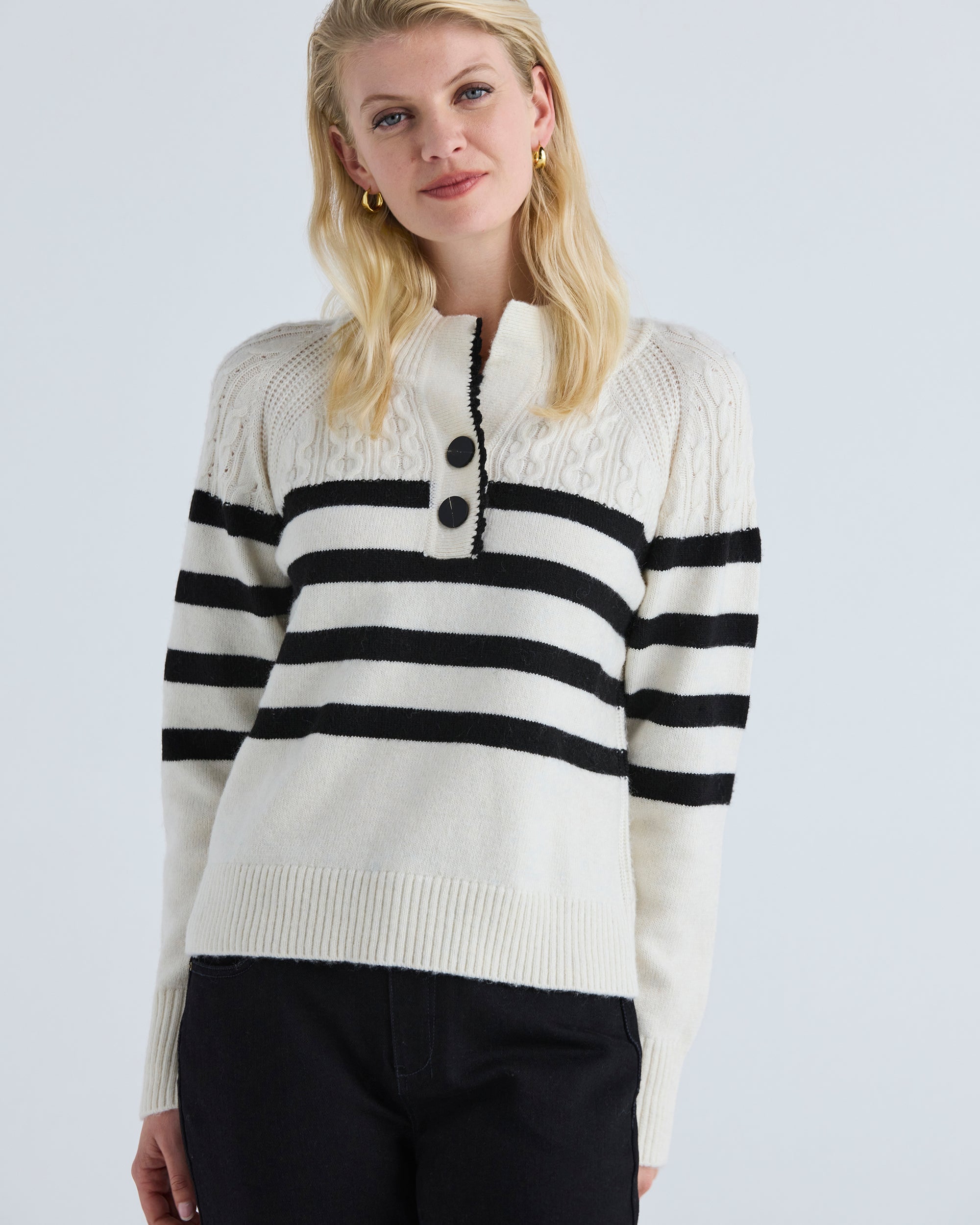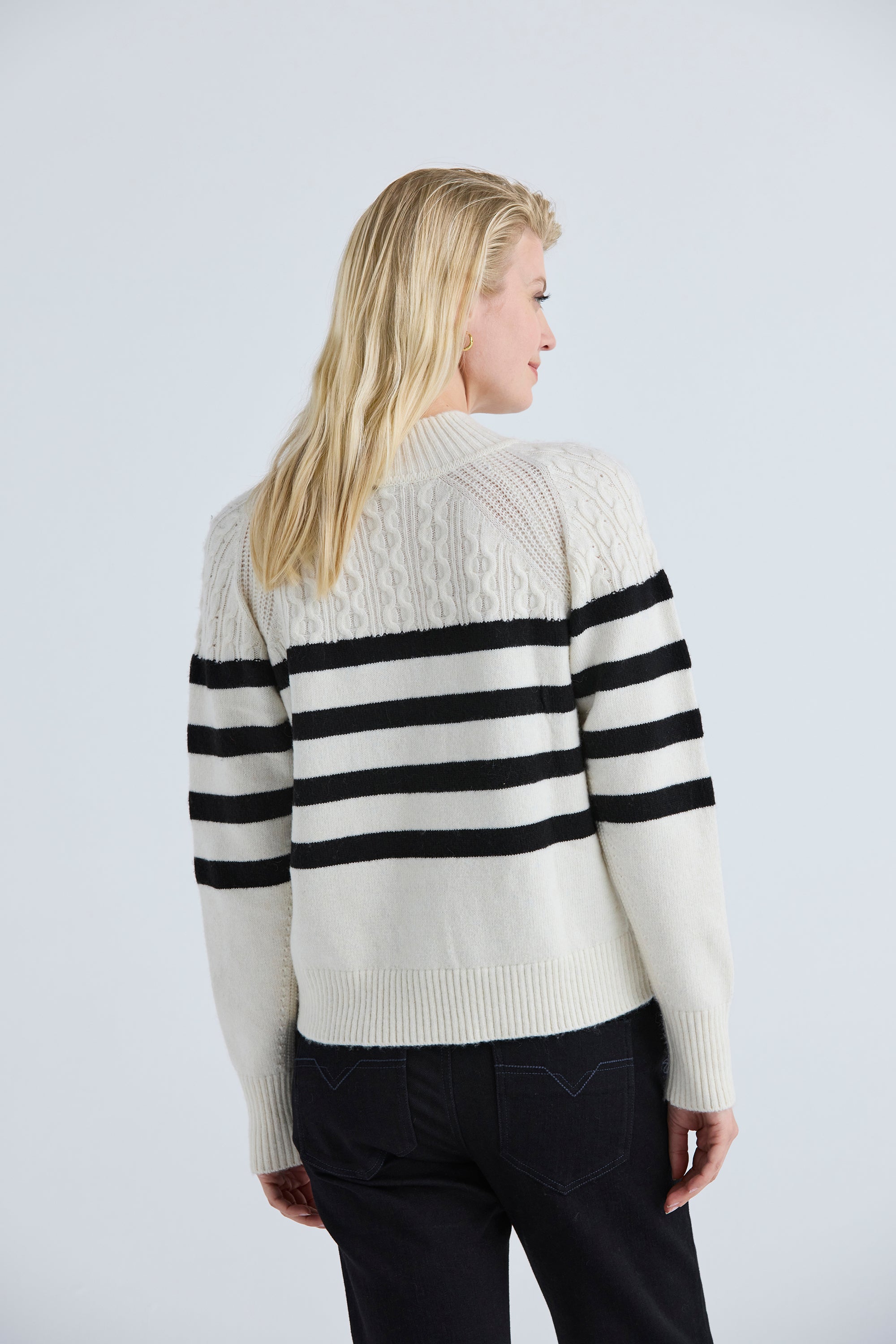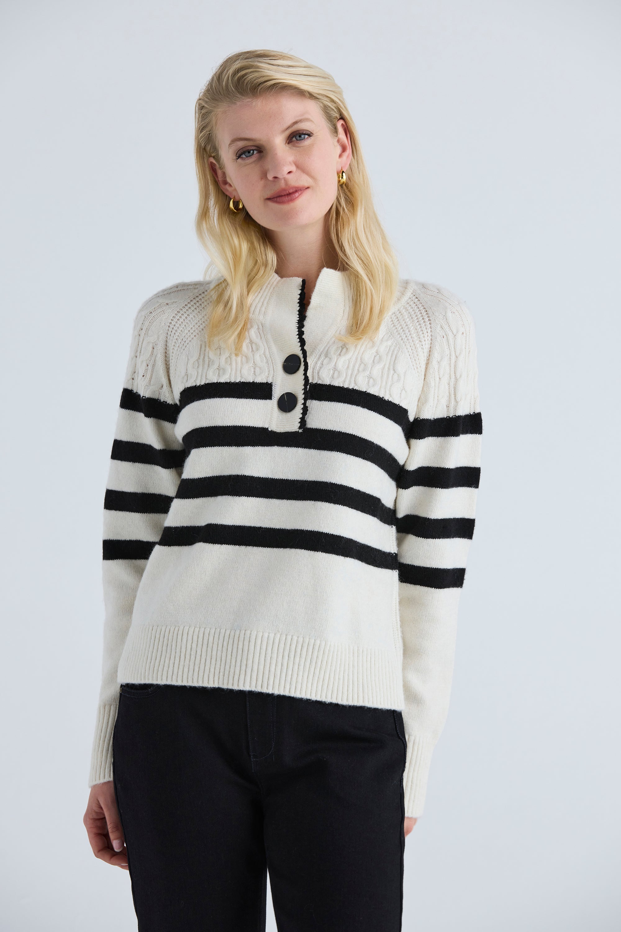 The Hawke Sweater features a wool blend knit in ivory, showcasing a striking black placement stripe design. Key details include a front placket neckline with black crochet embroidery, horn-imitation buttons, and ribbed cuffs and hem, complemented by a cable and picot knit design on the upper body.