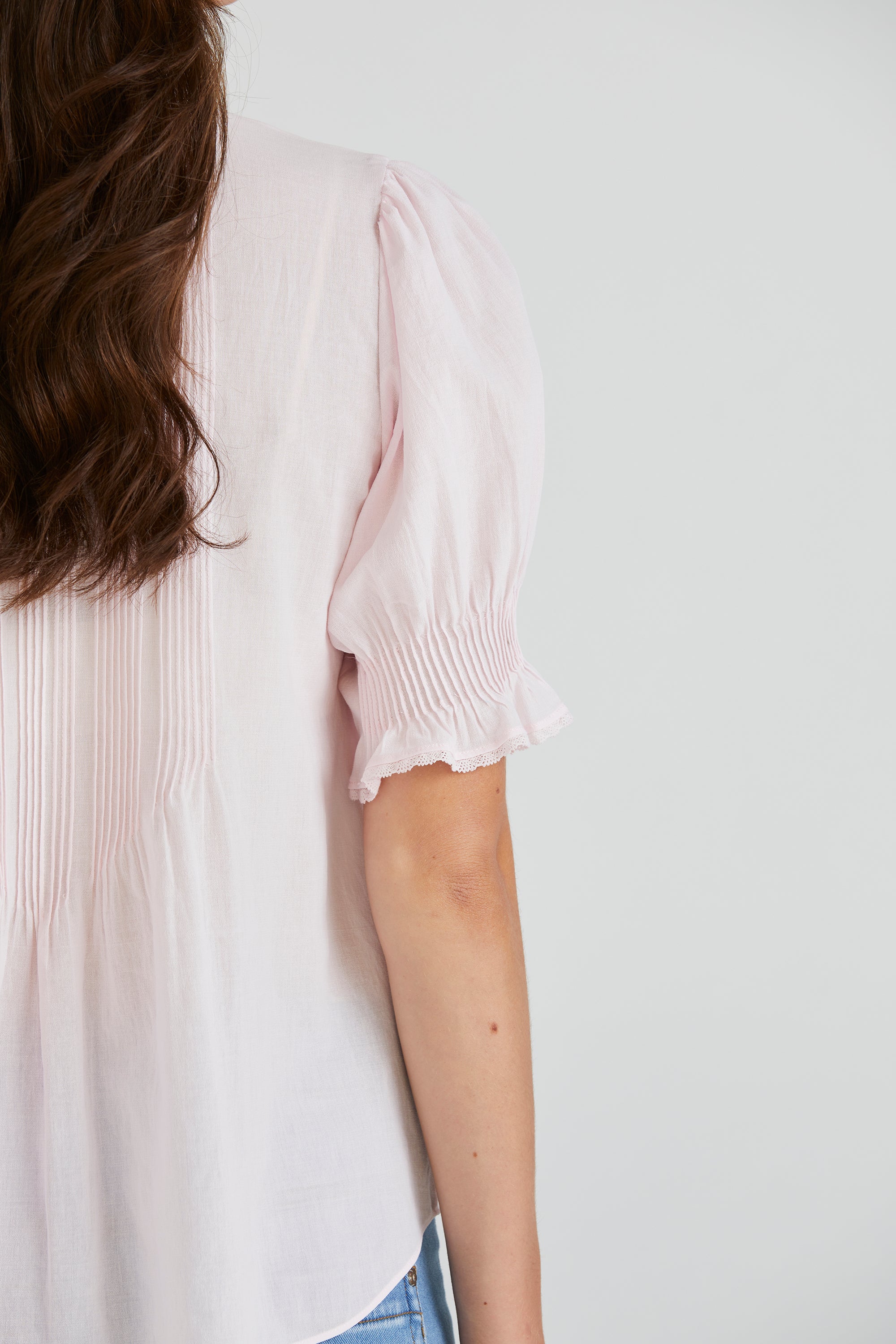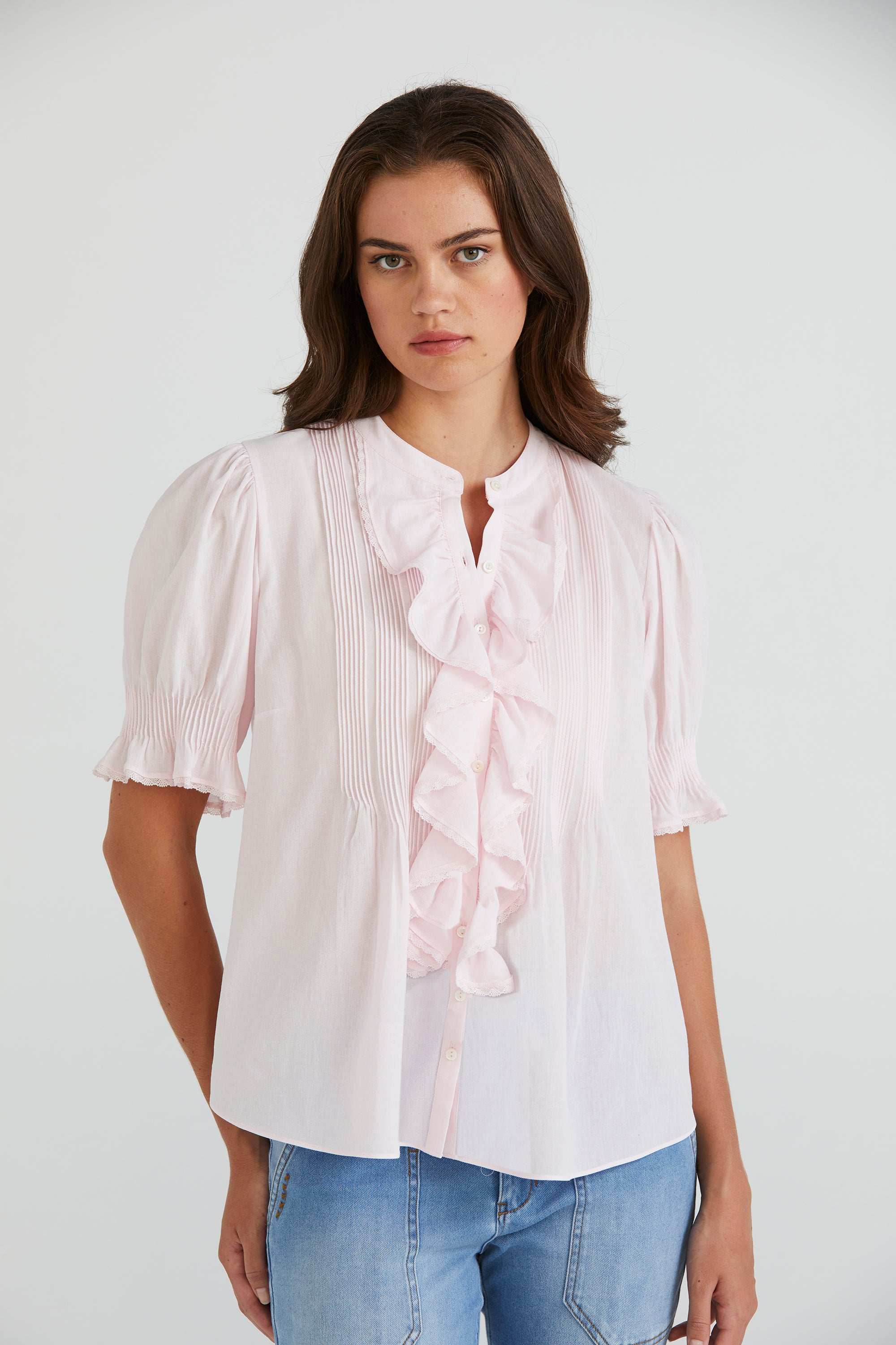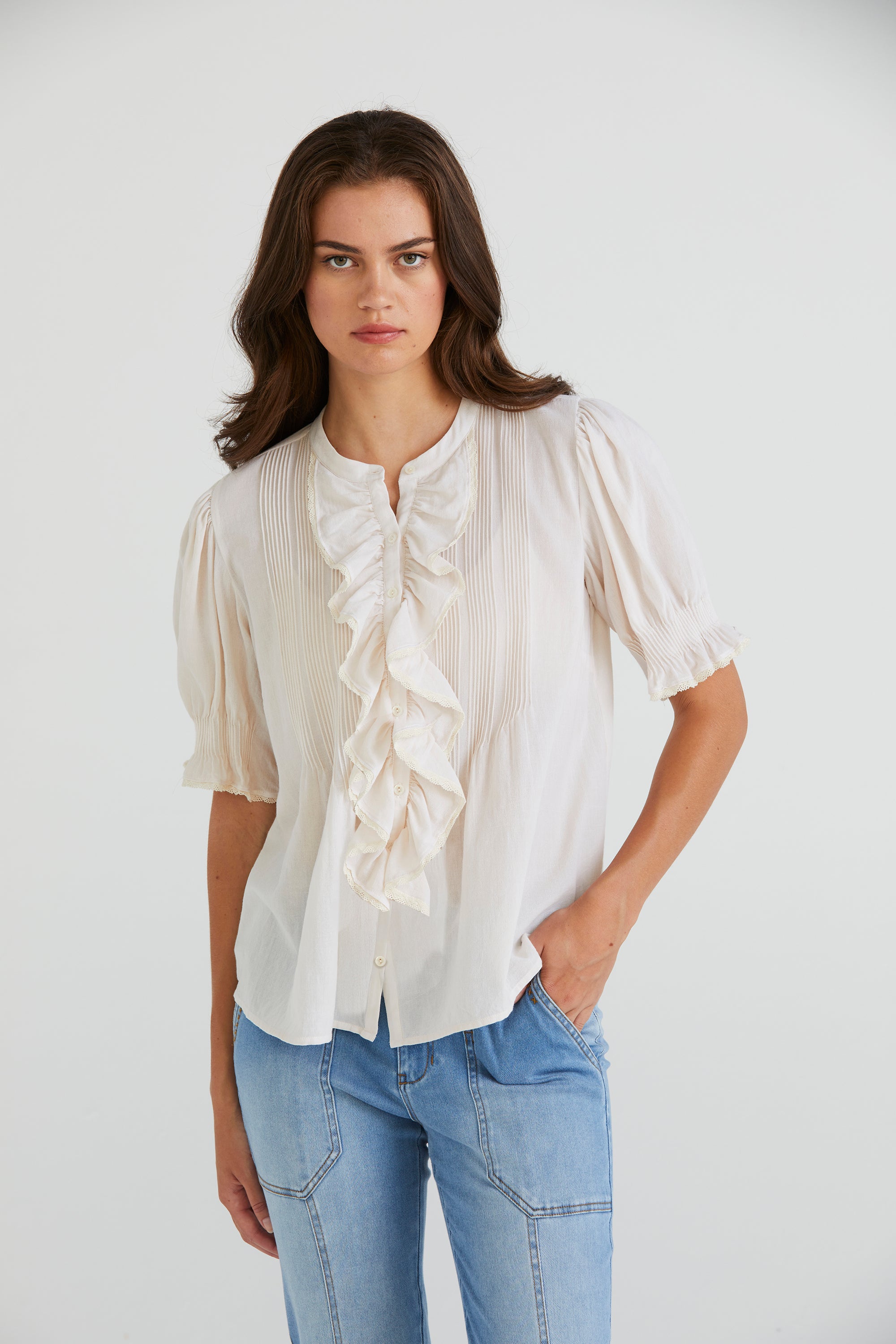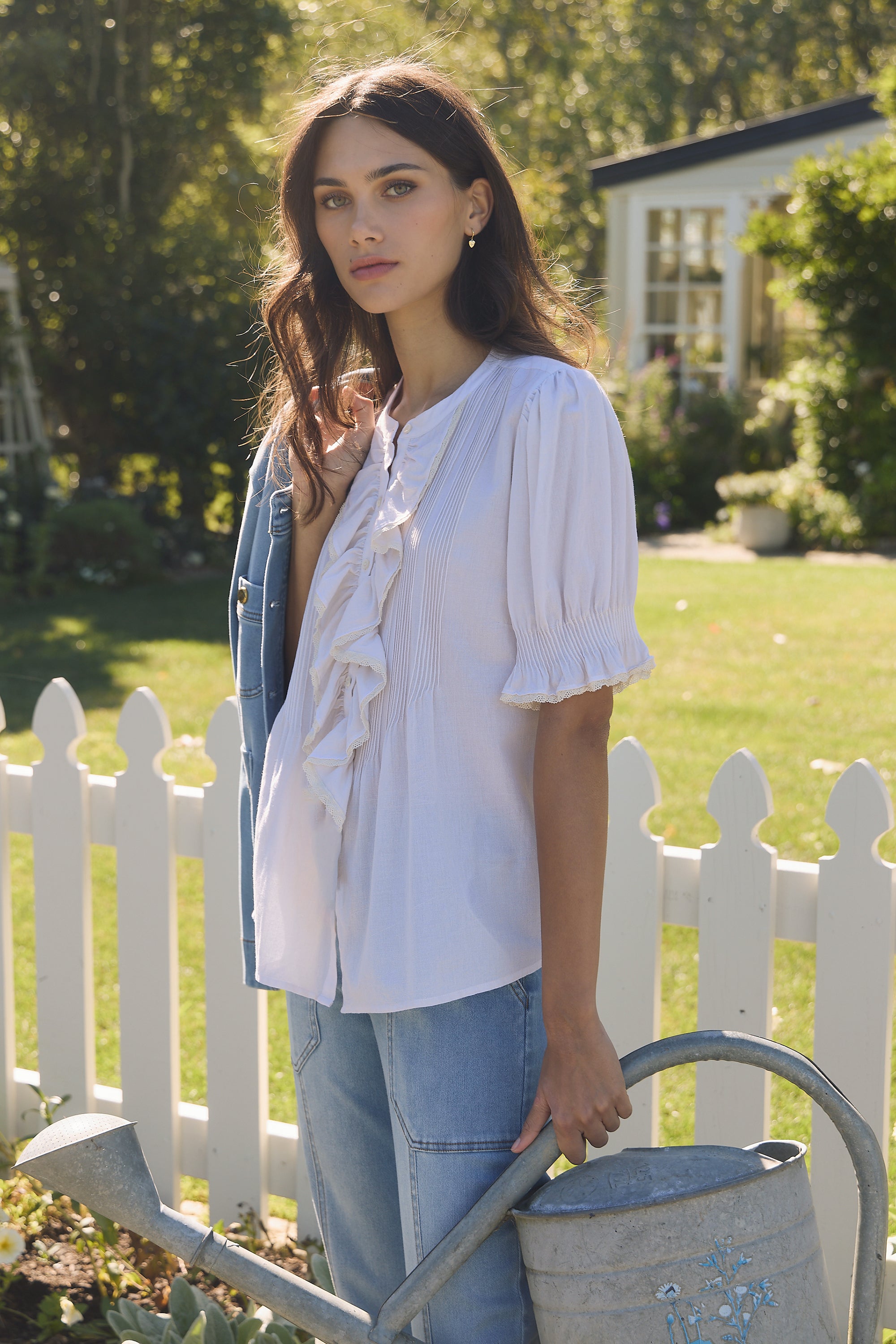 Embrace elegance with the Heather Shirt, crafted from light cotton with a button-through design. Its ruffle neckline detail and dyed-to-match cotton lace trim exude femininity. Enhanced with delicate pin-tuck detailing on the front, back, and sleeve cuffs.