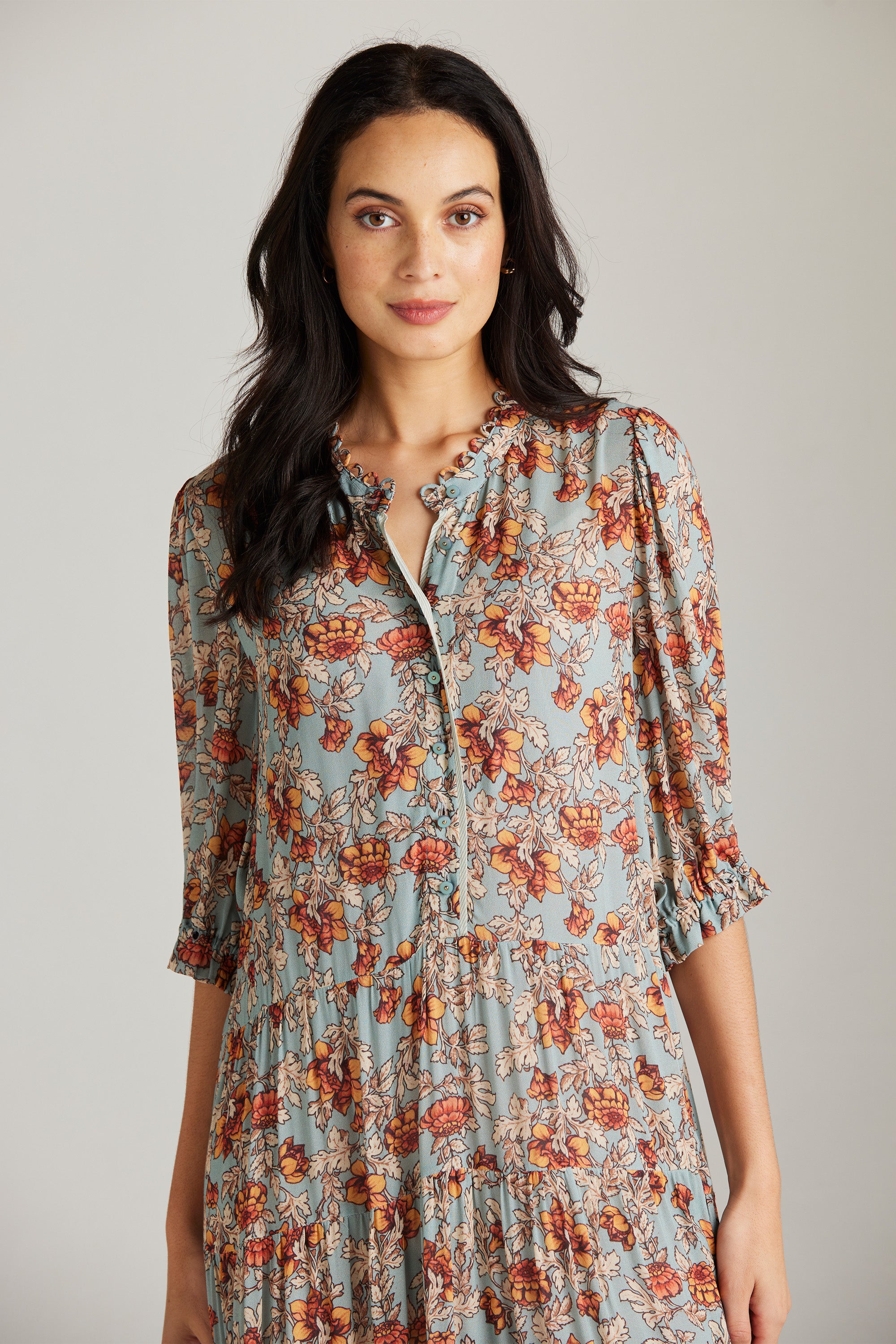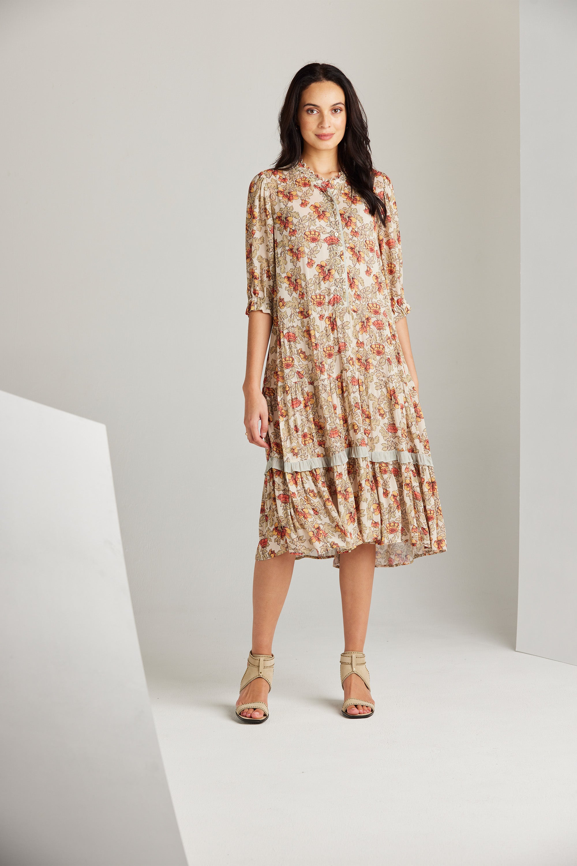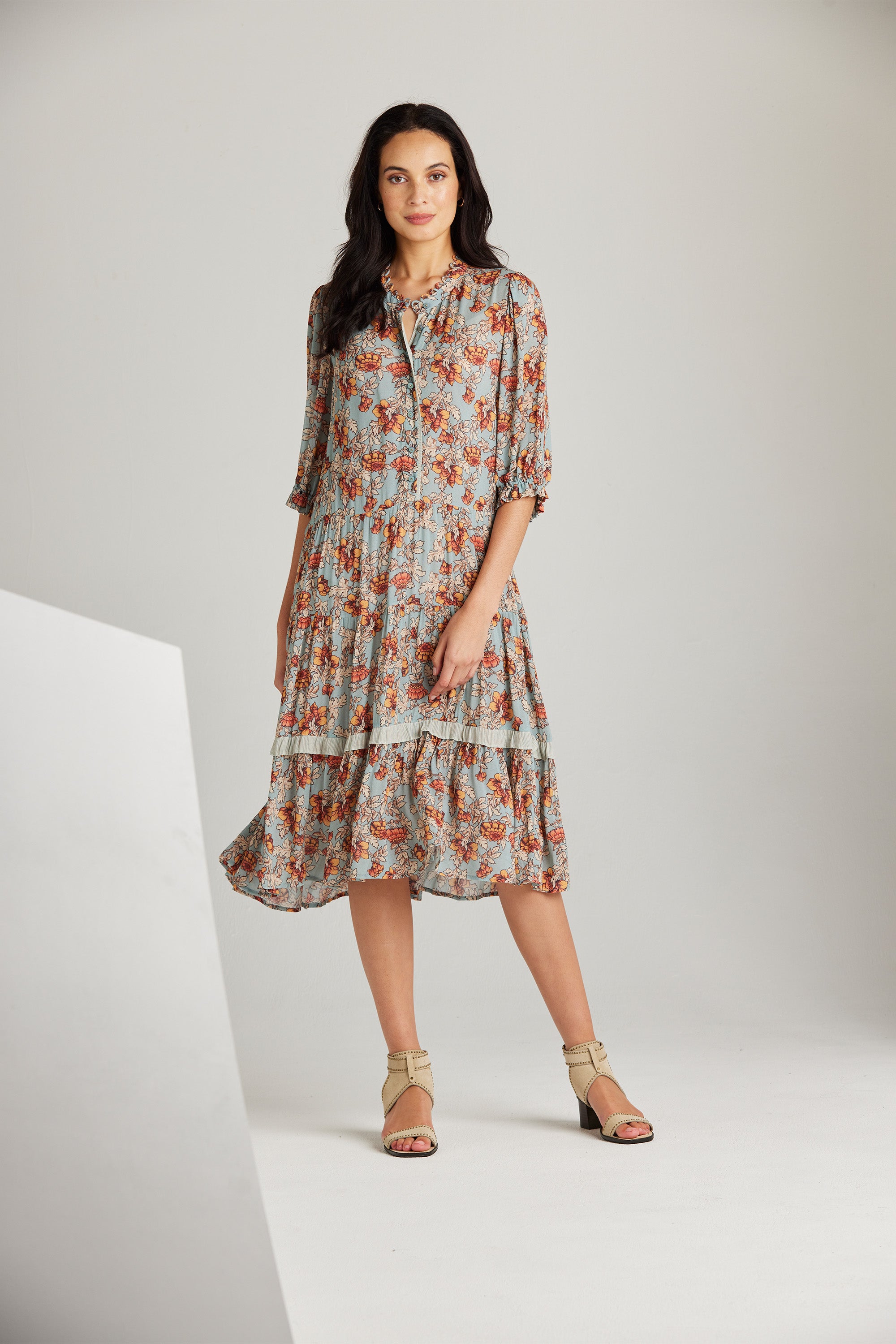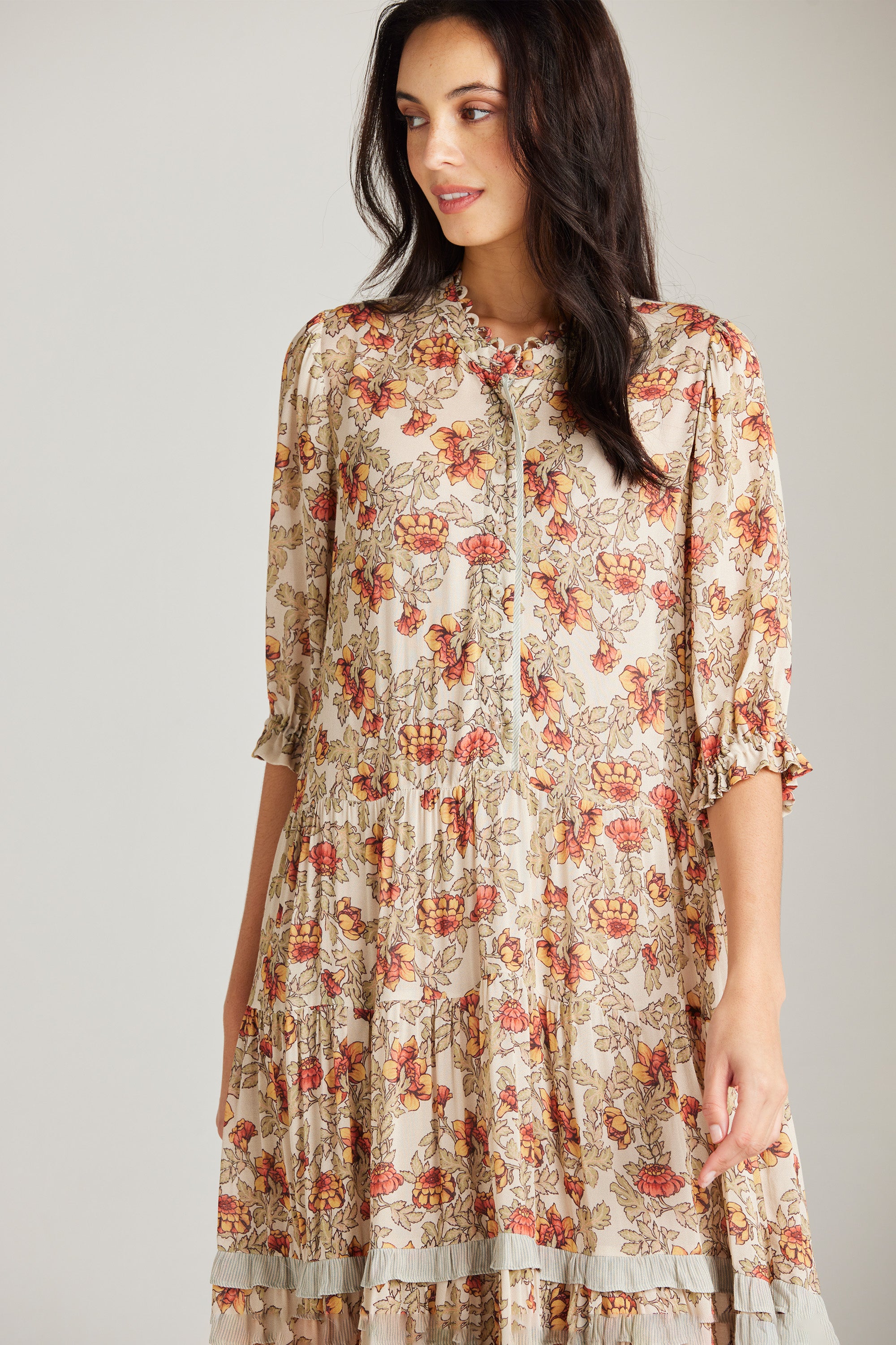 The Holly Dress is an elevated style featuring a delicate and feminine floral print, a front button bodice, and a lightly gathered tiered skirt with contrast print frill detail. The collar stand with delicate rouleau loops is the epitome of classic elegance.