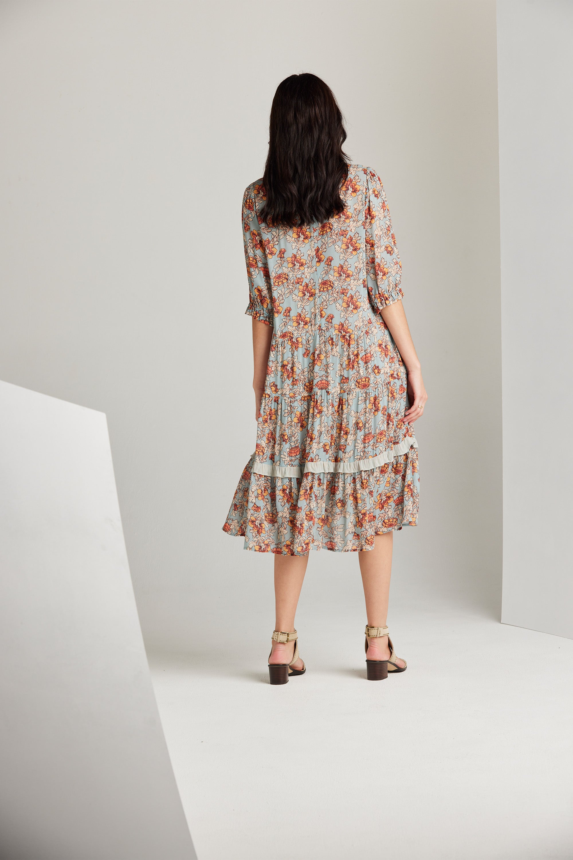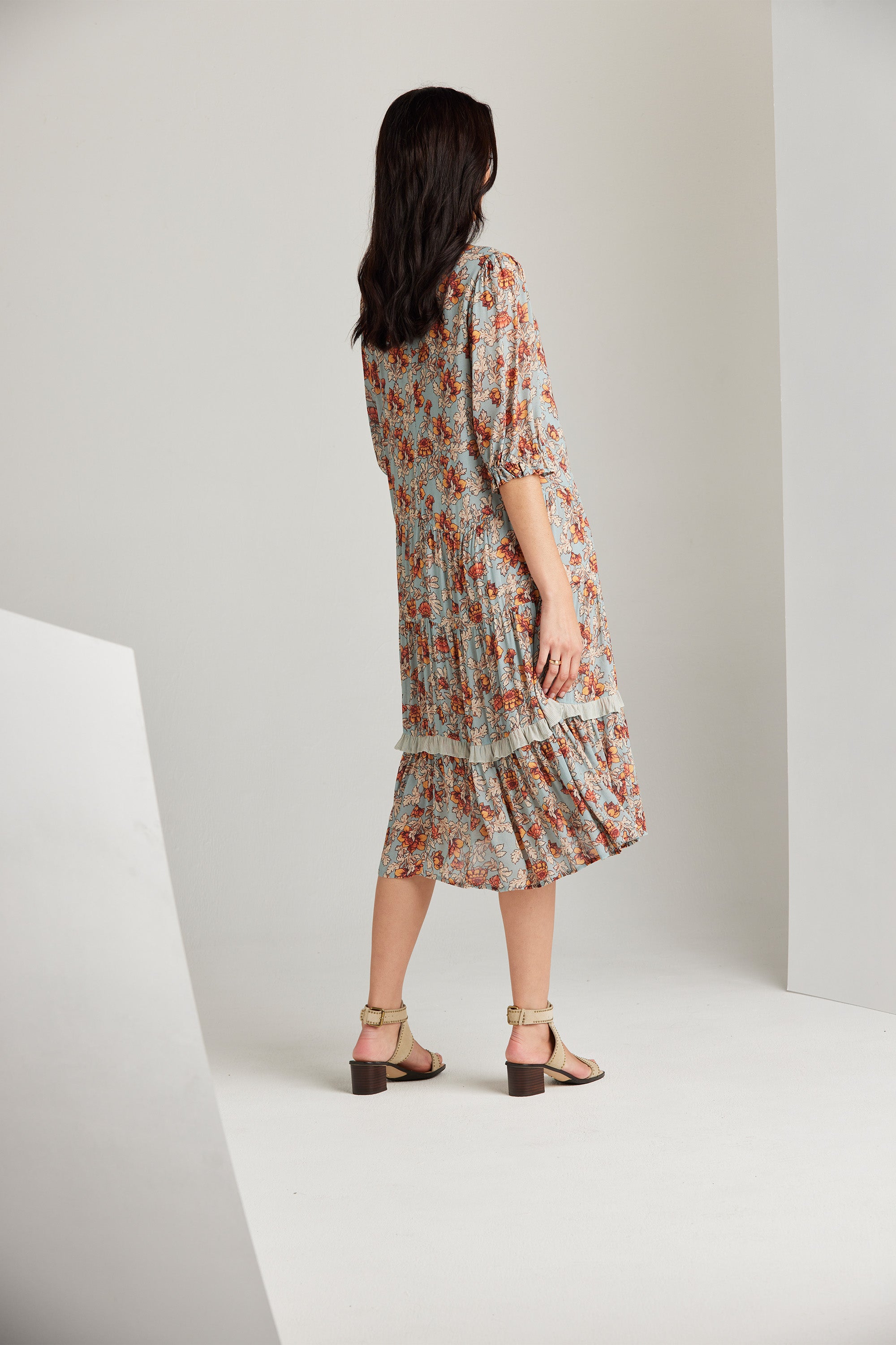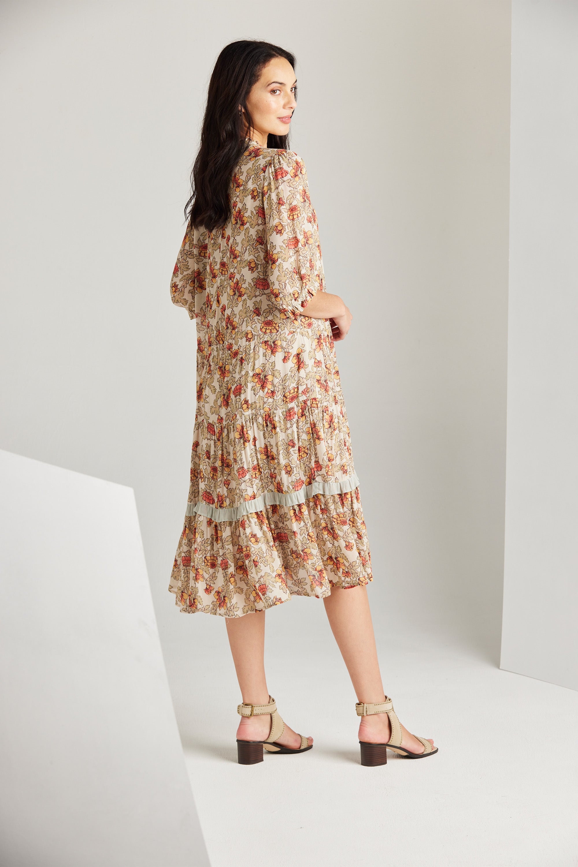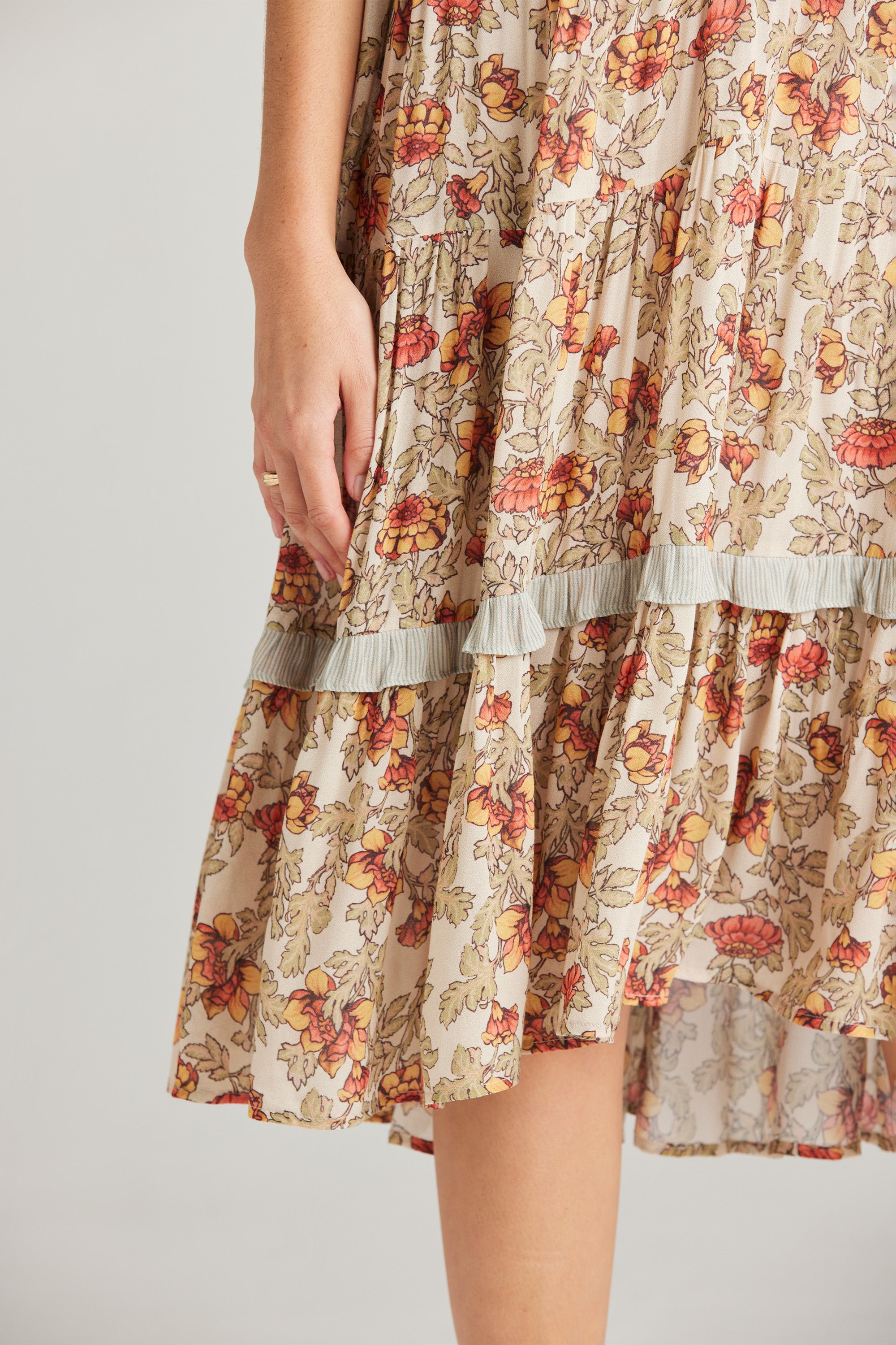 The Holly Dress is an elevated style featuring a delicate and feminine floral print, a front button bodice, and a lightly gathered tiered skirt with contrast print frill detail. The collar stand with delicate rouleau loops is the epitome of classic elegance.