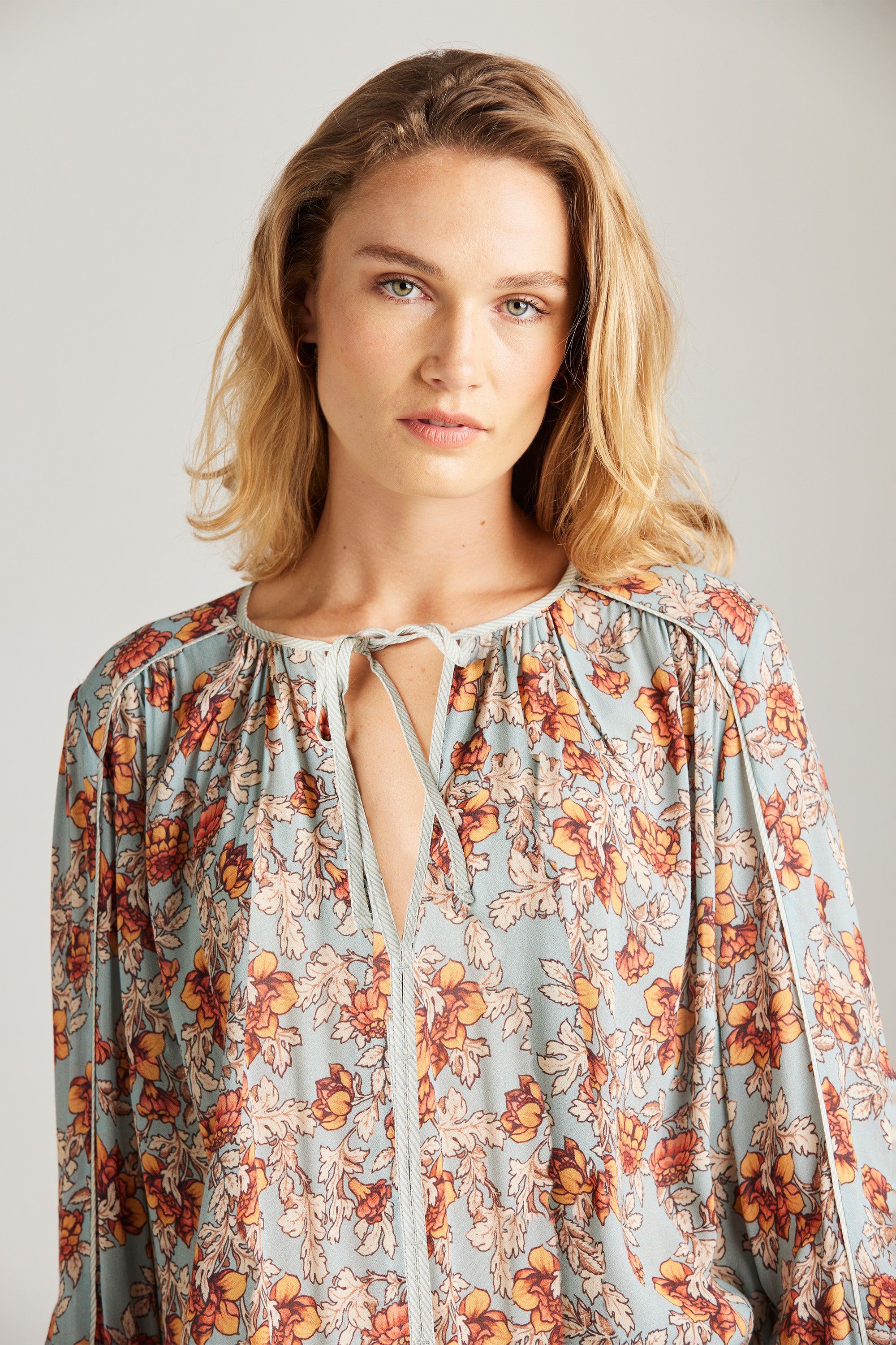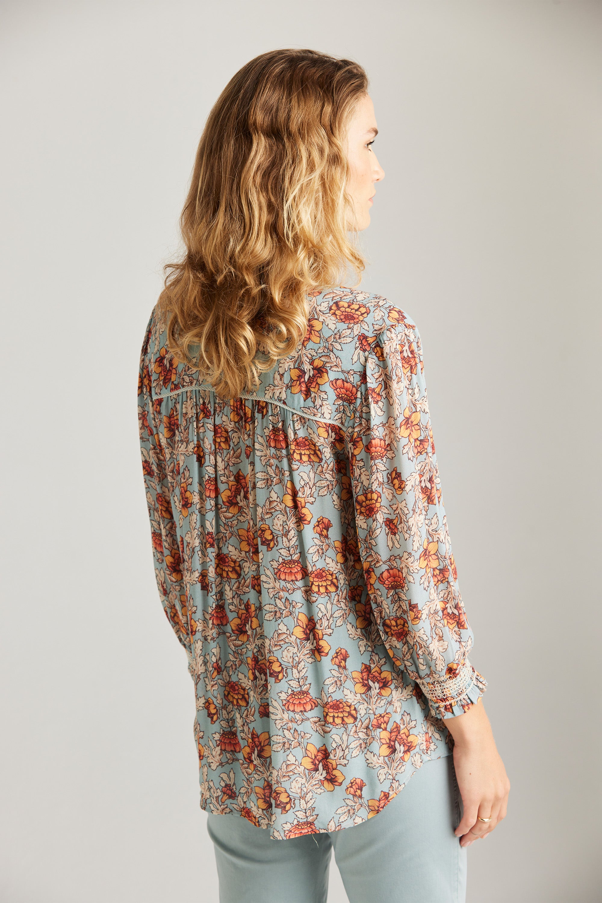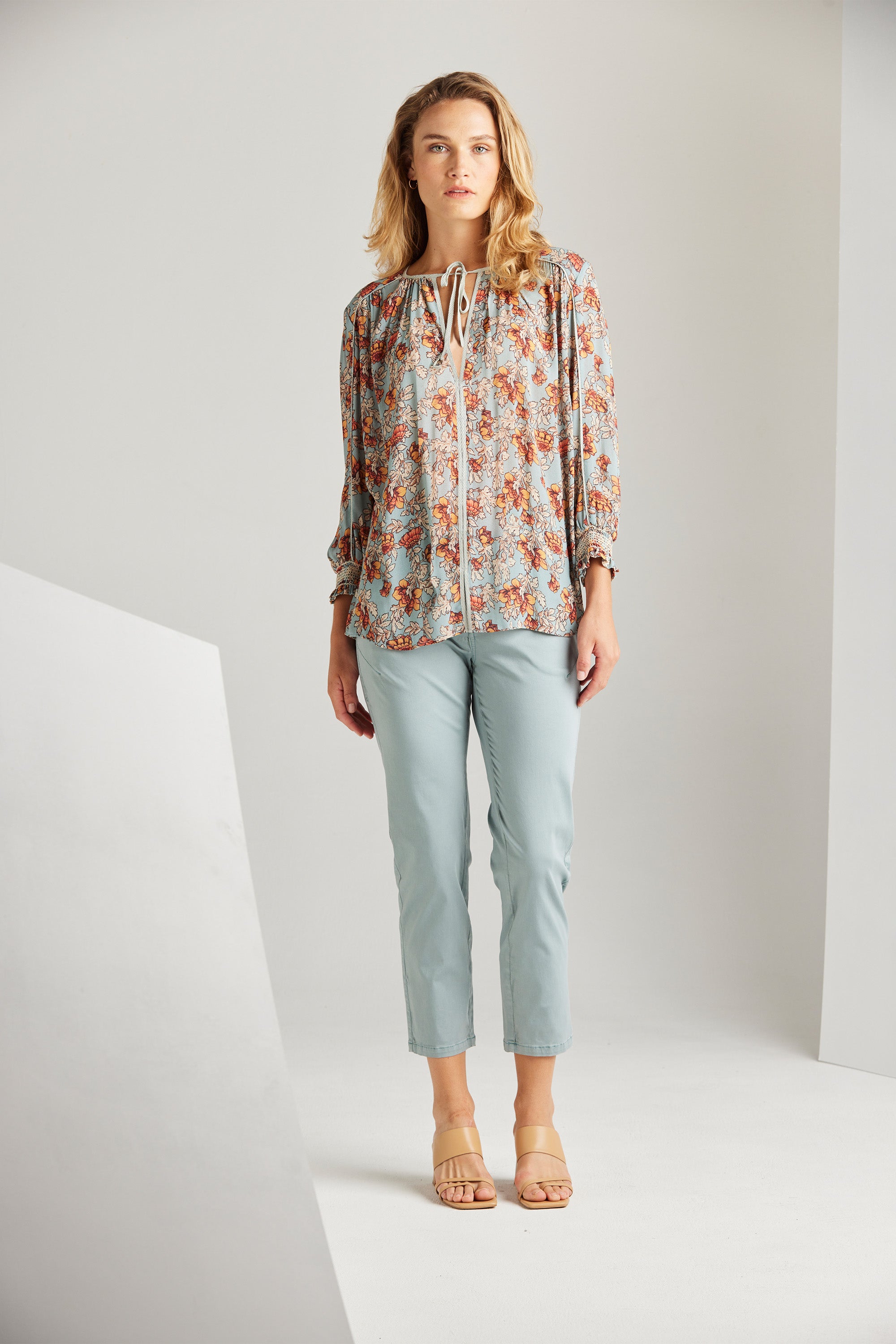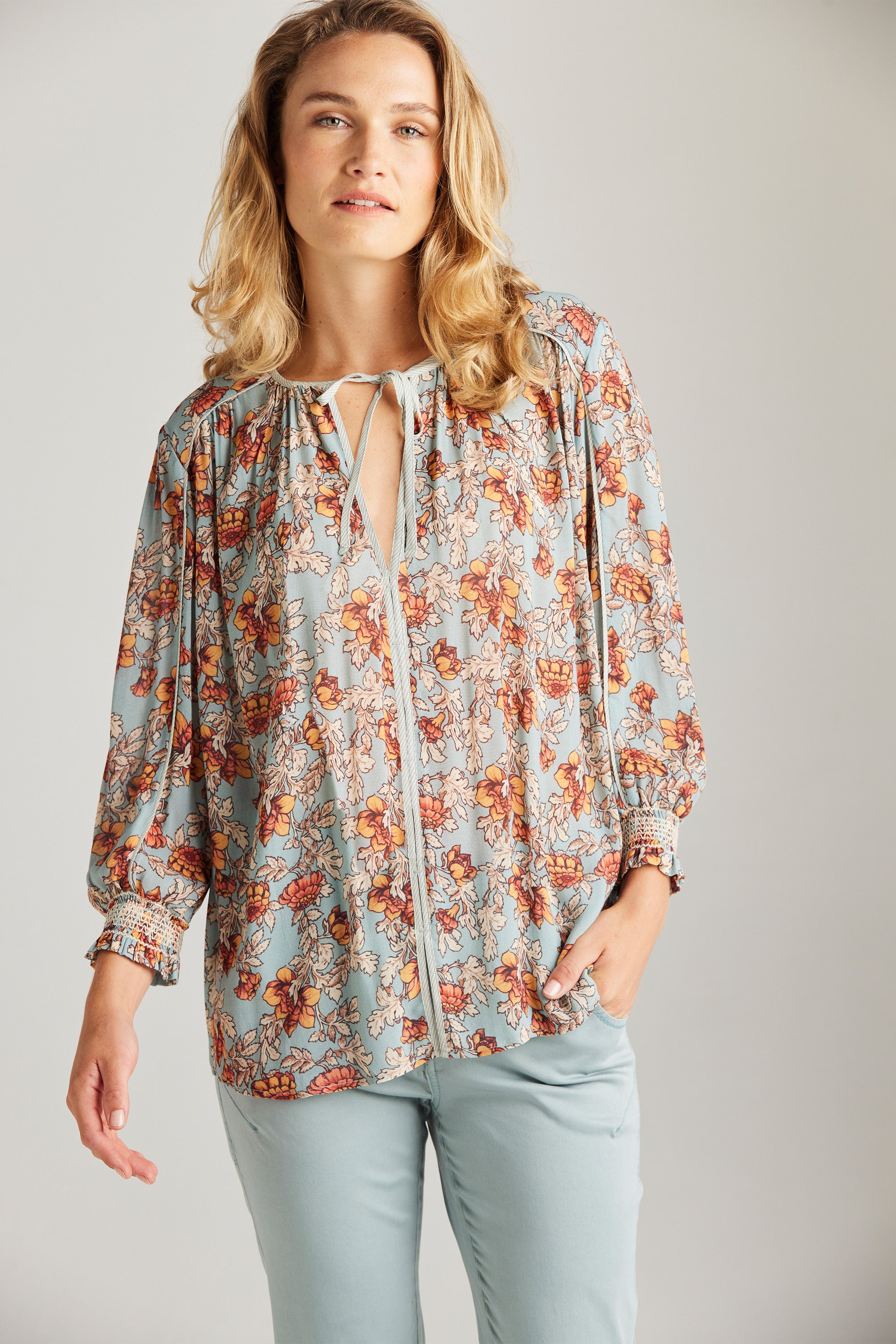 Gathers around the shoulders and sleeves add a soft fluidity to the Holly Top. This elevated style features a delicate and feminine floral print, contrast binding and tie details at the centre front. The shirred cuff with contrast embroidery thread detail adds an elevated element to this statement shirt. This versatile piece can be worn day or night.