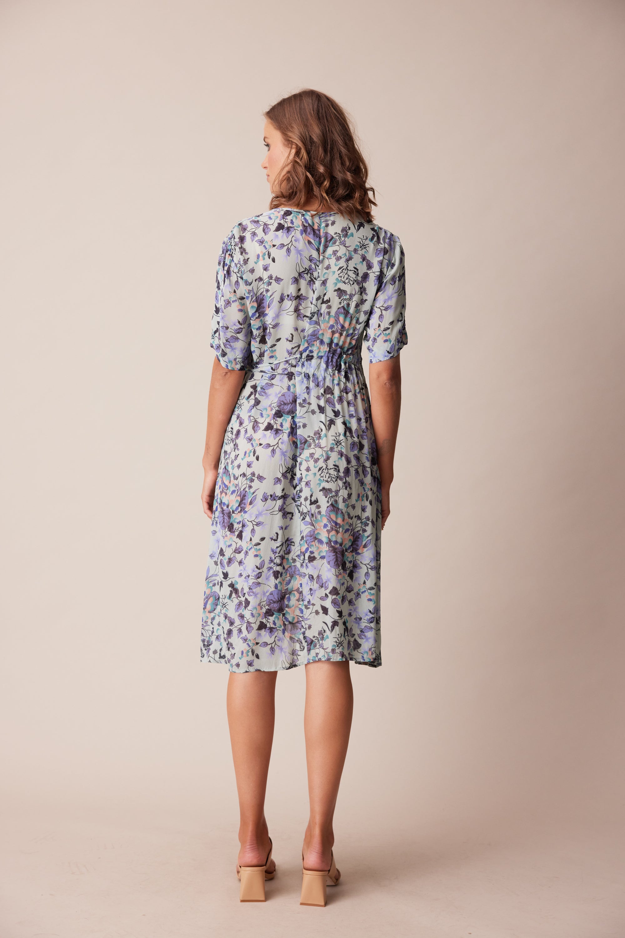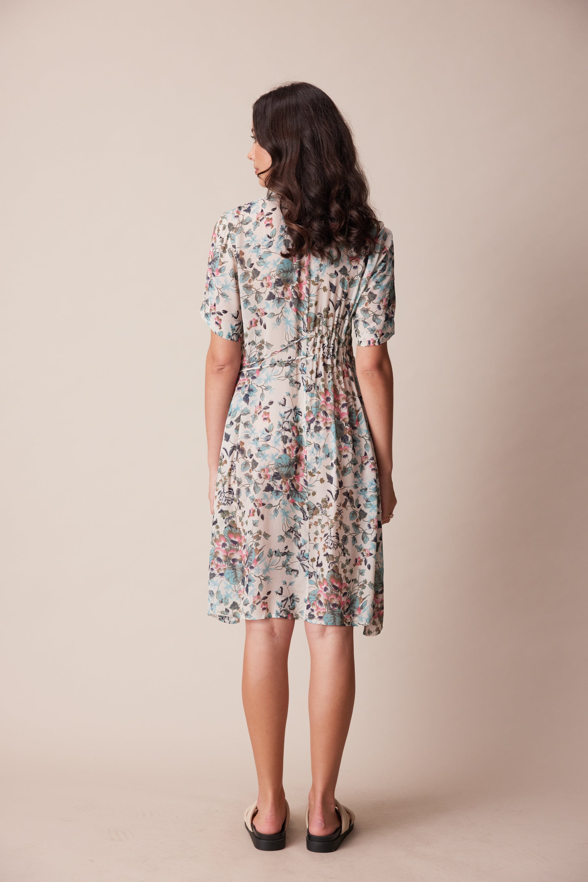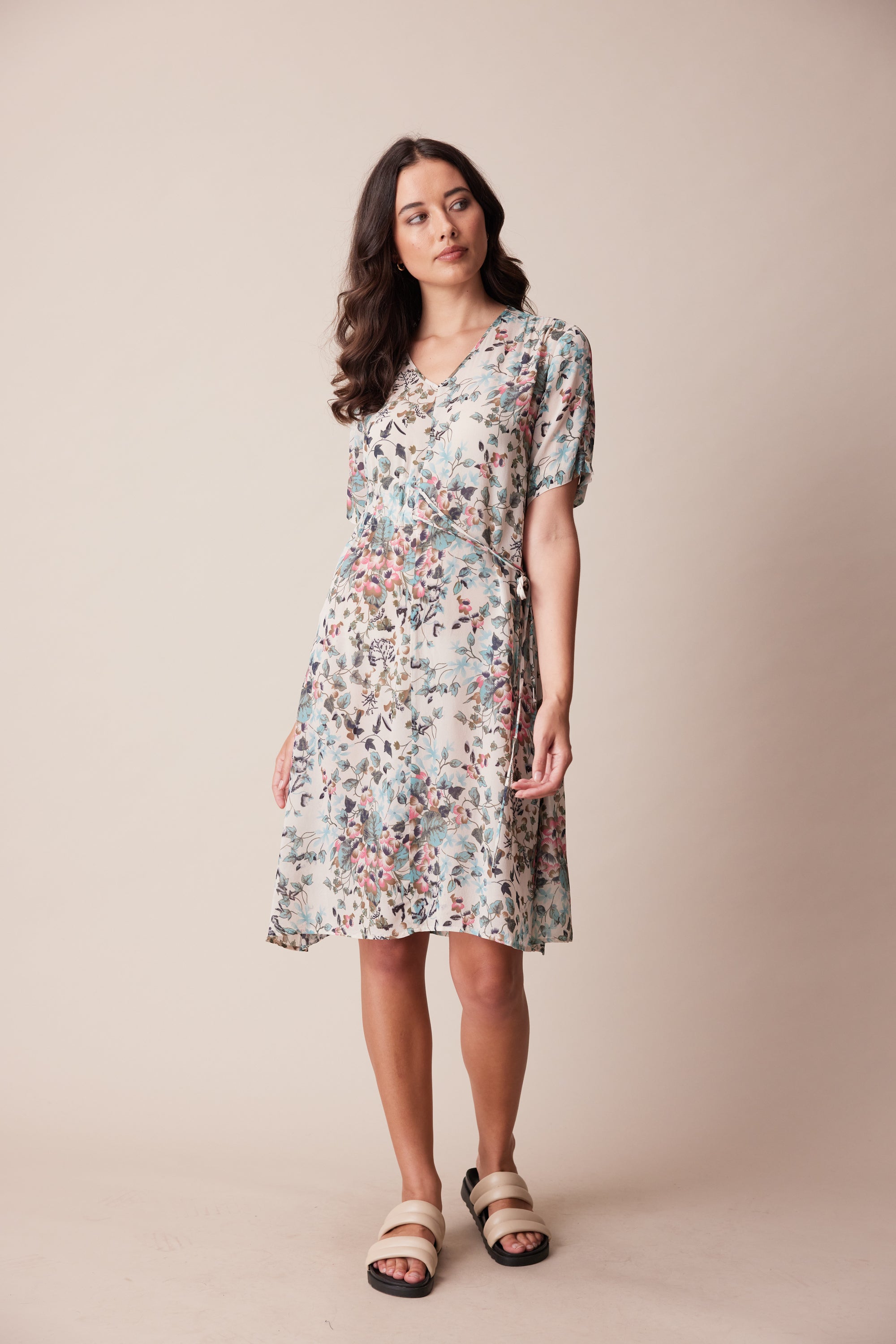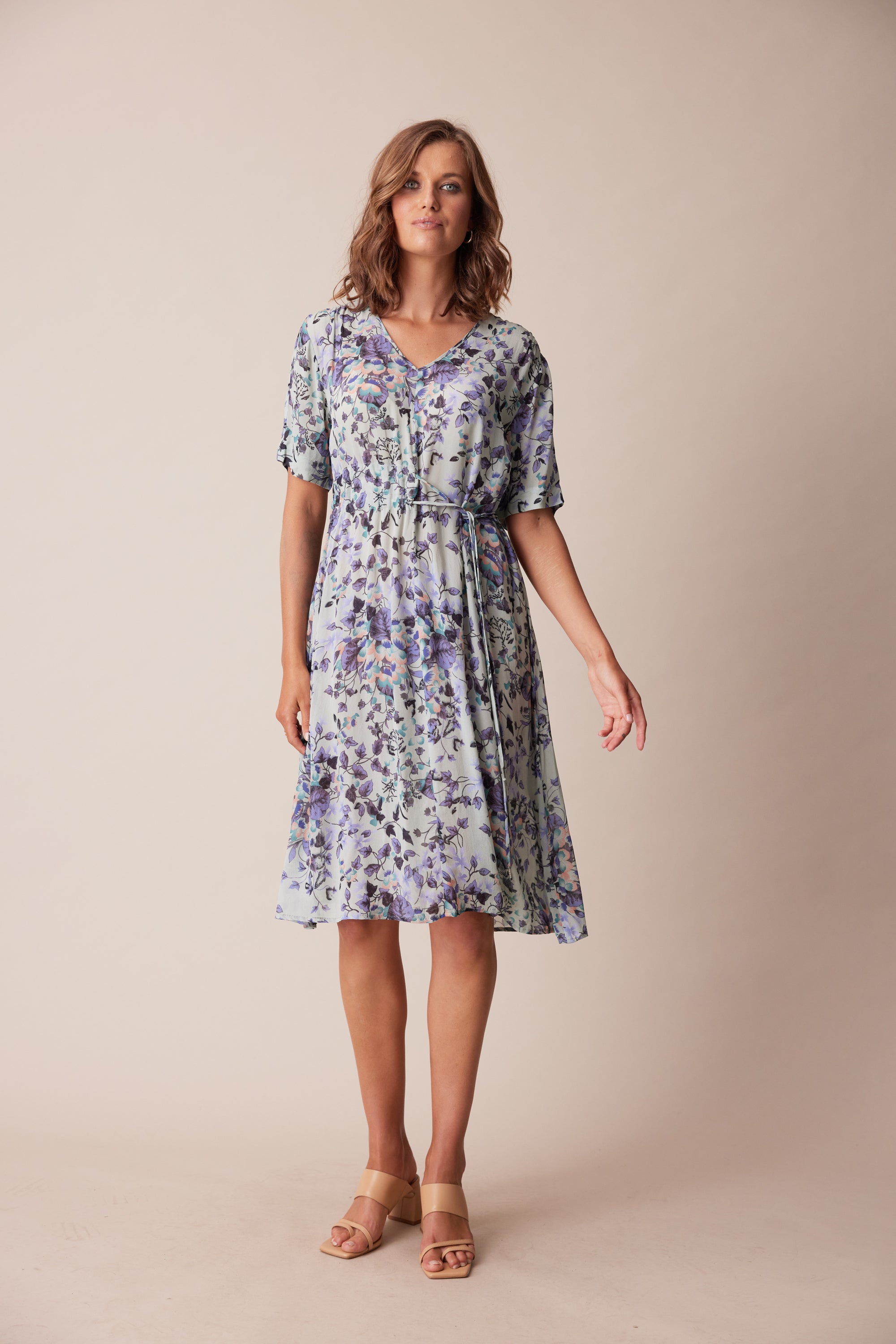 The enchanted Ivy print in lightweight georgette takes form in this modern knee-length silhouette. Double waist ties travel through asymmetric waist channels to create light gathering through the waistline, and can be adjusted as desired. The deep V neckline is finished with a delicate binding. Our LTL Slip (sold separately) is ideal to be worn underneath.