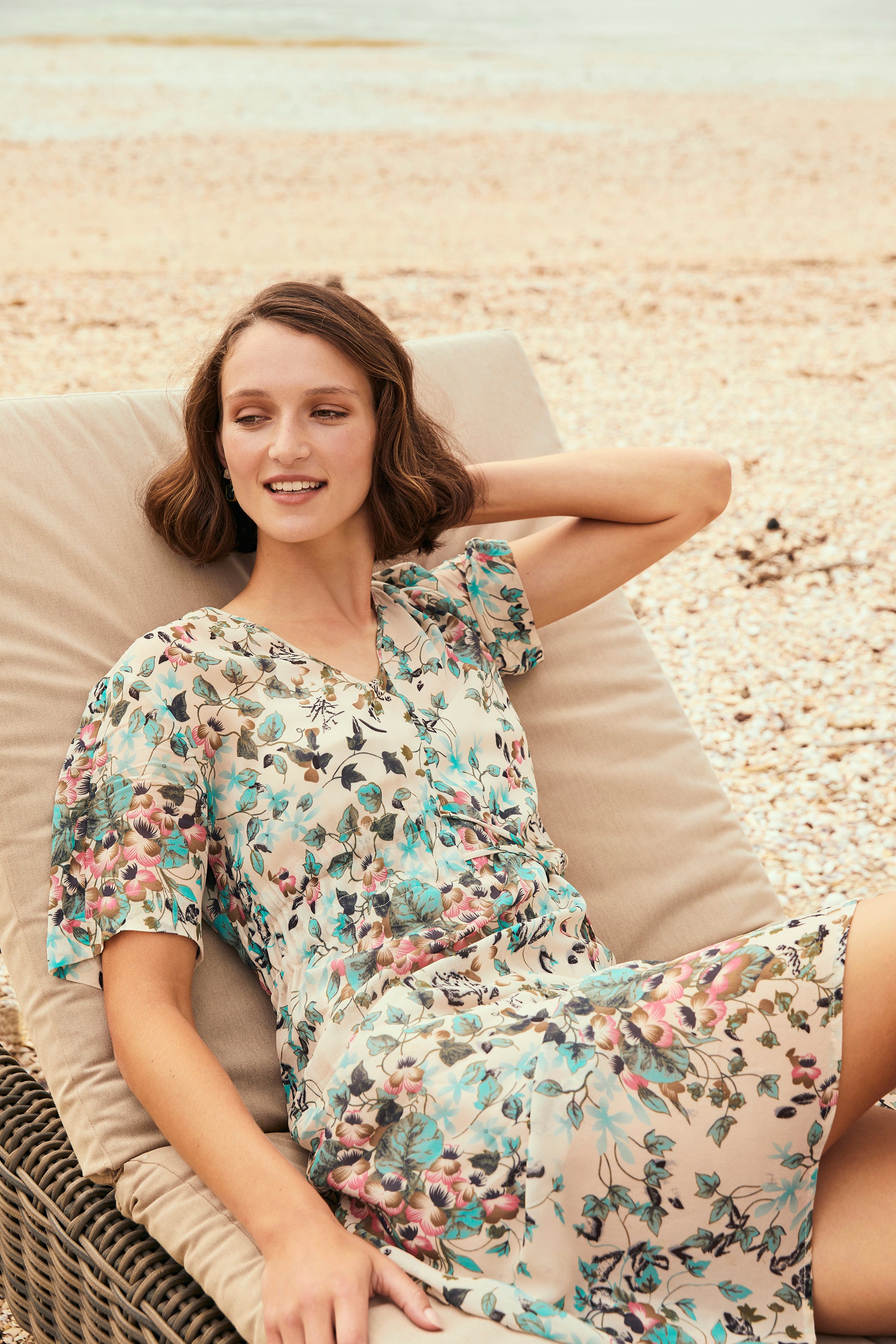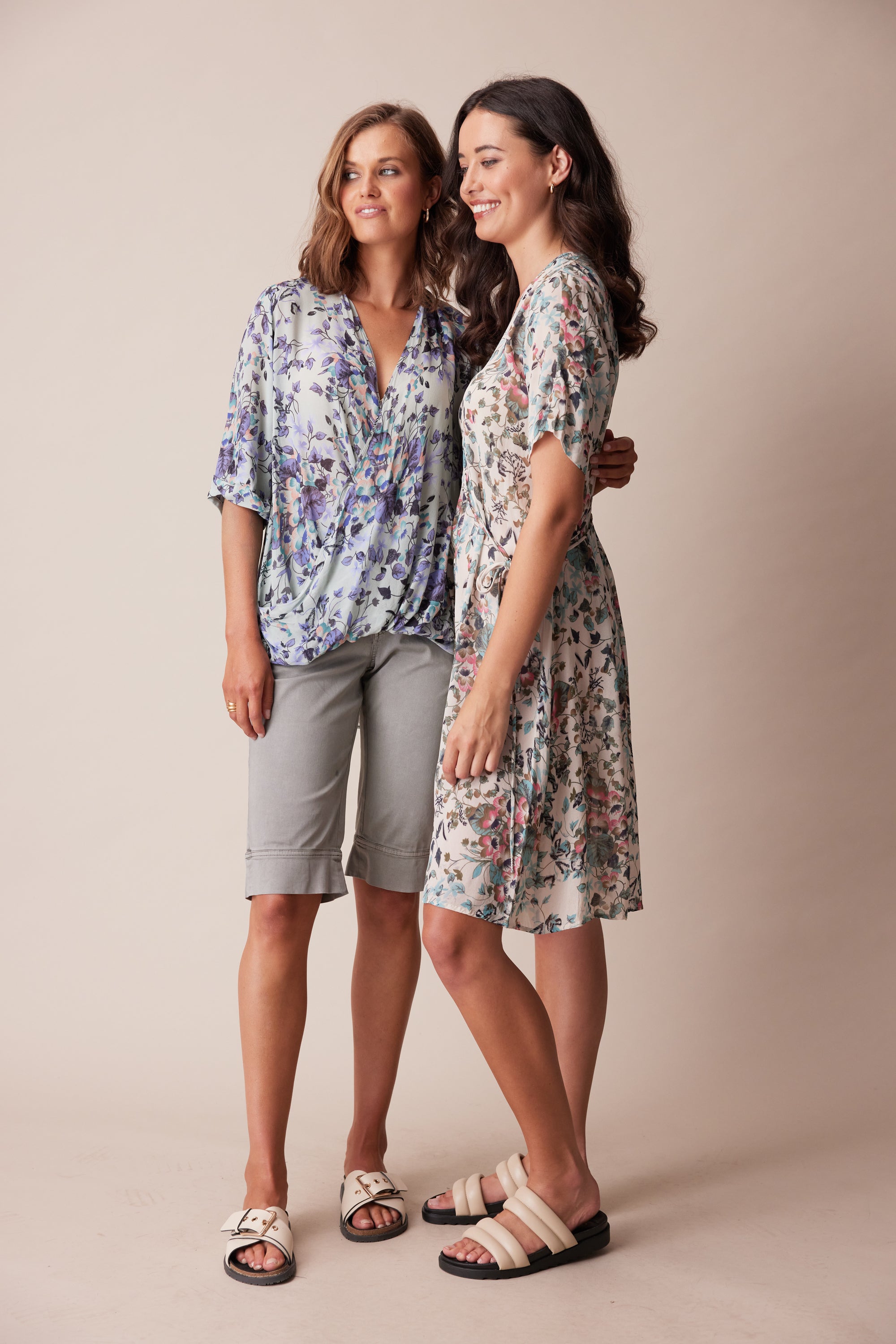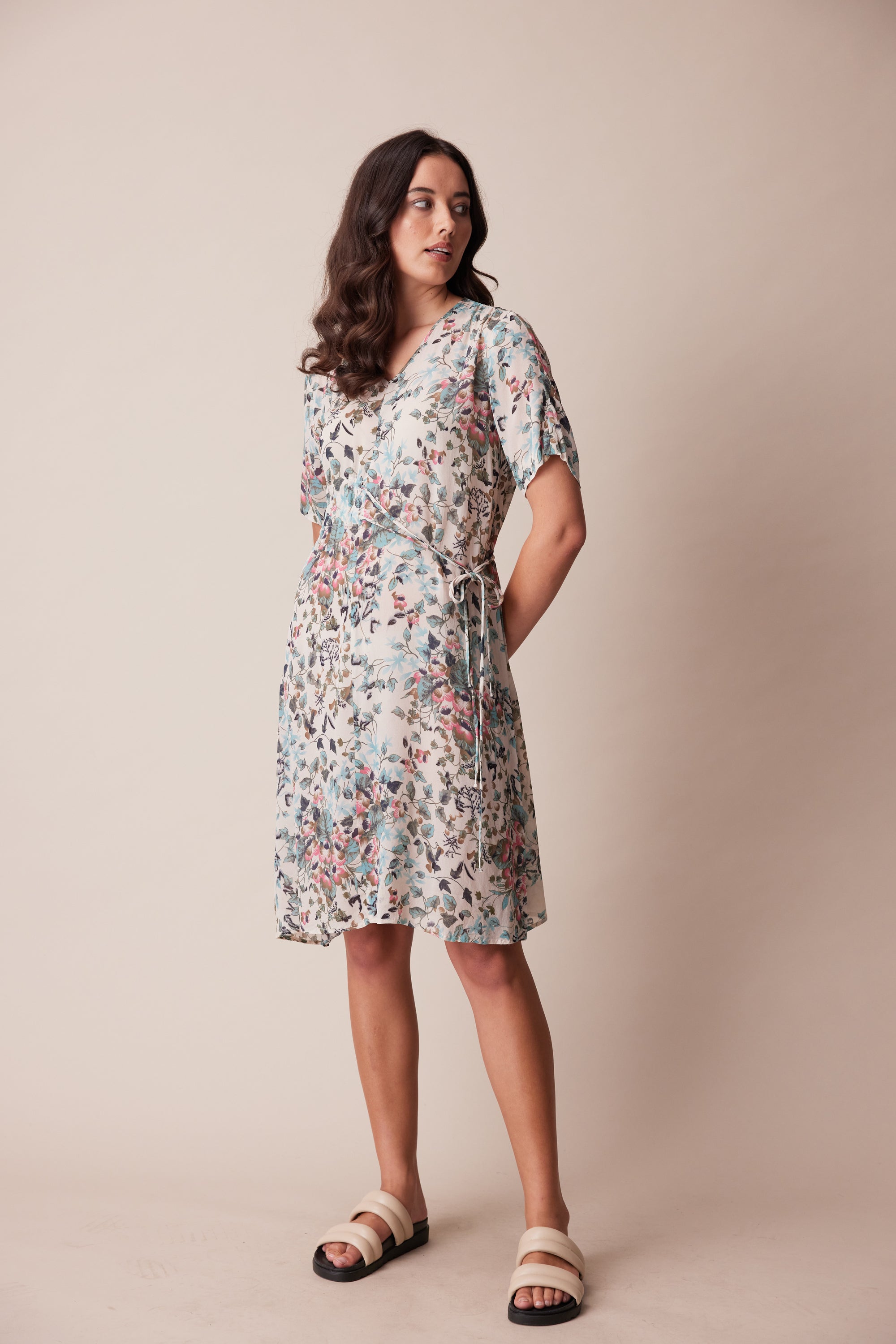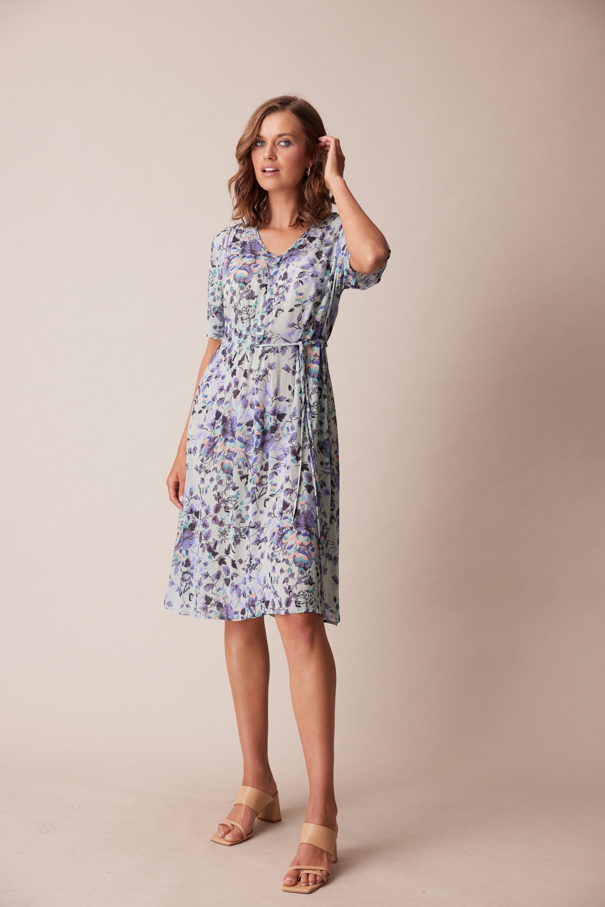 The enchanted Ivy print in lightweight georgette takes form in this modern knee-length silhouette. Double waist ties travel through asymmetric waist channels to create light gathering through the waistline, and can be adjusted as desired. The deep V neckline is finished with a delicate binding. Our LTL Slip (sold separately) is ideal to be worn underneath.