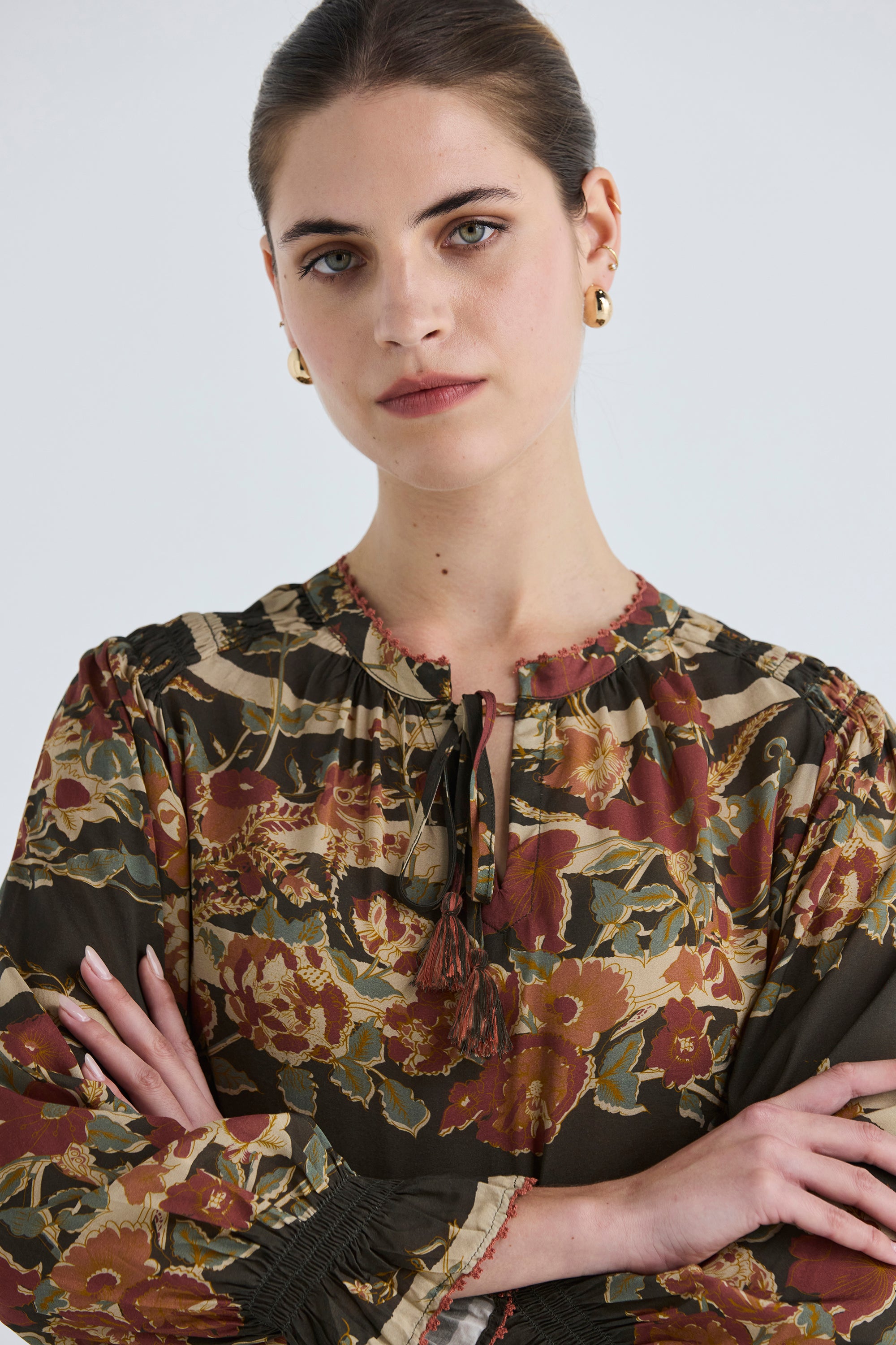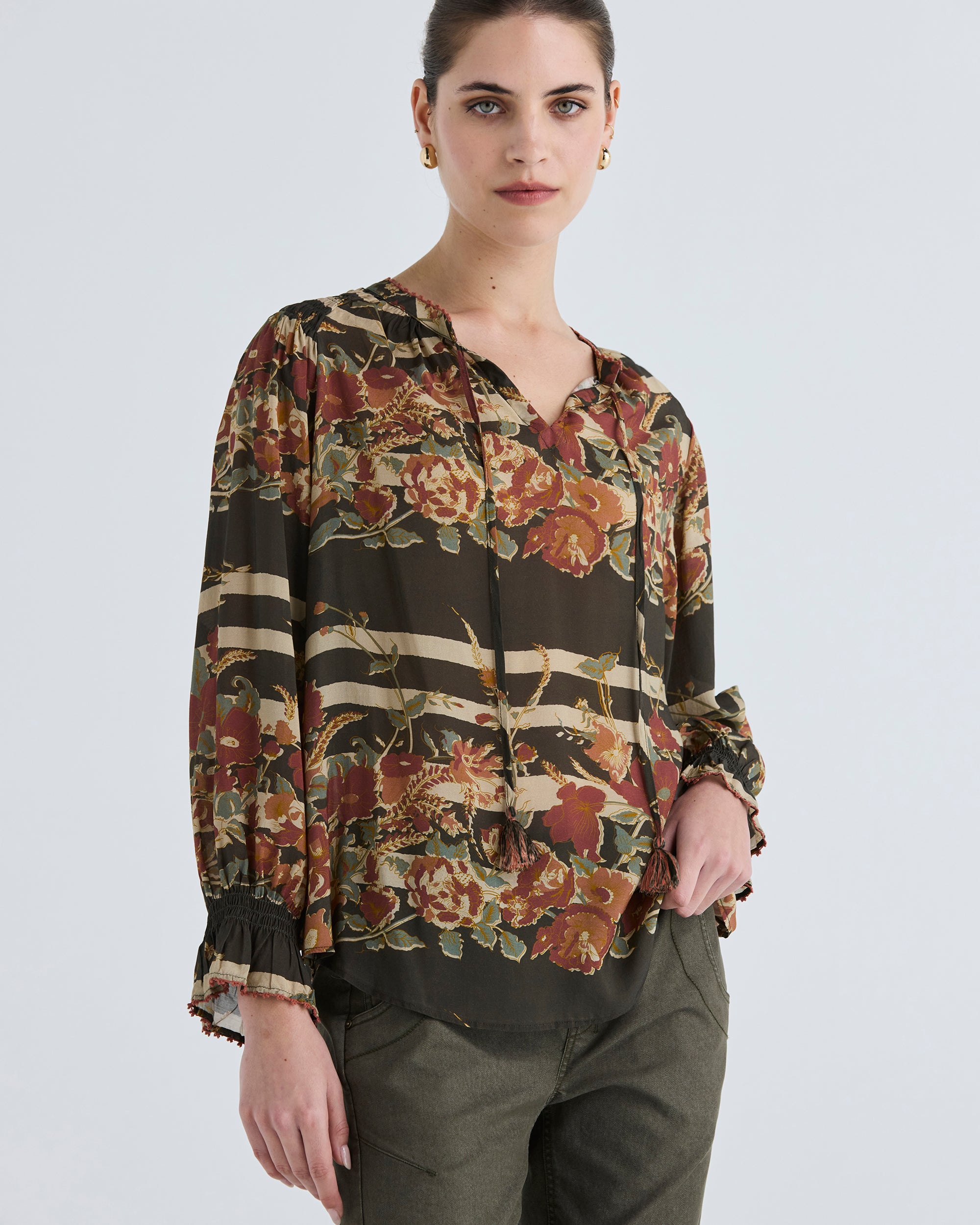 The Jasmine Top combines a soft viscose cotton fabric with the unique placement striped floral Jasmine print. Featuring delicate embroidery at the neckline and sleeve hems, it’s finished with a tie neckline and two-tone tassels in bone and khaki for added texture.