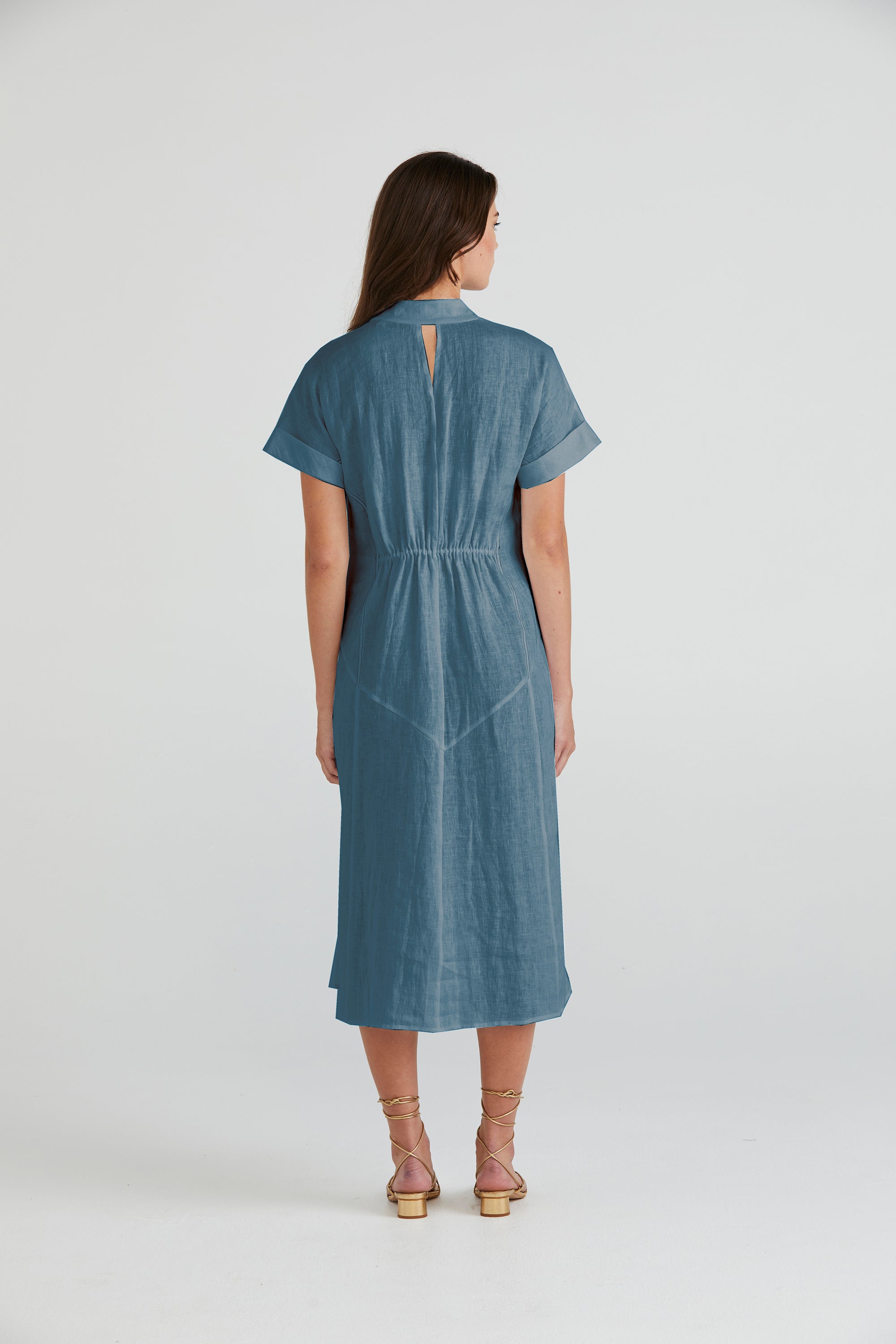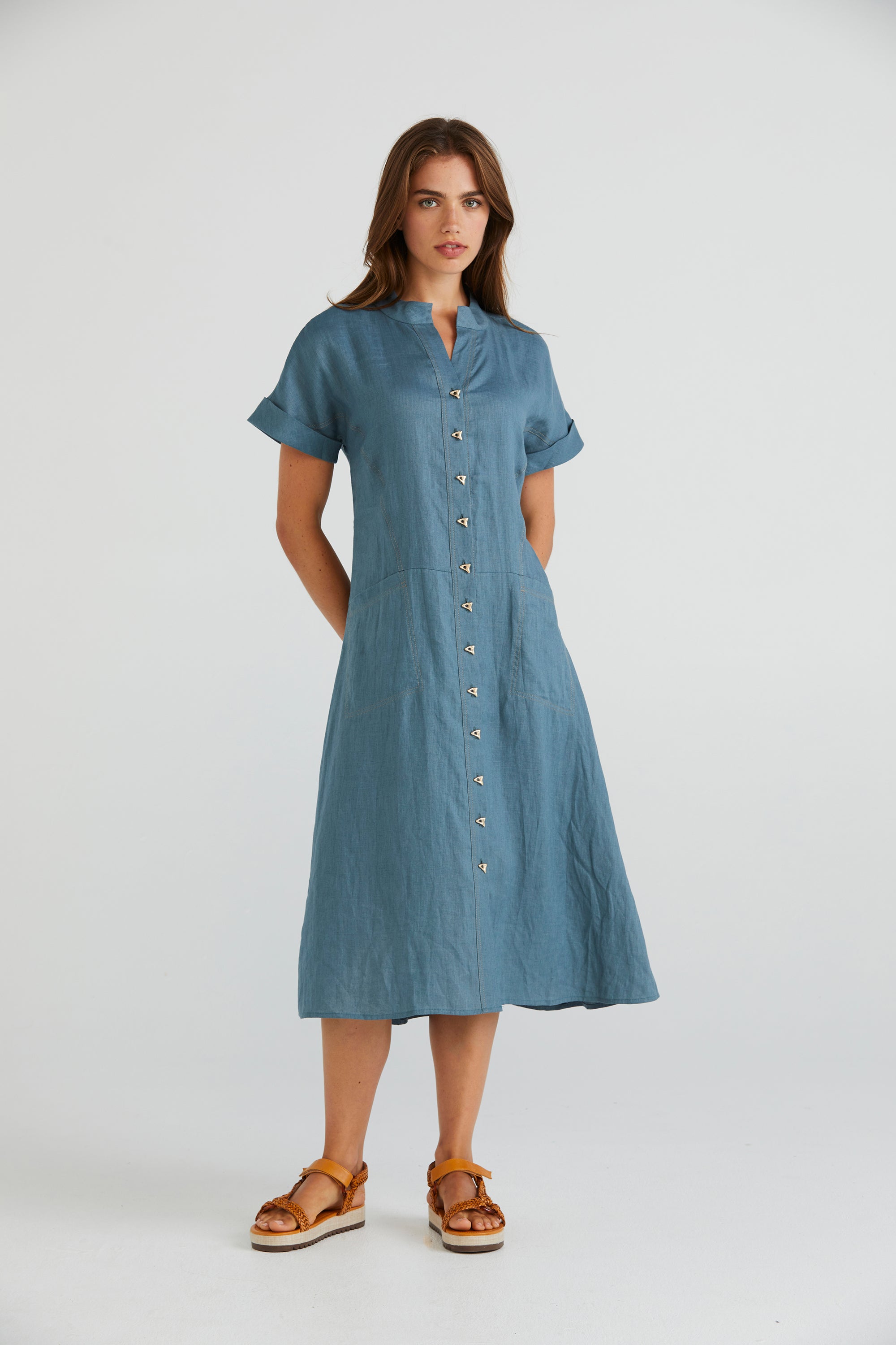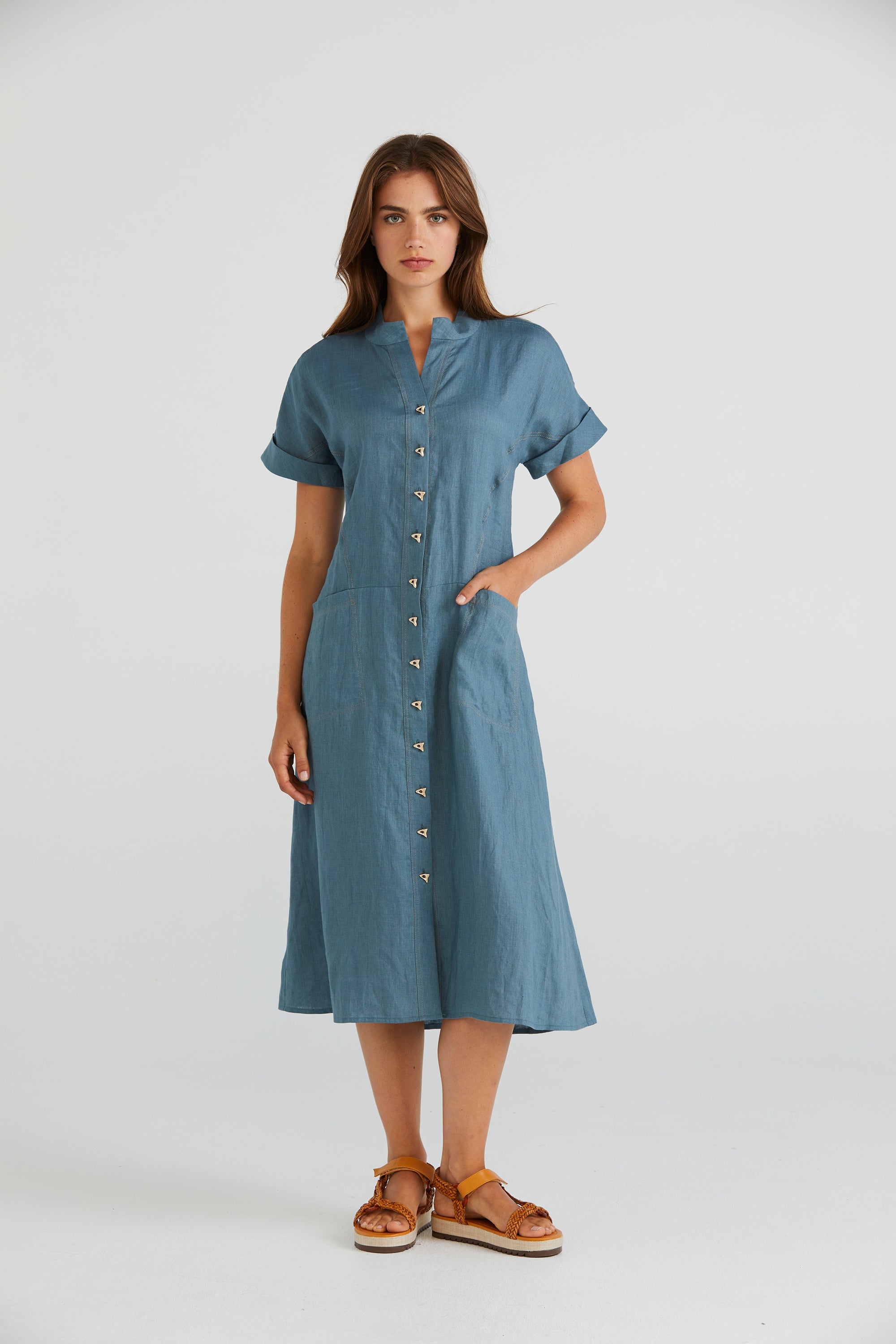Discover the charm of the Kiara Dress, a button-through linen dress featuring a shaped waist seam and intricate paneling, highlighted with contrast top stitching and complete with functional pockets. Asymmetrical soft gold buttons adorn the front placket, while the elasticated back waist ensures a flattering silhouette. The cut-out section at the back neckline adds a touch of intrigue.