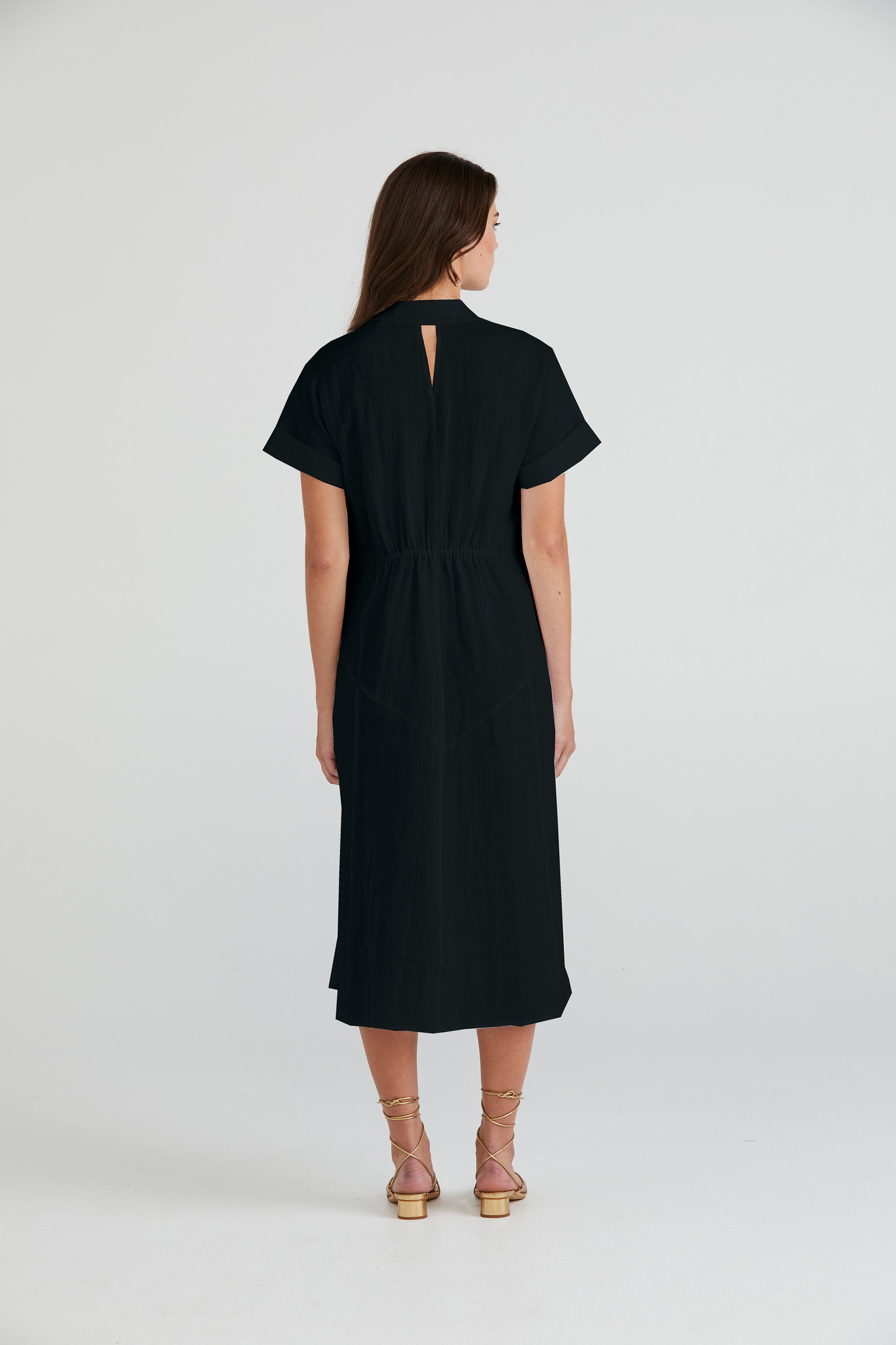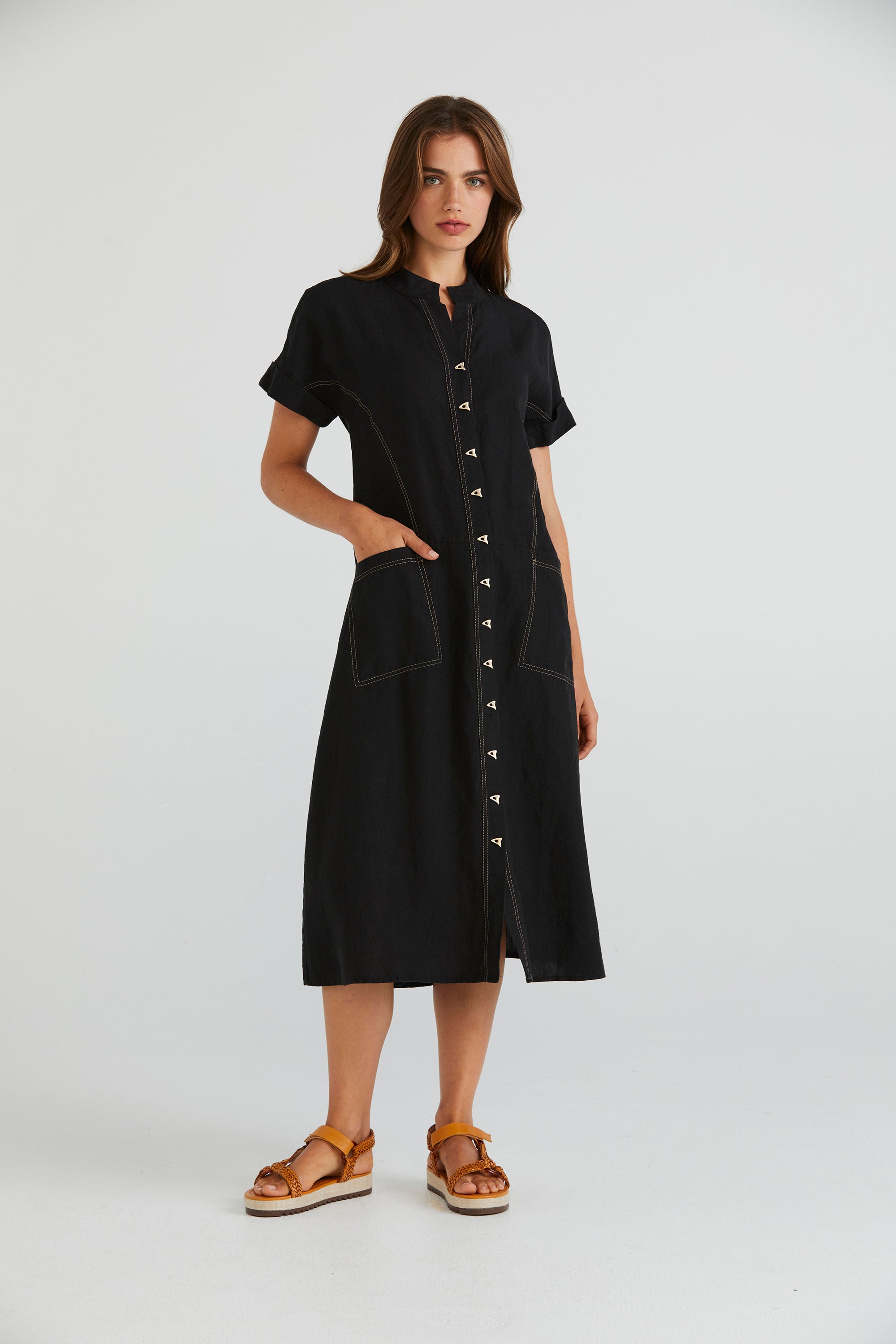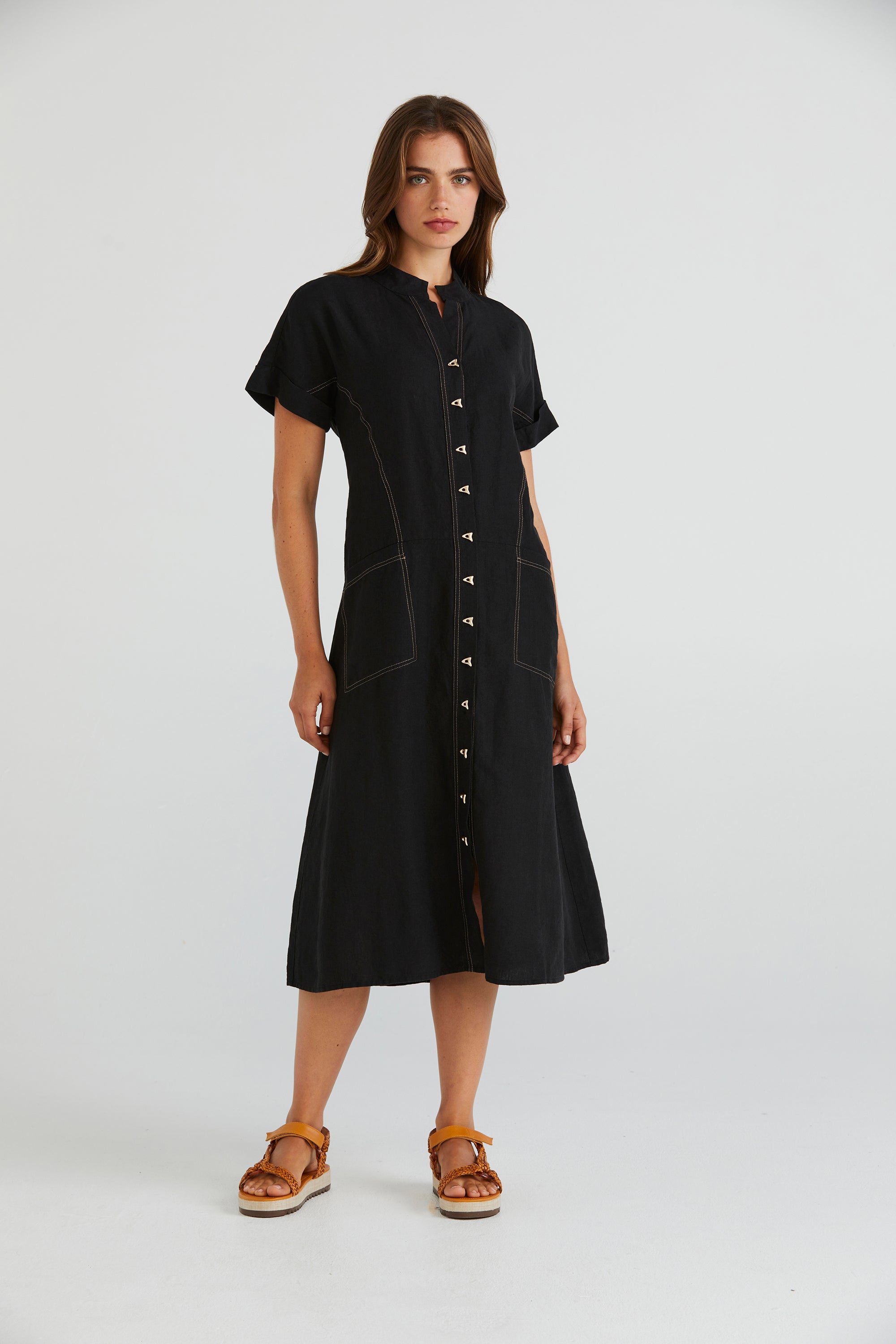 Discover the charm of the Kiara Dress, a button-through linen dress featuring a shaped waist seam and intricate paneling, highlighted with contrast top stitching and complete with functional pockets. Asymmetrical soft gold buttons adorn the front placket, while the elasticated back waist ensures a flattering silhouette. The cut-out section at the back neckline adds a touch of intrigue.