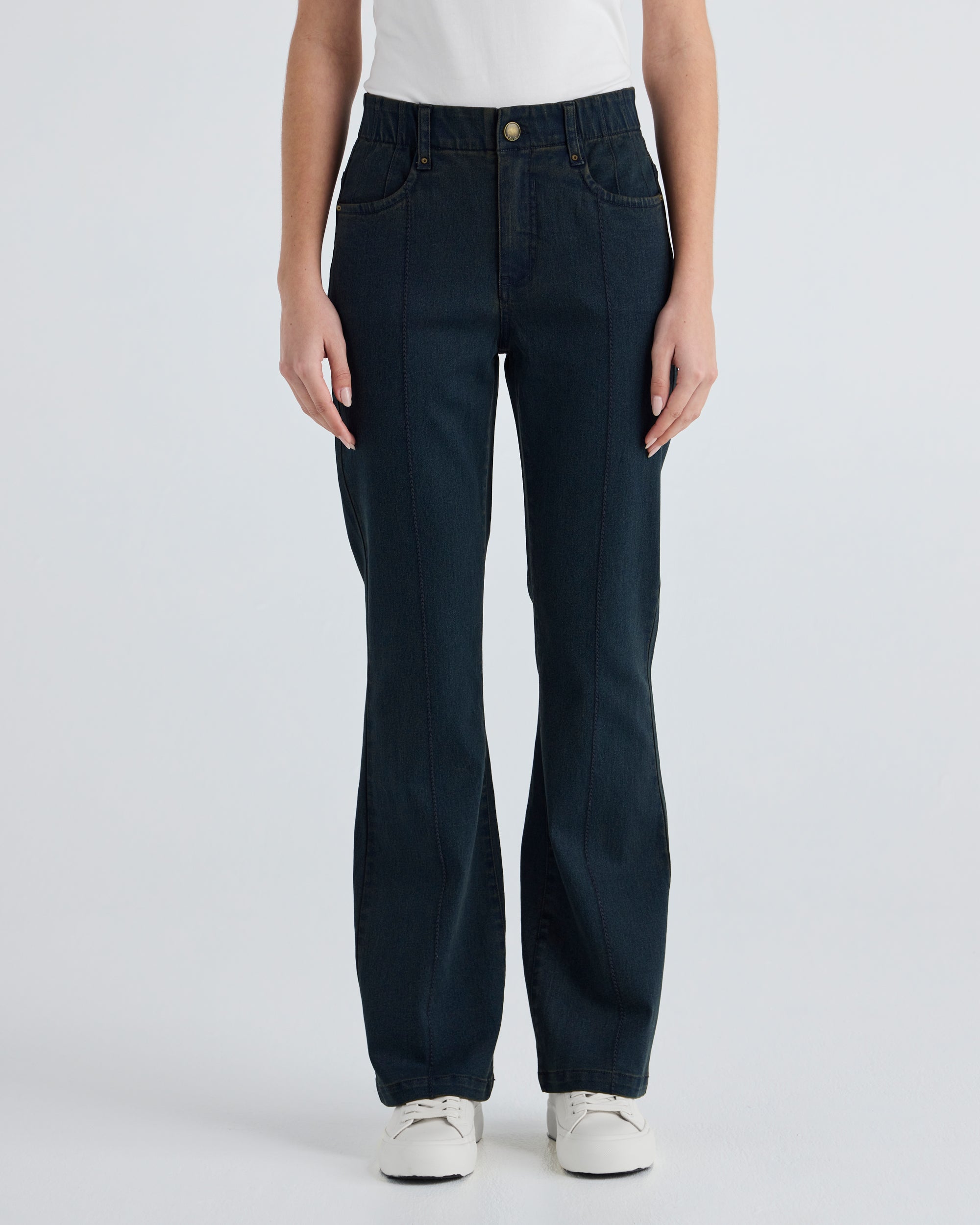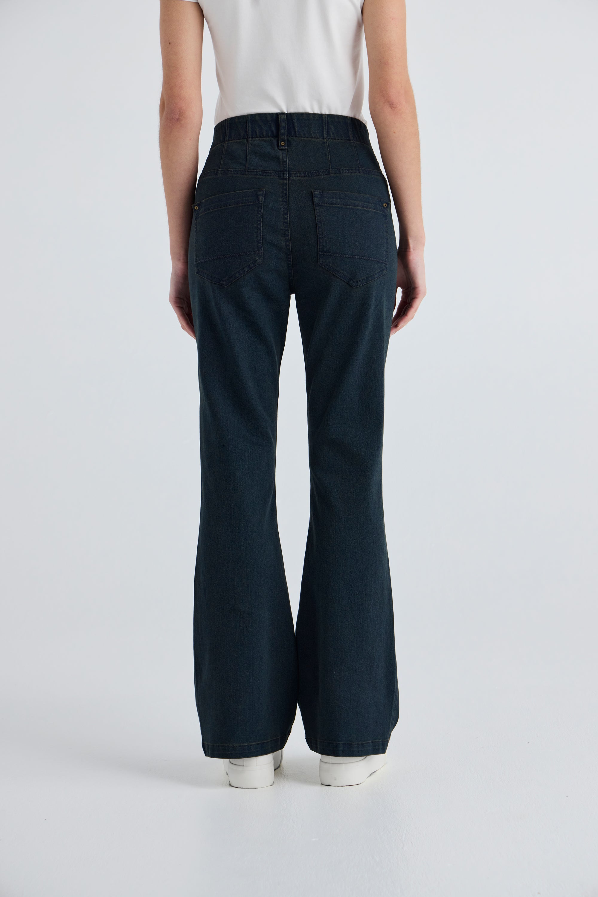 The Lauren Bootleg jeans feature an on-trend bootleg cut with a mid-rise and full-length leg line. Crafted from over-dyed dark indigo denim, they offer a soft feel and a distressed colour finish. Embroidery stitching down the centre-front leg elongates the legs, while darts at the back and front yoke provide a flattering fit.