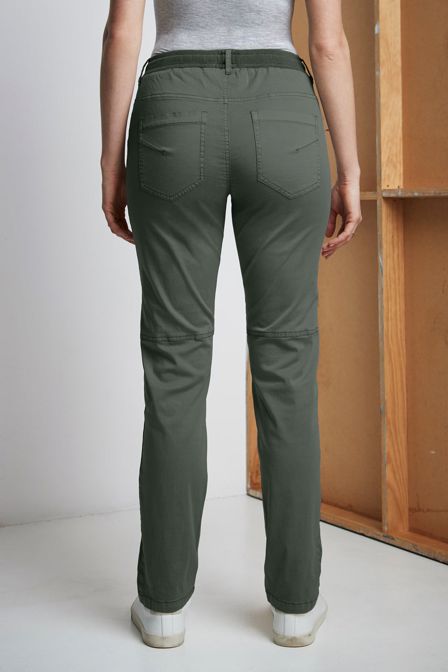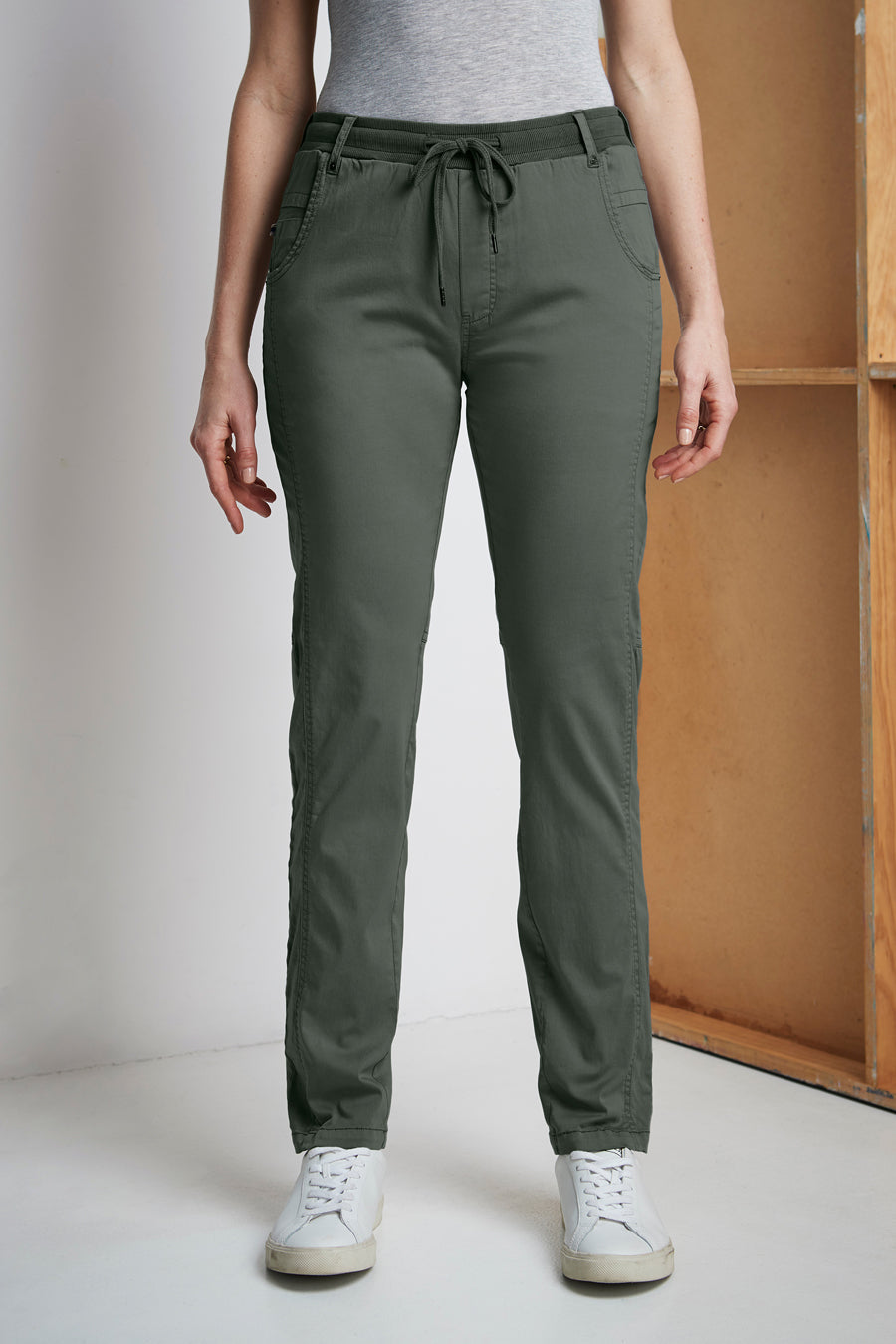 A cool casual pant, elastic rib waistband with drawcord, front and back pockets, mock fly. The soft handle and slightly distressed finish is achieved by special garment wash.