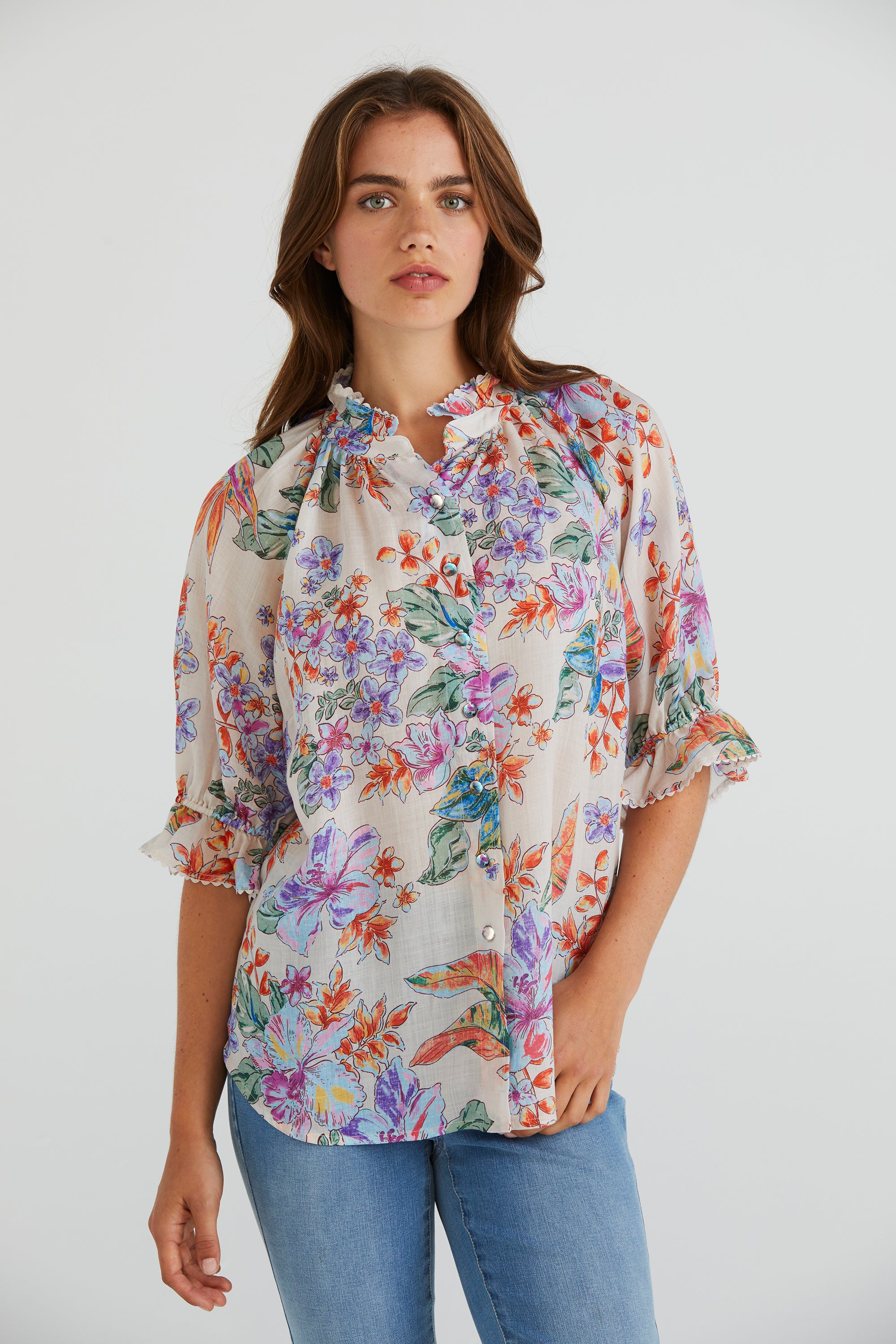 Embrace tropical charm with the Lily Shirt, crafted from a linen ramie blend adorned with a vibrant Lily print. The ric rac trim at the neckline and sleeve ruffle edge exude playful sophistication.