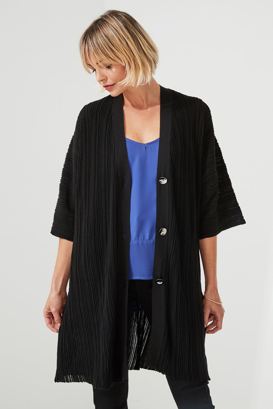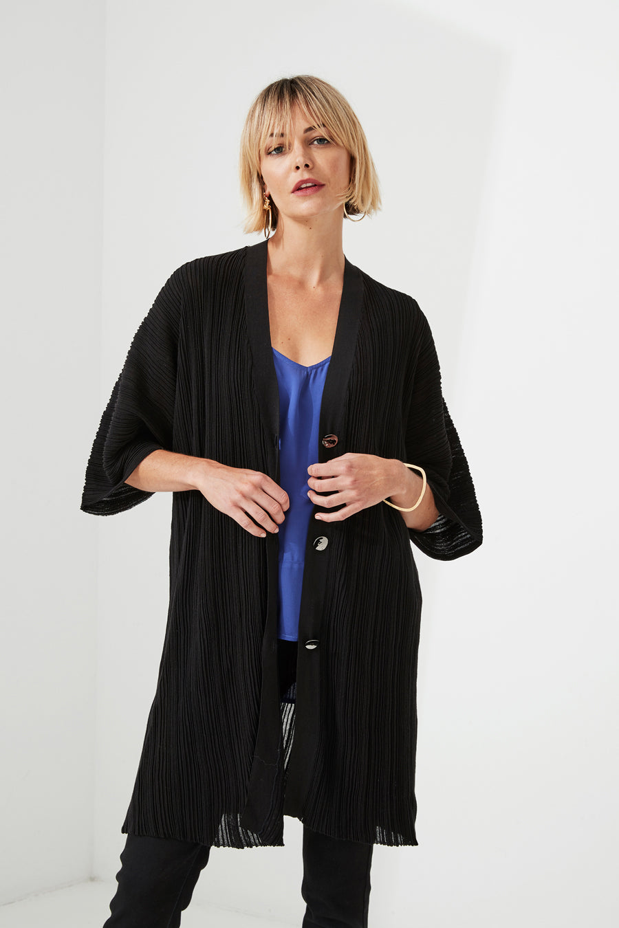 Longline cardi, kimono silhouette featuring ribbed knitwear, cotton blend yarn with front opening and gunmetal waffle buttons.