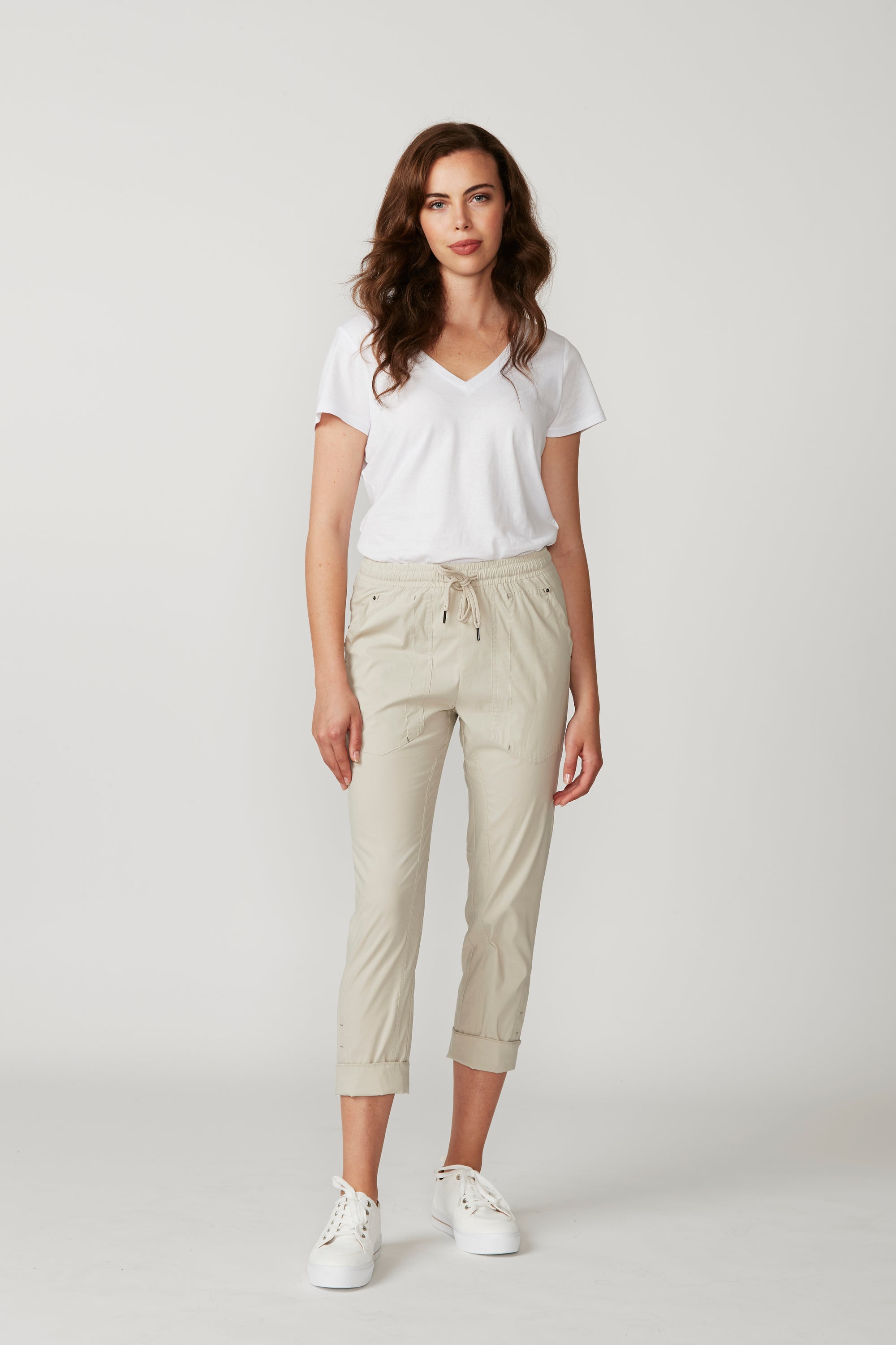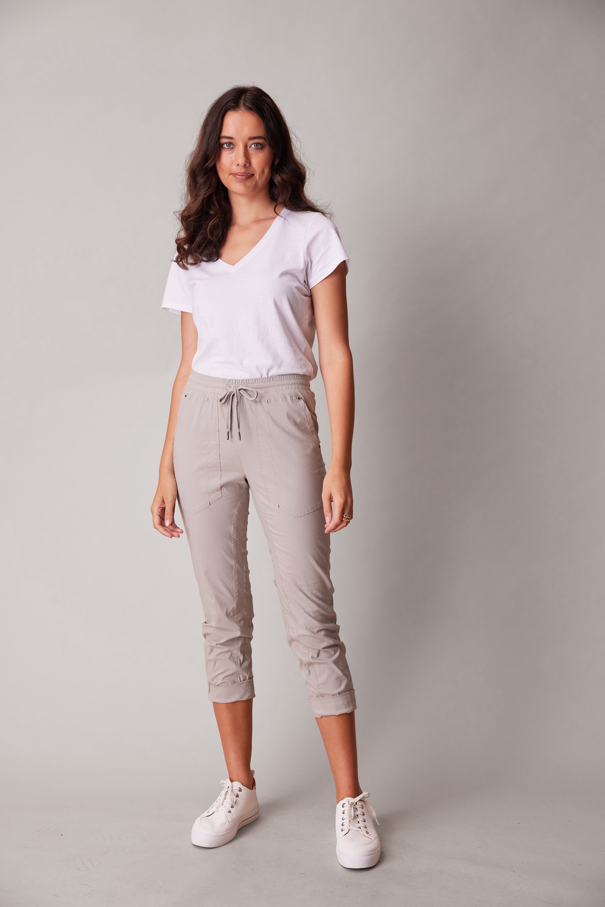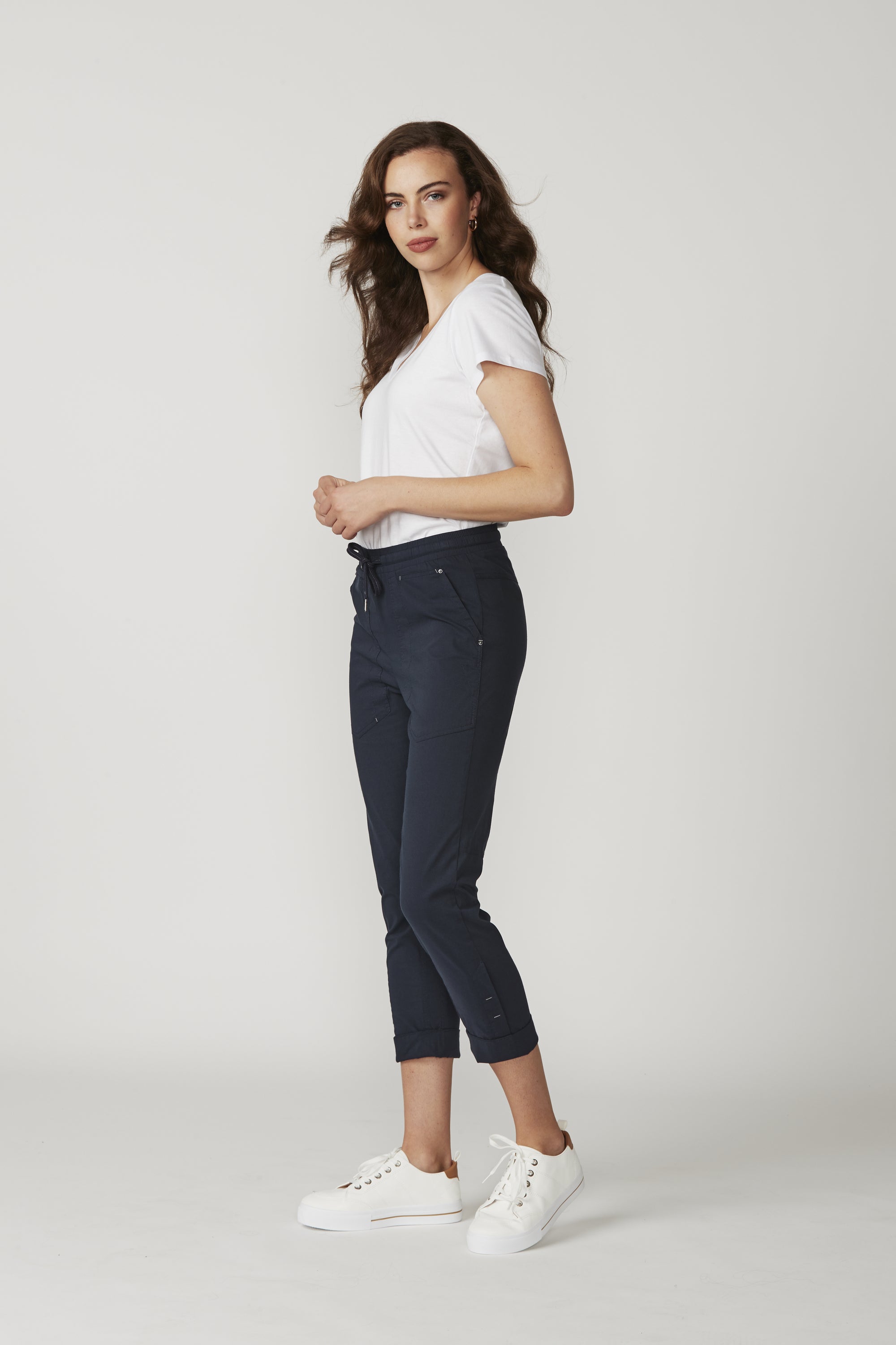 The LTL port 7/8 pant — features elasticated waist with adjustable drawcord, front pocket with antique nickel hardware and relaxed leg with optional turn up cuff. Perfect lightweight cotton rich stretch pant for everyday.