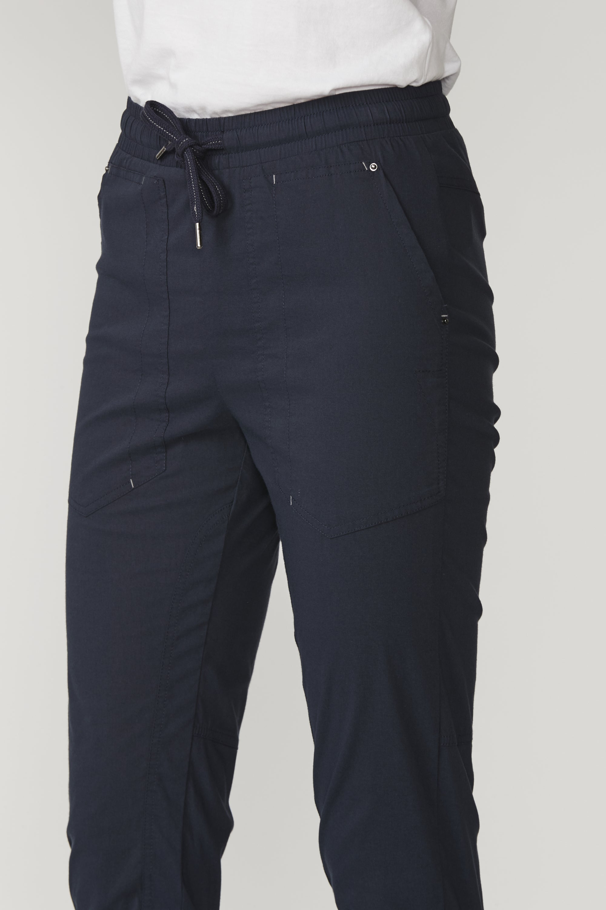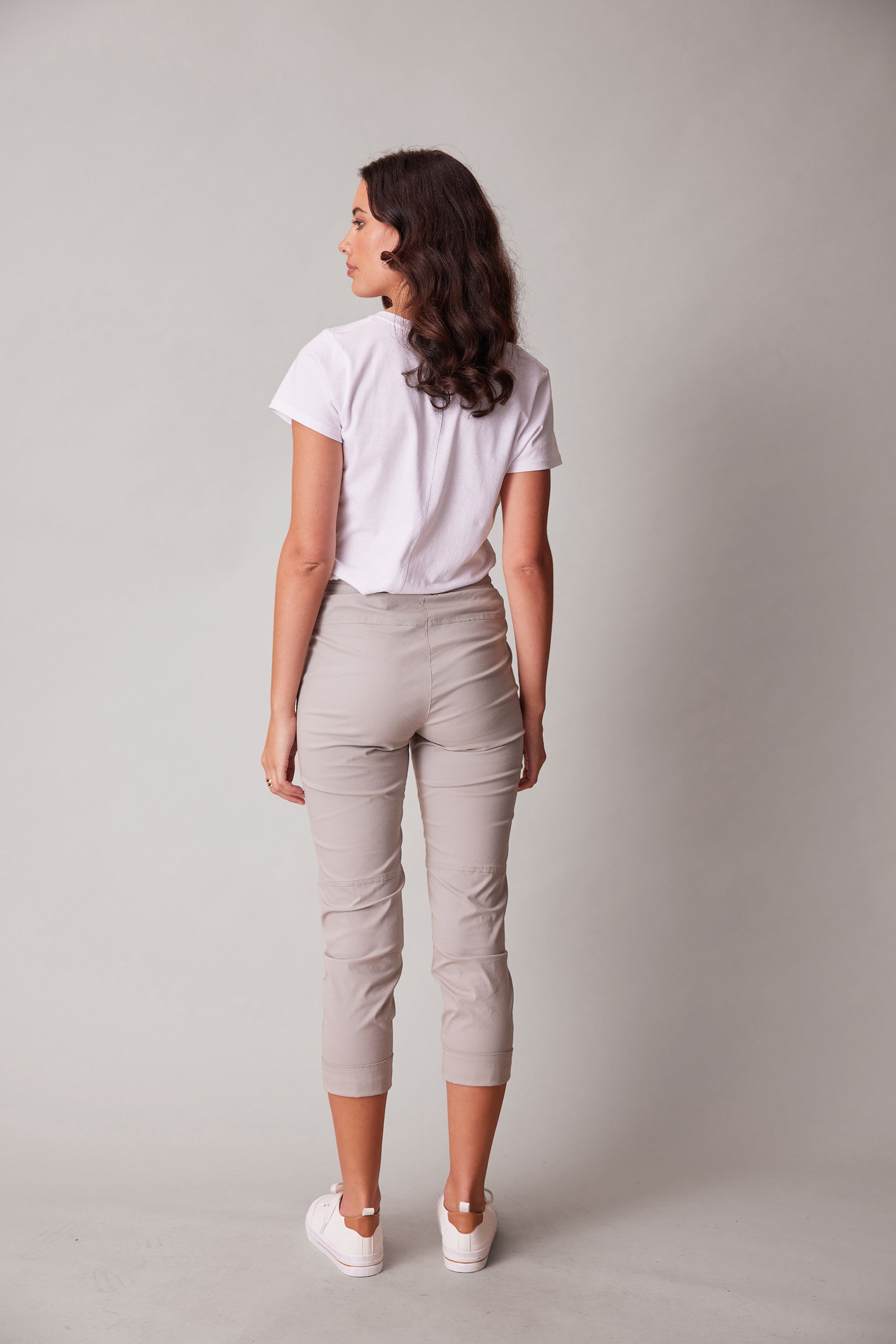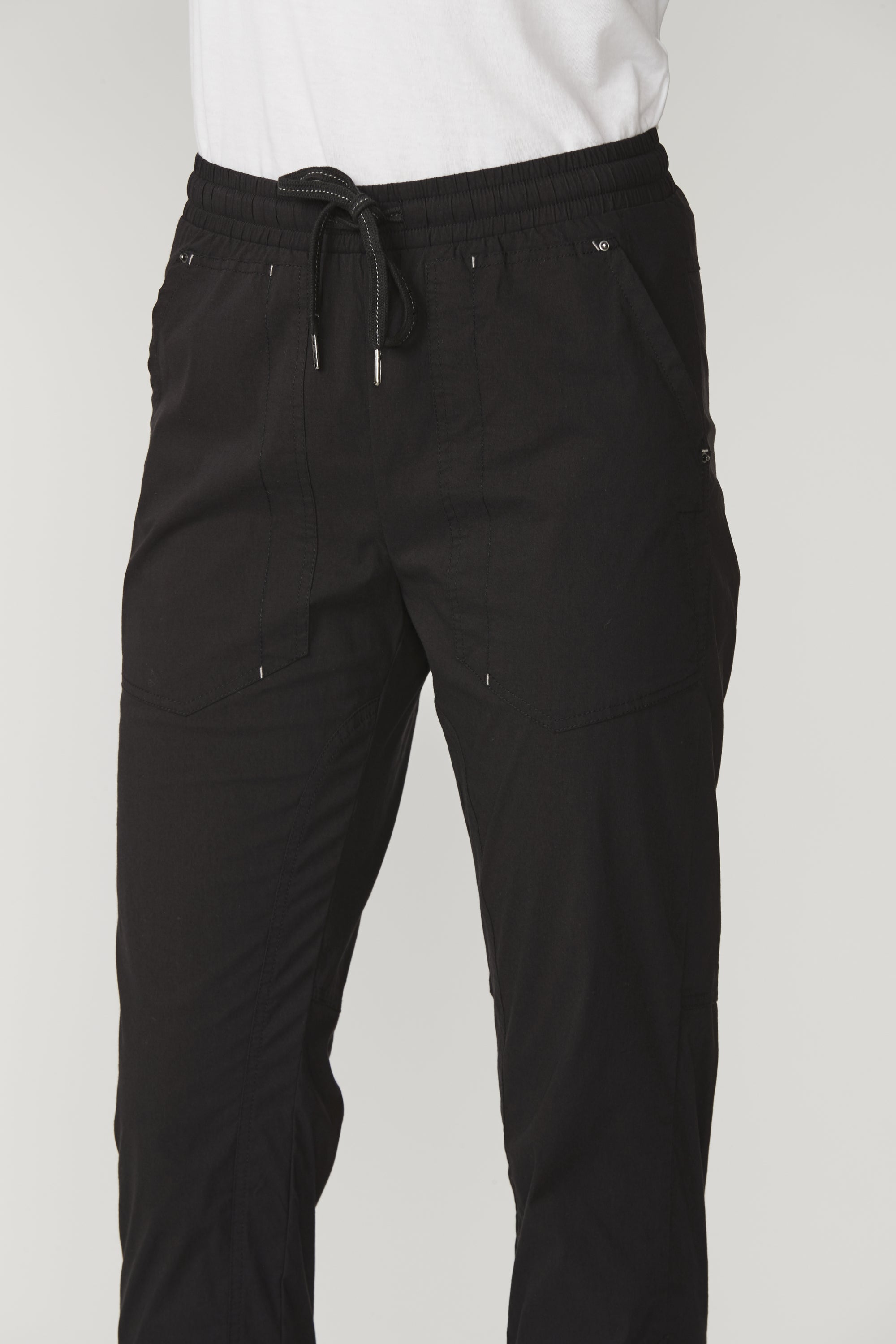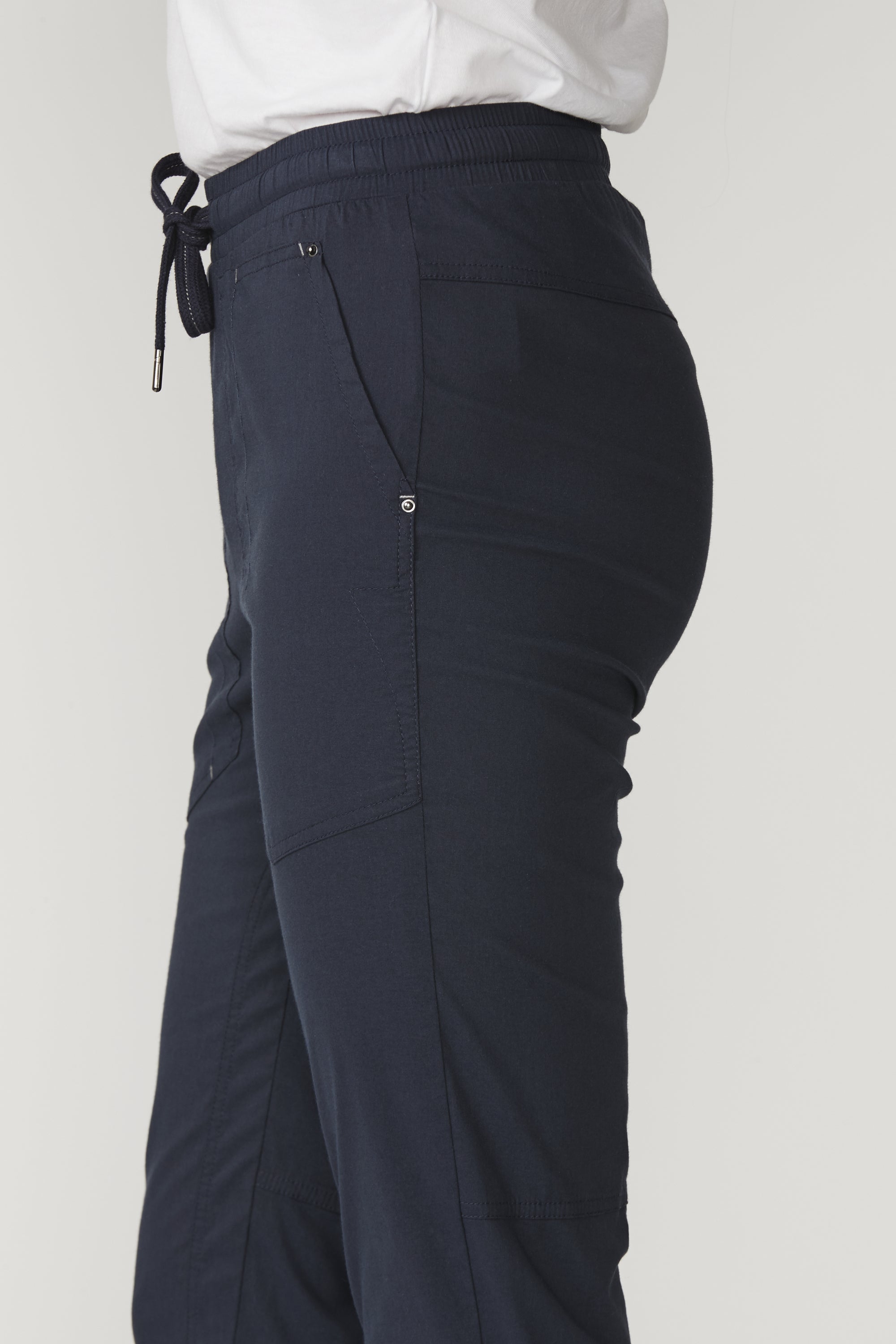The LTL port 7/8 pant — features elasticated waist with adjustable drawcord, front pocket with antique nickel hardware and relaxed leg with optional turn up cuff. Perfect lightweight cotton rich stretch pant for everyday.