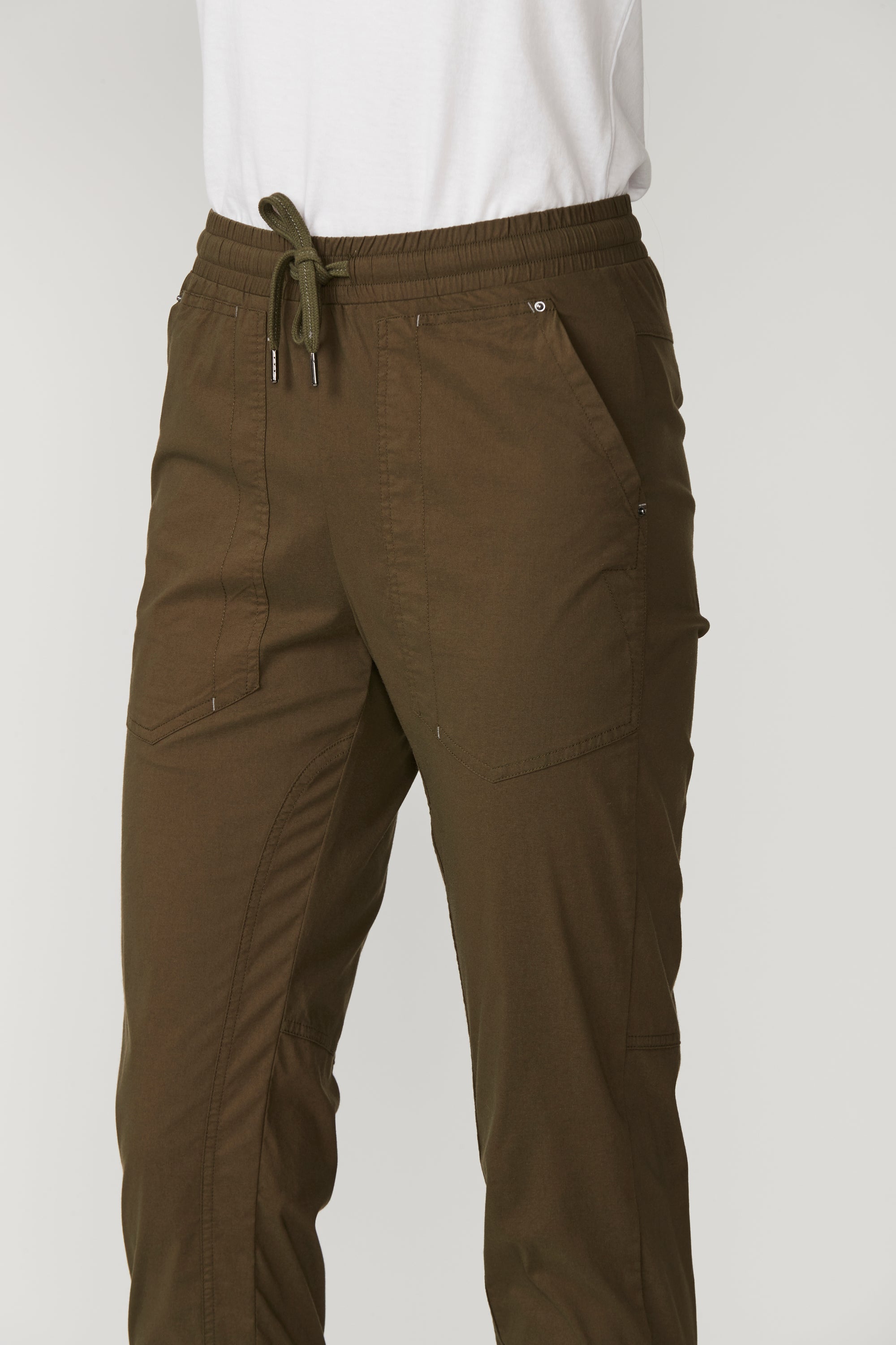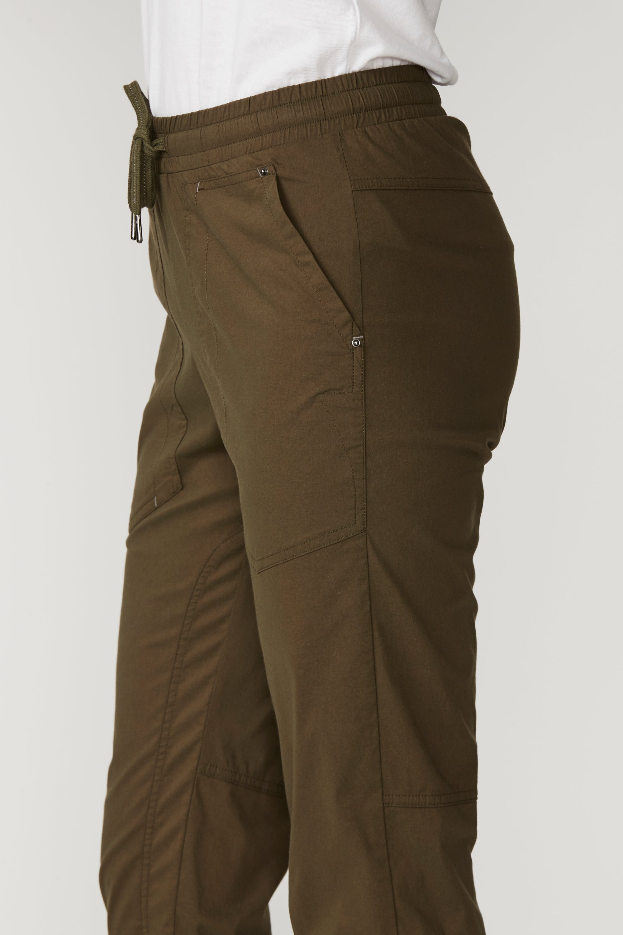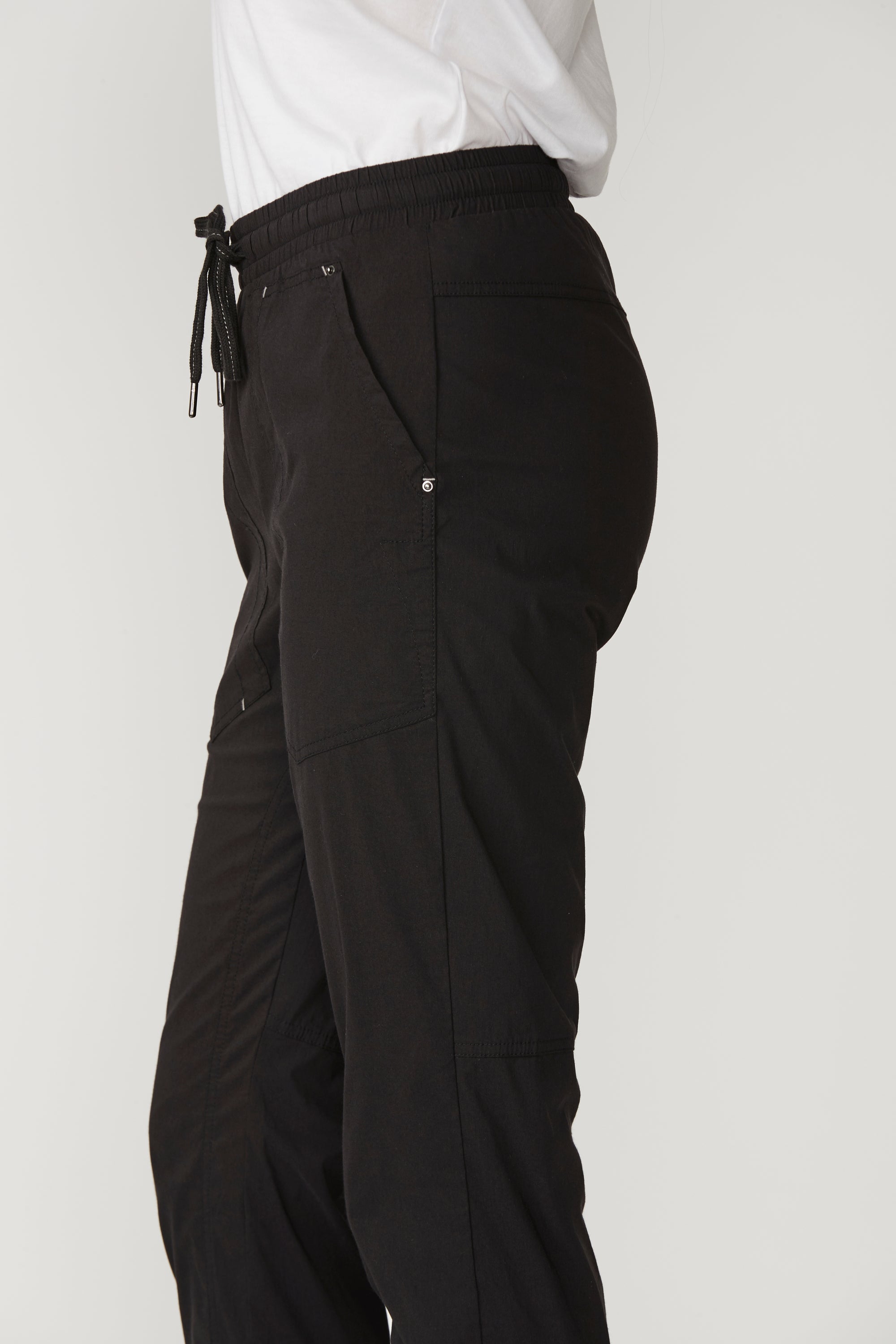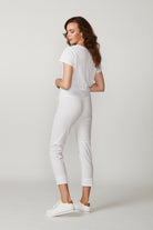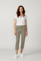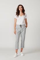 The LTL port 7/8 pant – features elasticated waist with adjustable drawcord, front pocket with antique nickel hardware & relaxed leg with optional turn up cuff. Perfect lightweight cotton rich stretch pant for everyday.