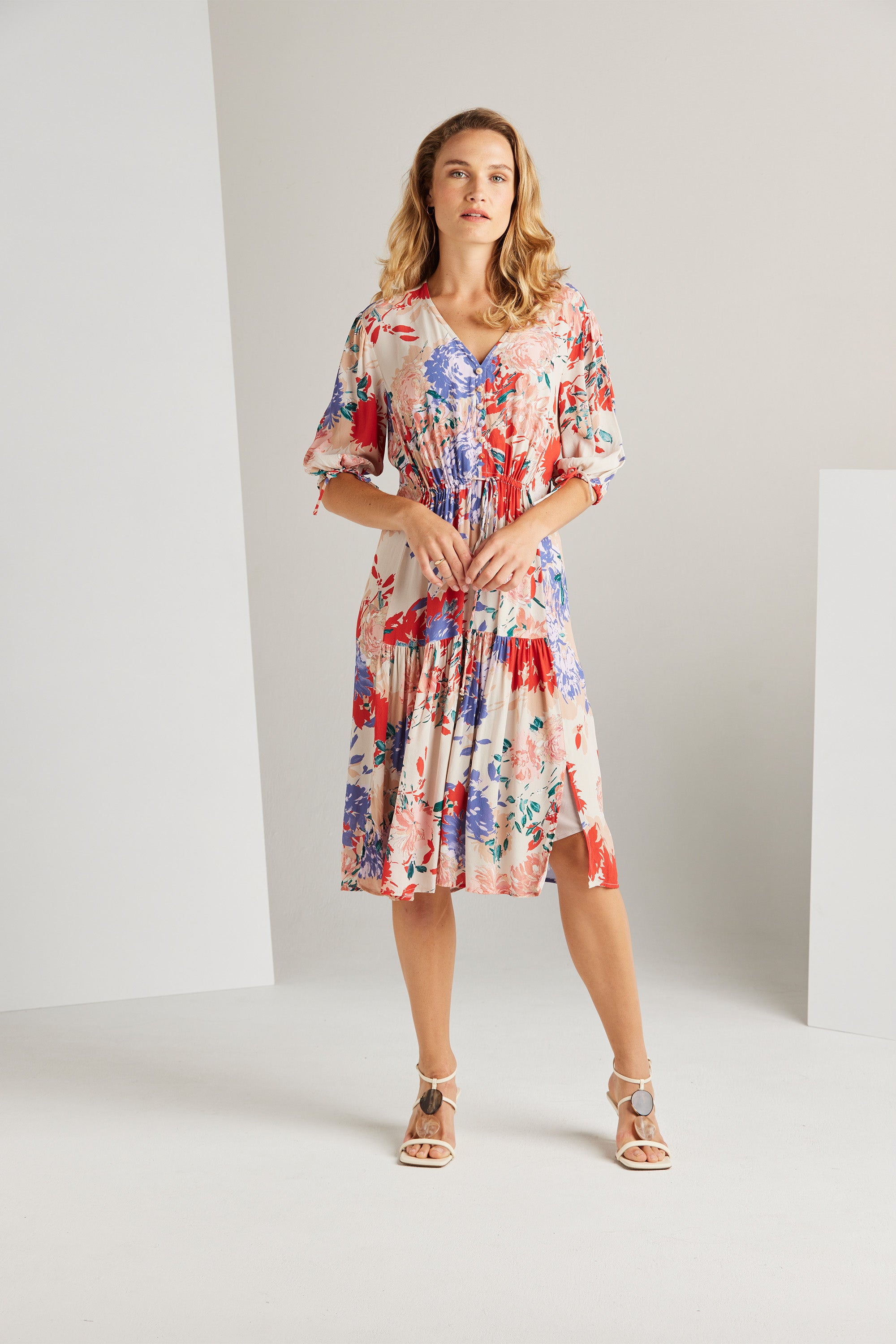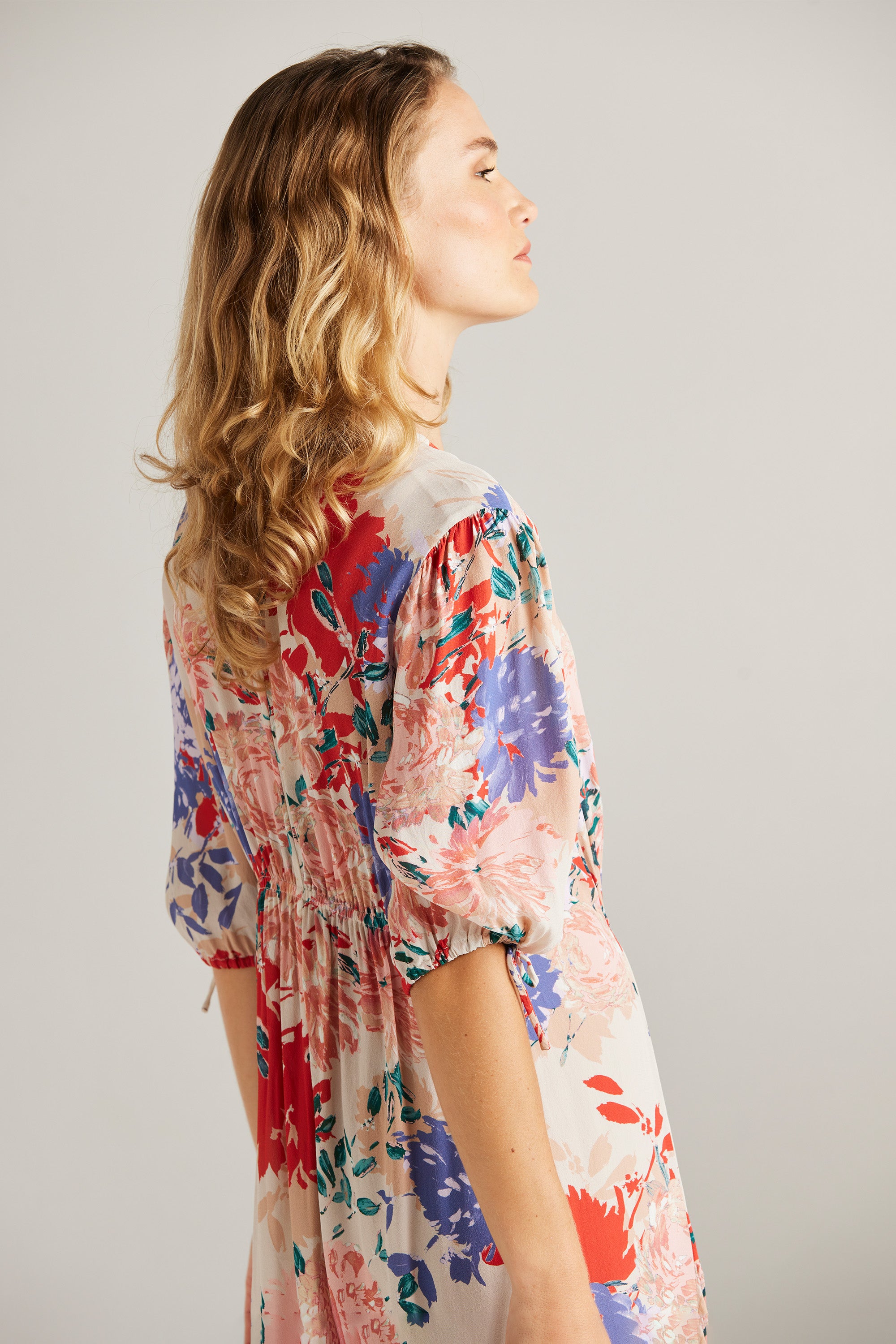 This spring floral print georgette dress boasts adjustable drawstring detail at the front waist, gathering, and a button front placket, allowing for versatile styling options. Wear it with heels for a formal party or flat sandals for a casual look.