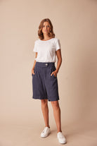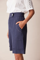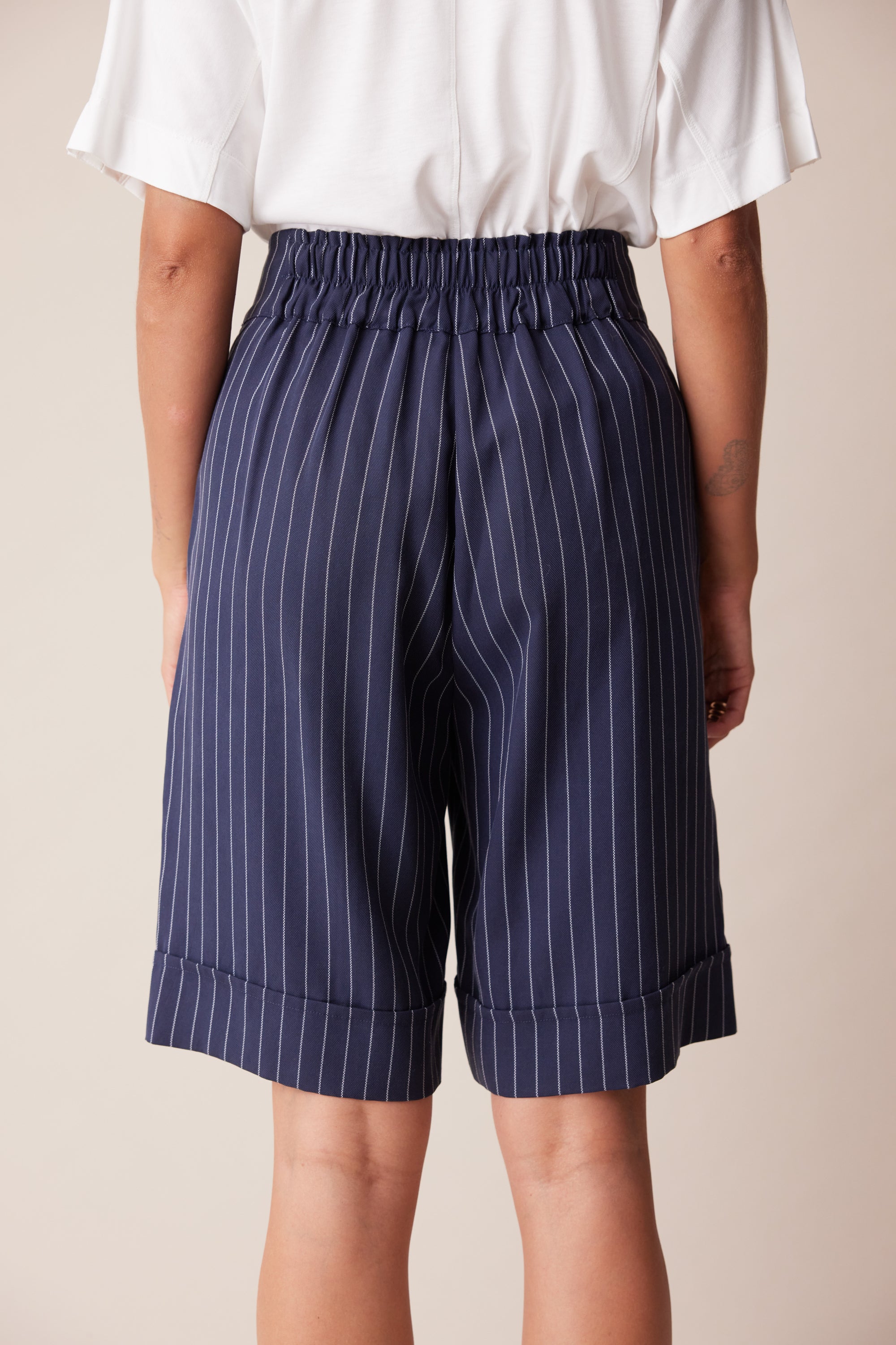 A longline tailored short in stripe suiting featuring a deep waistband with button tab detail, fly front, topstitched panel seams and deep side pockets. The elasticated back waistband and wide leg bring a sense of ease and comfort to this elegant style.