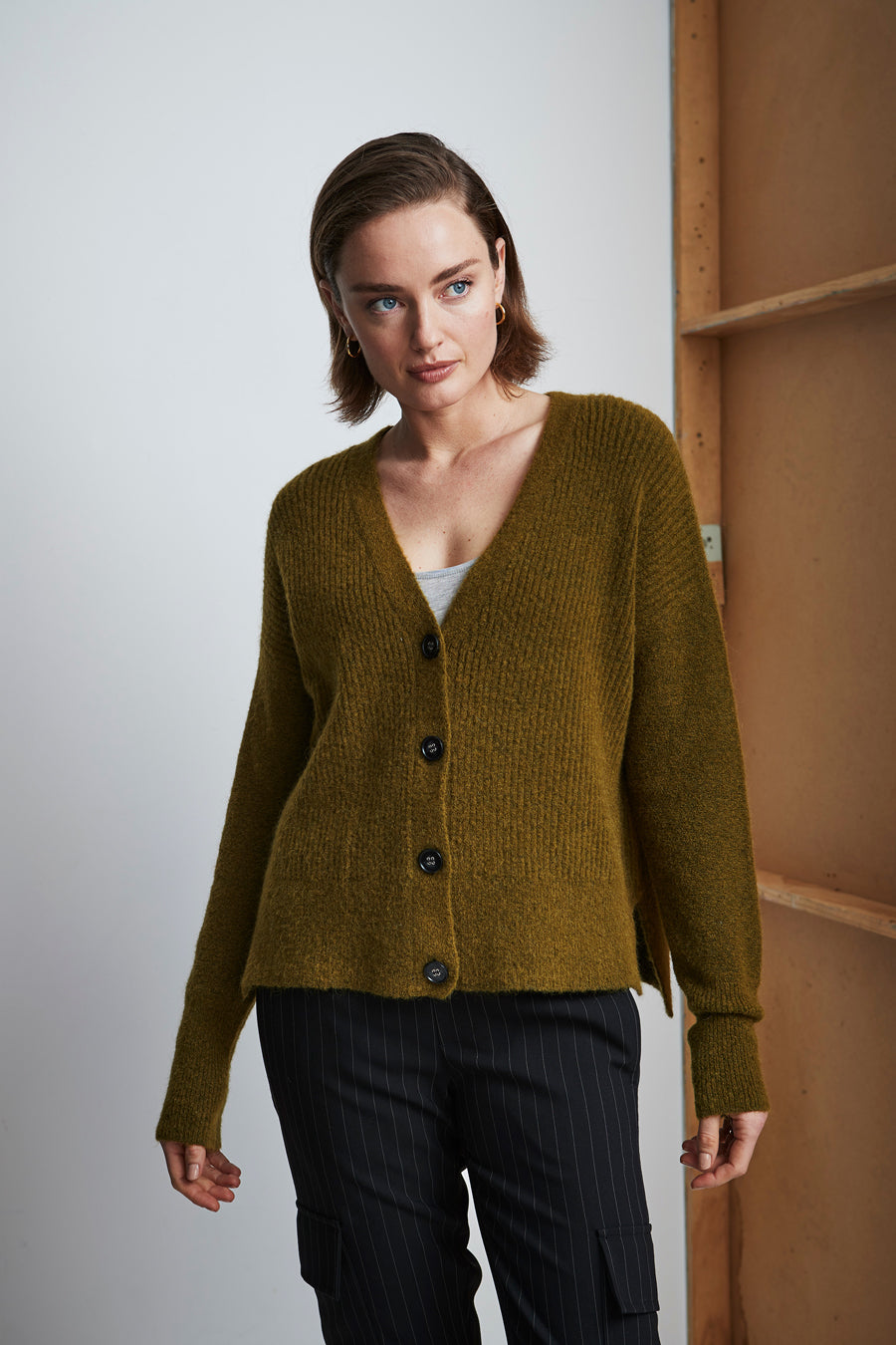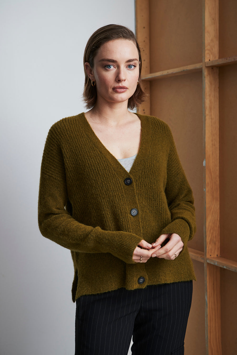 A V-neck, boxy fit cardigan with long sleeves and chunky novelty button. The rib knit structure accentuates the luxurious yarn.