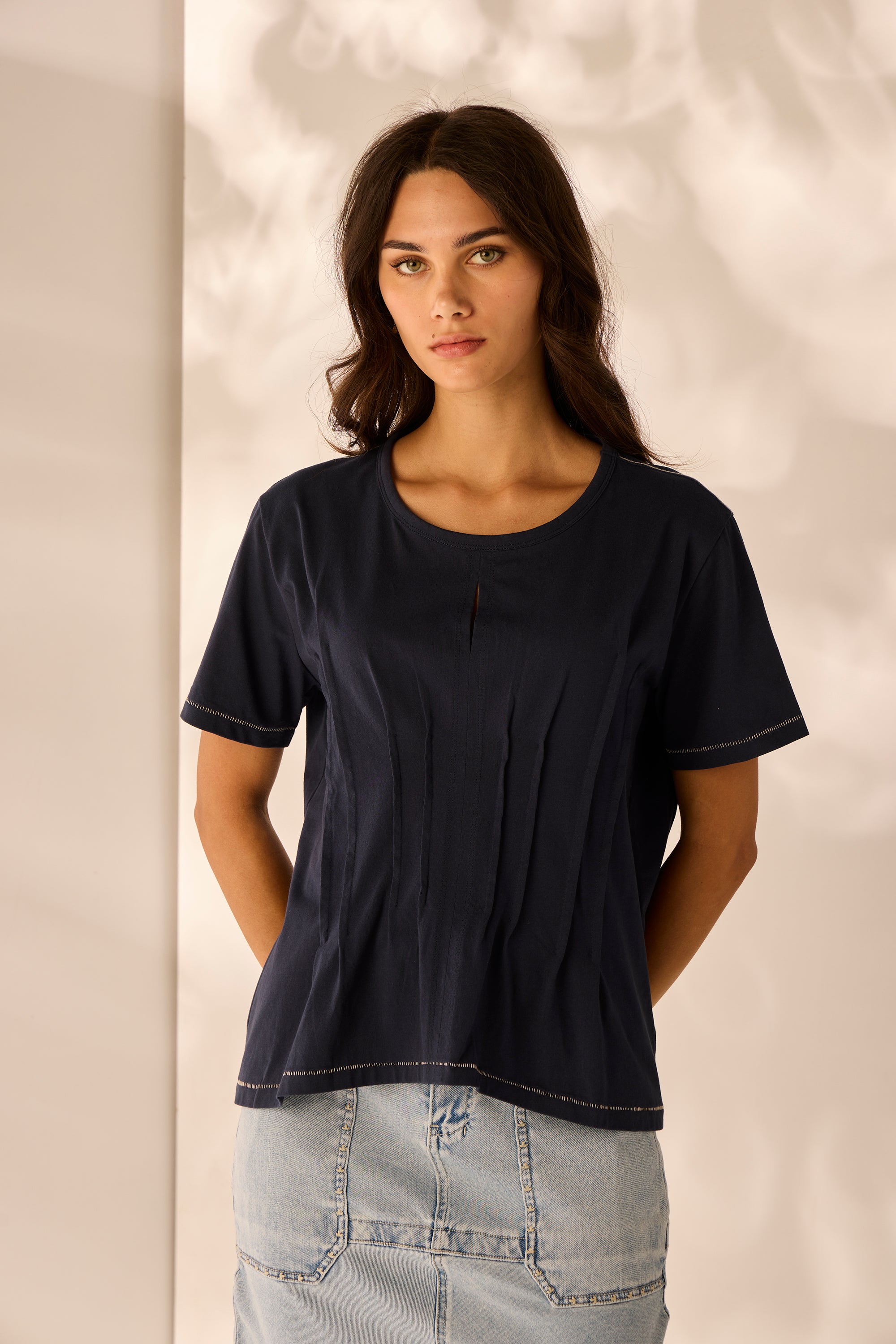 Elevate your wardrobe with the Mika Top, a statement piece designed to turn heads. Thoughtfully crafted with exposed darts and intricate chain stitch detailing. The high-low hemline and centre front seam with a subtle split add effortless movement, while exposed stitching on the sleeve cuffs and hem enhances its artisanal appeal.