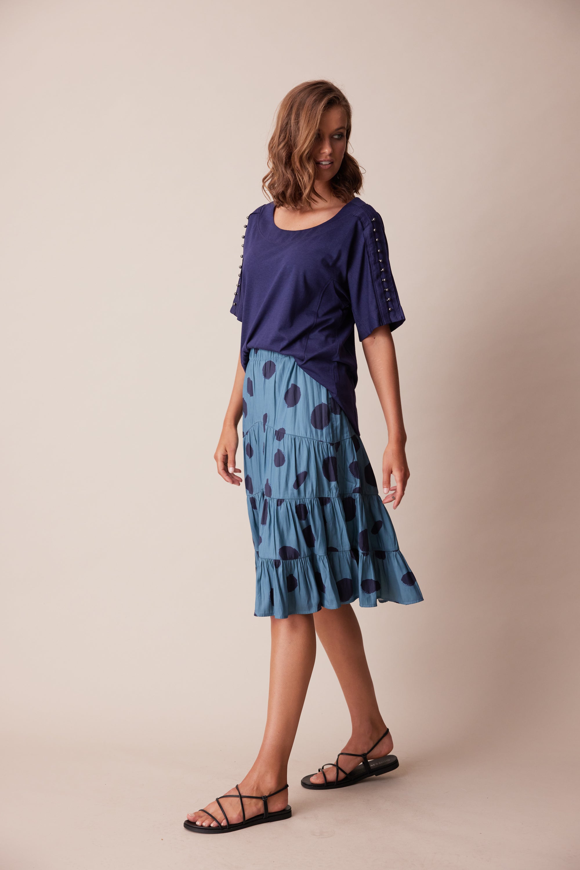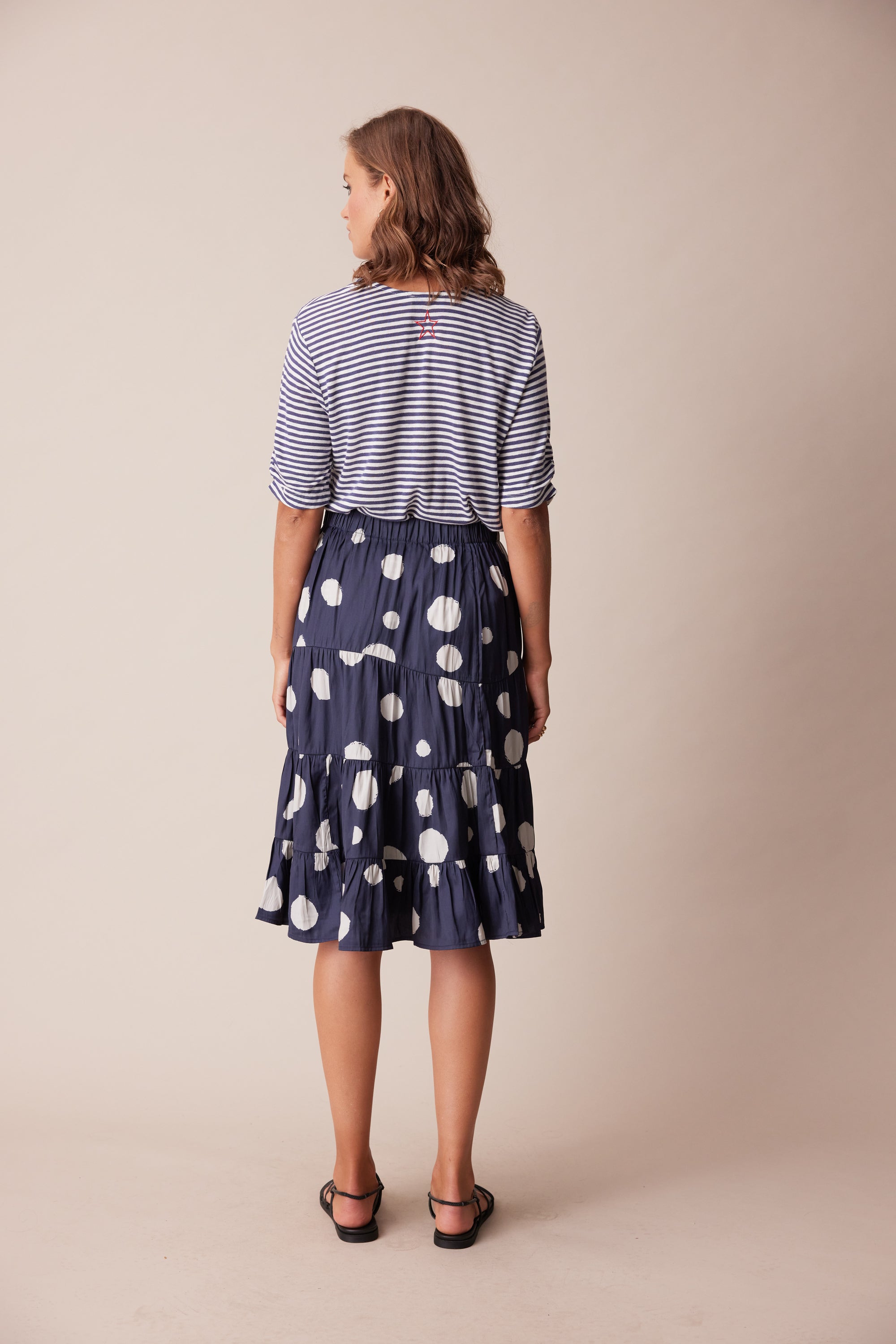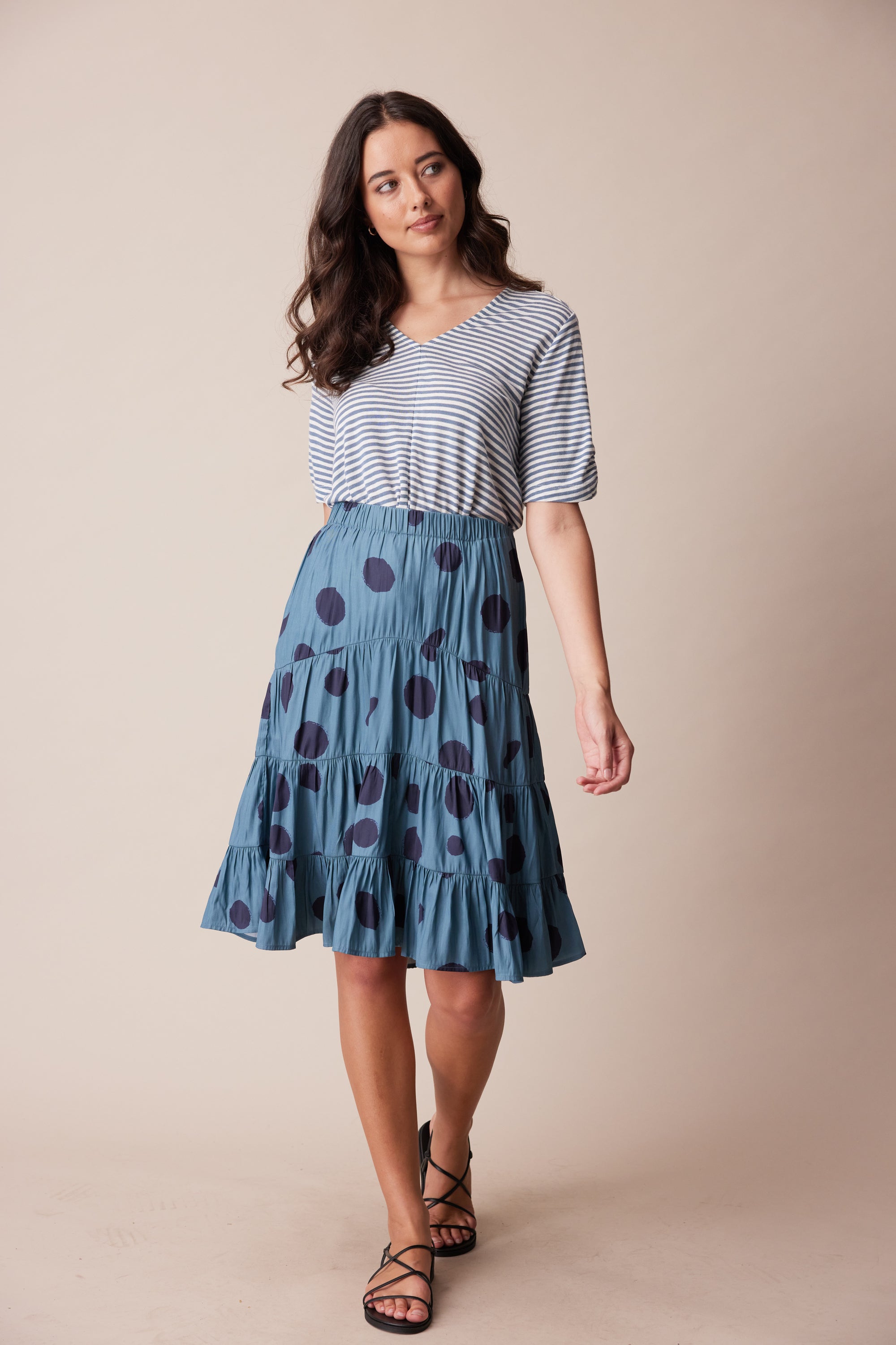 A tiered skirt with soft gathers through panel seams and elasticated waist. The irregular spot print adds character to this wardrobe staple.