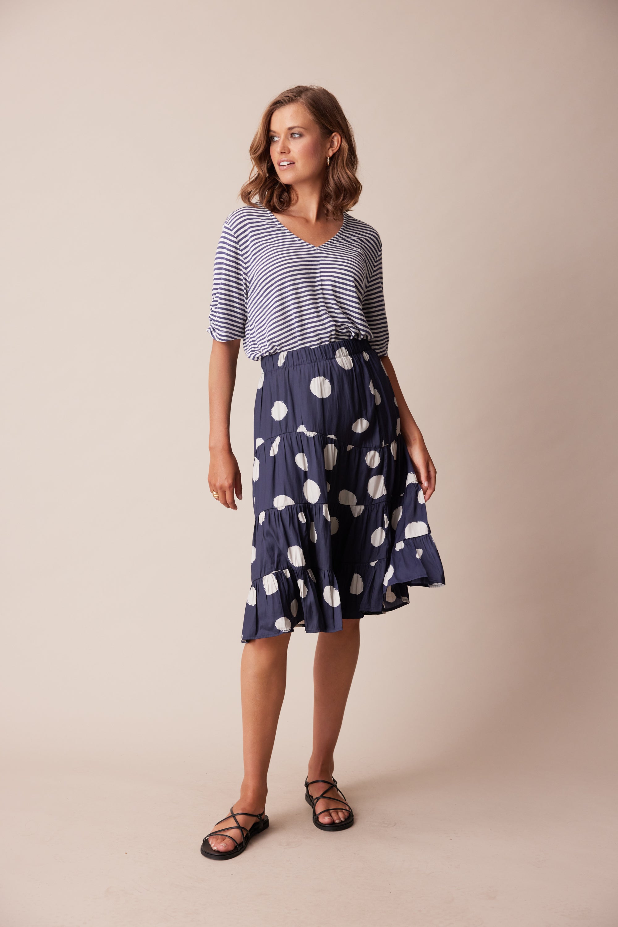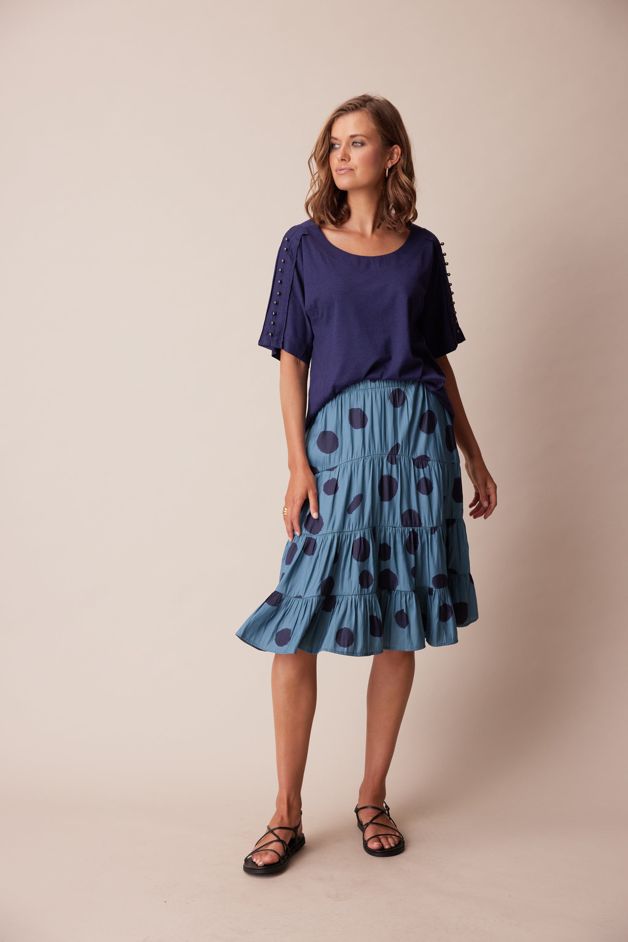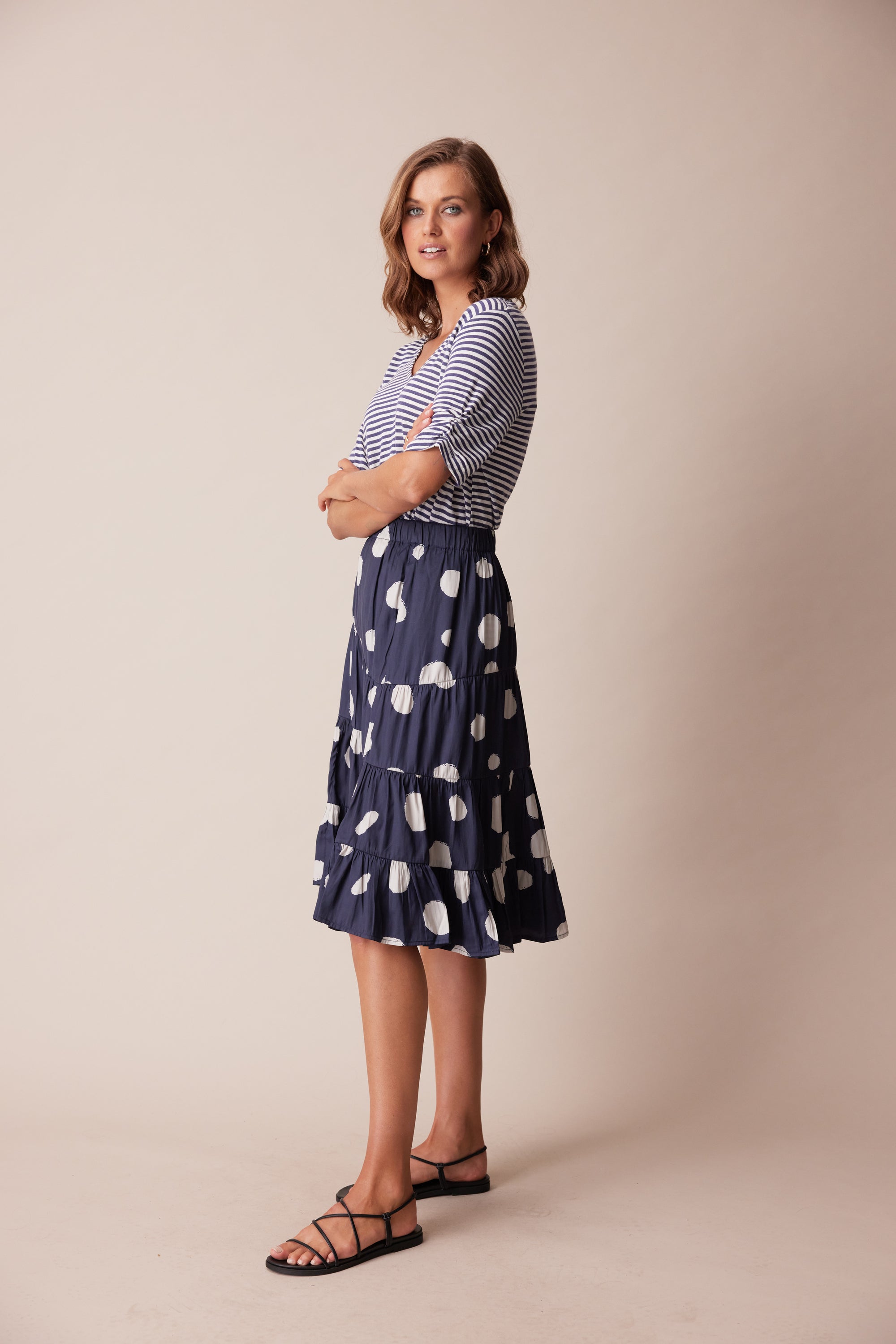 A tiered skirt with soft gathers through panel seams and elasticated waist. The irregular spot print adds character to this wardrobe staple.