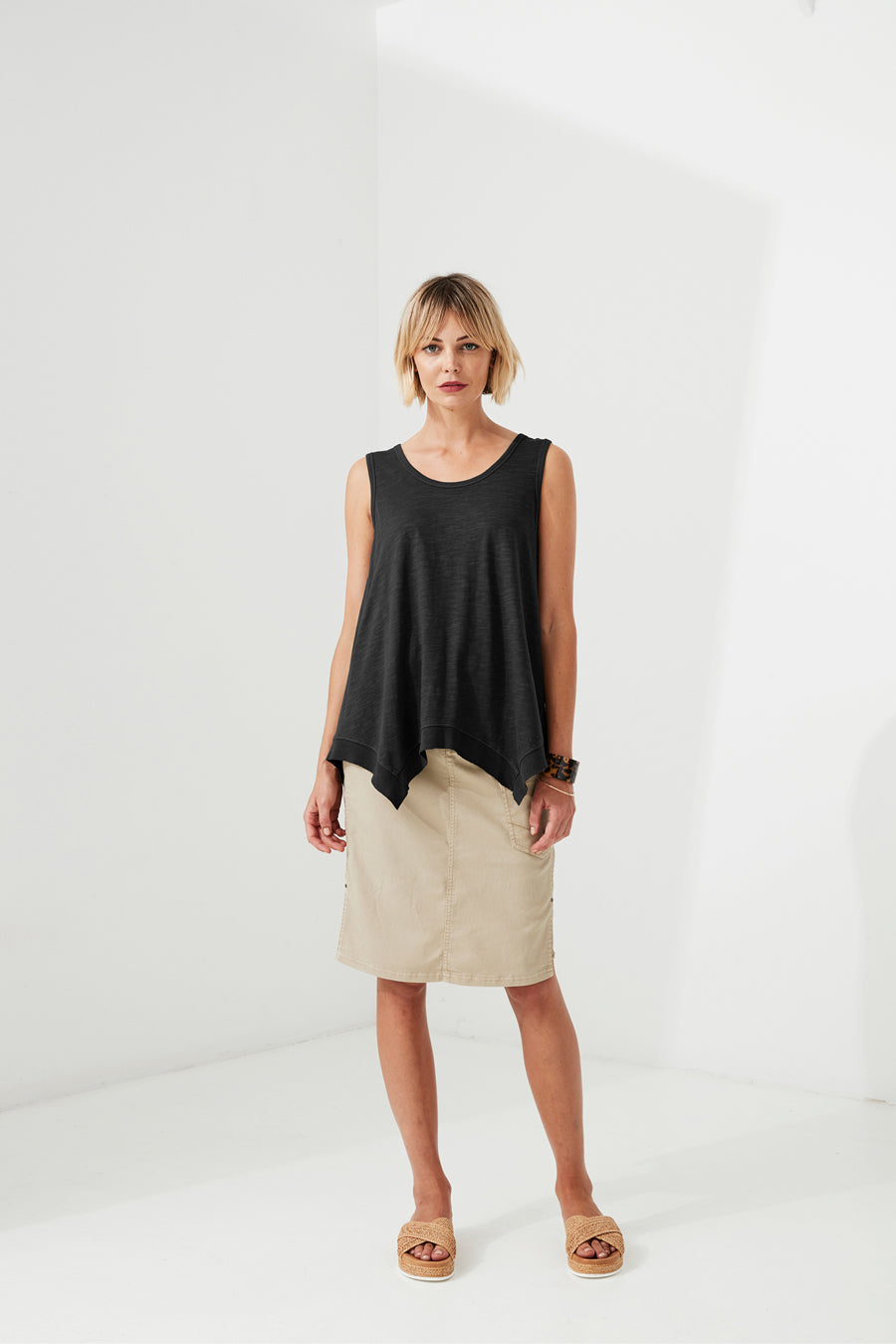 Soft handle 100% slub cotton, easy wear tank, featuring hi-lo raw edge rib hemline. Slightly distressed finish is achieved by special garment wash.