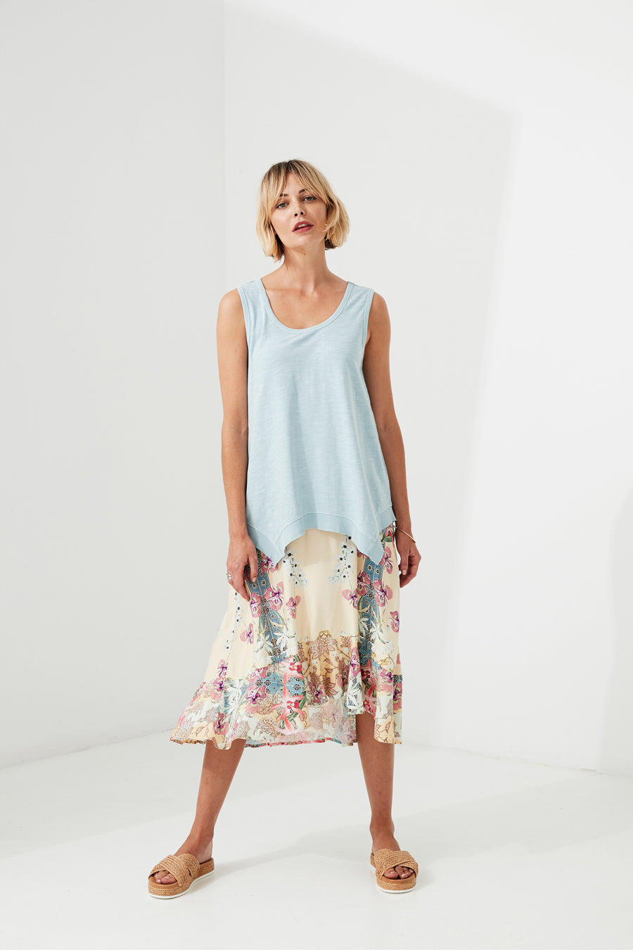 Soft handle 100% slub cotton, easy wear tank, featuring hi-lo raw edge rib hemline. Slightly distressed finish is achieved by special garment wash.
