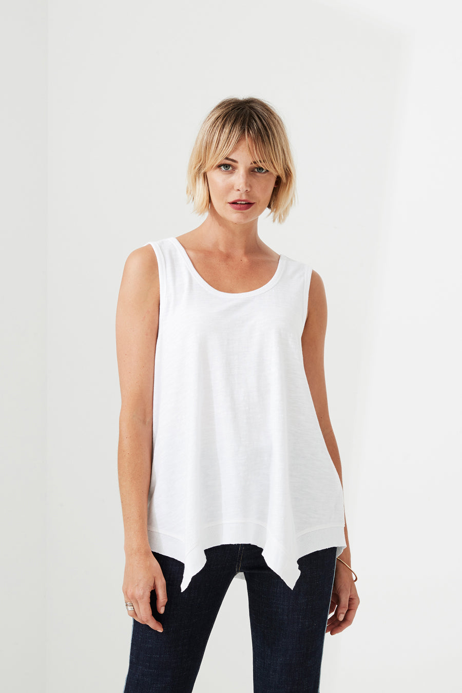 Soft handle 100% slub cotton, easy wear tank, featuring hi-lo raw edge rib hemline. Slightly distressed finish is achieved by special garment wash.