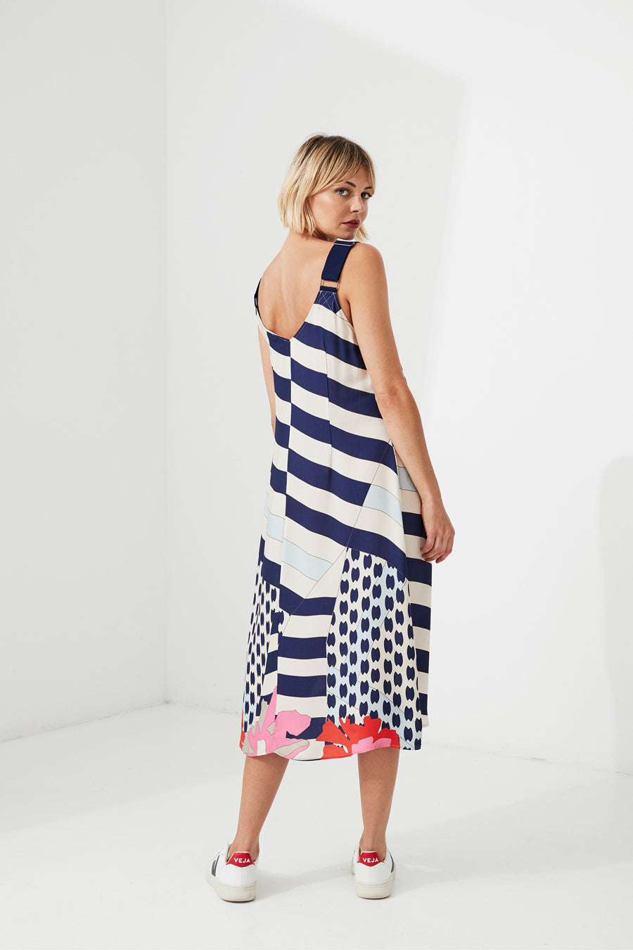 Featuring the bold molten print, simple styling with versatile feature, adjustable straps, ending at the mid-calf, perfect for a summers day.