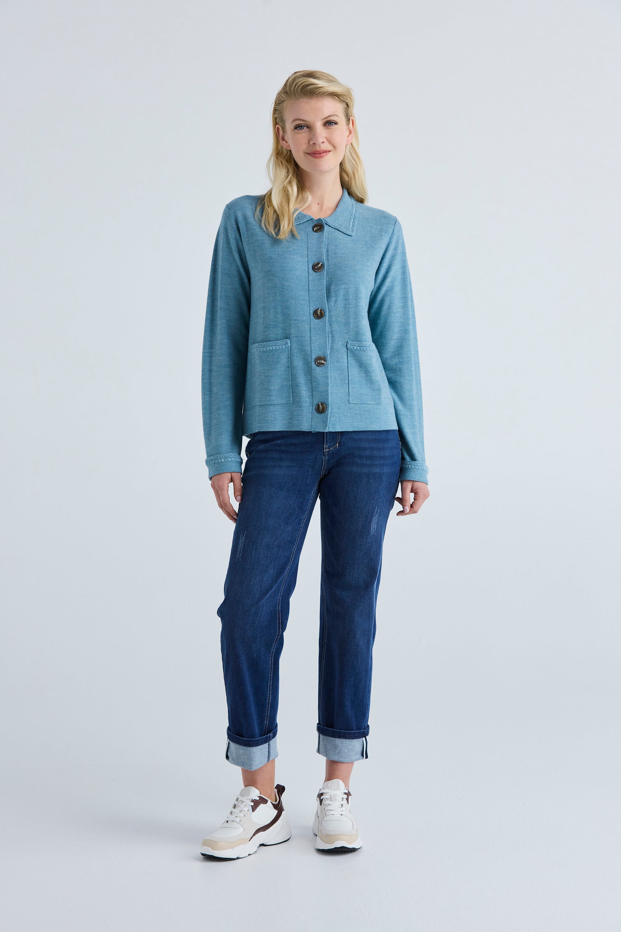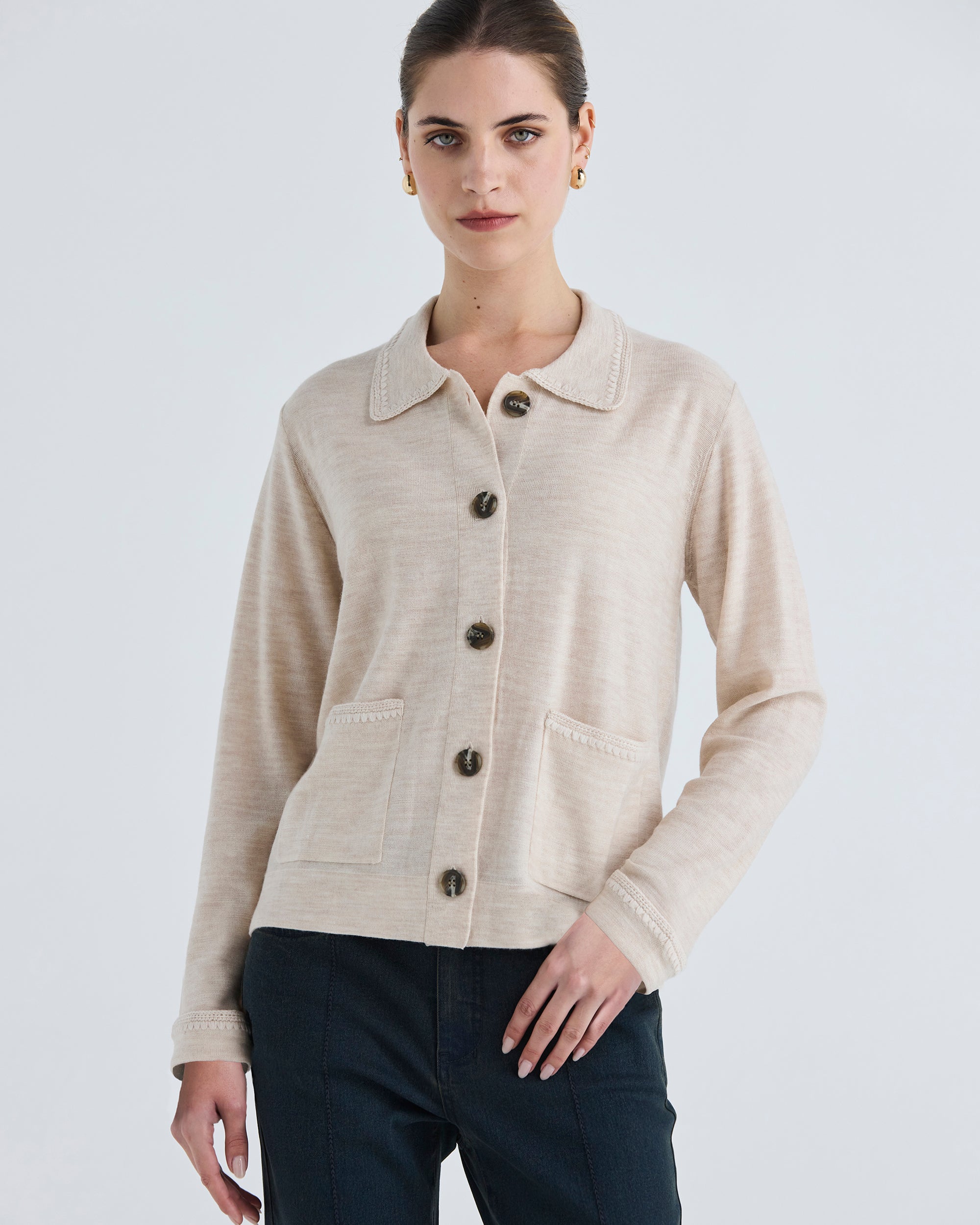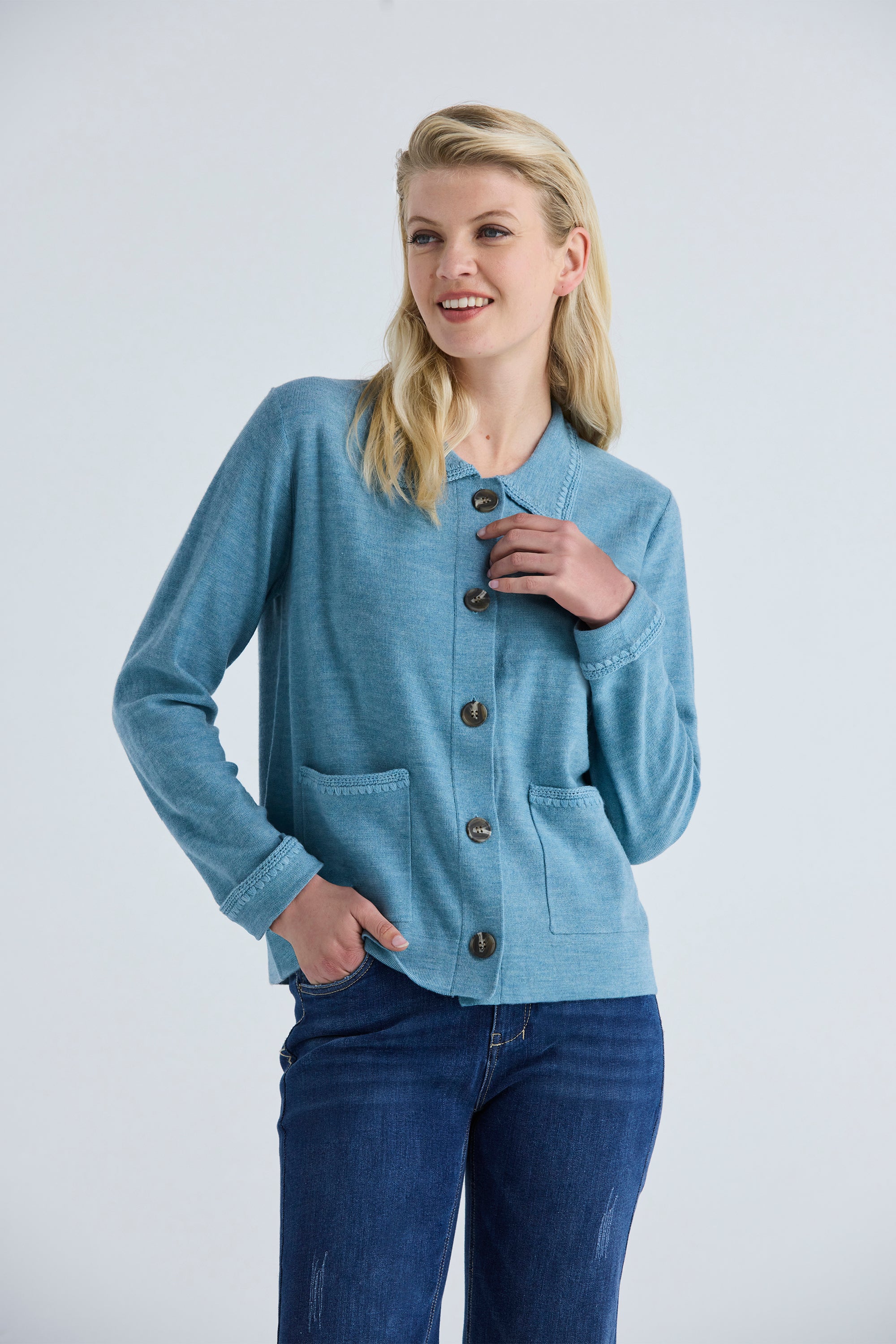 The Natalie Jacket is a merino wool knitted cardigan-style piece crafted in a marled reverse knit construction. With a collared neckline, front patch pockets, and rolled cuffs featuring embroidered edges, this jacket offers endless winter layering opportunities and a charming touch to your outfit.
