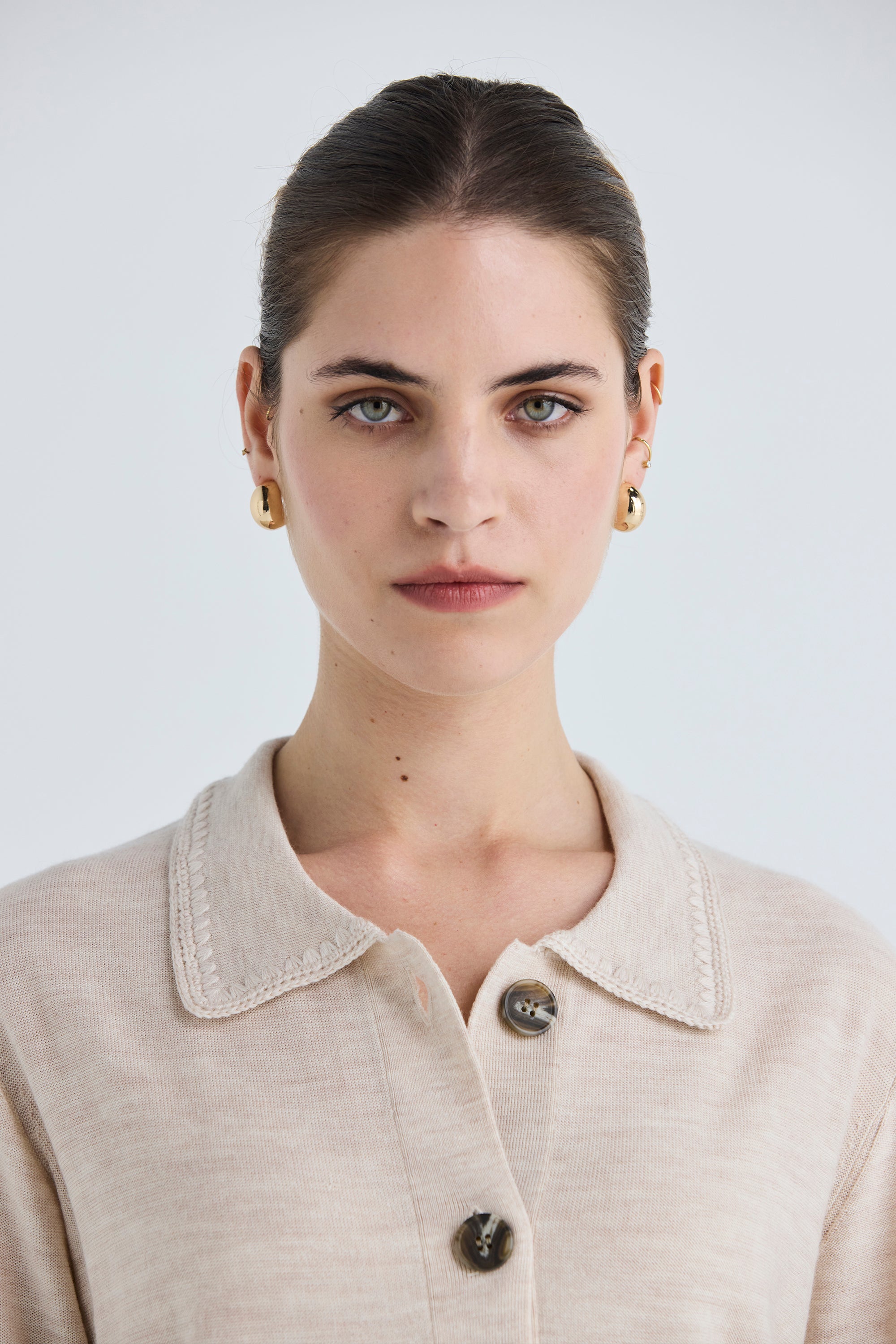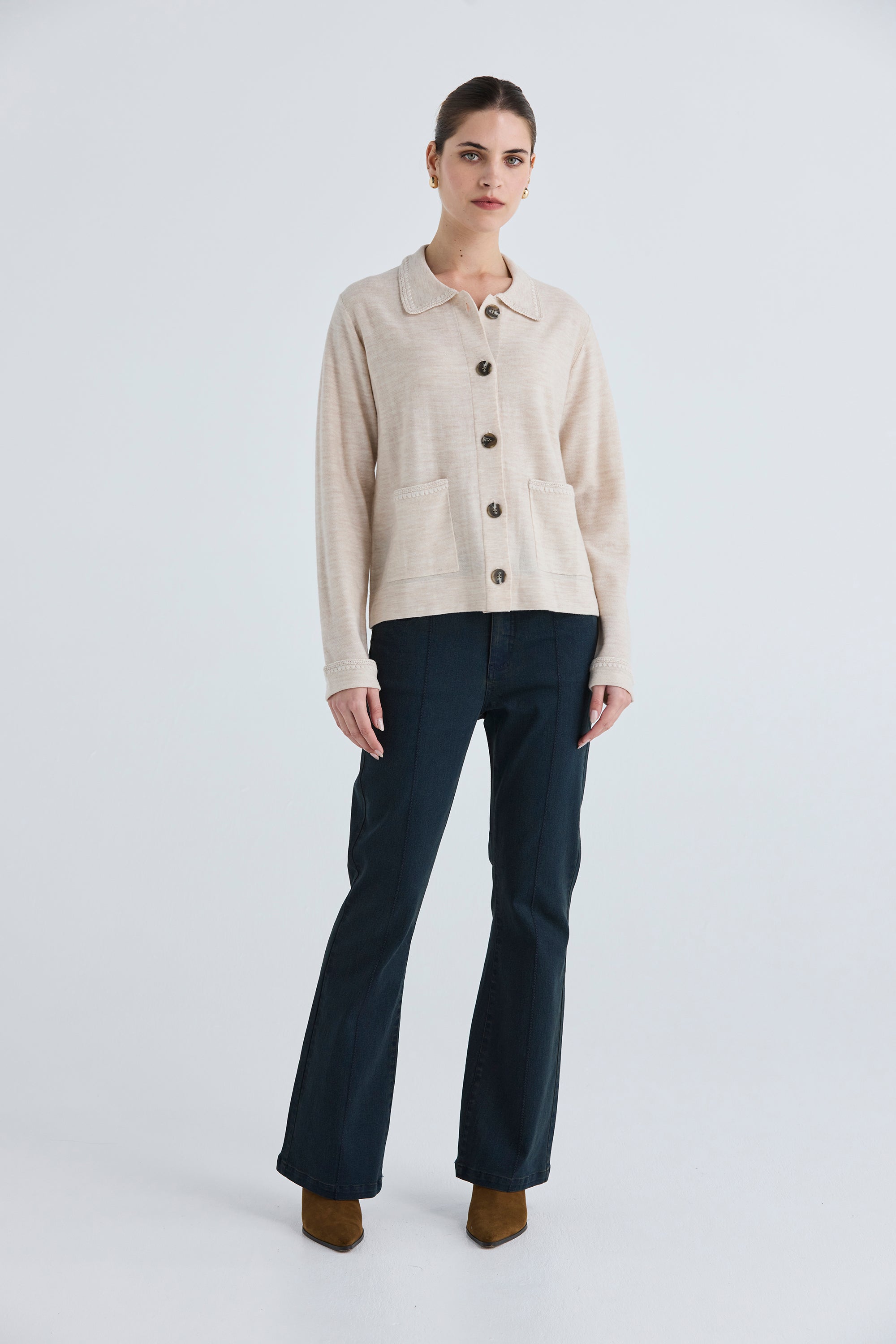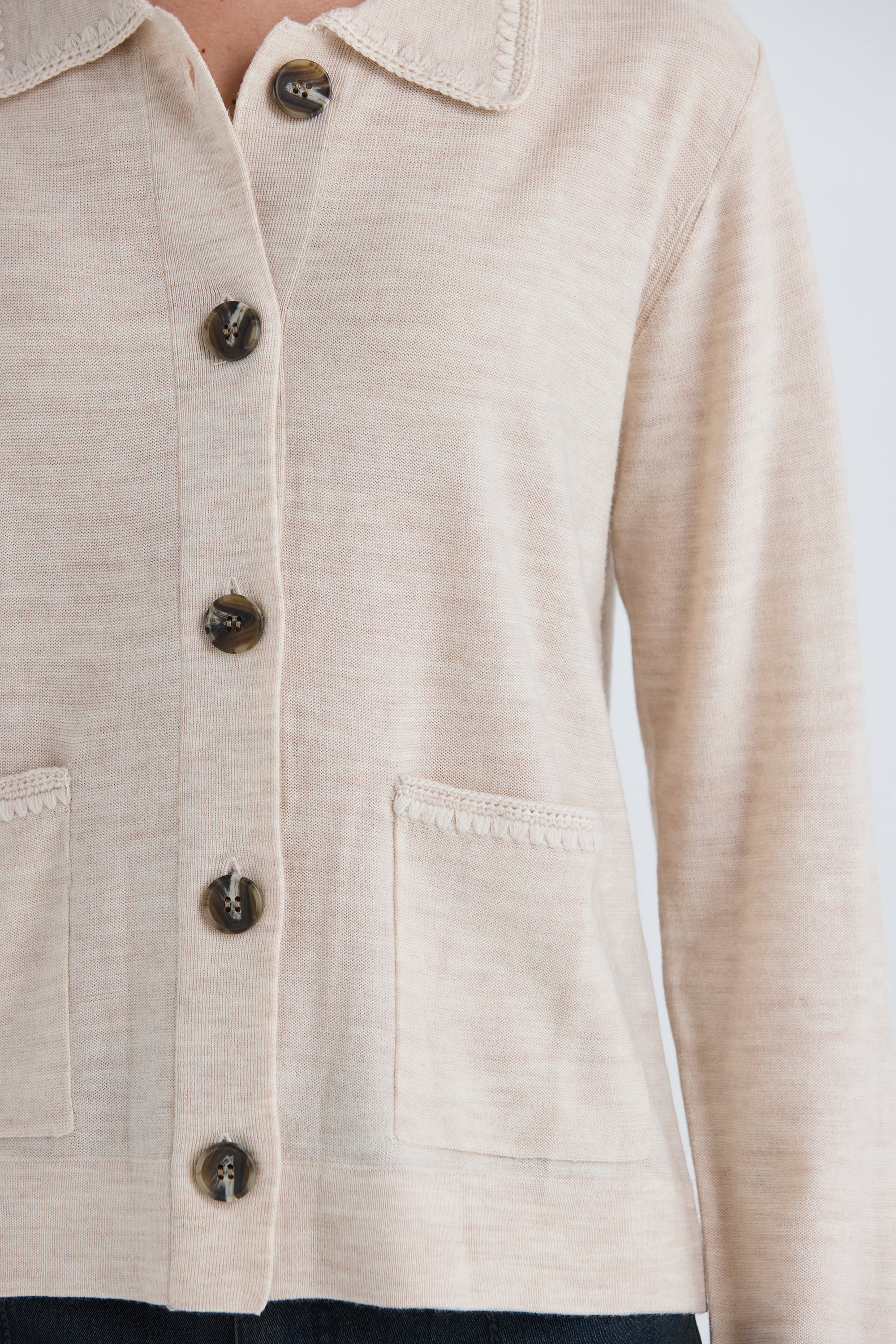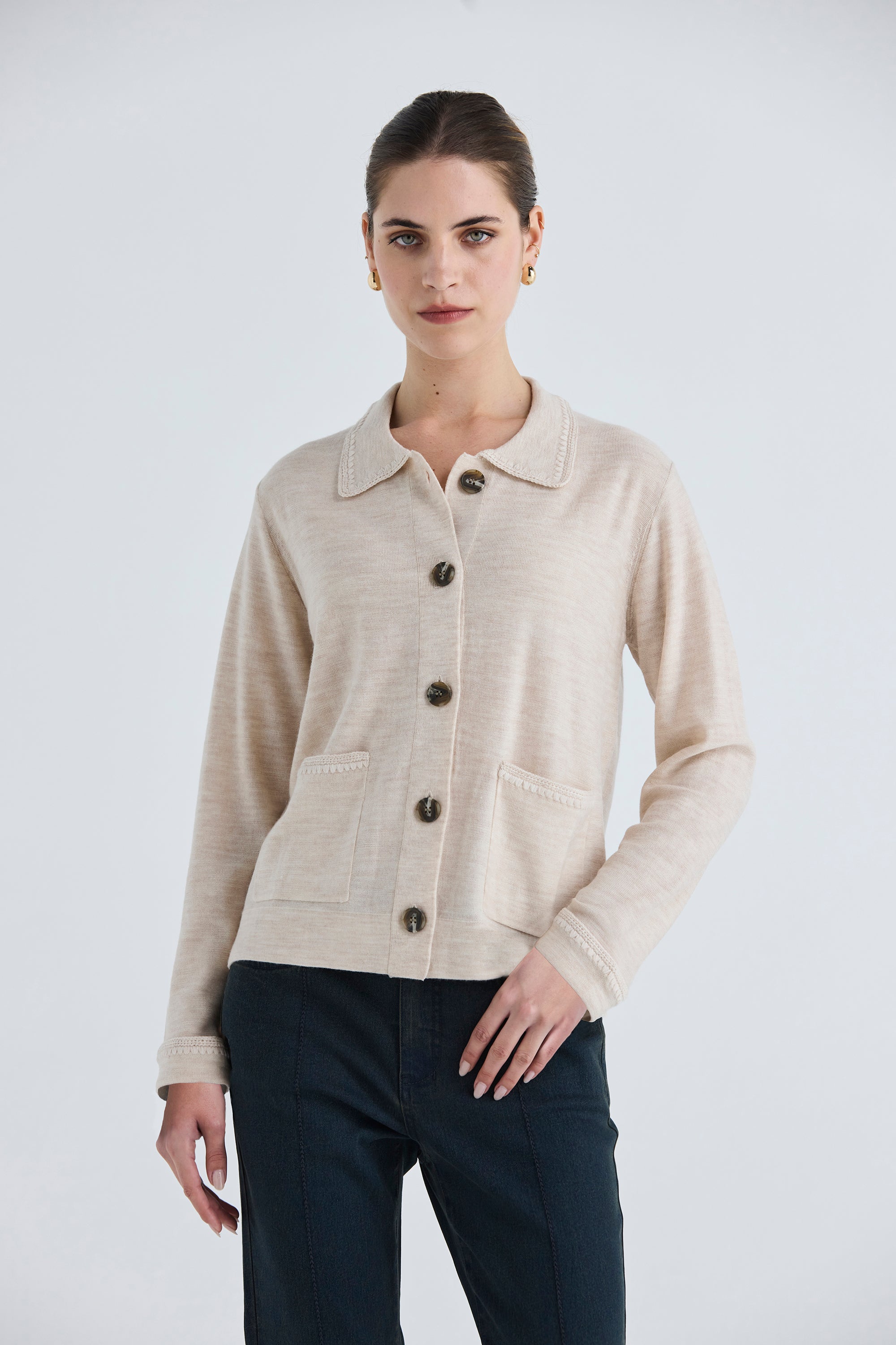 The Natalie Jacket is a merino wool knitted cardigan-style piece crafted in a marled reverse knit construction. With a collared neckline, front patch pockets, and rolled cuffs featuring embroidered edges, this jacket offers endless winter layering opportunities and a charming touch to your outfit.