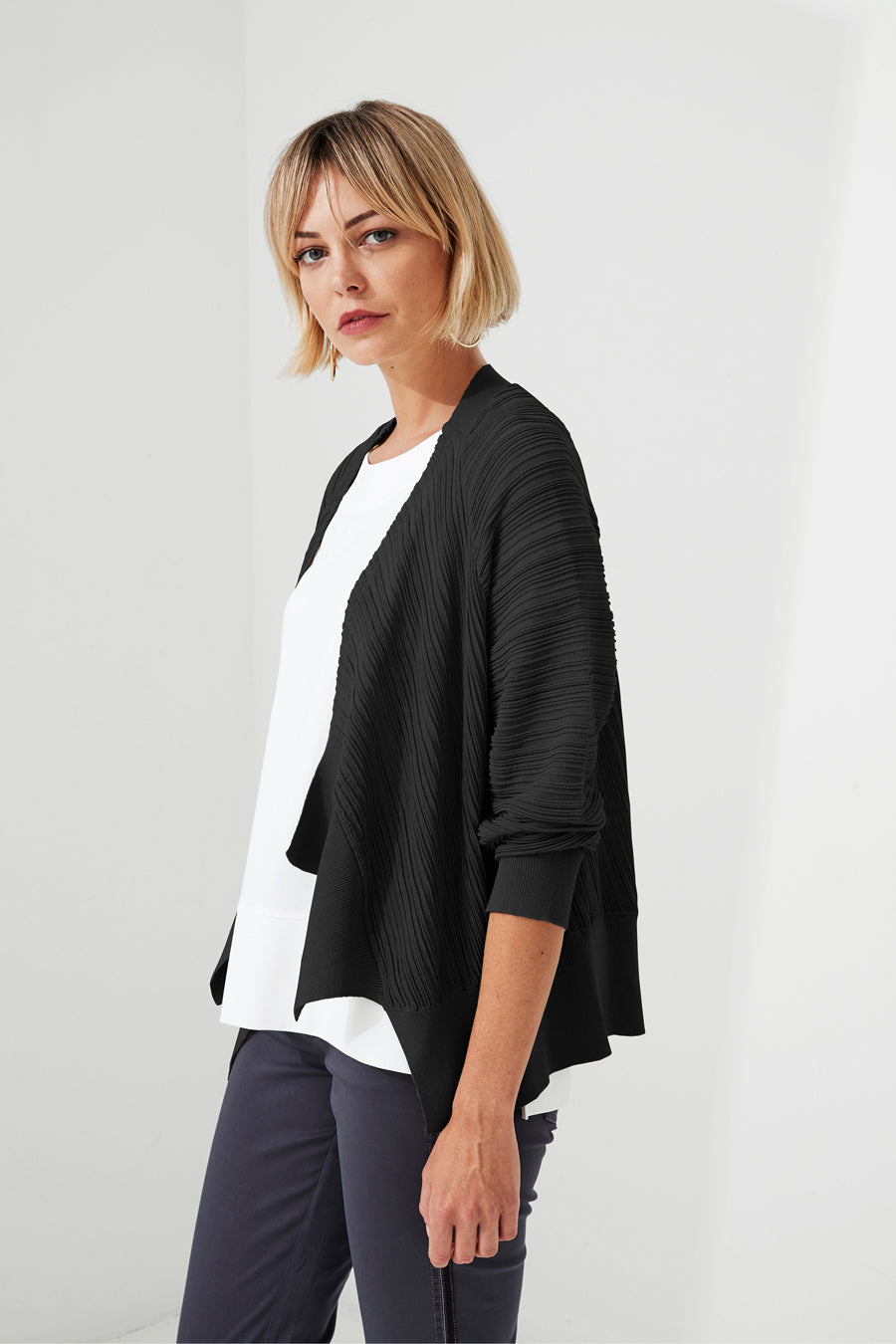 Waterfall neckline with drape front, featuring ribbed, cotton blend knitwear, raglan armhole and full length sleeve with split cuff.
