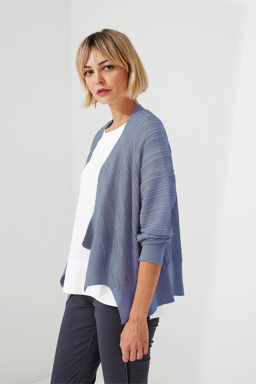 Waterfall neckline with drape front, featuring ribbed, cotton blend knitwear, raglan armhole and full length sleeve with split cuff.