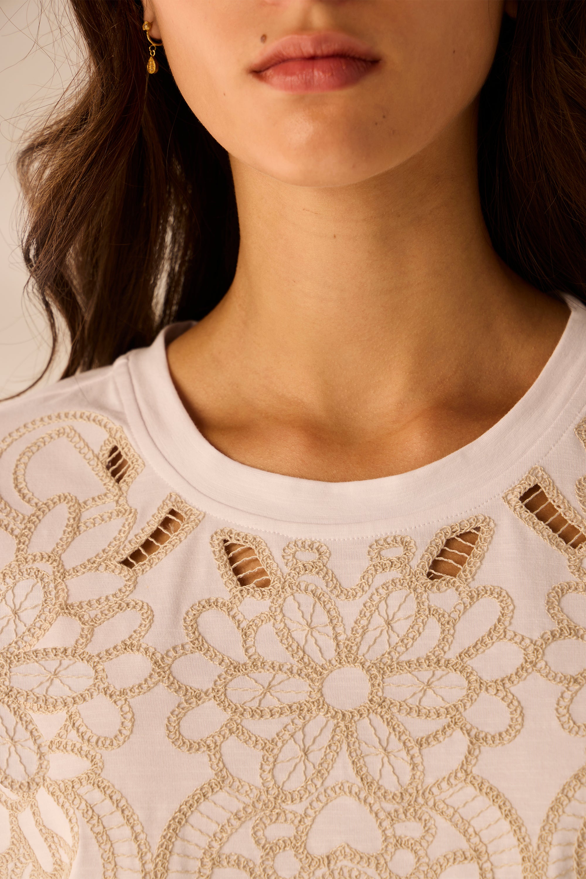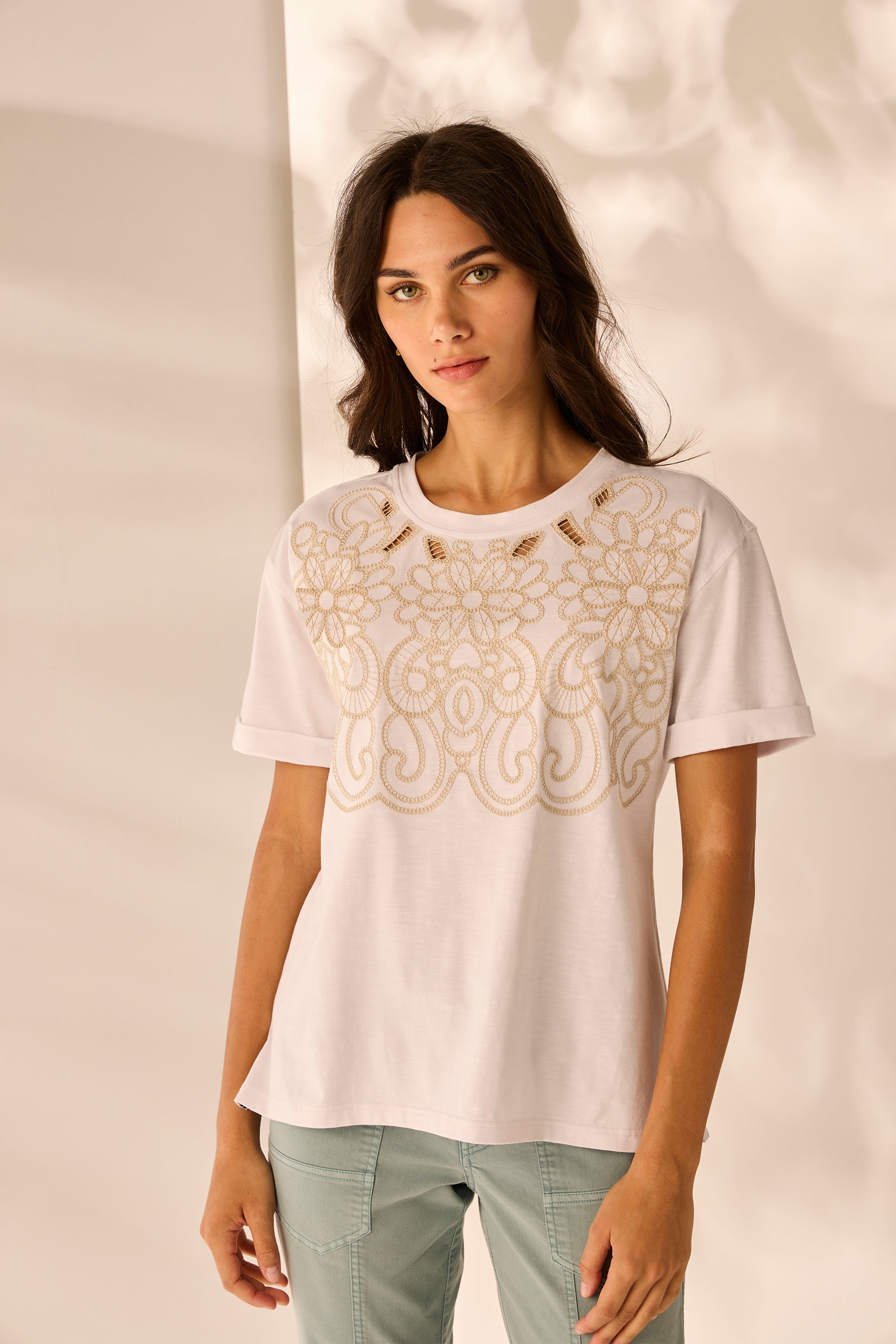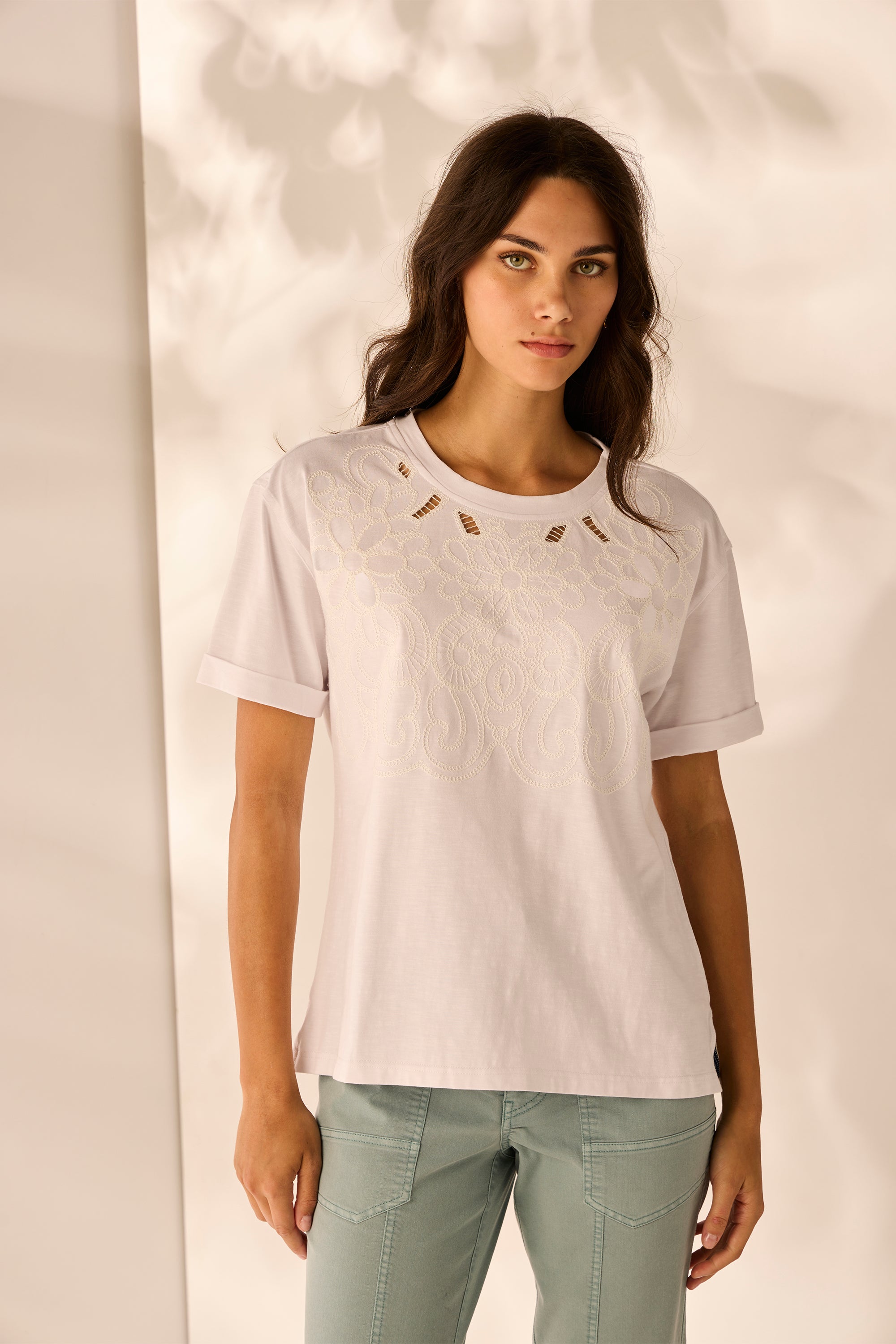 Step into chic simplicity with the Notion Top, featuring a detailed embroidery on the front with cut outs. Effortlessly stylish and easy to wear, this top is perfect for everyday comfort with a hint of elegance.