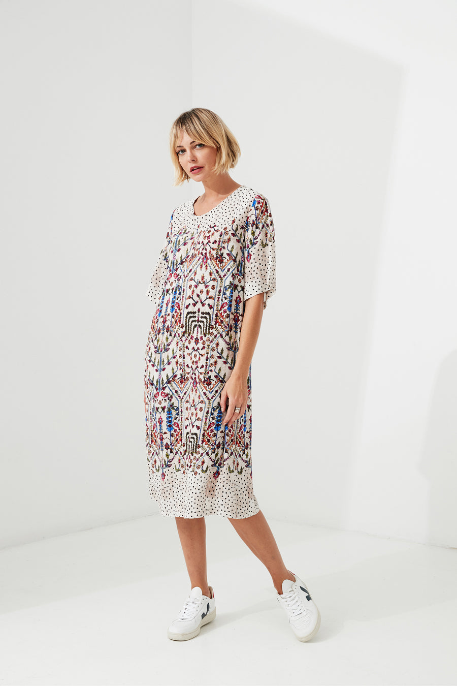 This dress features a simple floaty skirt ending at the knee with dot print featured across the shoulder and short sleeves. The perfect pop to your wardrobe with this dazzling Oasis print and dot mix.