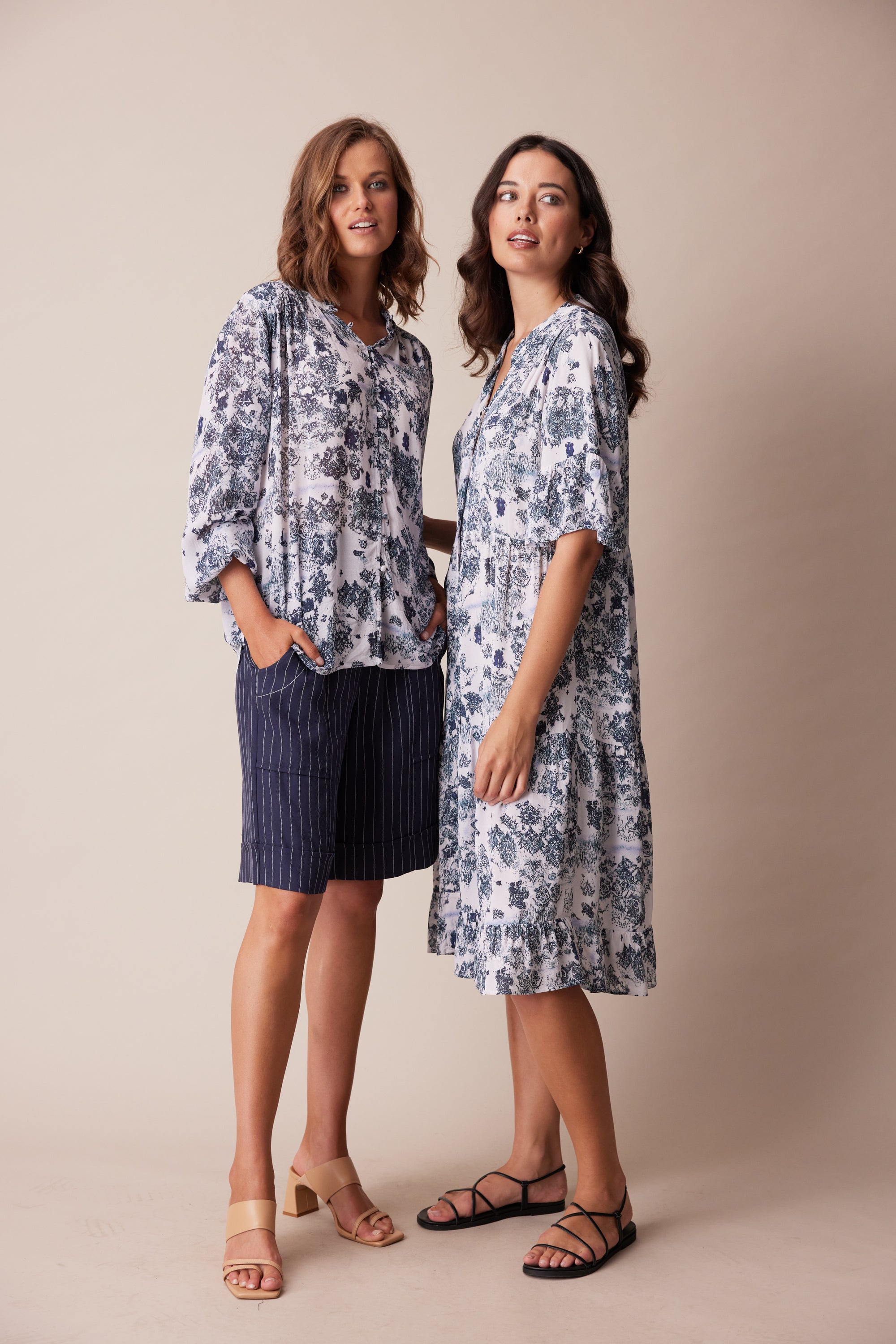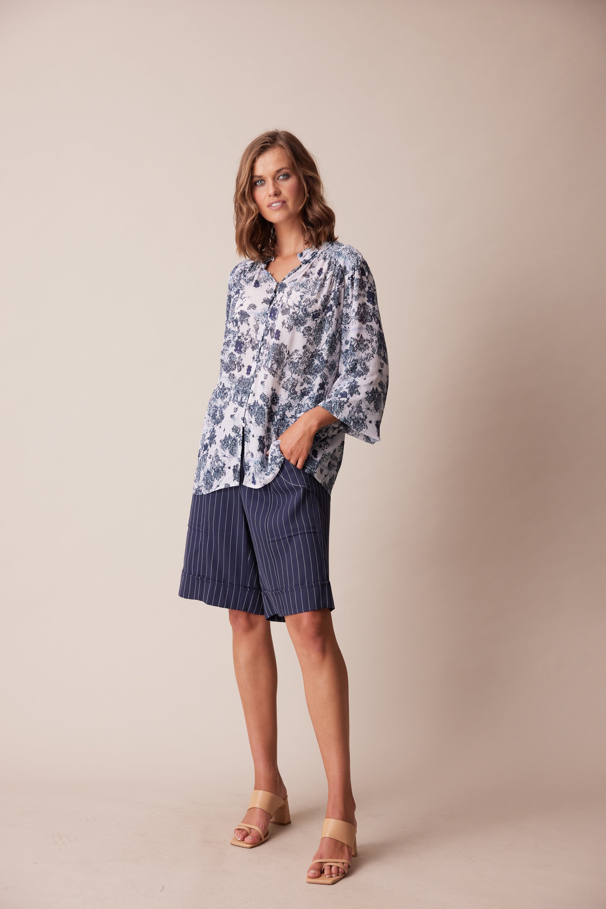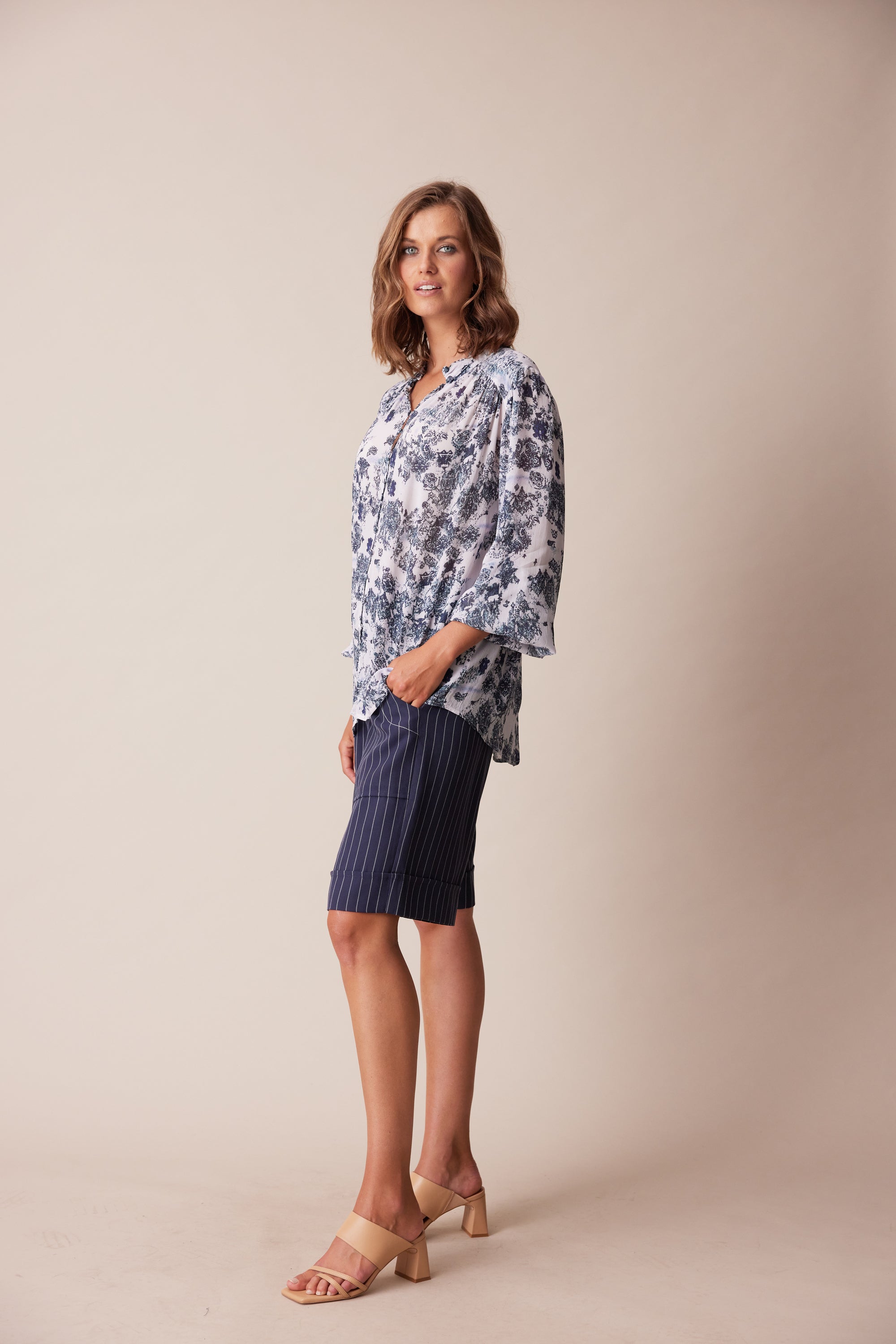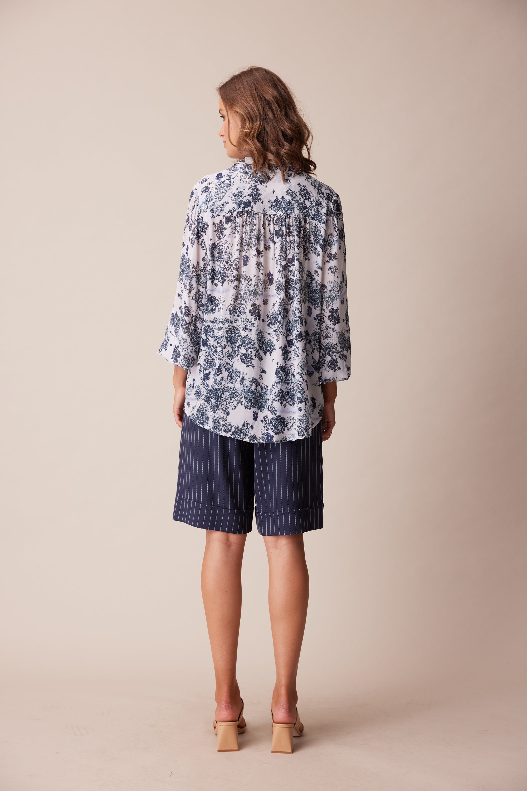 The Olsen Shirt is in an ornate print, enhanced by softly gathered yoke seams and pleated stand collar; centre front placket with covered button and rouleaux loop fastenings; full sleeve with elasticated cuff. The curved hem completes the flattering silhouette - the perfect way to add style & elegance to your look.