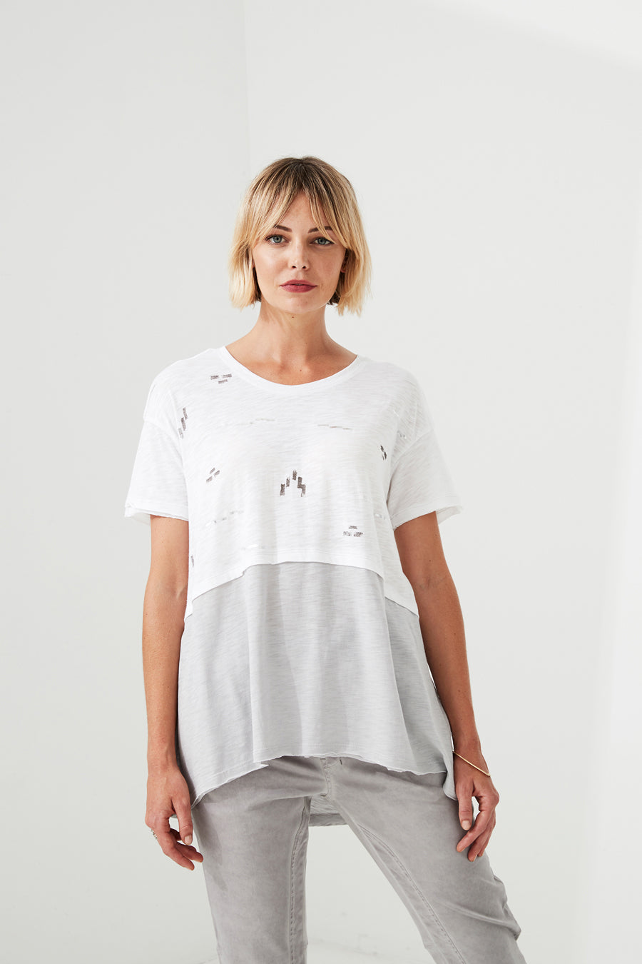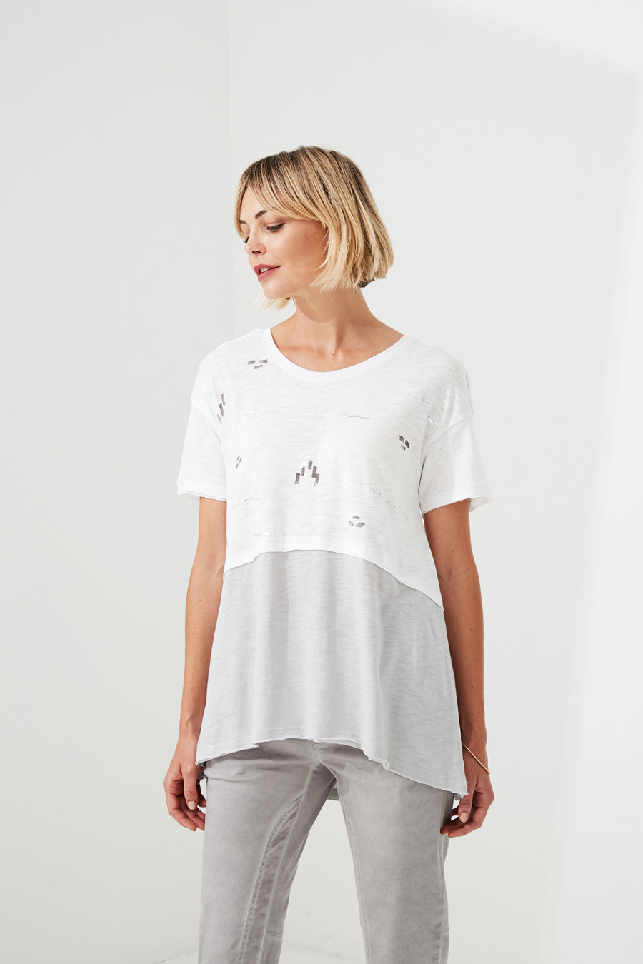 A classic cotton blend top featuring contrast hem panel and iconic foil screen print.