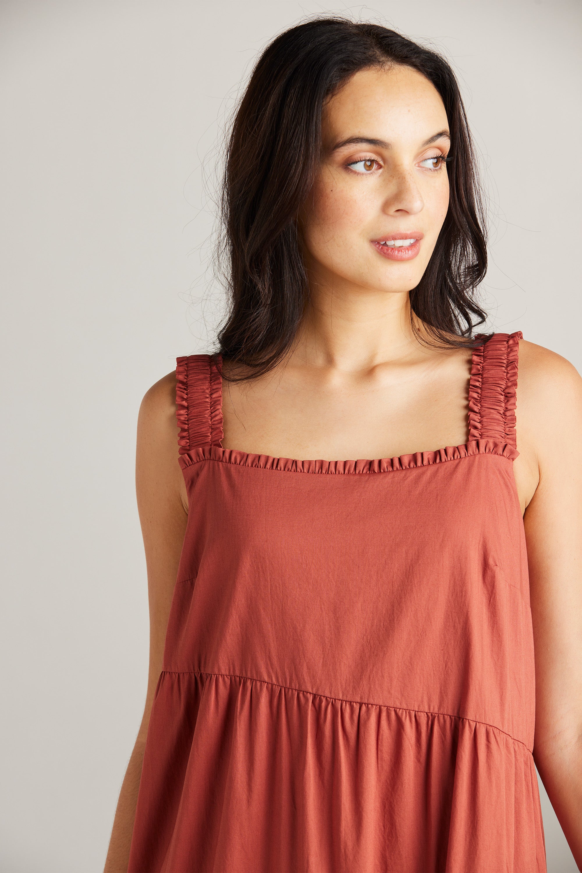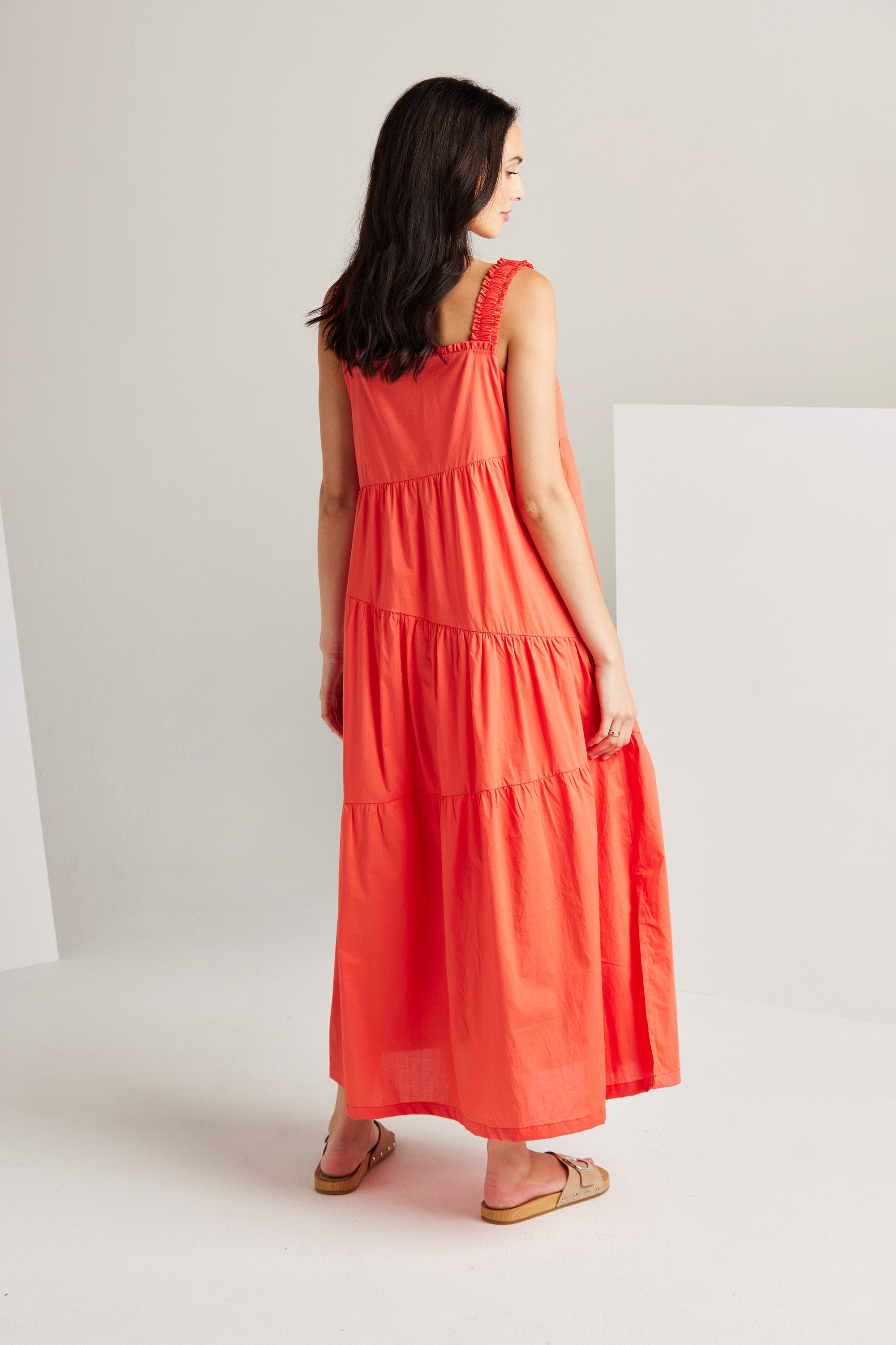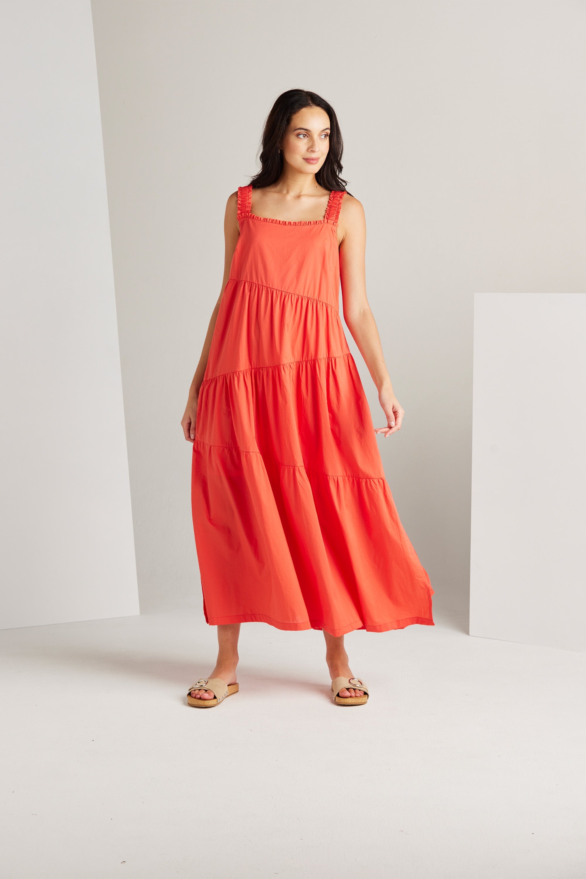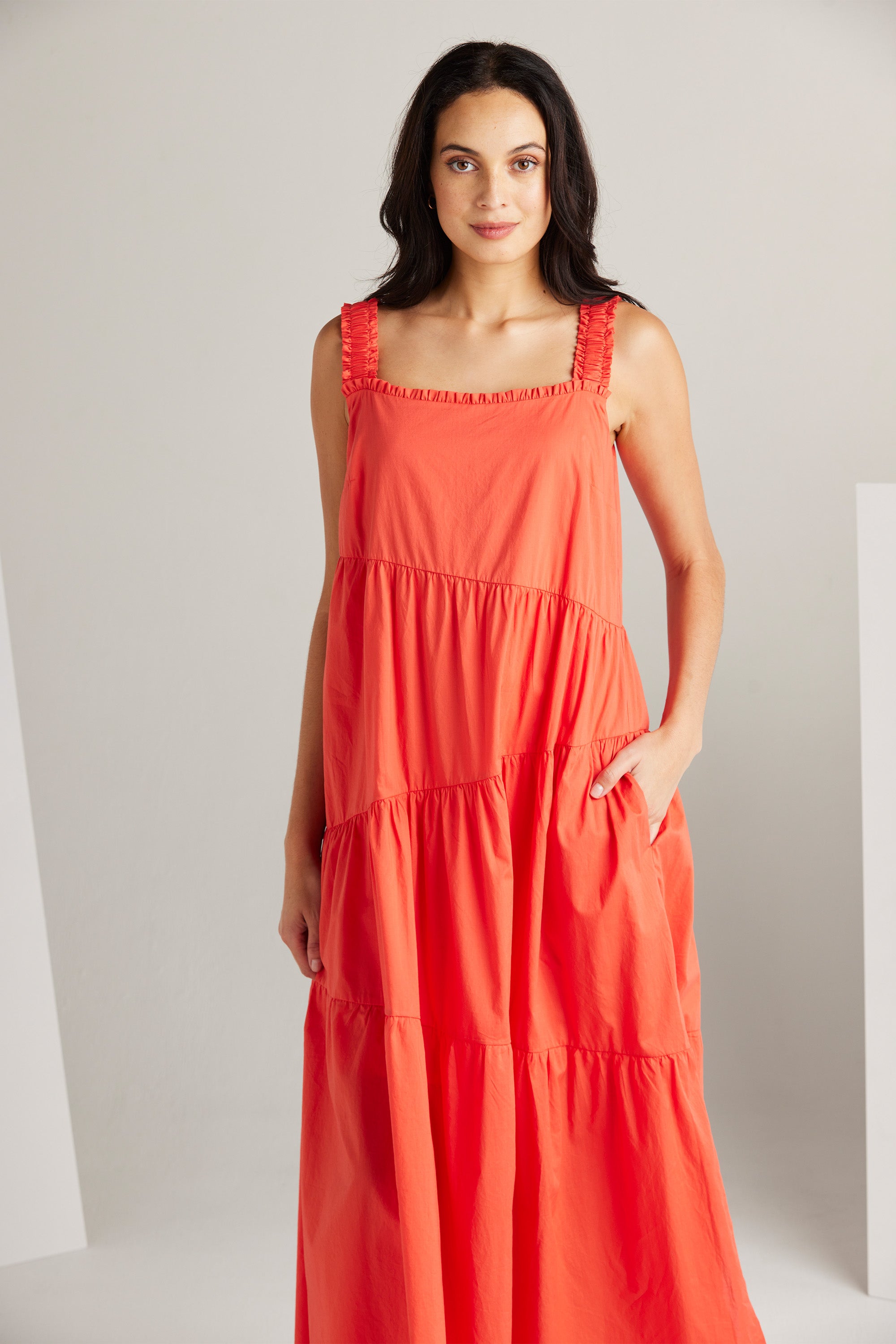 The Paige dress is an expression of sophistication and femininity. Crafted from a lightweight cotton voile, this dress features asymmetric panels and delicate gathers across the skirt, resulting in a flattering A-line silhouette. Wide elasticated shoulder straps and an enchanting frill detail on the neckline, add a touch of allure to this graceful and timeless piece.