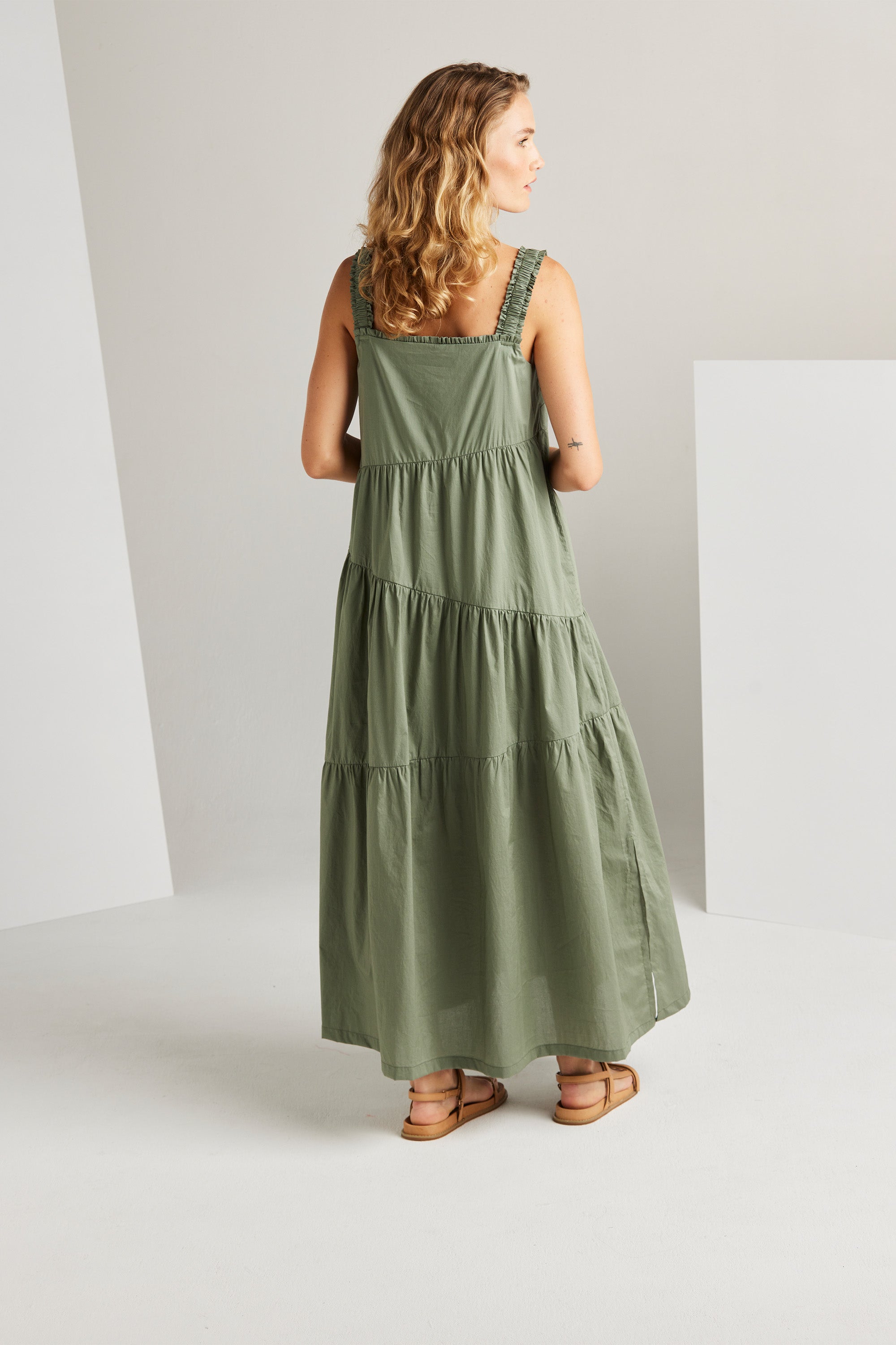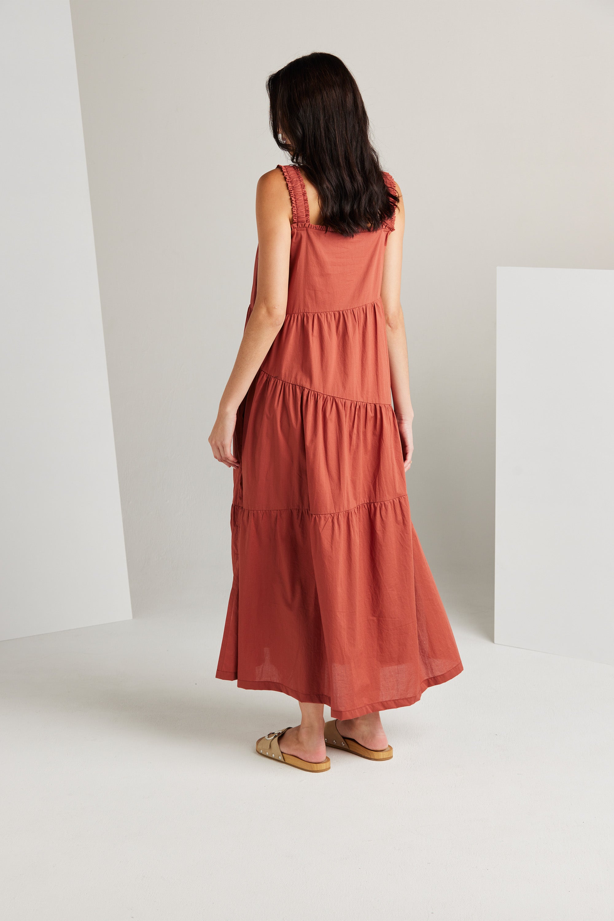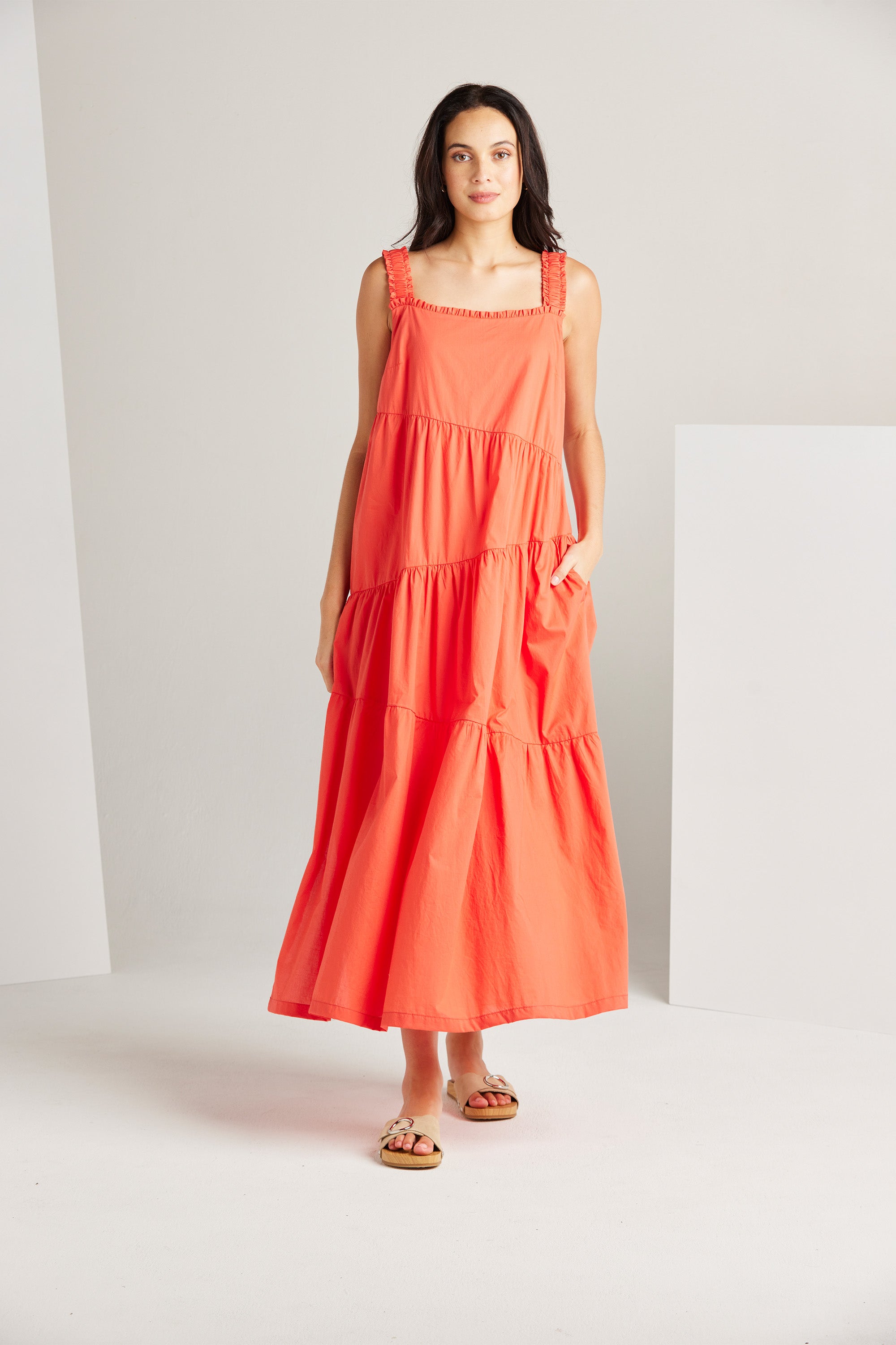 The Paige dress is an expression of sophistication and femininity. Crafted from a lightweight cotton voile, this dress features asymmetric panels and delicate gathers across the skirt, resulting in a flattering A-line silhouette. Wide elasticated shoulder straps and an enchanting frill detail on the neckline, add a touch of allure to this graceful and timeless piece.
