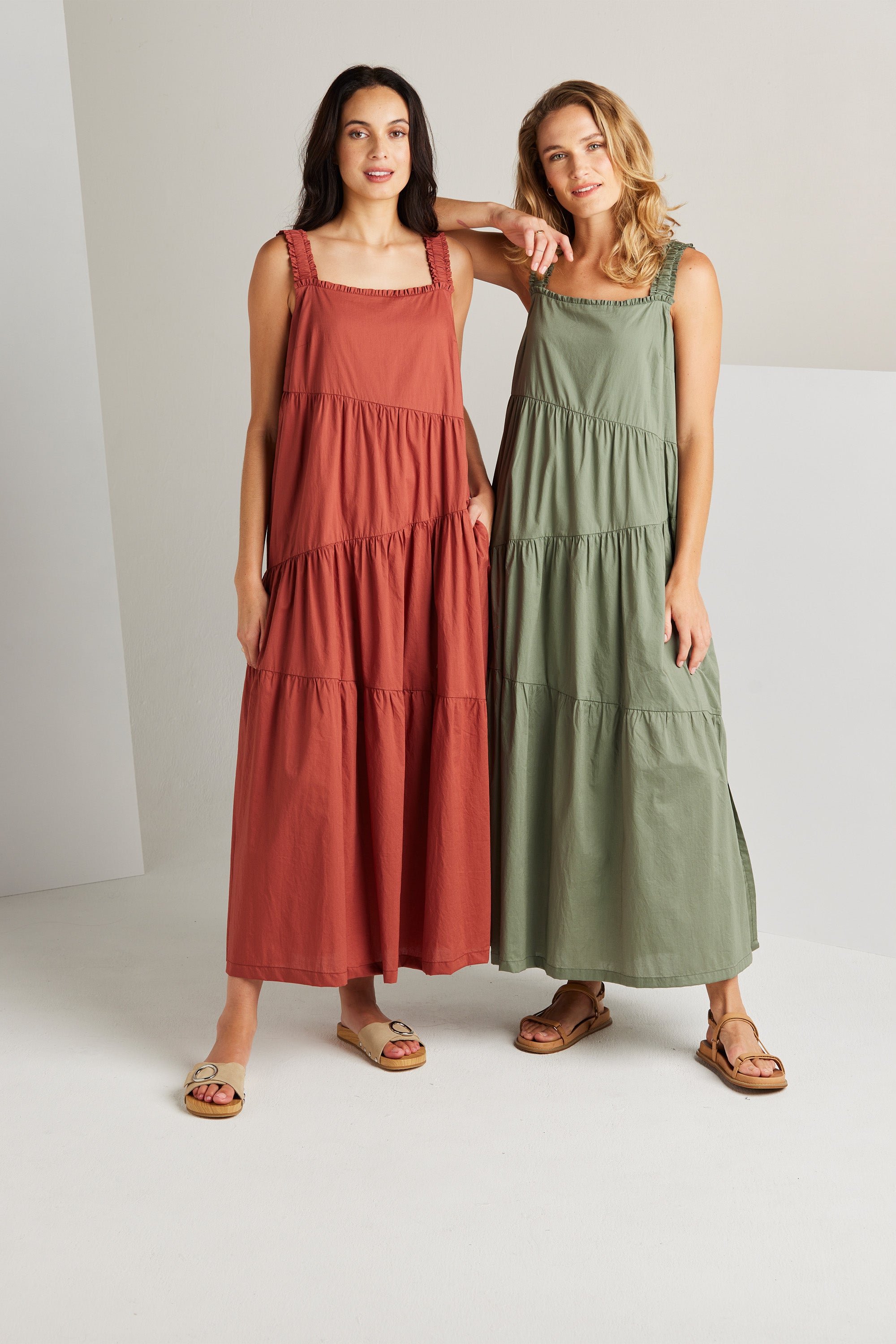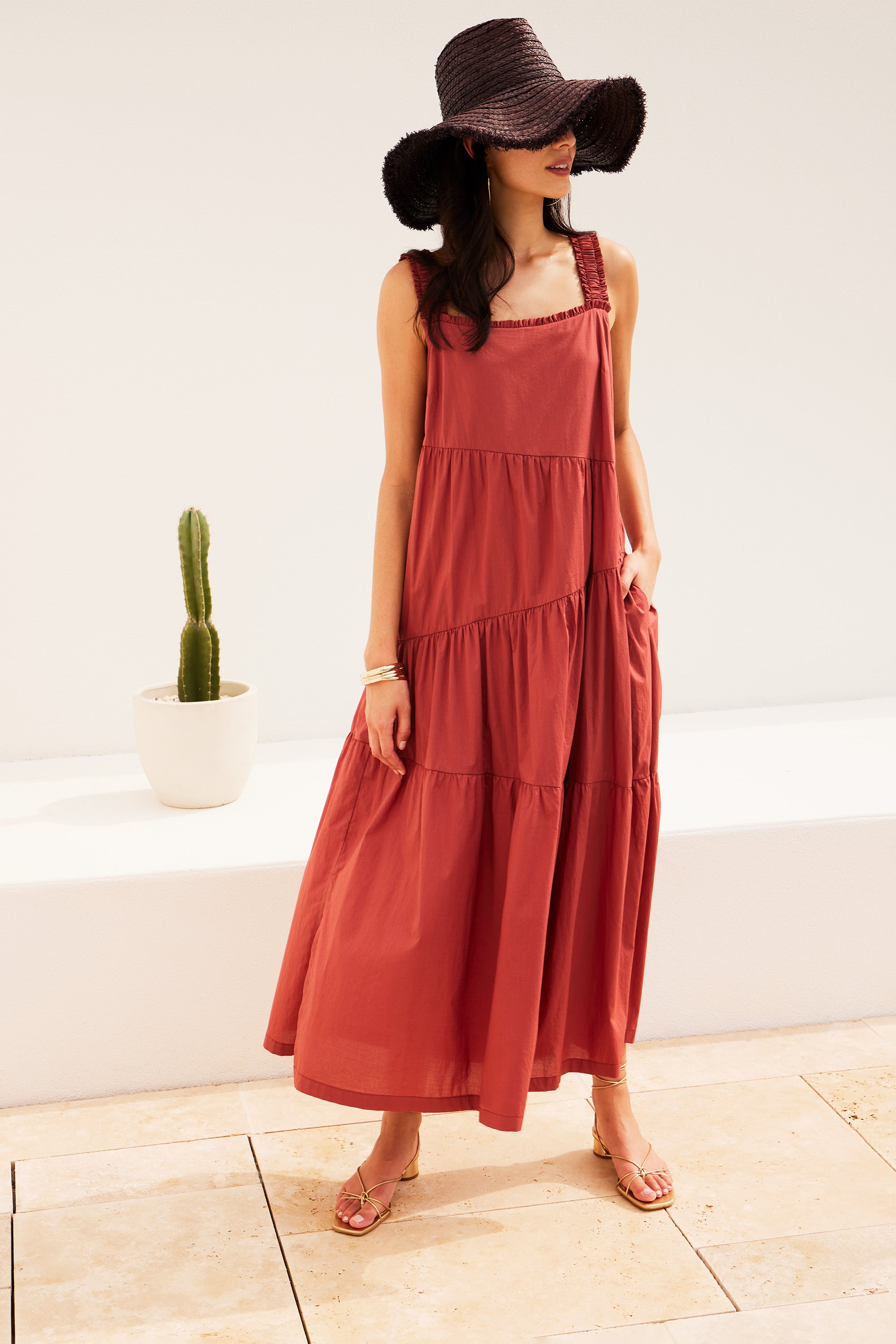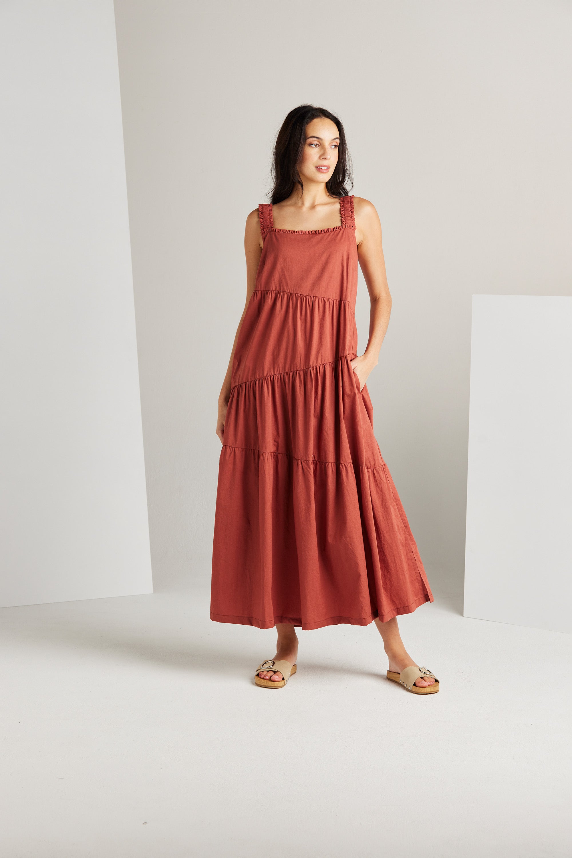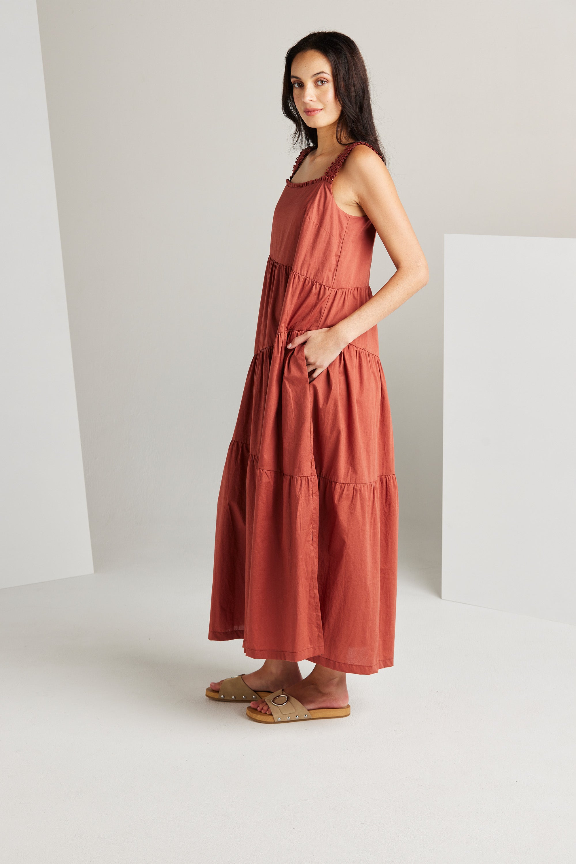The Paige dress is an expression of sophistication and femininity. Crafted from a lightweight cotton voile, this dress features asymmetric panels and delicate gathers across the skirt, resulting in a flattering A-line silhouette. Wide elasticated shoulder straps and an enchanting frill detail on the neckline, add a touch of allure to this graceful and timeless piece.