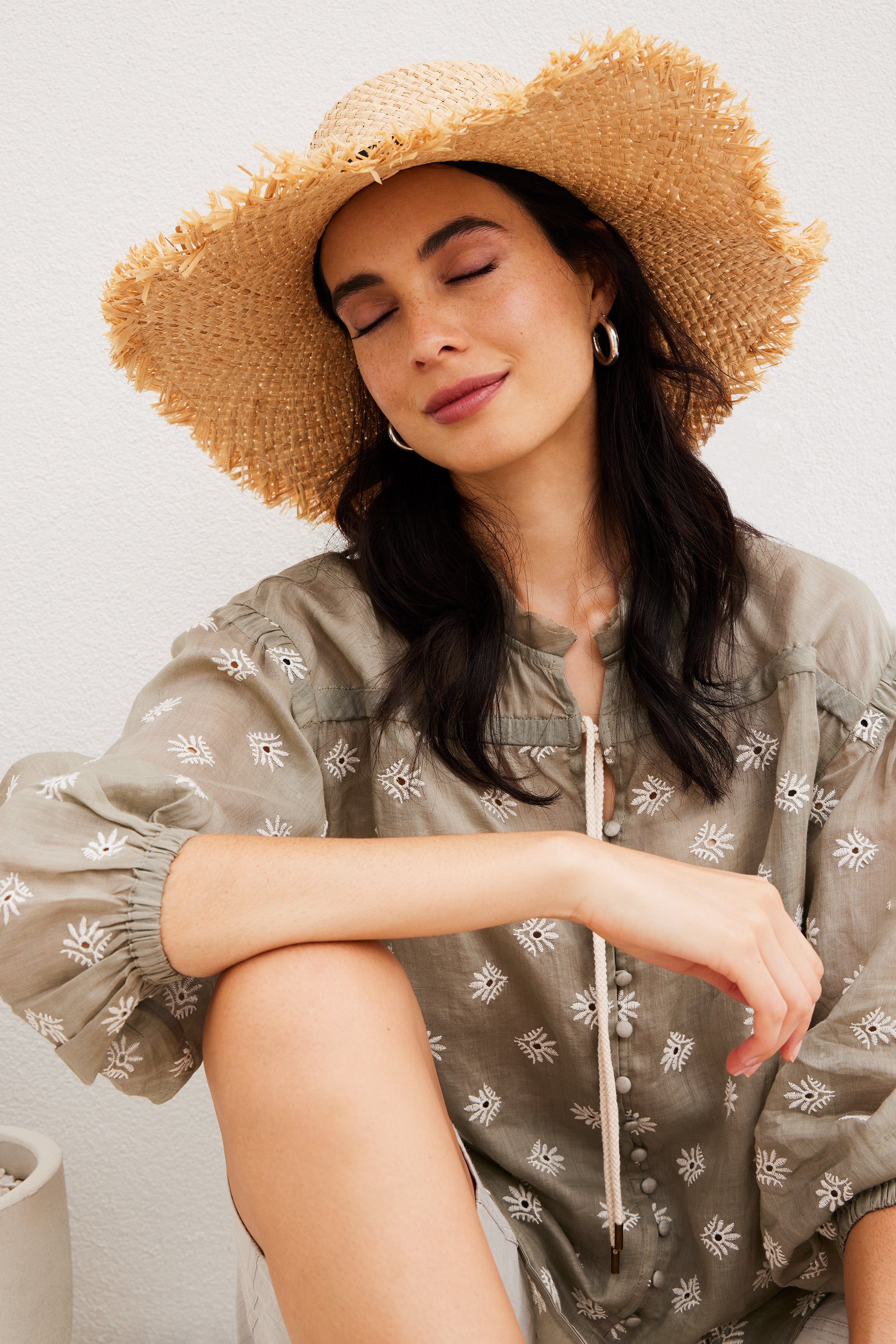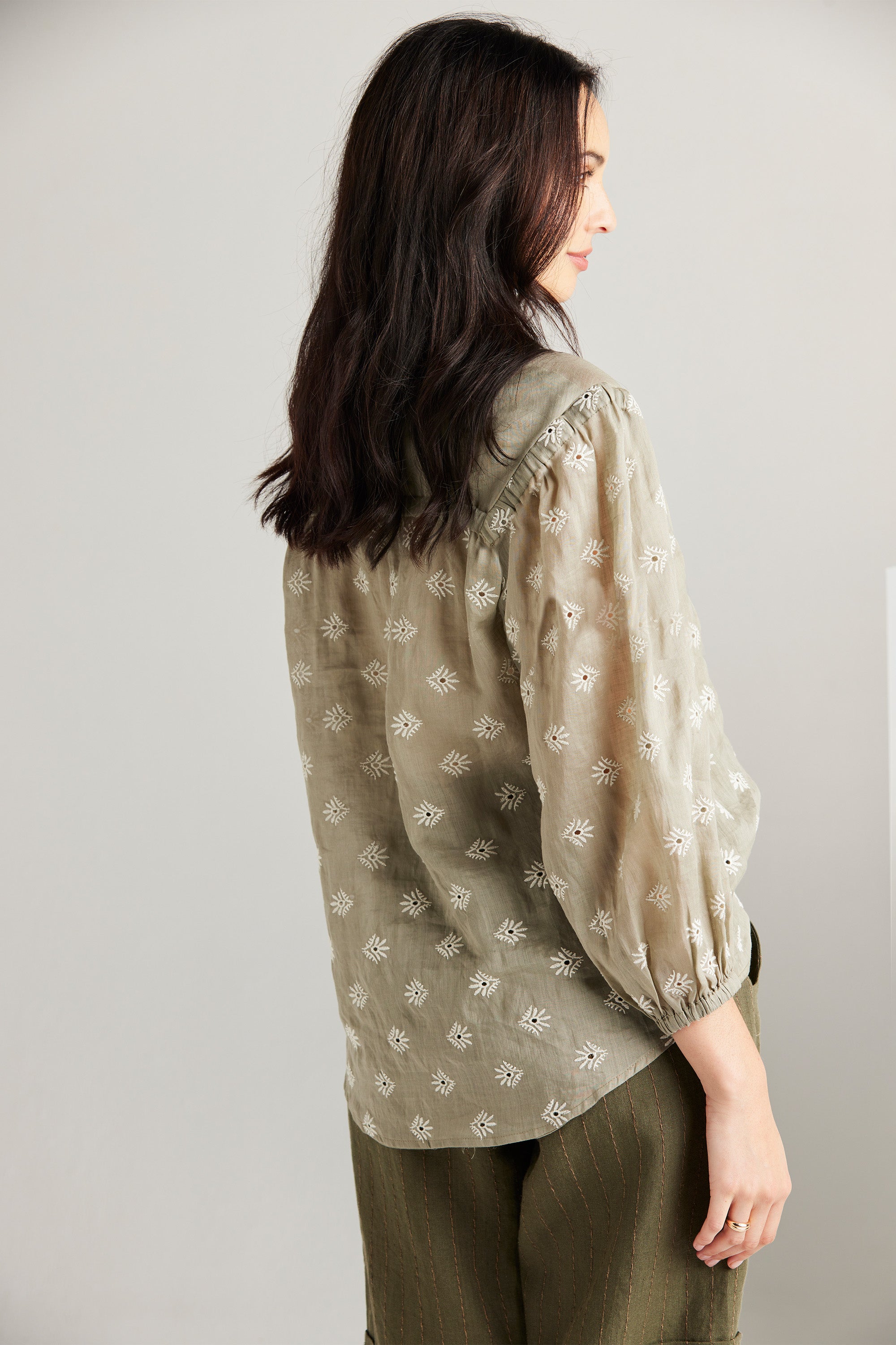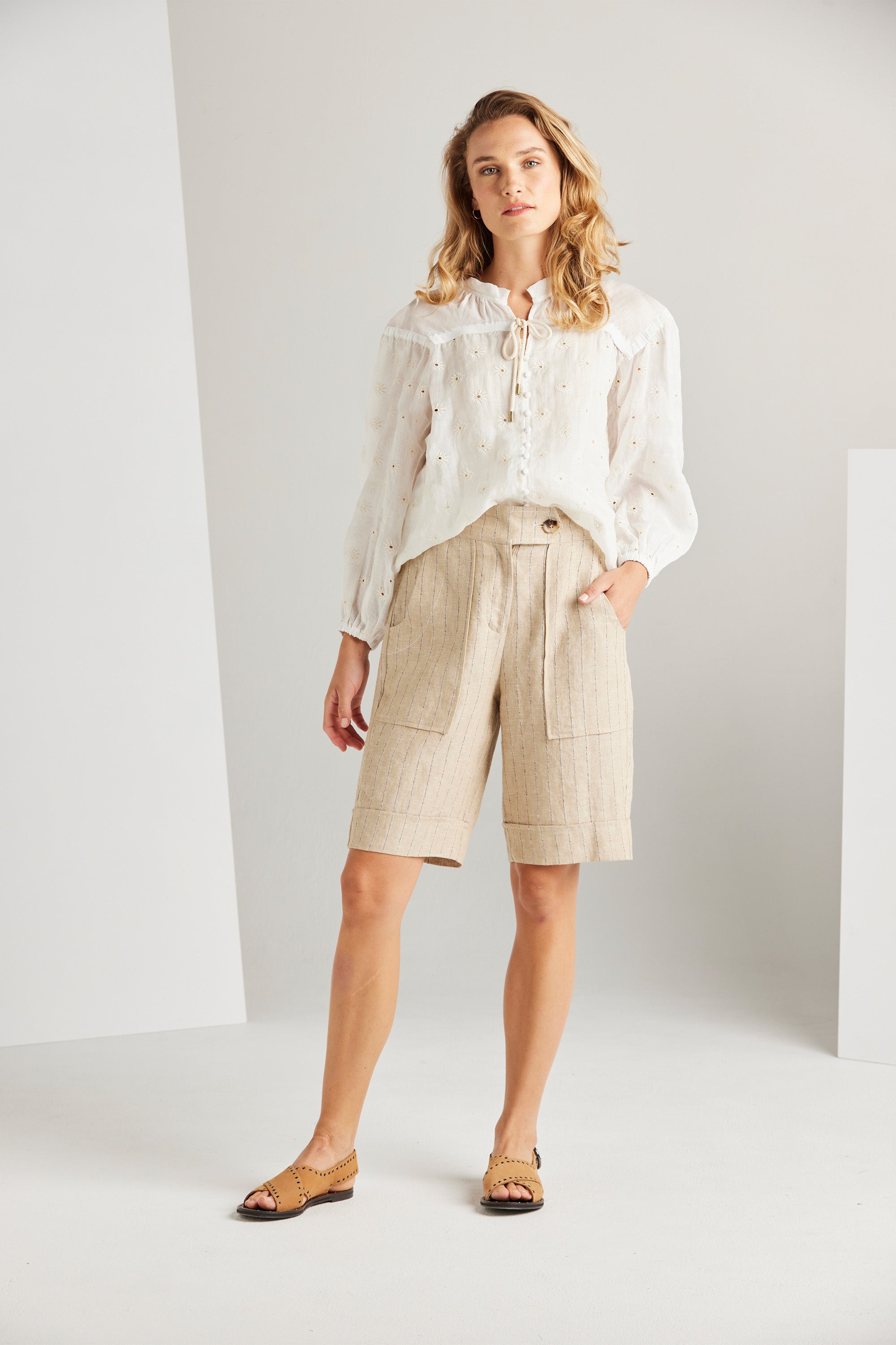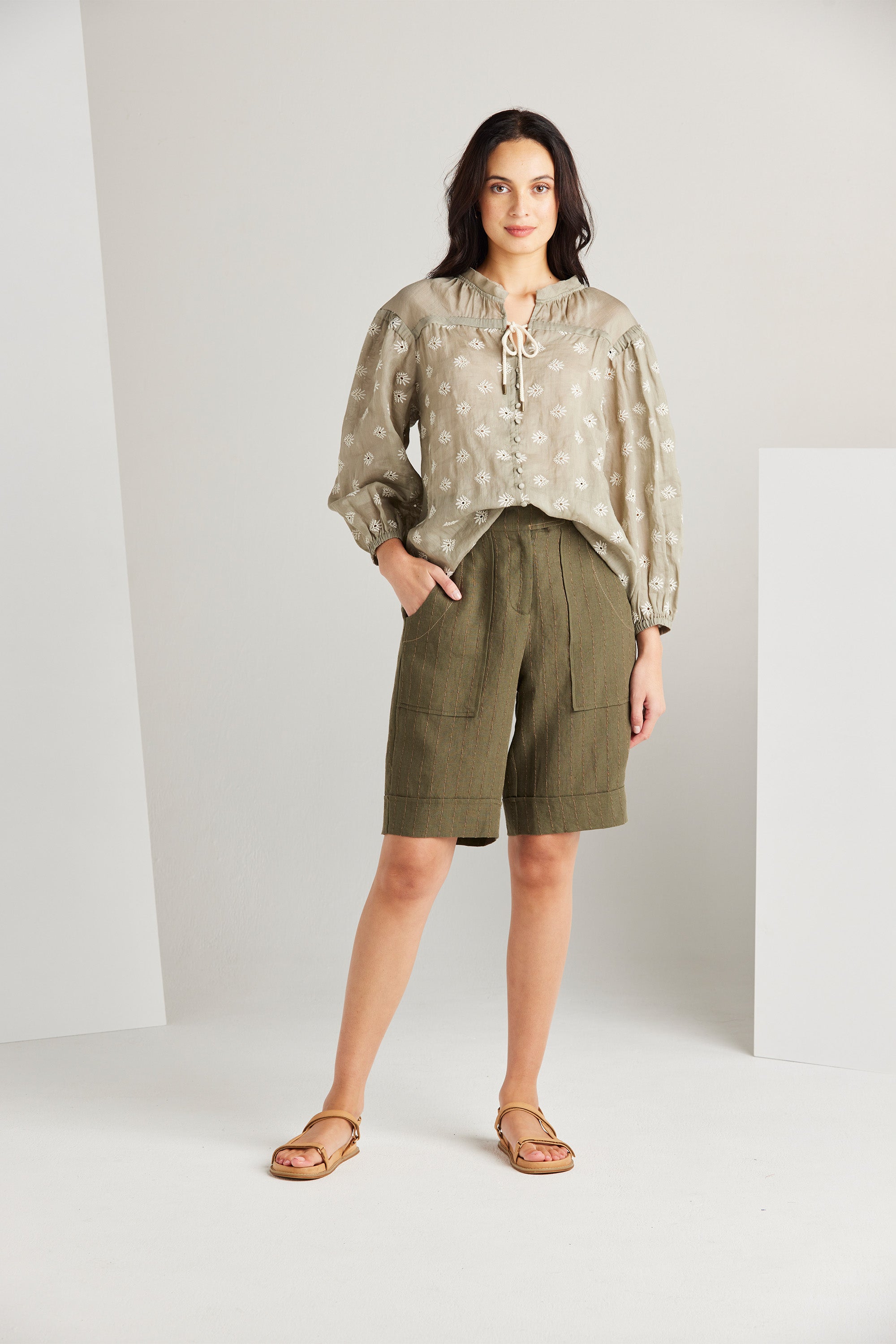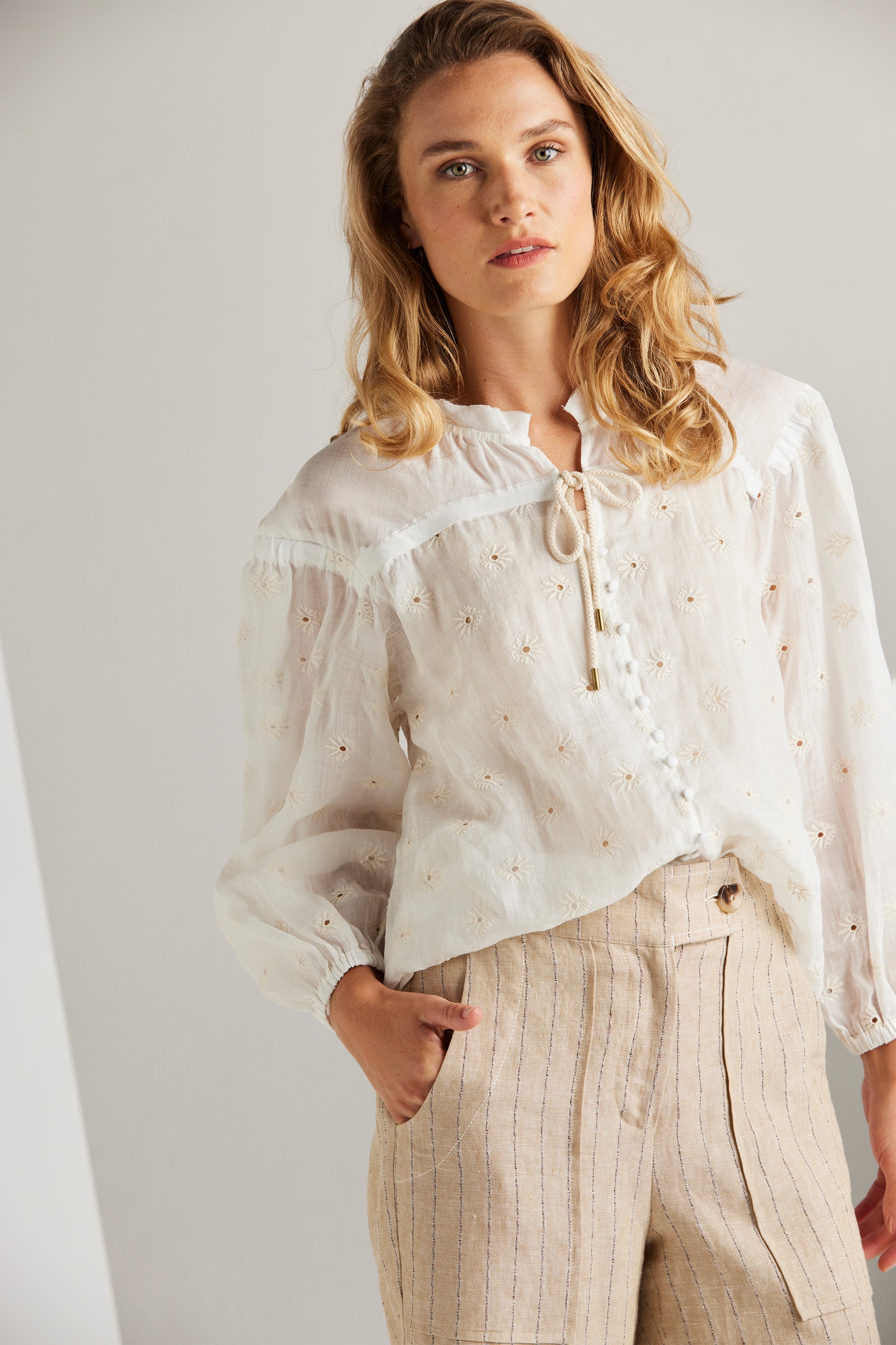 The Paris Shirt is a dreamy romantic piece that embraces the new season. This style is crafted from a delicately soft embroidered ramie fabric, making it a perfect and exquisite addition to your spring wardrobe. The gentle gathers throughout the yoke create a flattering and relaxed silhouette. Adding to its allure, the top features self-covered buttons and a rope tie adorned with metal ends, accentuating its feminine charm.